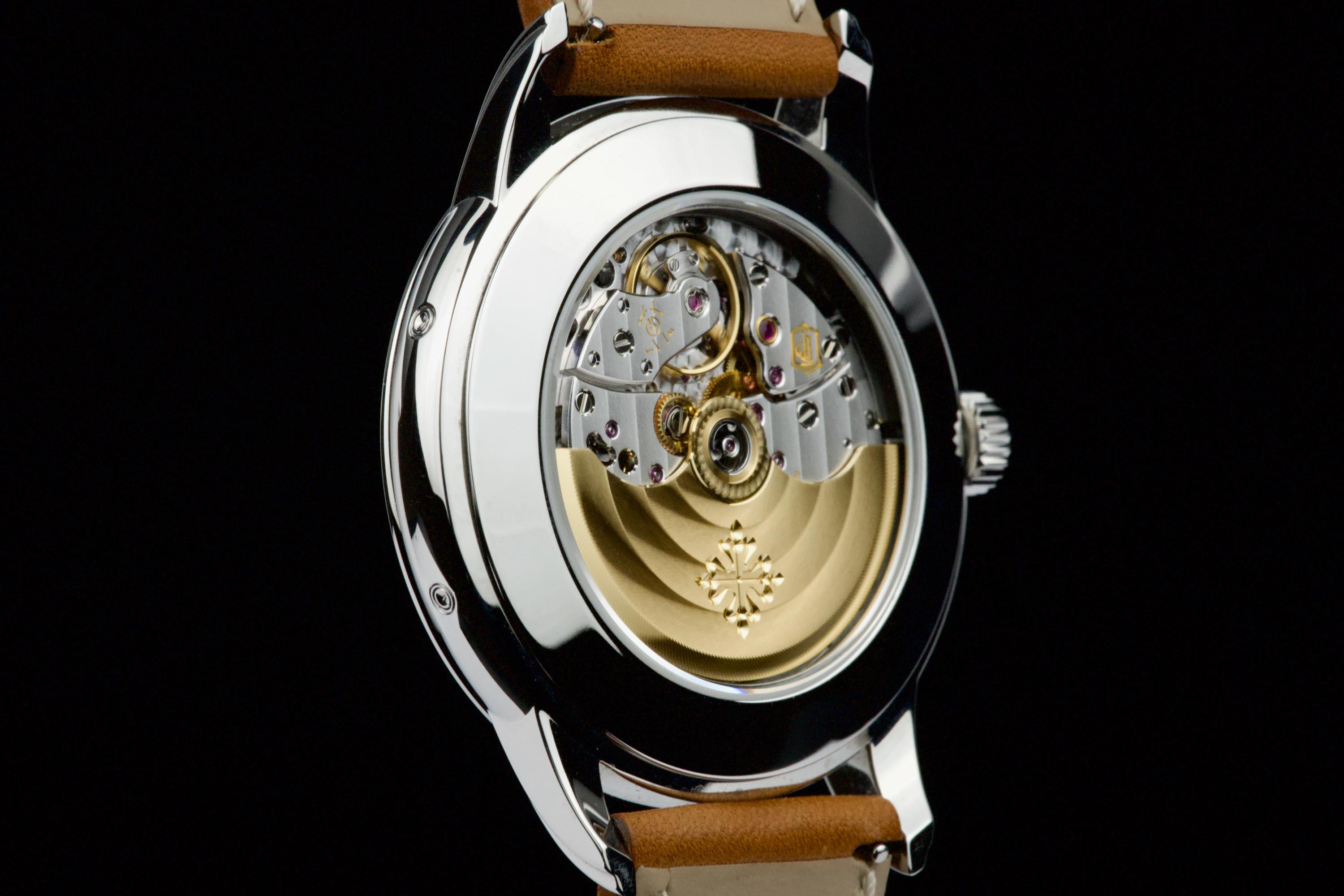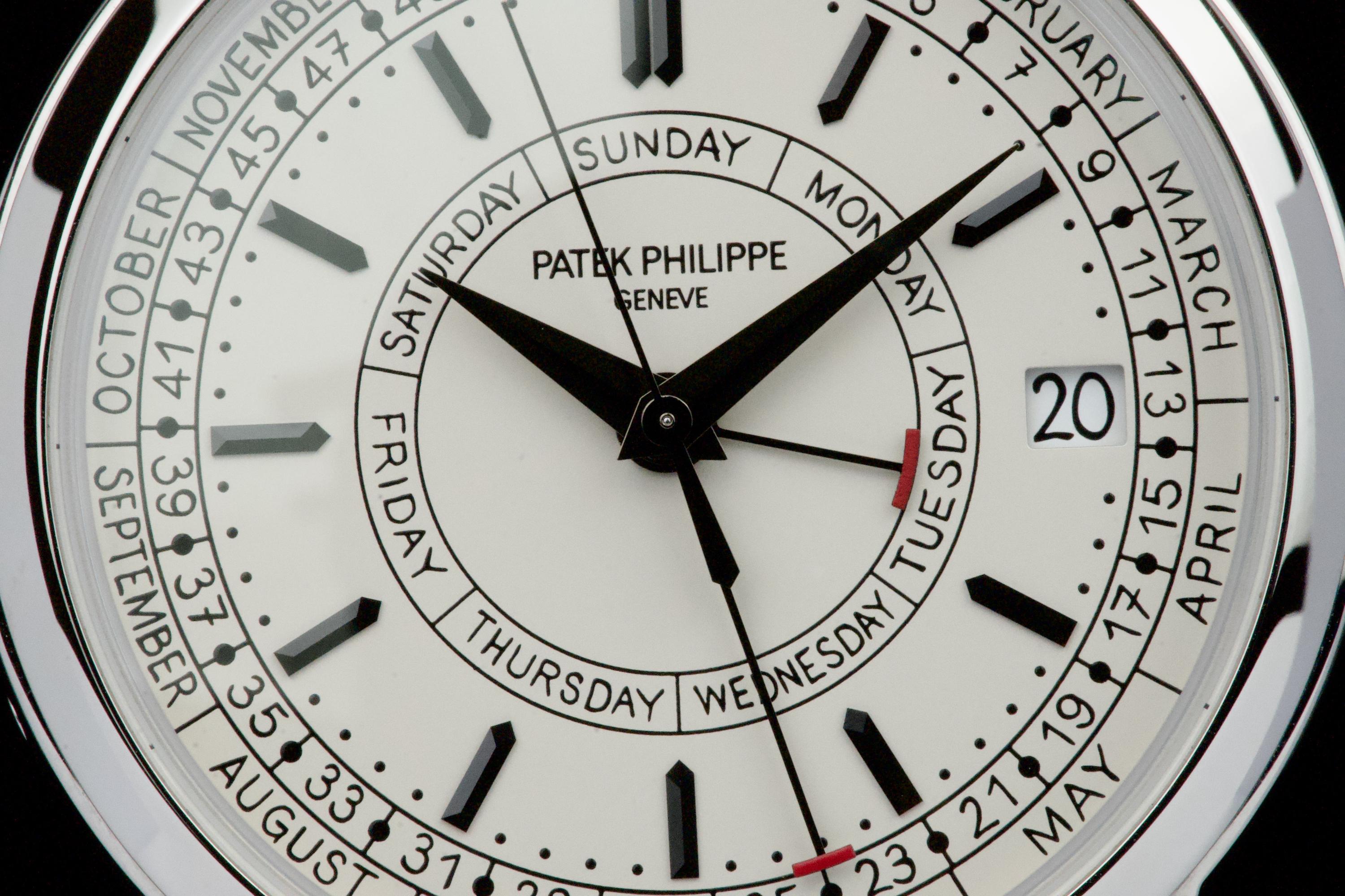 Presented here is a refined and highly distinctive example of the Patek Philippe Calatrava Weekly Calendar reference 5212A. Crafted in stainless steel, this contemporary Calatrava stands apart for its technical originality and unique aesthetic, featuring the handwritten-style typography that has made the reference instantly recognizable among modern Patek Philippe creations. This example dates to 2020 and is accompanied by its full set, including original box and Swiss papers. The watch remains unpolished and presents in excellent overall condition, showing only light signs of wear consistent with careful use. It is fitted with its original beige calfskin strap, preserving the watch’s intended character and visual balance. With no recorded service history, the watch is nonetheless in perfect working condition. A highly attractive opportunity to acquire a well-preserved example of one of Patek Philippe’s most original modern Calatrava references, combining technical ingenuity, everyday wearability, and strong collector interest.