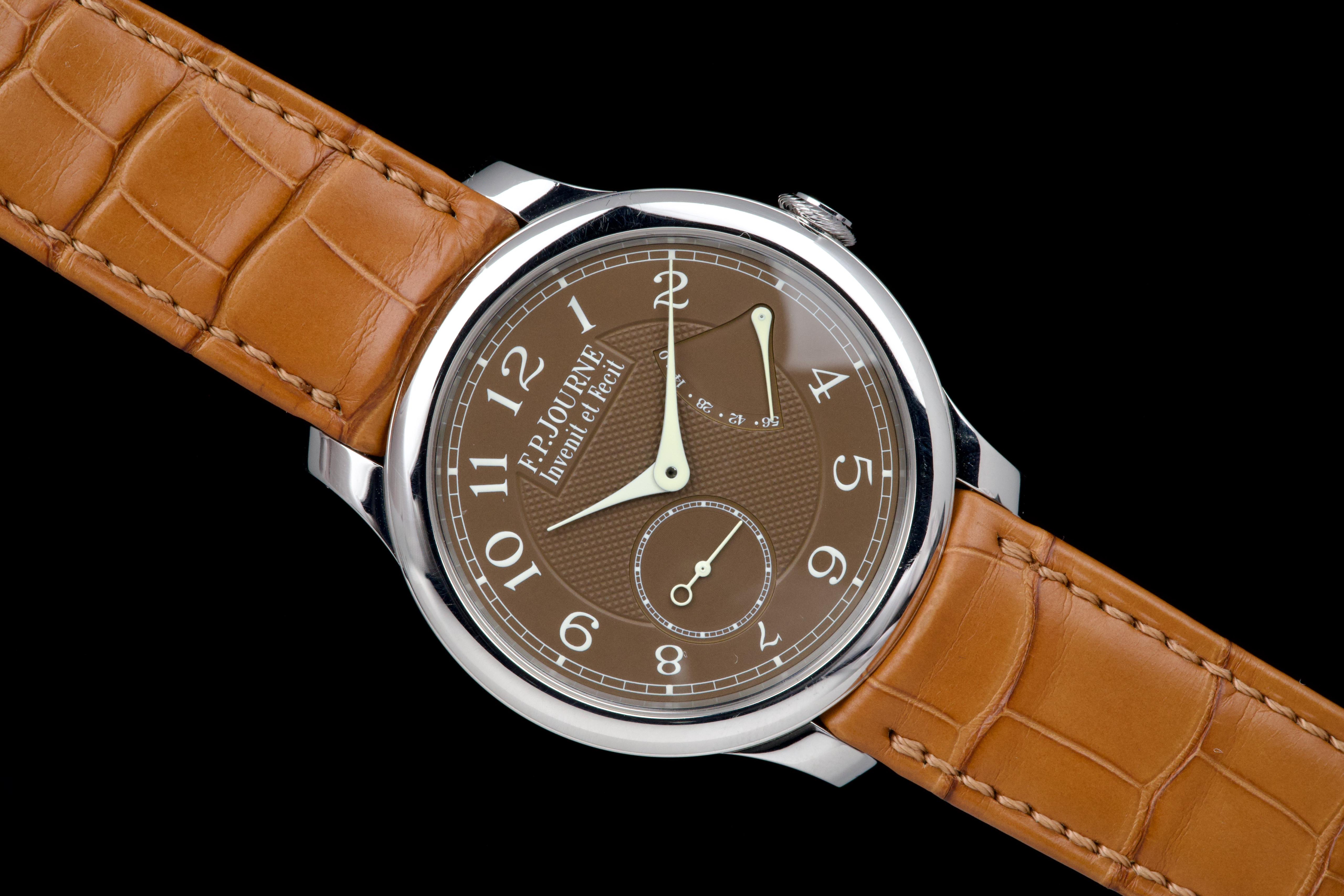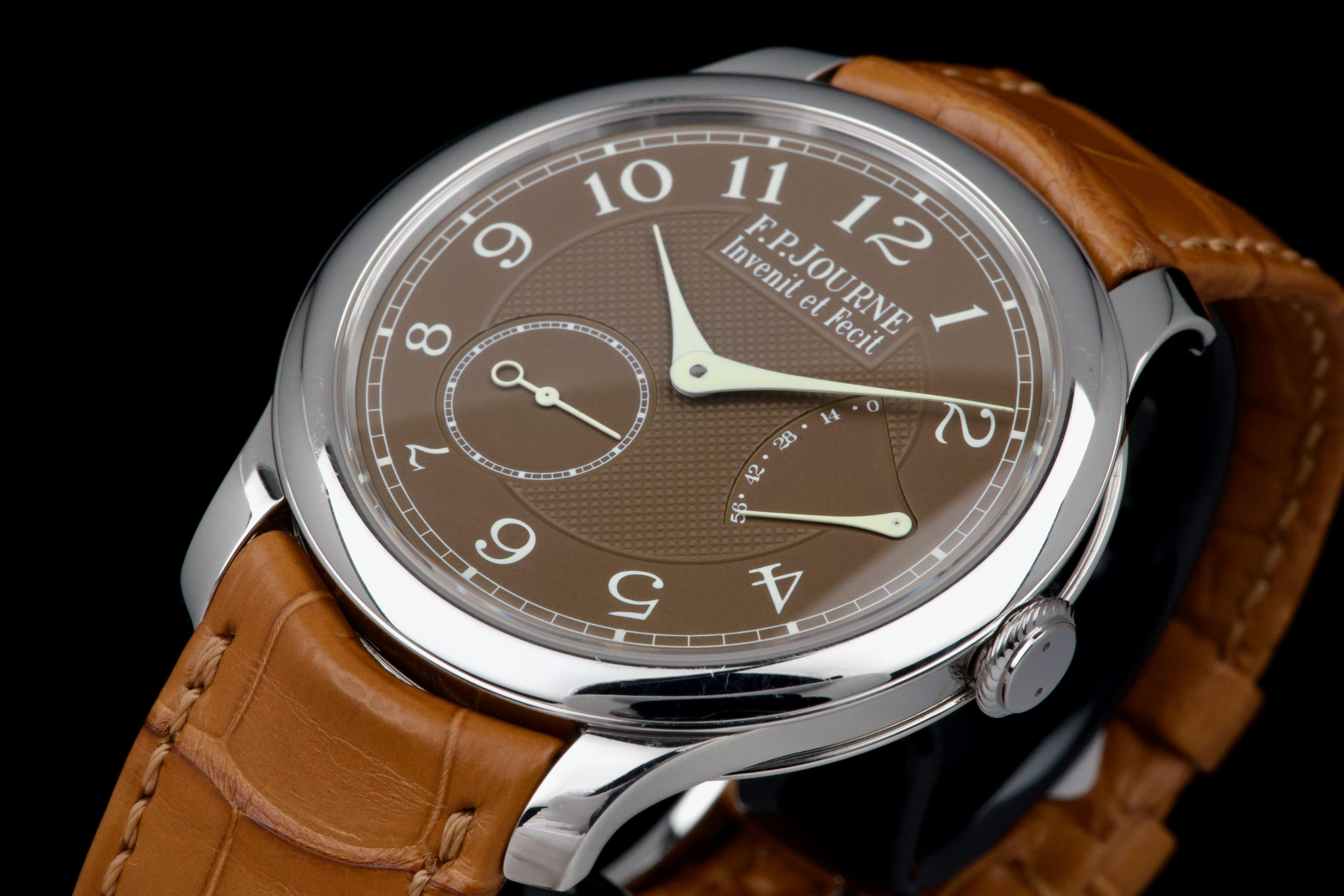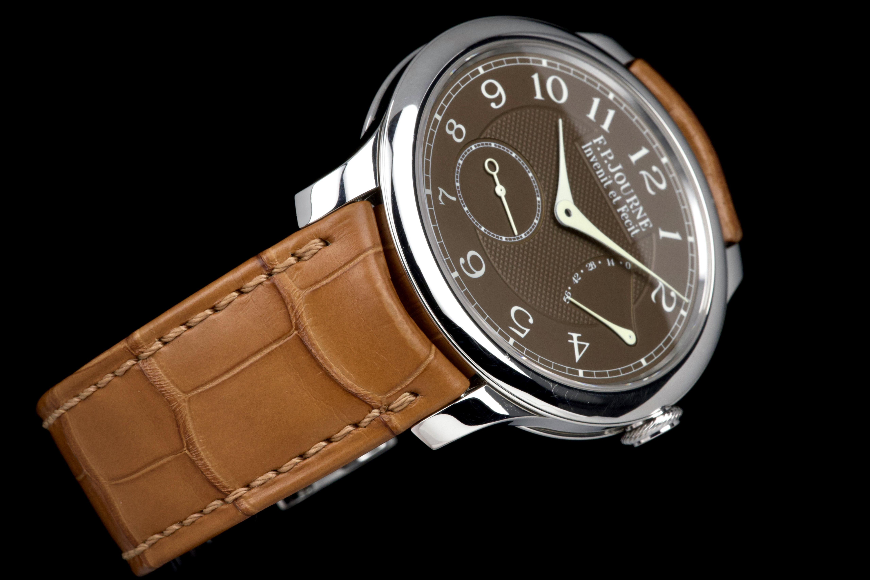 The present F.P. Journe Chronomètre Souverain Havana, dating to circa 2020, is offered here as a complete full set and represents one of the most refined expressions of the brand’s pursuit of chronometric precision. The watch has remained in the possession of a single owner since new and is preserved in near-new condition. It has never been polished and retains sharp, well-defined case edges, with only the slightest signs of handling consistent with careful wear. The Havana dial is particularly striking, distinguished by its rich and warm brown tones obtained through a complex treatment combining gold and ruthenium, giving each piece a unique and highly attractive appearance. The model features F.P. Journe’s signature asymmetrical display, combining hours and minutes with a small seconds subdial and a power reserve indicator, offering both visual balance and exceptional legibility. Its design remains one of the most recognizable and celebrated within the brand’s Classique collection. Powered by the in-house manual-winding calibre 1304, manufactured in 18k rose gold, the watch is equipped with twin barrels mounted in parallel, ensuring a highly stable delivery of energy and consistent chronometric performance over an approximate 56-hour power reserve. Preserved in outstanding condition and accompanied by its full original set, this Chronomètre Souverain Havana represents a rare opportunity to acquire one of F.P. Journe’s most iconic and sought-after models, combining technical sophistication, distinctive aesthetics, and strong collector appeal.