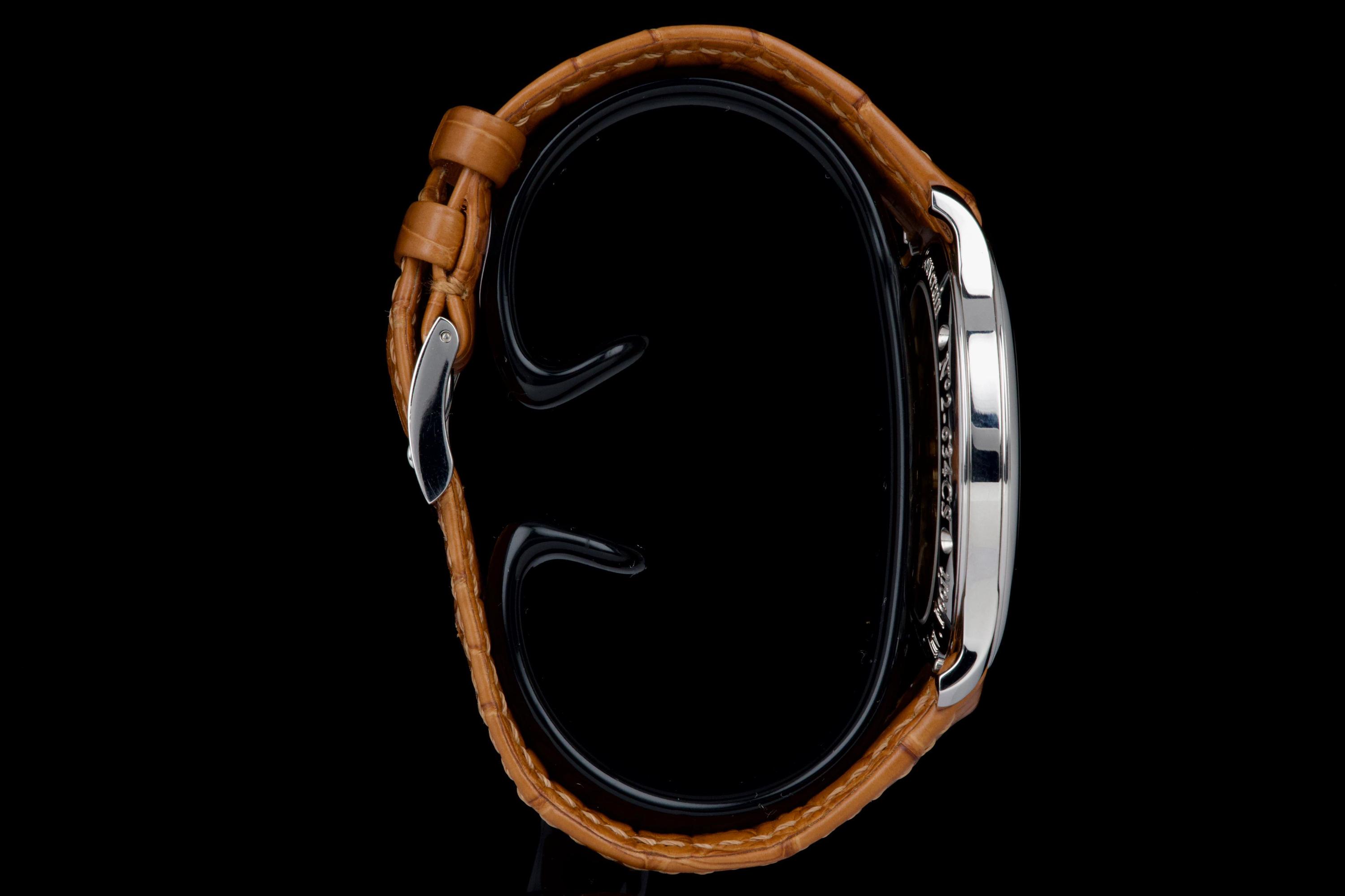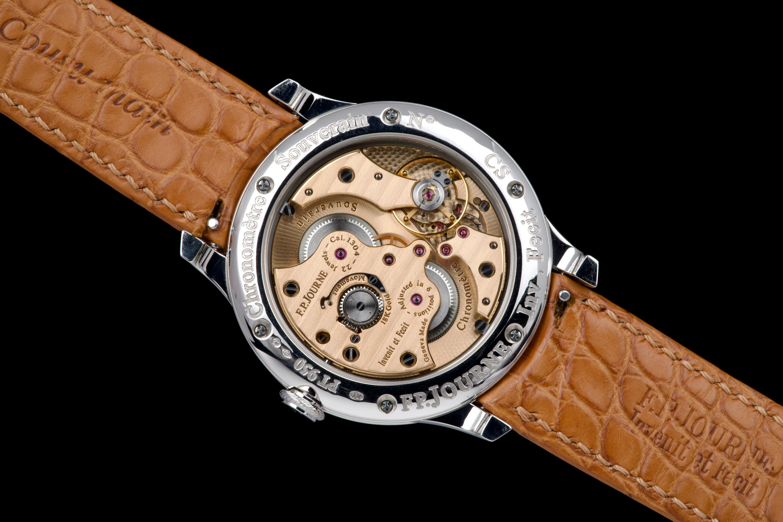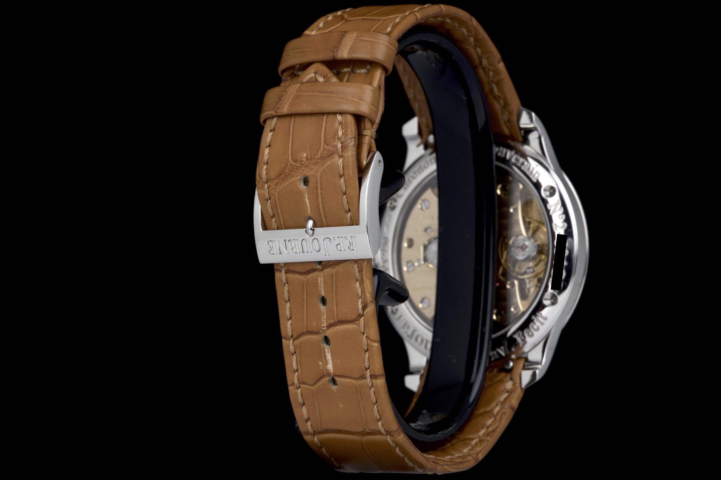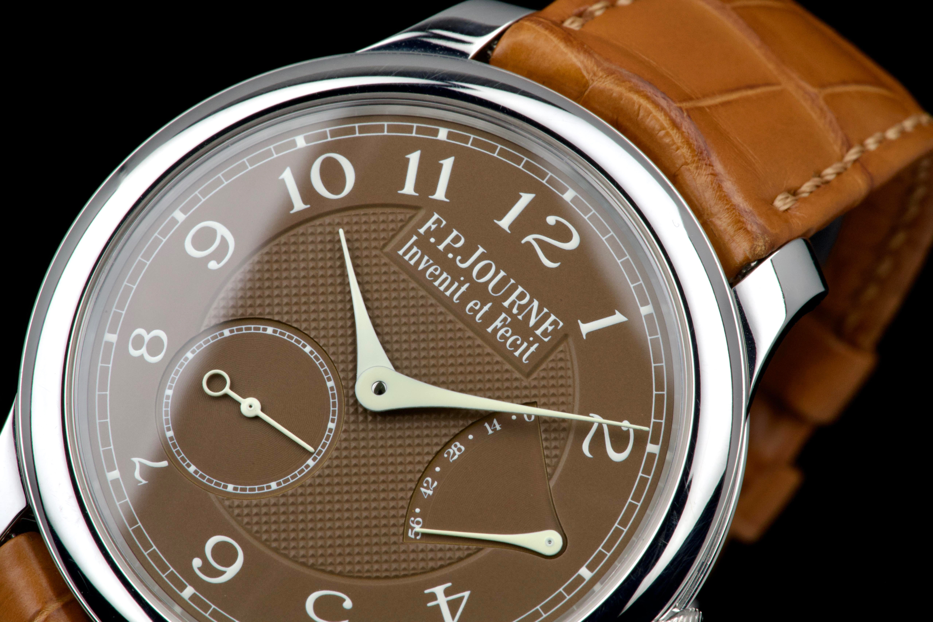 The present F.P. Journe Chronomètre Souverain Havana, dating to circa 2020, is offered here as a complete full set and represents one of the most refined expressions of the brand’s pursuit of chronometric precision. The watch has remained in the possession of a single owner since new and is preserved in near-new condition. It has never been polished and retains sharp, well-defined case edges, with only the slightest signs of handling consistent with careful wear. The Havana dial is particularly striking, distinguished by its rich and warm brown tones obtained through a complex treatment combining gold and ruthenium, giving each piece a unique and highly attractive appearance. The model features F.P. Journe’s signature asymmetrical display, combining hours and minutes with a small seconds subdial and a power reserve indicator, offering both visual balance and exceptional legibility. Its design remains one of the most recognizable and celebrated within the brand’s Classique collection. Powered by the in-house manual-winding calibre 1304, manufactured in 18k rose gold, the watch is equipped with twin barrels mounted in parallel, ensuring a highly stable delivery of energy and consistent chronometric performance over an approximate 56-hour power reserve. Preserved in outstanding condition and accompanied by its full original set, this Chronomètre Souverain Havana represents a rare opportunity to acquire one of F.P. Journe’s most iconic and sought-after models, combining technical sophistication, distinctive aesthetics, and strong collector appeal.