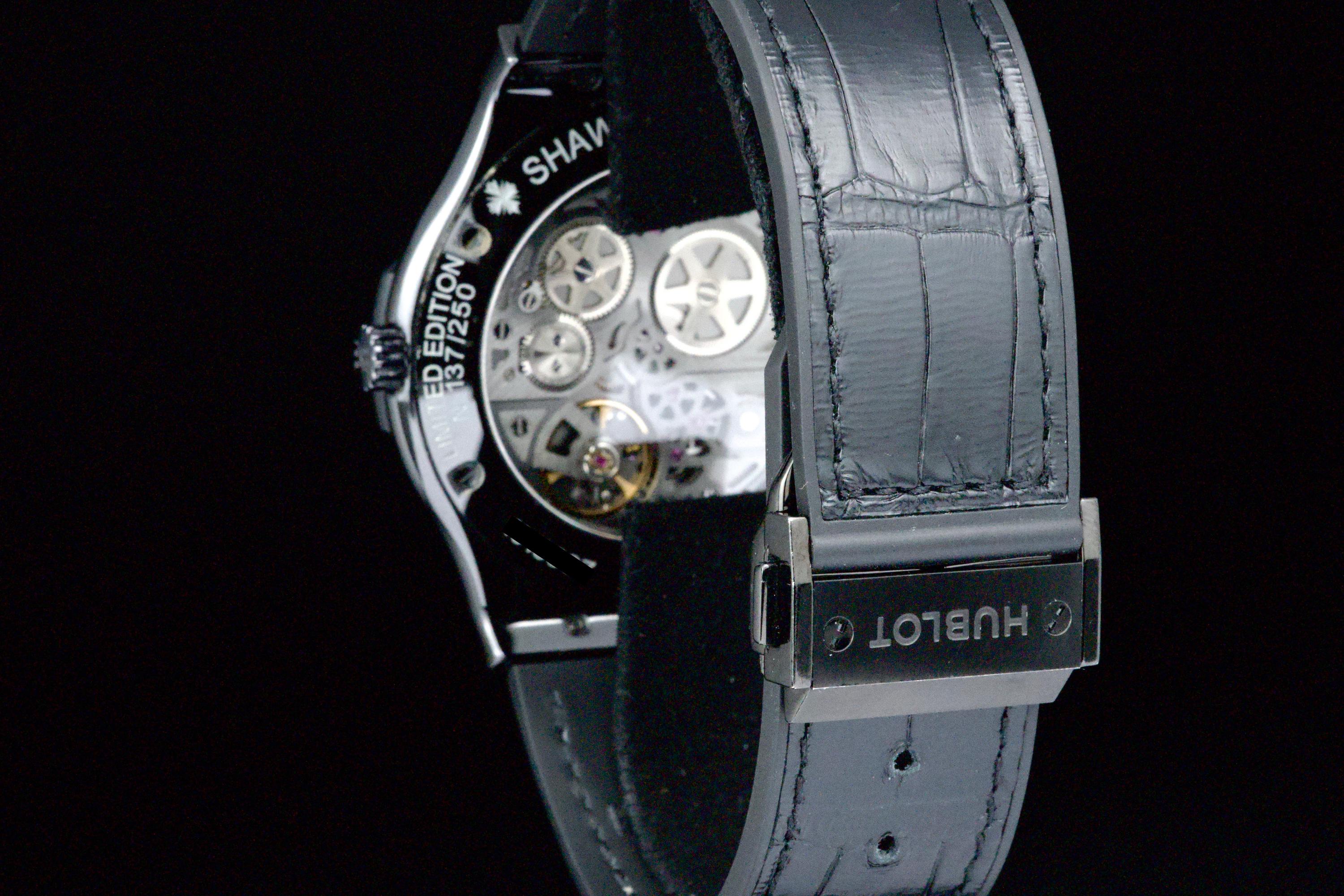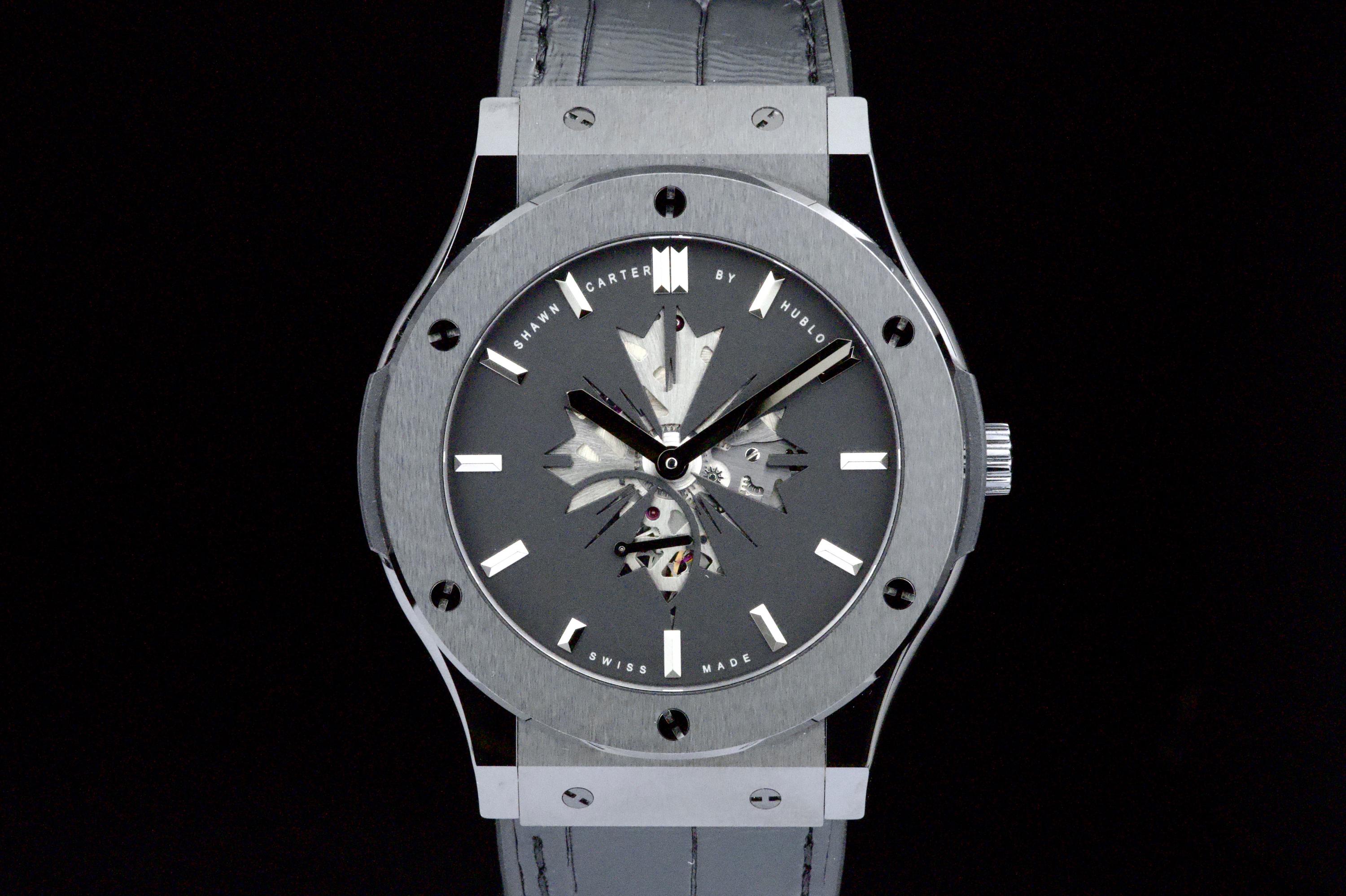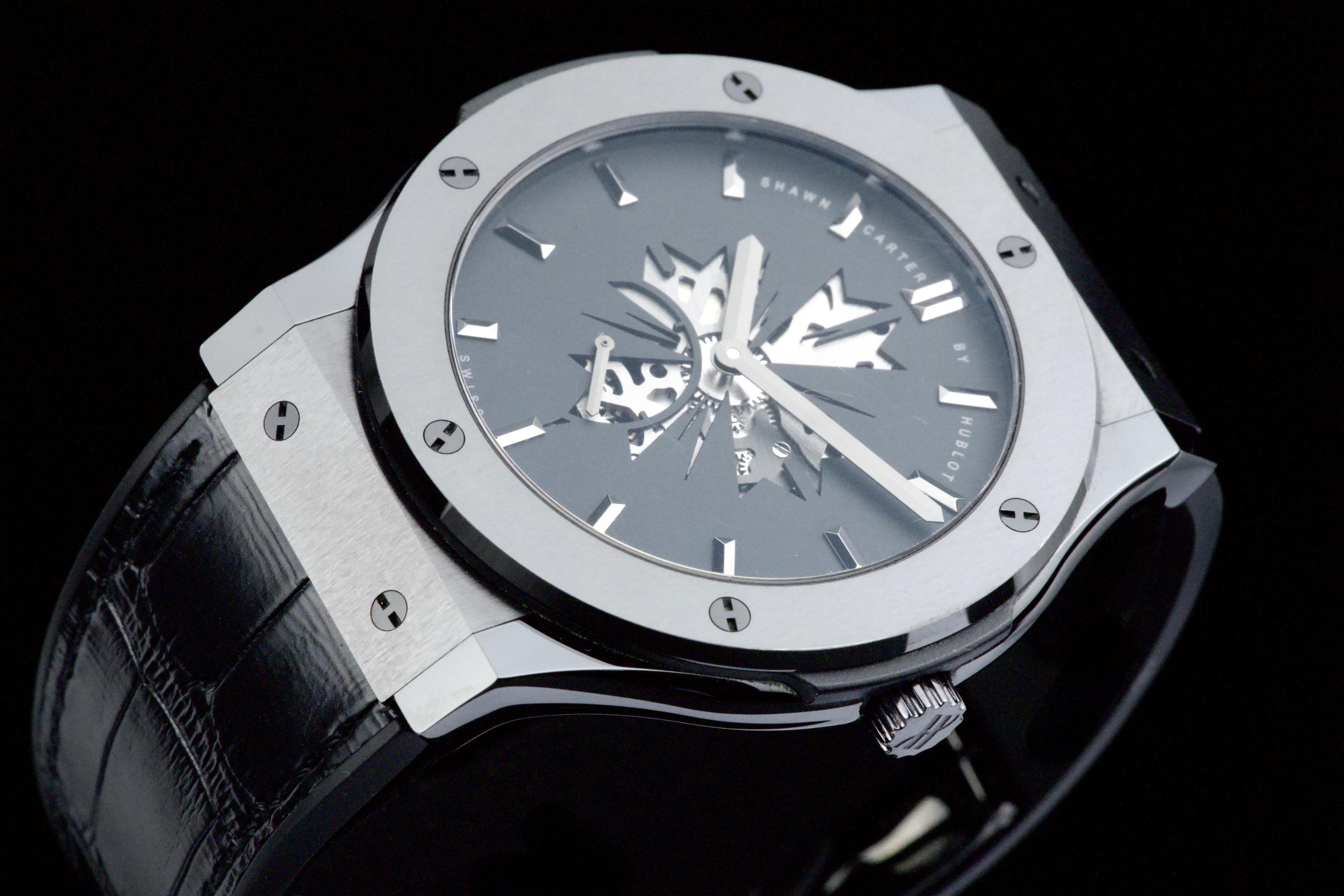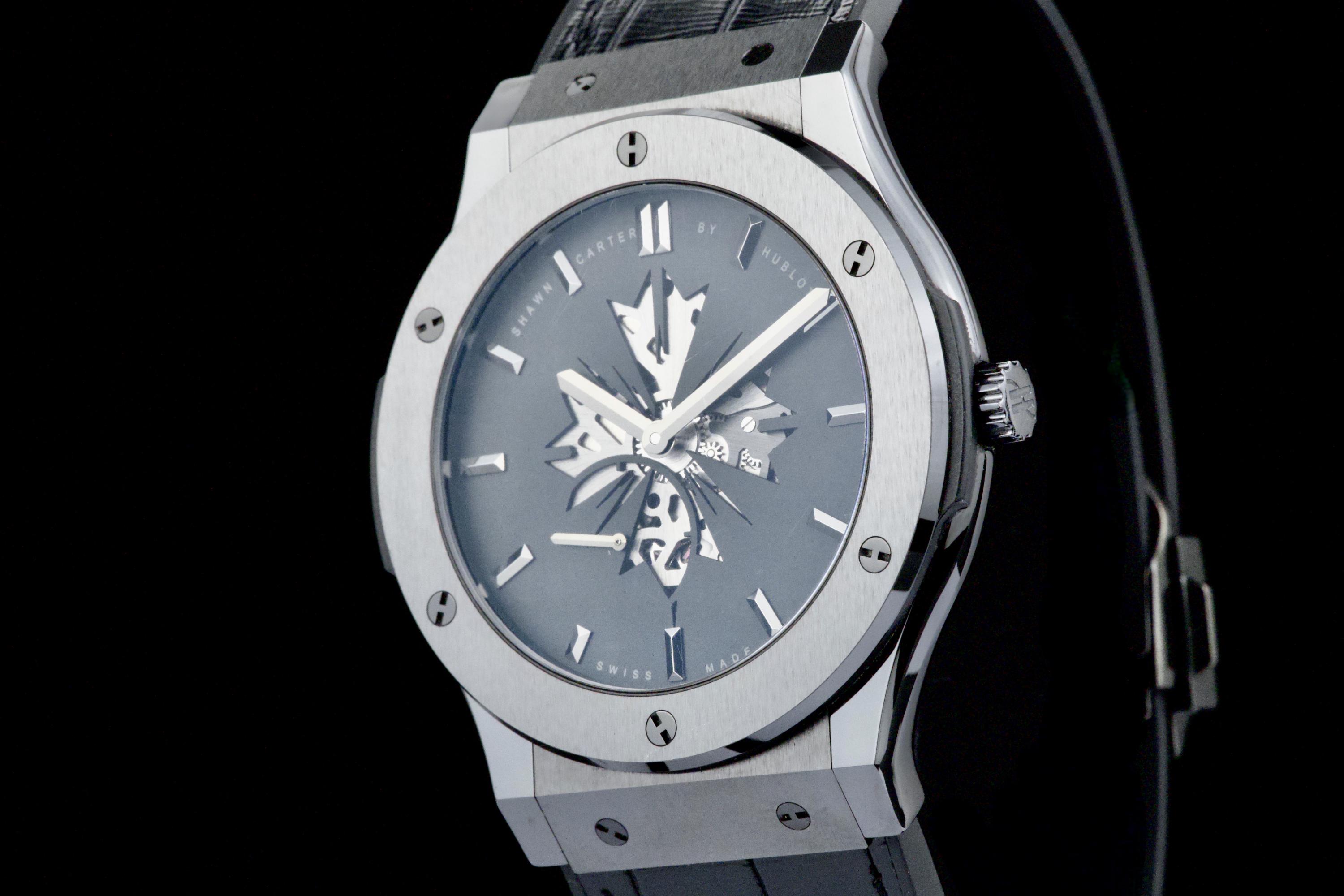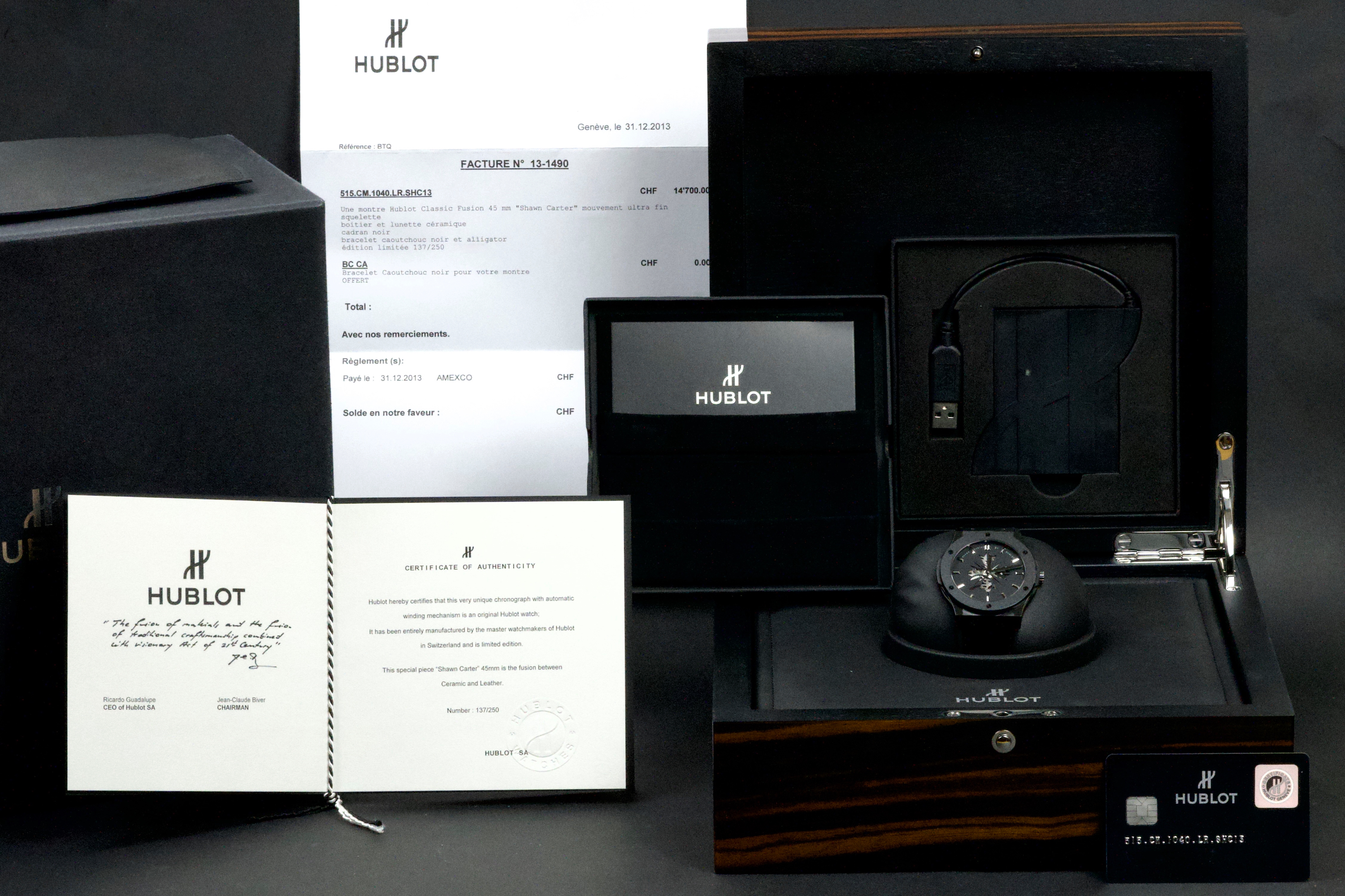 Presented here is a distinctive and collectible example of the Hublot Classic Fusion Ultra-Thin “Shawn Carter” reference 515.CM.1040.LR.SHC13. Created in collaboration with Shawn Carter (Jay-Z), this limited edition reflects a refined and understated interpretation of Hublot’s design language, combining contemporary aesthetics with elegant proportions. This example dates to 2013 and comes from the original owner, having been purchased at the Hublot boutique in Geneva, with the original invoice included (retail price CHF 14,700). The watch is offered as a full set with its original box, papers, and accessories. Presented in excellent overall condition, the watch shows only light signs of wear consistent with careful use. With no recorded service history, it is nonetheless in proper working order. The ultra-thin case design enhances its refined presence on the wrist, making it a versatile and discreetly stylish timepiece. A compelling opportunity to acquire a well-preserved and well-documented example of a Hublot limited edition, combining provenance, contemporary design, and collectible appeal.