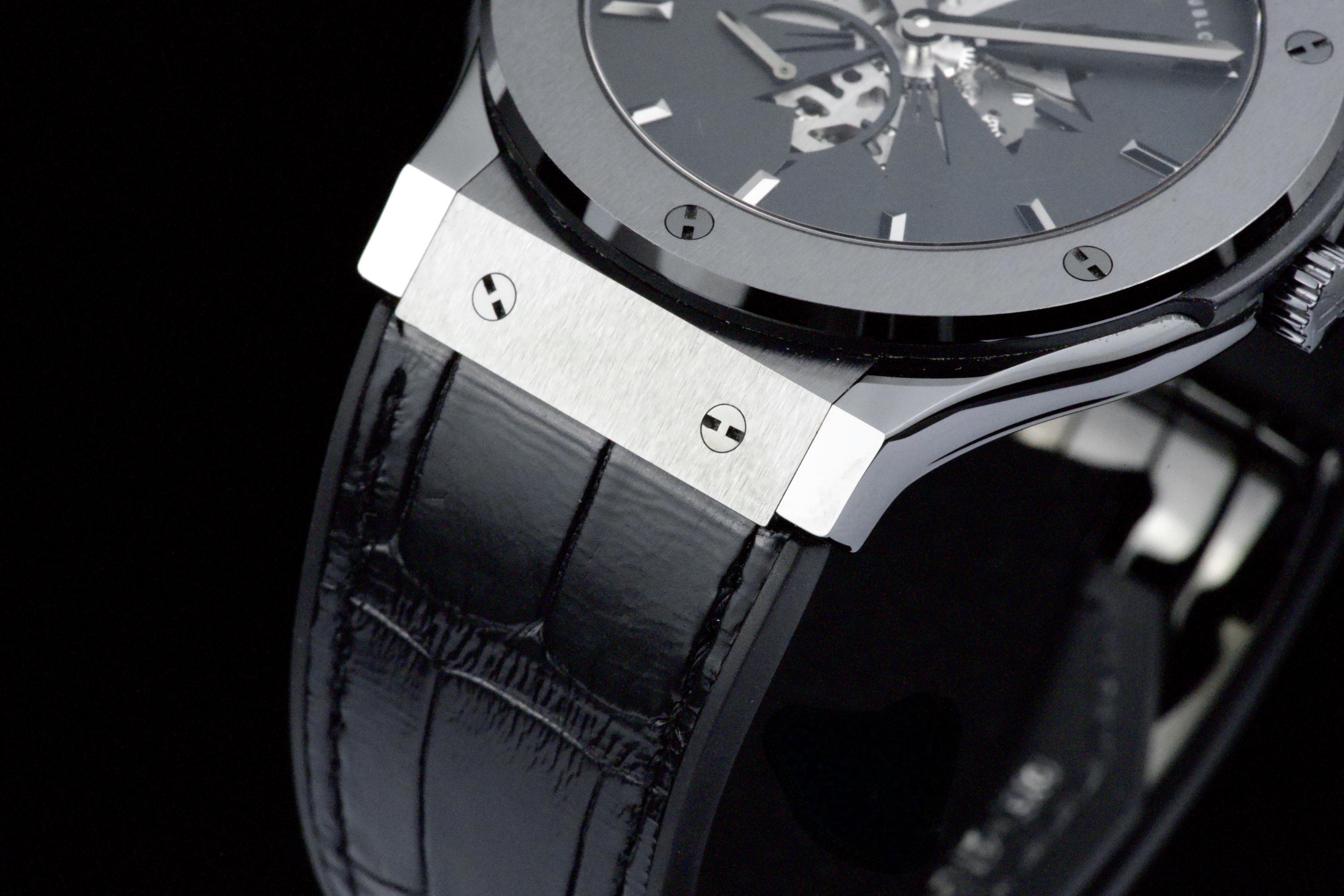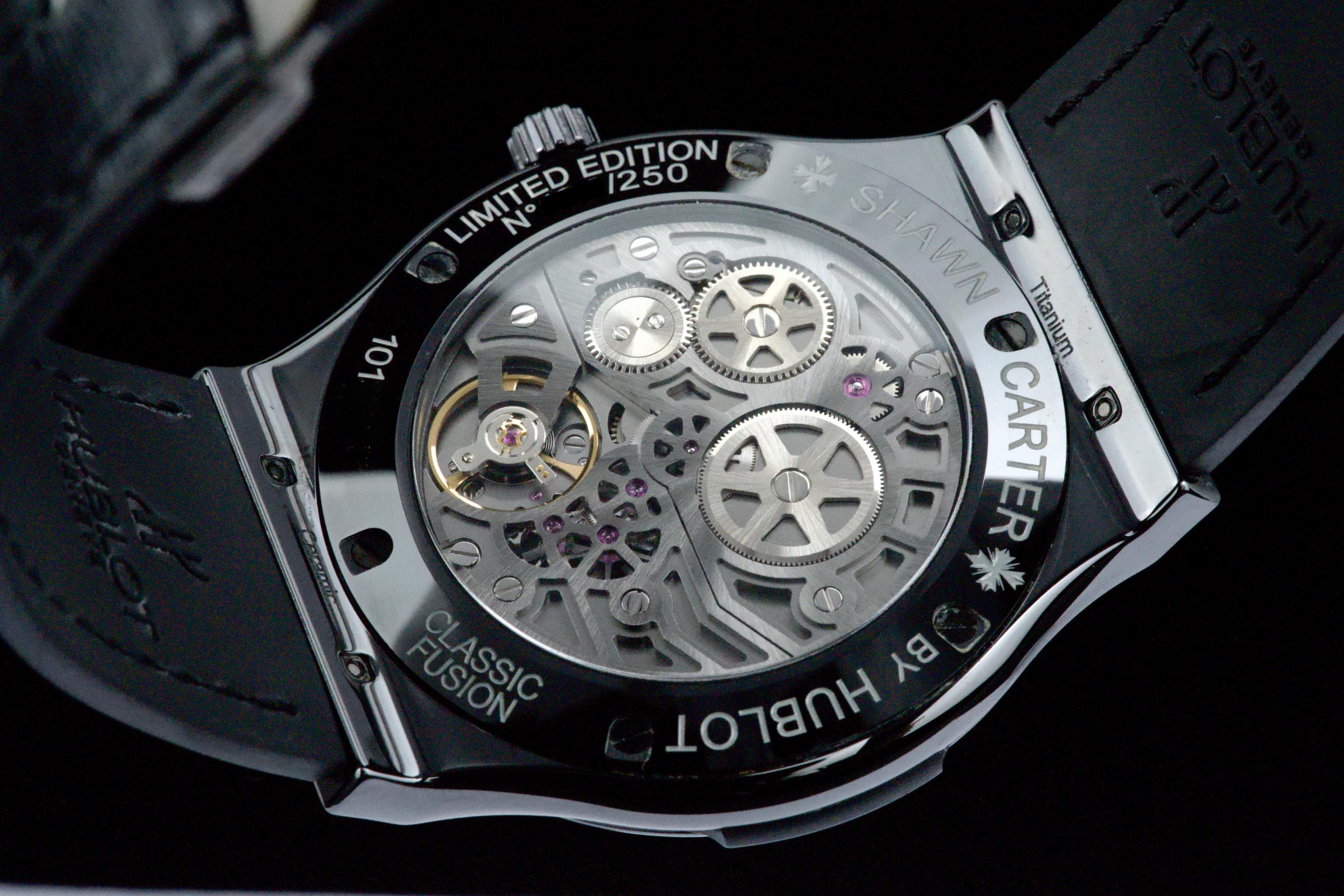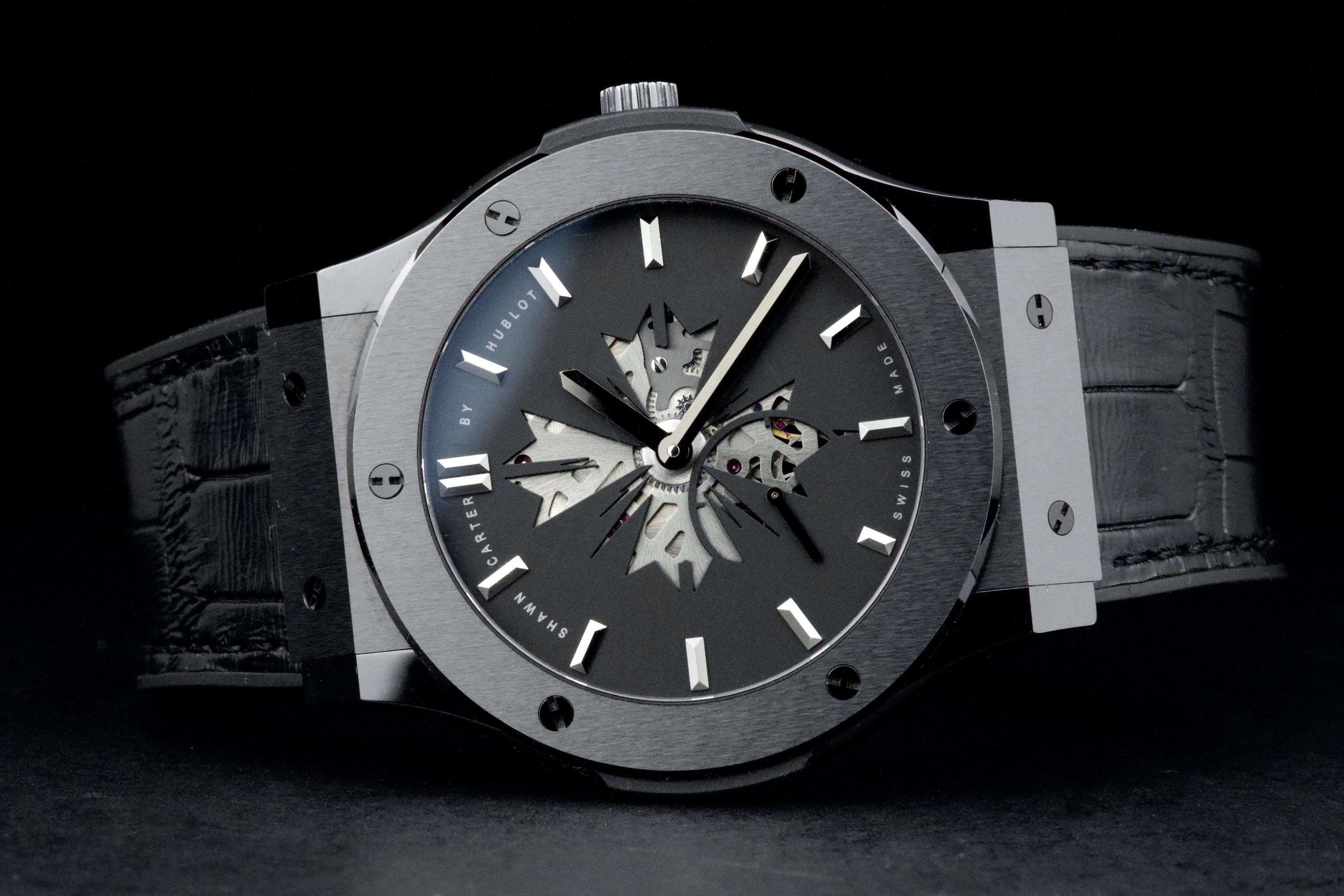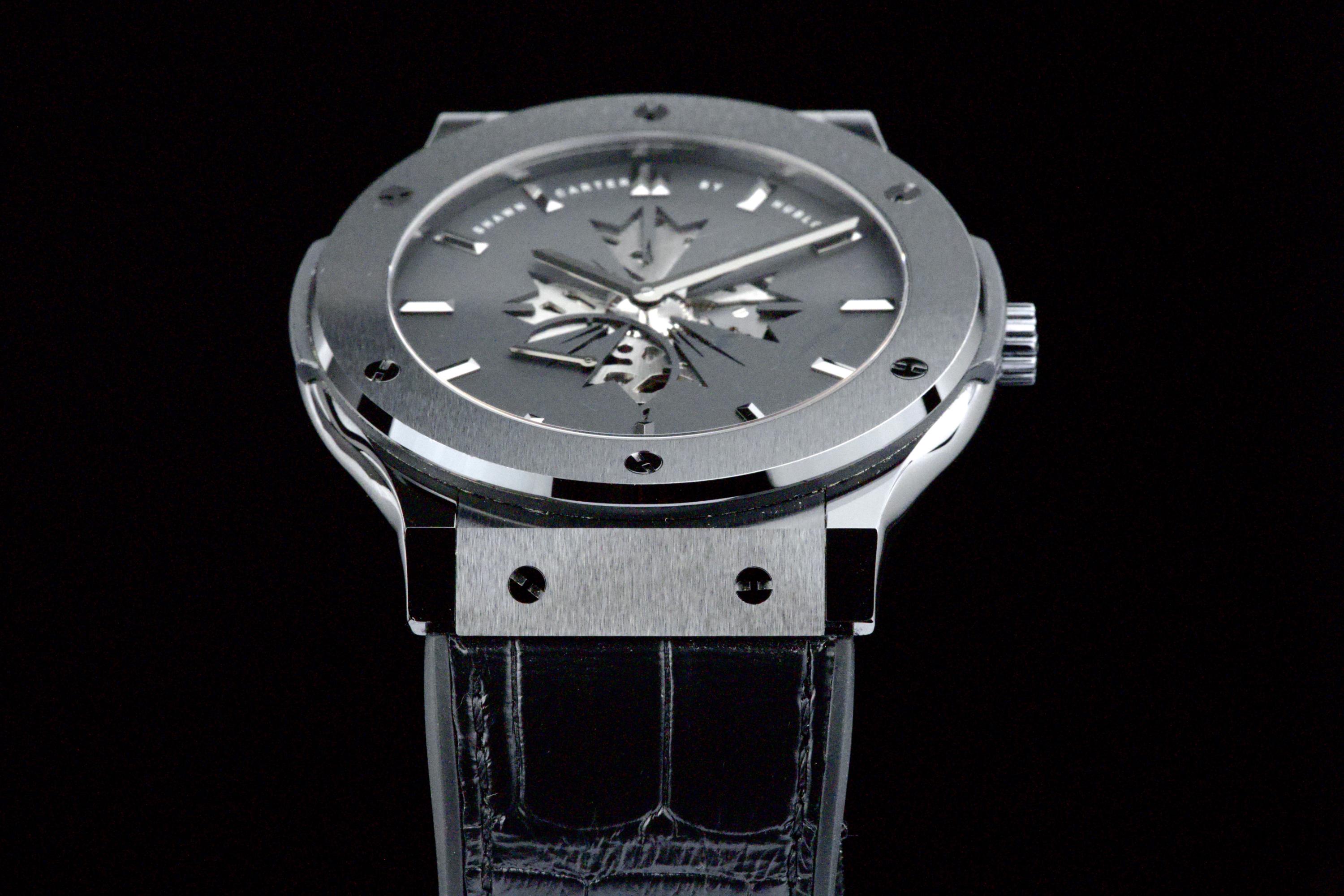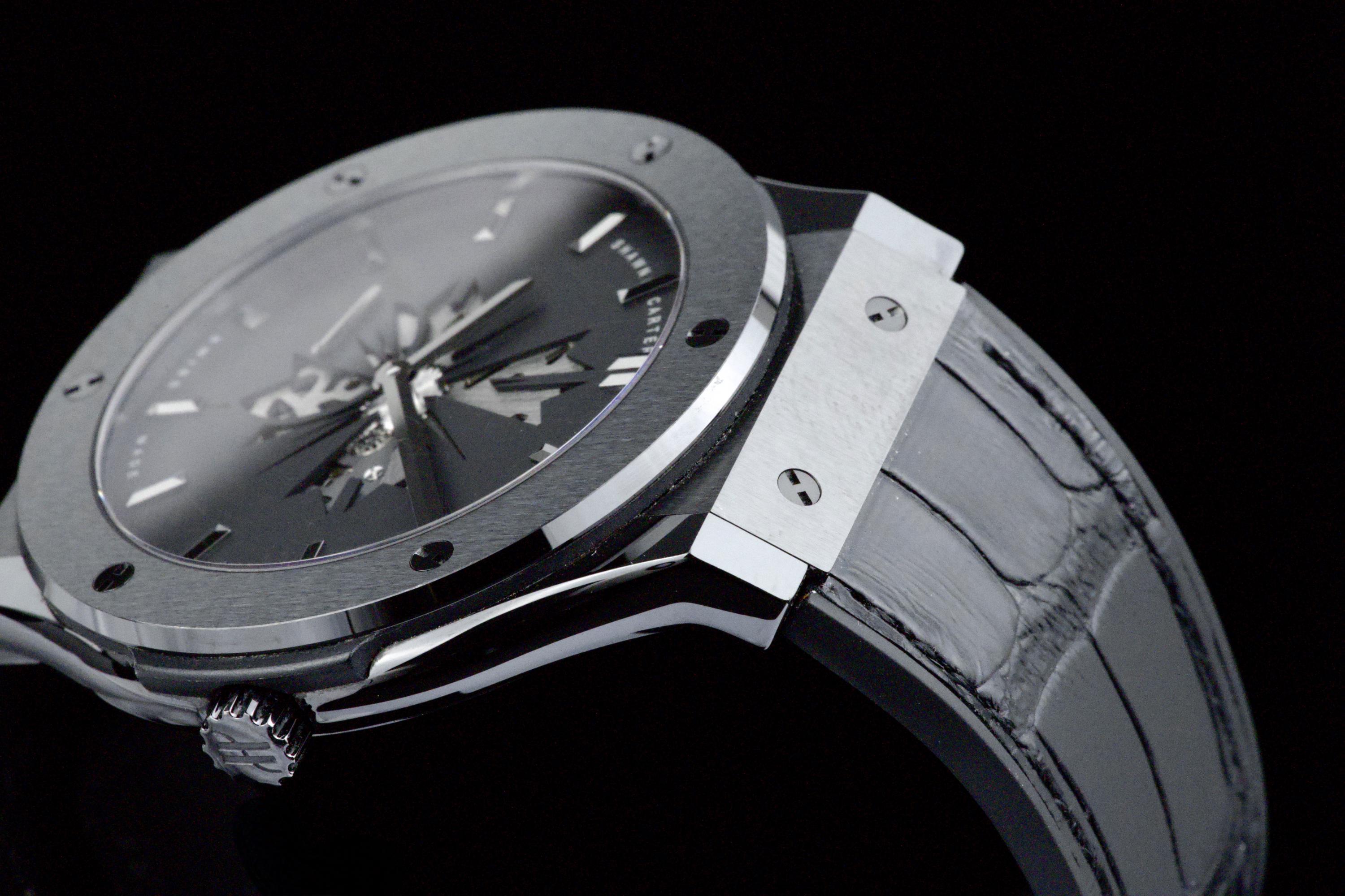 Presented here is a distinctive and collectible example of the Hublot Classic Fusion Ultra-Thin “Shawn Carter” reference 515.CM.1040.LR.SHC13. Created in collaboration with Shawn Carter (Jay-Z), this limited edition reflects a refined and understated interpretation of Hublot’s design language, combining contemporary aesthetics with elegant proportions. This example dates to 2013 and comes from the original owner, having been purchased at the Hublot boutique in Geneva, with the original invoice included (retail price CHF 14,700). The watch is offered as a full set with its original box, papers, and accessories. Presented in excellent overall condition, the watch shows only light signs of wear consistent with careful use. With no recorded service history, it is nonetheless in proper working order. The ultra-thin case design enhances its refined presence on the wrist, making it a versatile and discreetly stylish timepiece. A compelling opportunity to acquire a well-preserved and well-documented example of a Hublot limited edition, combining provenance, contemporary design, and collectible appeal.