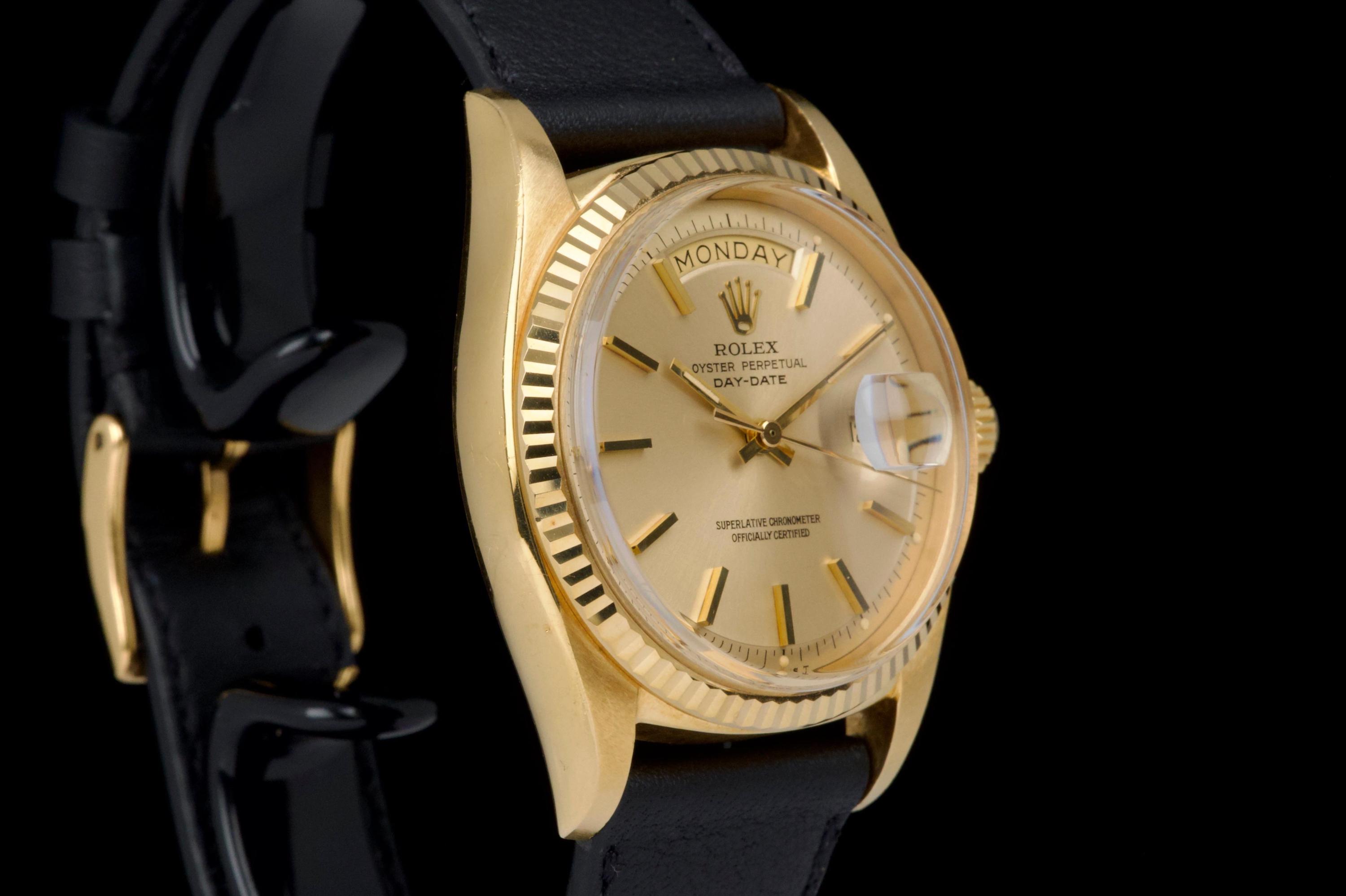 A classic Rolex Day-Date reference 1803/8 in 18k yellow gold, dating to 1971 (serial 2598XXX), presented on a black leather strap. The case is in excellent condition, showing only light wear from use, with strong overall proportions. The fluted bezel remains sharp and well defined, also showing only minimal signs of wear. The champagne dial is in excellent condition, very clean for its age. The tritium lume has aged to a warm creamy tone, giving the watch a pleasing vintage character, and the hands match perfectly. The watch is fitted with a new black leather strap and a gold-tone buckle (non-Rolex). A timeless and elegant example of the iconic Day-Date, combining classic proportions, a clean dial, and the enduring appeal of yellow gold.