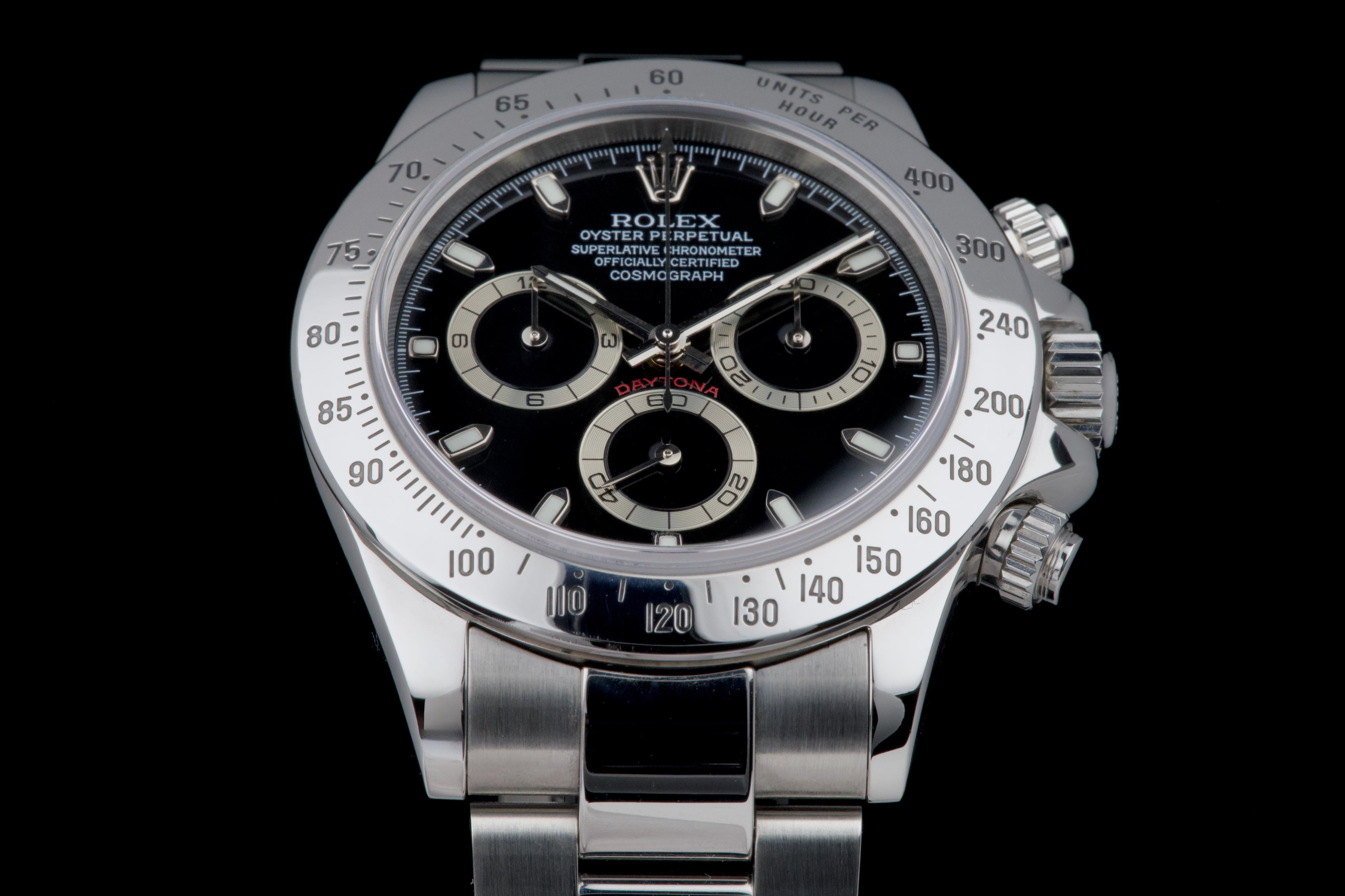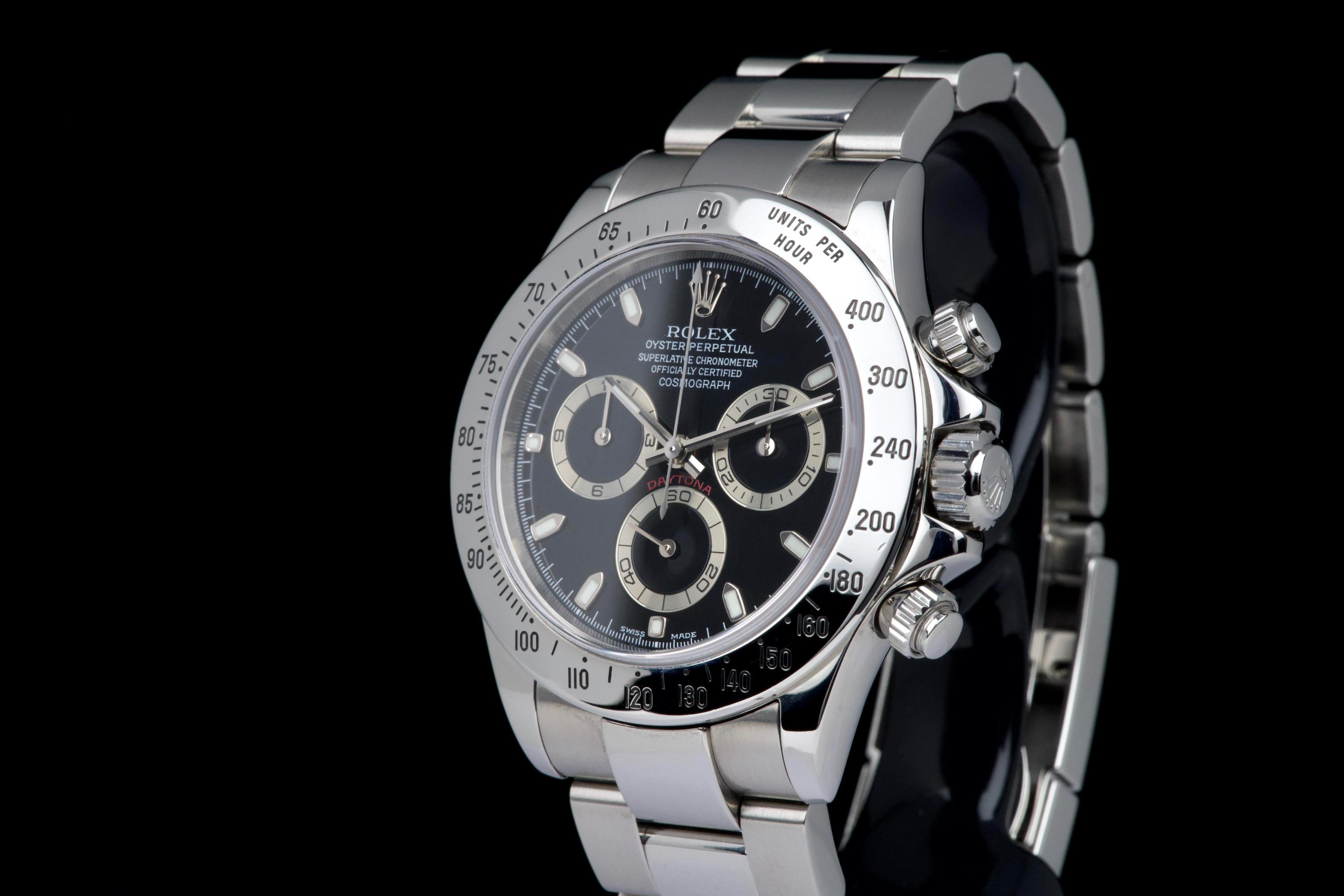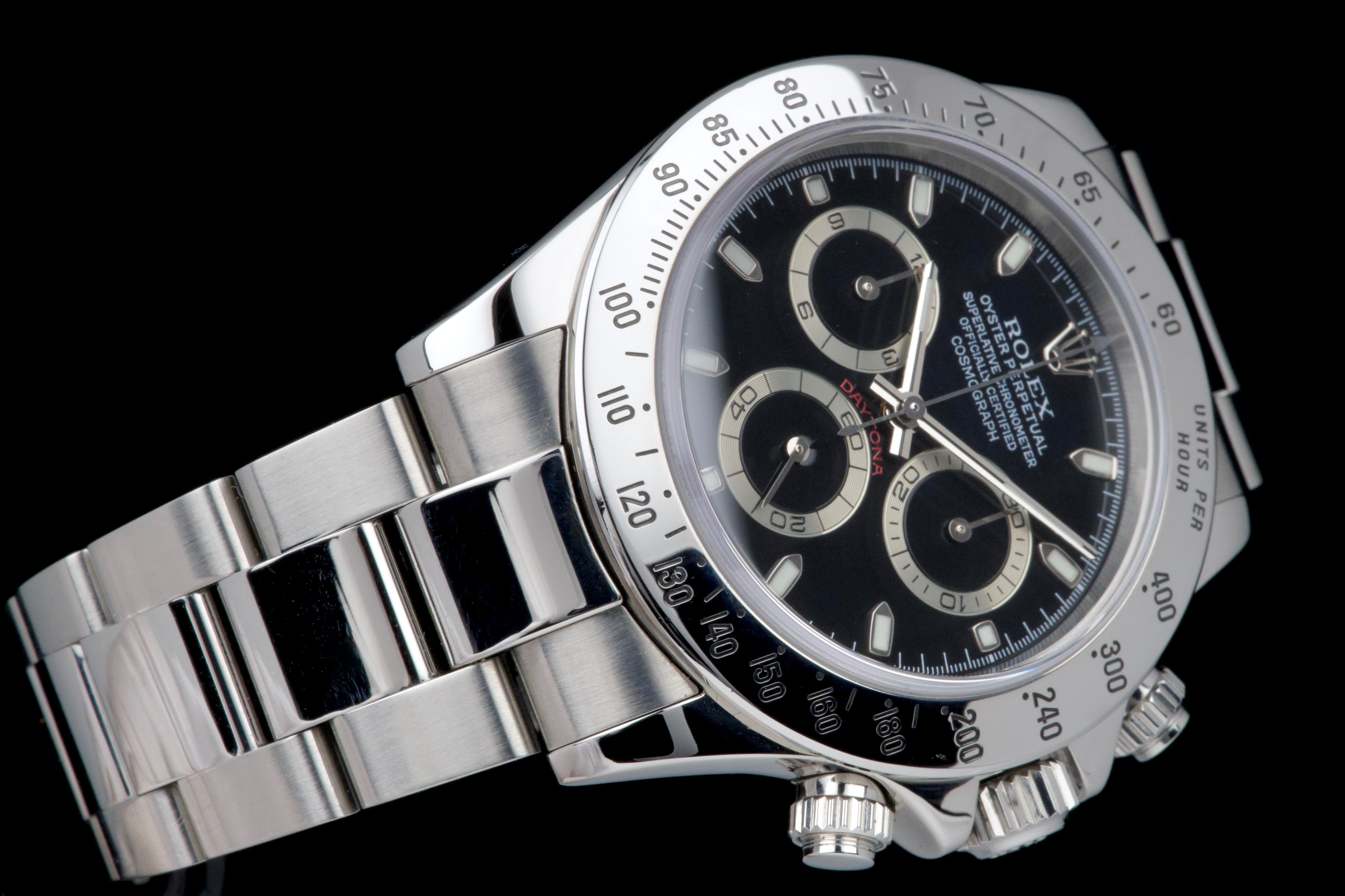 The present Rolex Cosmograph Daytona reference 116520, one of the most emblematic modern chronographs by Rolex, dates to circa 2003 and is offered here as a complete full set. The watch features a 40 mm stainless steel Oyster case with a balanced and sporty profile, combining robustness with timeless design. Its engraved tachymeter bezel and screw-down pushers reinforce the model’s strong racing heritage while ensuring durability and functionality. It is fitted with a black dial featuring contrasting chronograph subdials, offering excellent legibility and a clean, highly recognizable aesthetic. The applied hour markers and luminous hands further enhance visibility in all conditions. Powered by the in-house automatic calibre 4130, the watch delivers outstanding chronometric performance, known for its reliability, robustness, and efficient architecture, with an approximate power reserve of 72 hours. The watch has recently been serviced and polished by our watchmaker and is presented in very good overall condition, showing a clean and refreshed appearance. Offered with its full original set including box, warranty papers, and accessories, this Daytona 116520 represents an excellent opportunity to acquire a highly sought-after Rolex chronograph, combining iconic design, everyday usability, and strong collector appeal.
