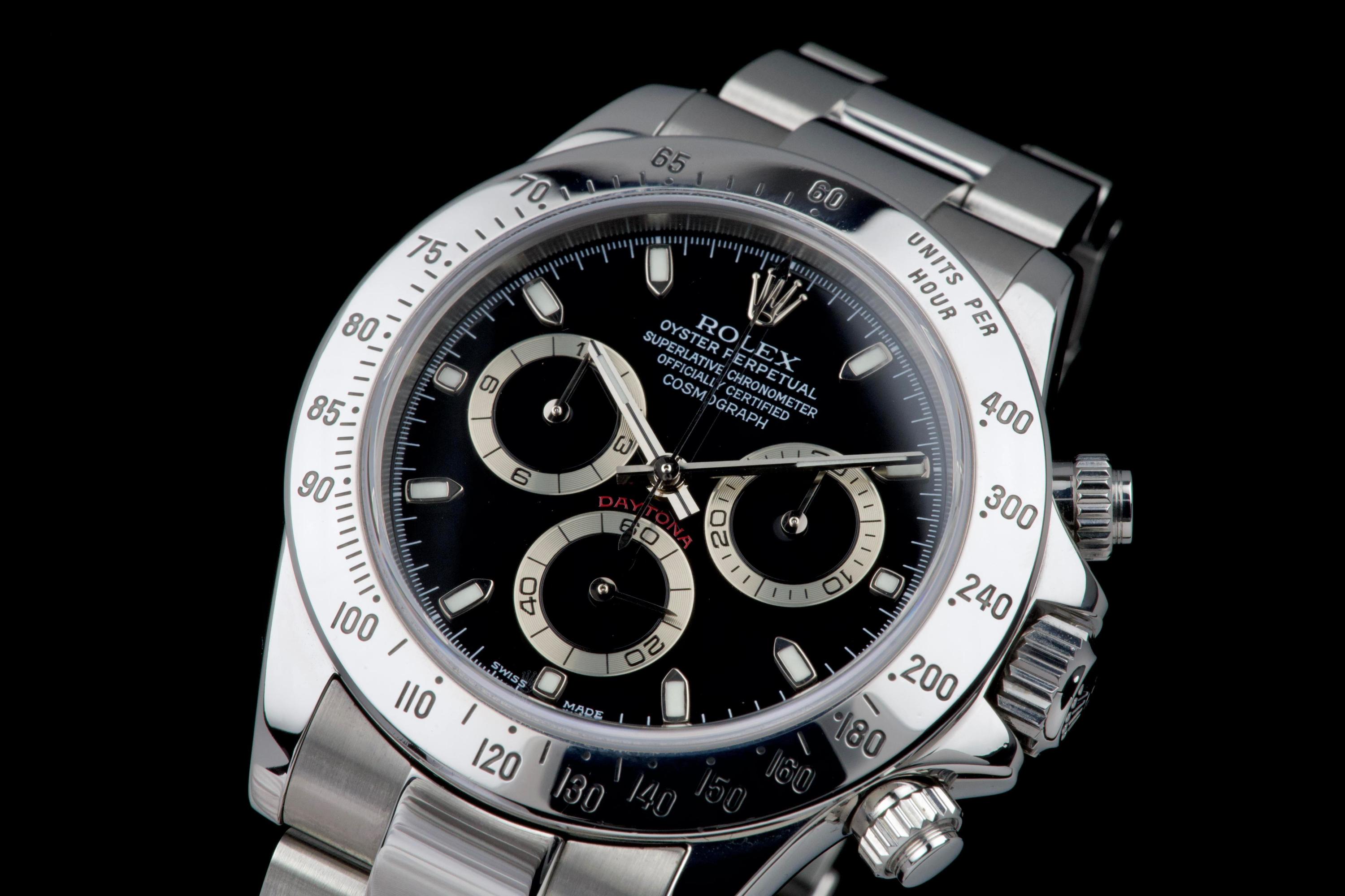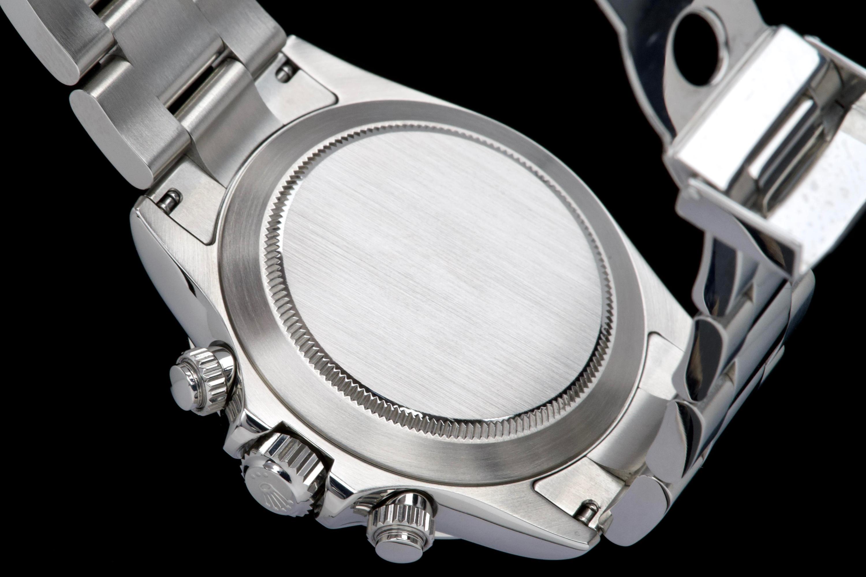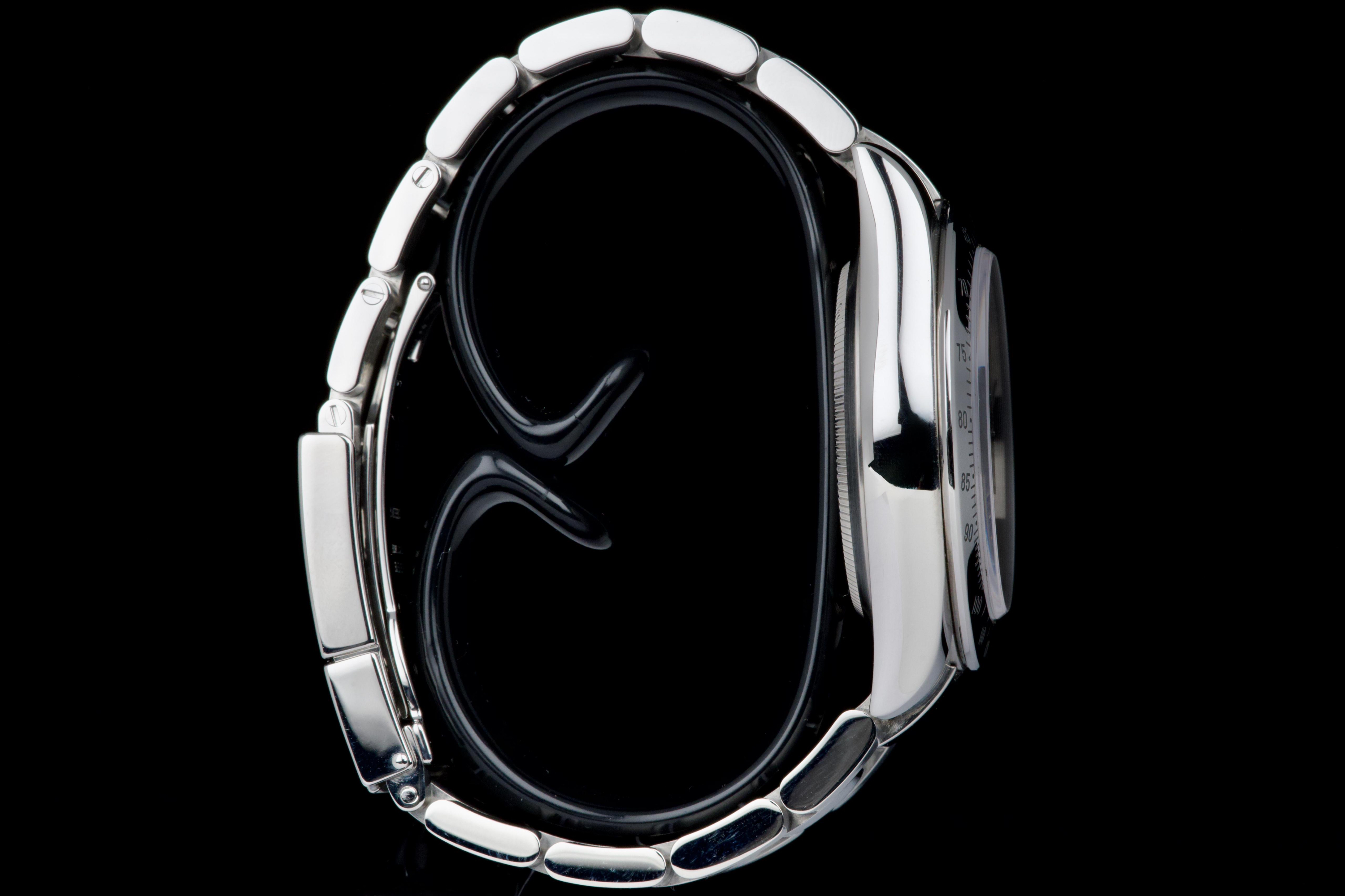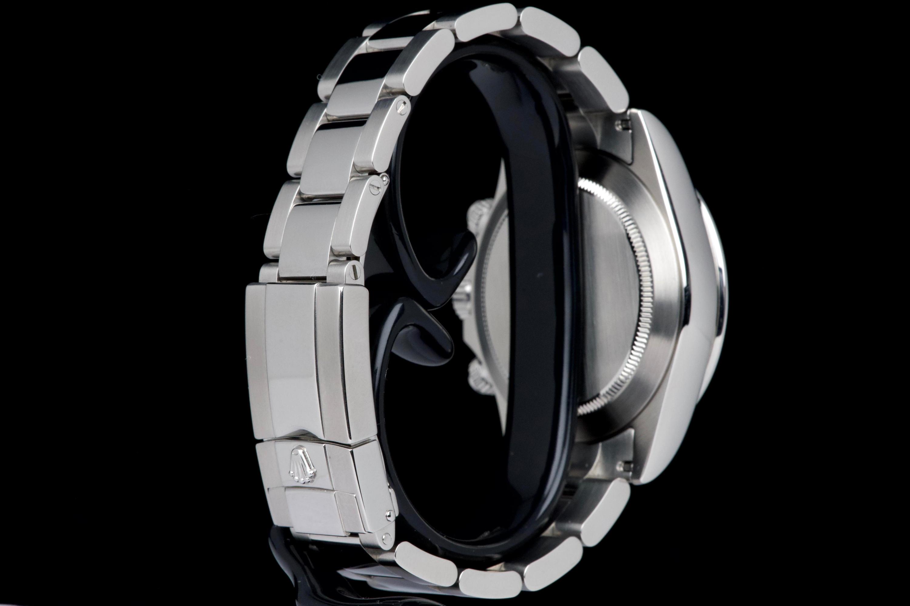 The present Rolex Cosmograph Daytona reference 116520, one of the most emblematic modern chronographs by Rolex, dates to circa 2003 and is offered here as a complete full set. The watch features a 40 mm stainless steel Oyster case with a balanced and sporty profile, combining robustness with timeless design. Its engraved tachymeter bezel and screw-down pushers reinforce the model’s strong racing heritage while ensuring durability and functionality. It is fitted with a black dial featuring contrasting chronograph subdials, offering excellent legibility and a clean, highly recognizable aesthetic. The applied hour markers and luminous hands further enhance visibility in all conditions. Powered by the in-house automatic calibre 4130, the watch delivers outstanding chronometric performance, known for its reliability, robustness, and efficient architecture, with an approximate power reserve of 72 hours. The watch has recently been serviced and polished by our watchmaker and is presented in very good overall condition, showing a clean and refreshed appearance. Offered with its full original set including box, warranty papers, and accessories, this Daytona 116520 represents an excellent opportunity to acquire a highly sought-after Rolex chronograph, combining iconic design, everyday usability, and strong collector appeal.