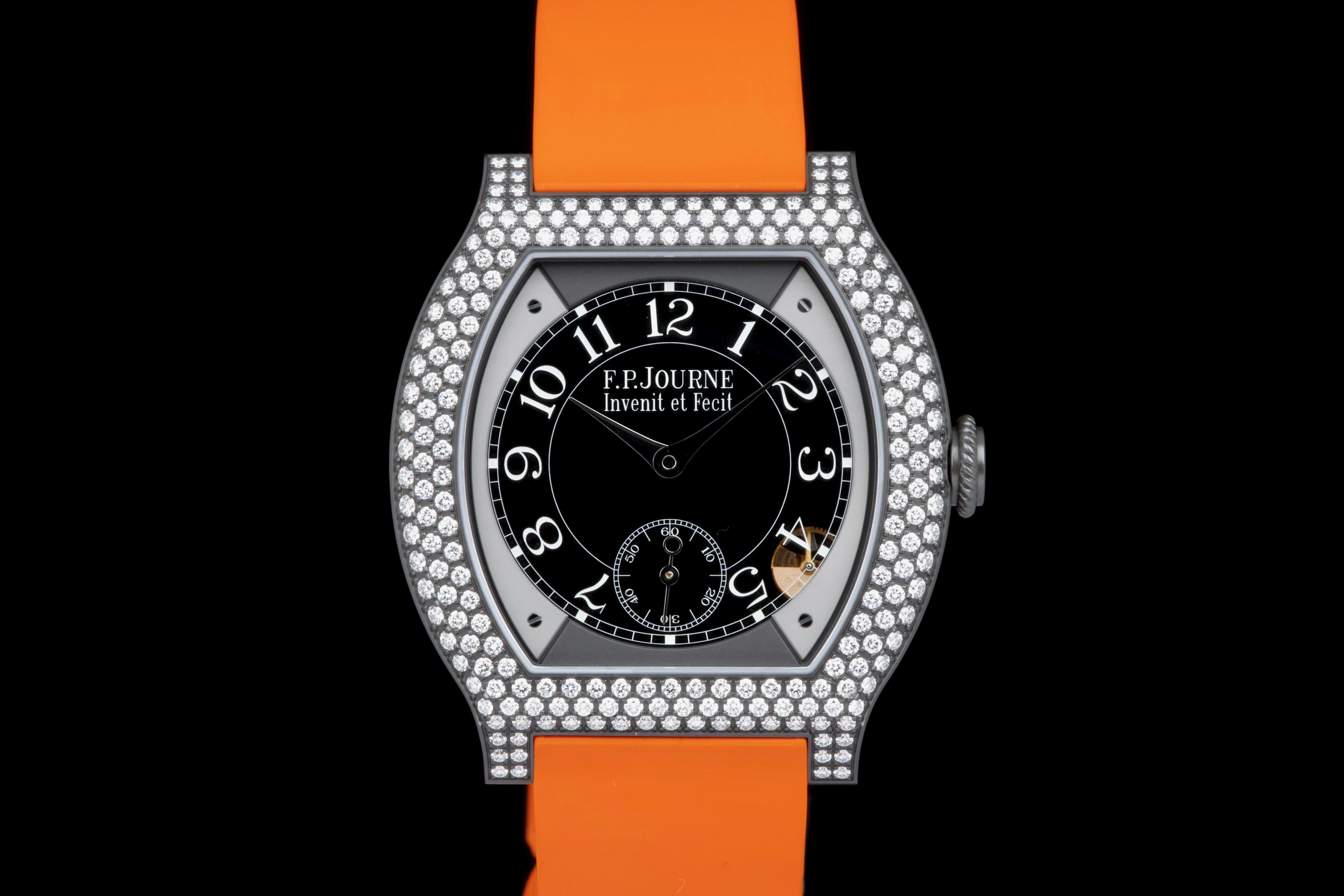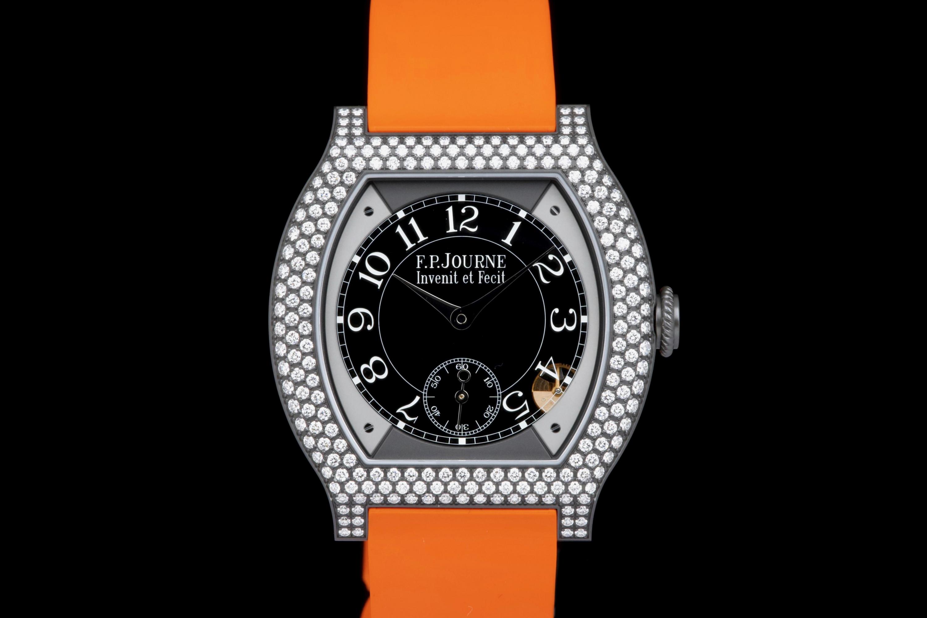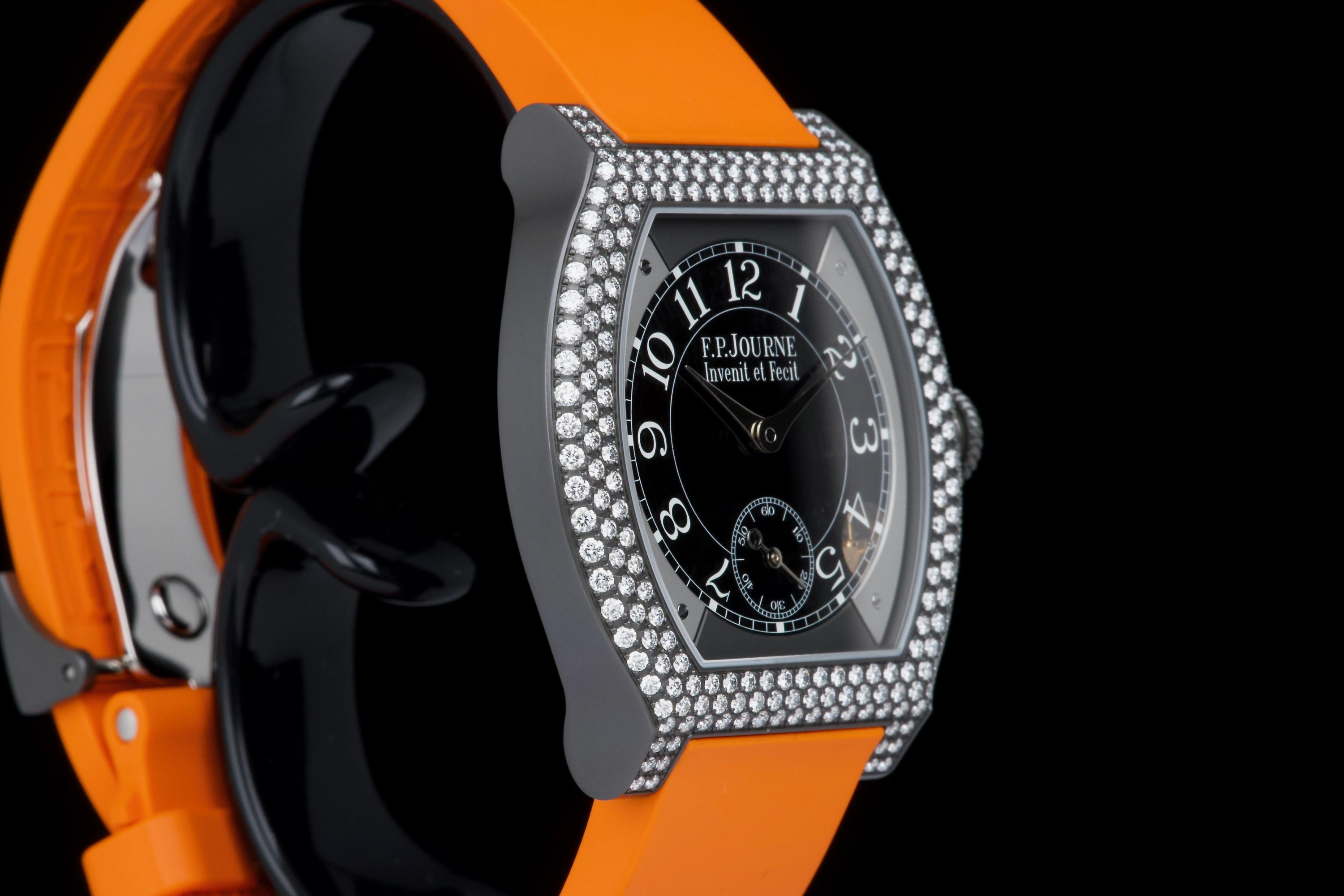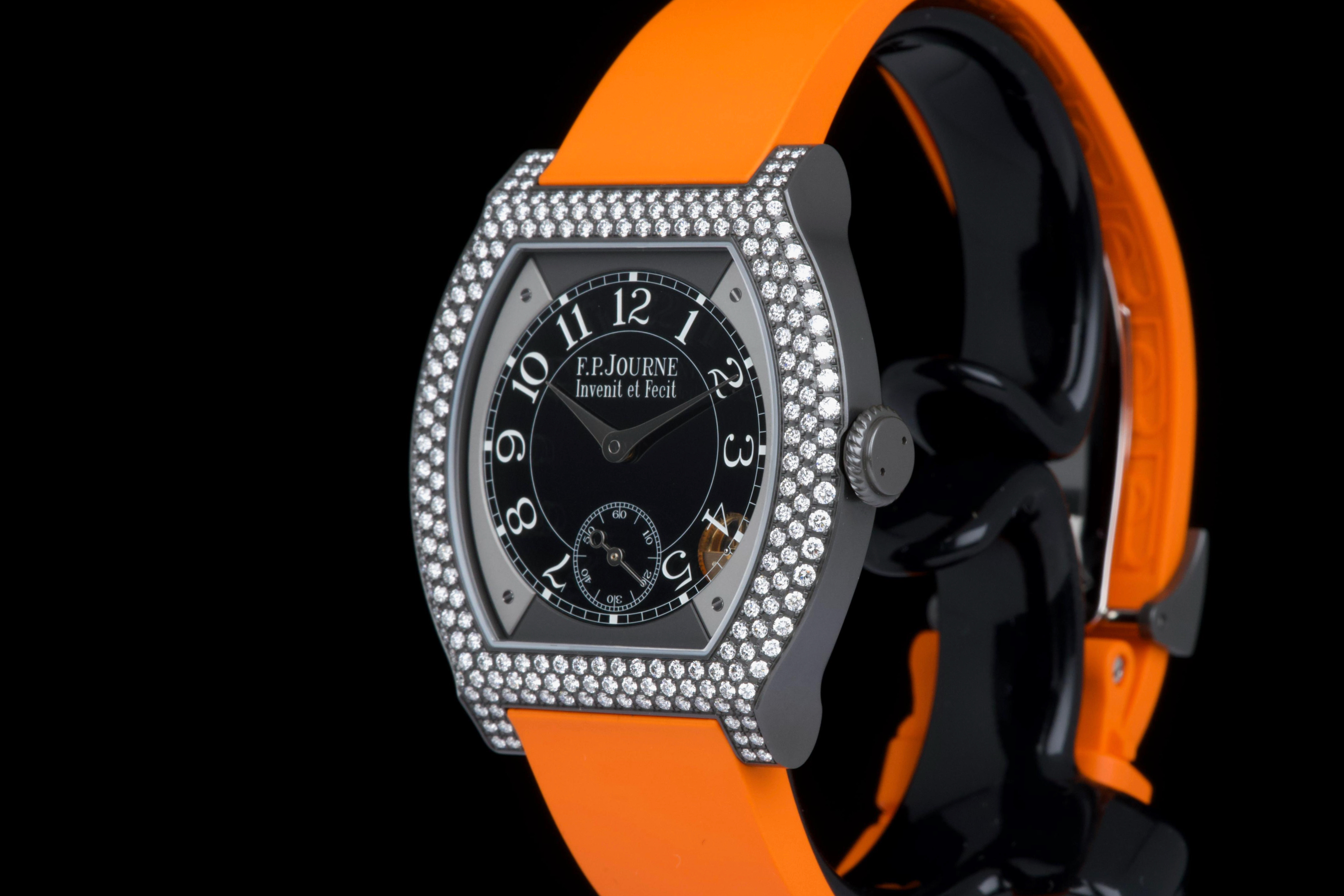 The present F.P. Journe Élégante 40 mm Titalyt®, dating to 2022, is a striking and technically innovative example of François-Paul Journe’s contemporary horological vision, offered here as a complete full set. The distinctive Flat Tortue® case, measuring 40 x 35 mm with an overall height of 7.35 mm, is crafted in titanium and treated with Journe’s proprietary Titalyt® surface process, providing exceptional durability and a refined matte finish. The case is further enhanced by a setting of 222 brilliant-cut diamonds of VS1 clarity and F/G colour, totaling approximately 1.56 carats, giving the watch a luxurious yet modern character. The dial features a sophisticated construction with a black sapphire crystal centre, surrounded by screwed steel outer elements, creating depth and contemporary contrast. The rhodium-plated steel hands, accented in Journe’s signature orange, provide clear legibility and a dynamic aesthetic. True to the Élégante collection, the watch is powered by Journe’s innovative electro-mechanical movement designed for exceptional efficiency and autonomy, capable of entering a standby mode to preserve energy when not worn. This example is fitted with an orange rubber strap and its original folding clasp, perfectly complementing the sporty yet elegant design. The watch is preserved in excellent overall condition, having been very lightly used. Delivered as a full set from 2024, this Élégante Titalyt® diamond model represents a compelling opportunity to acquire a contemporary F.P. Journe creation that blends technical ingenuity, modern materials, and refined luxury in a uniquely distinctive form.