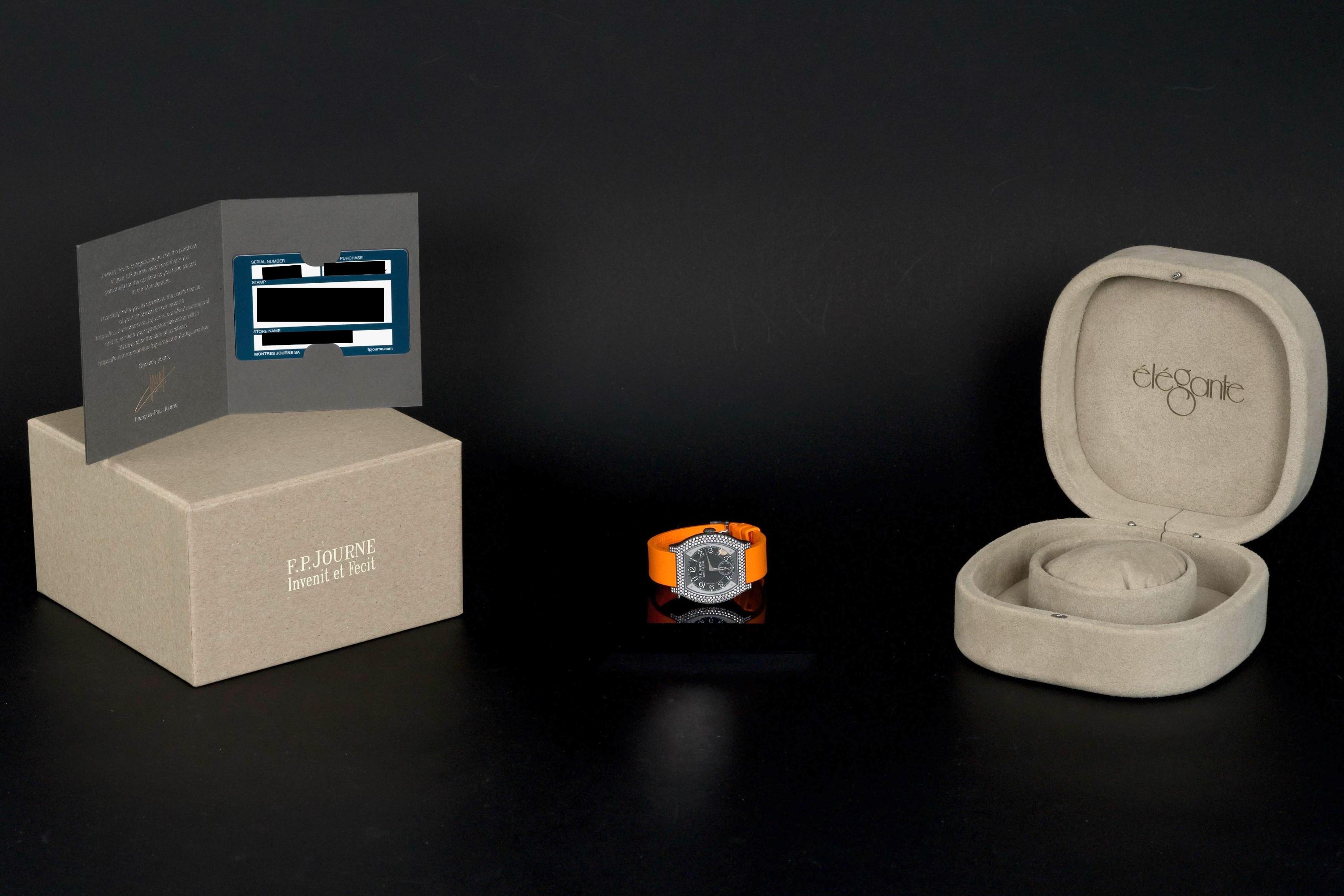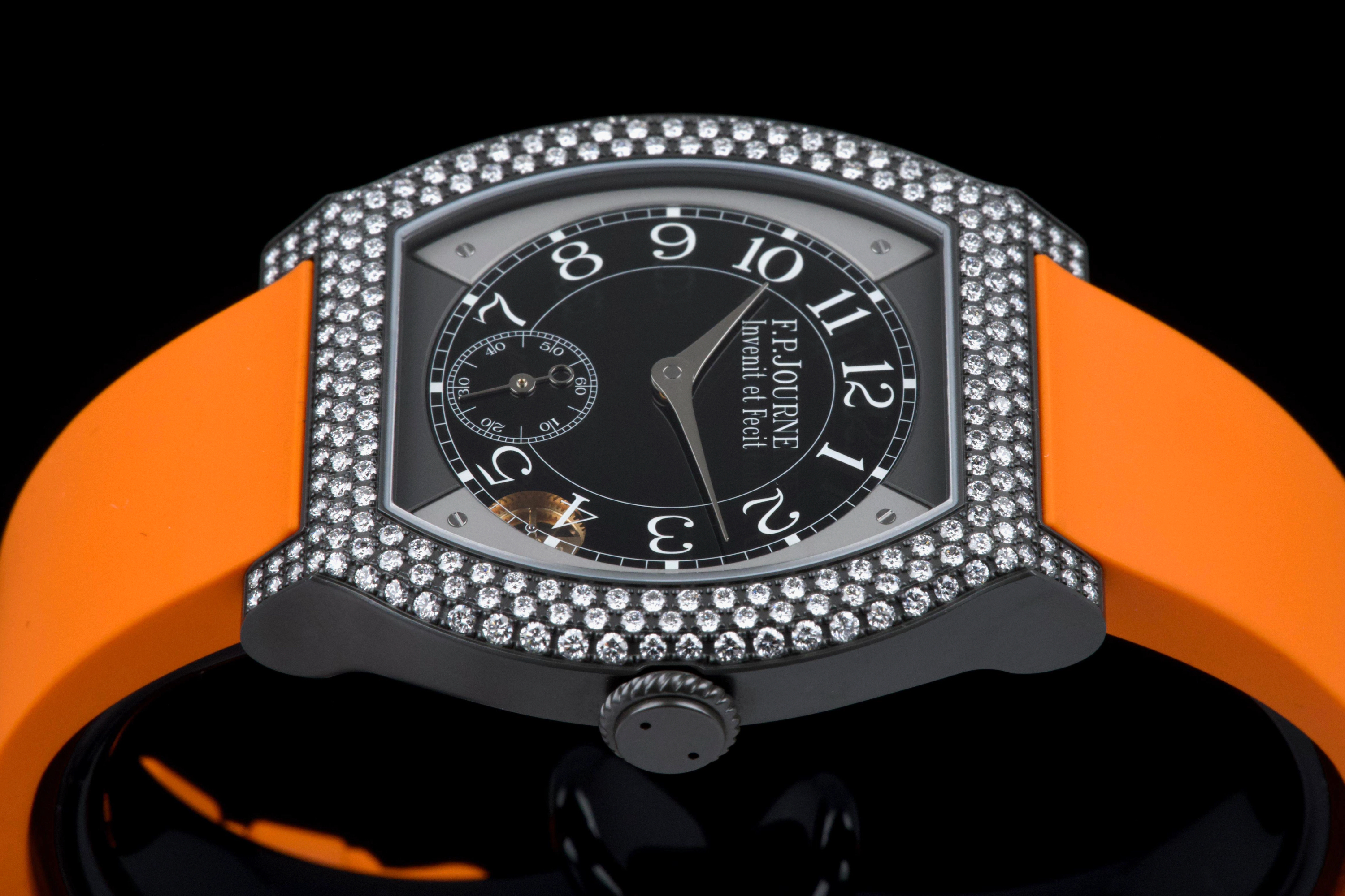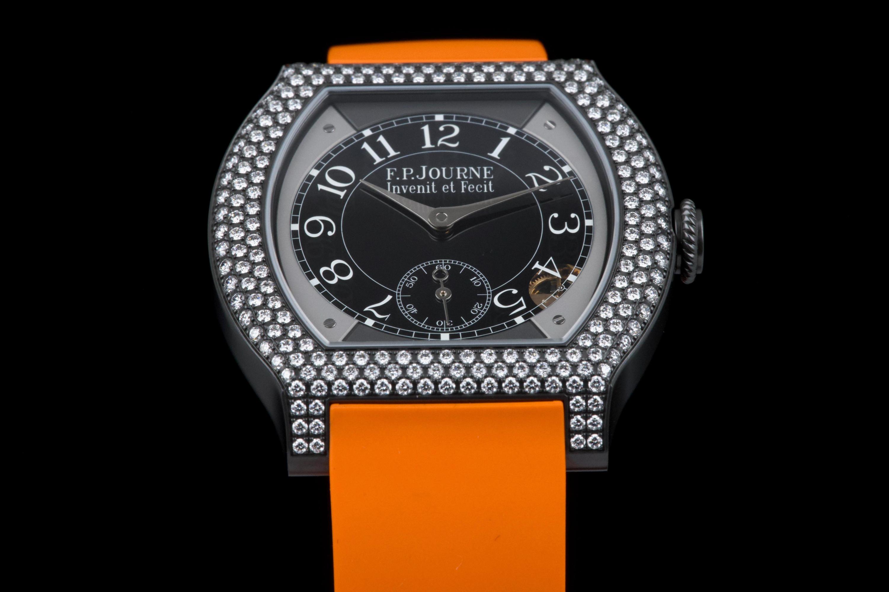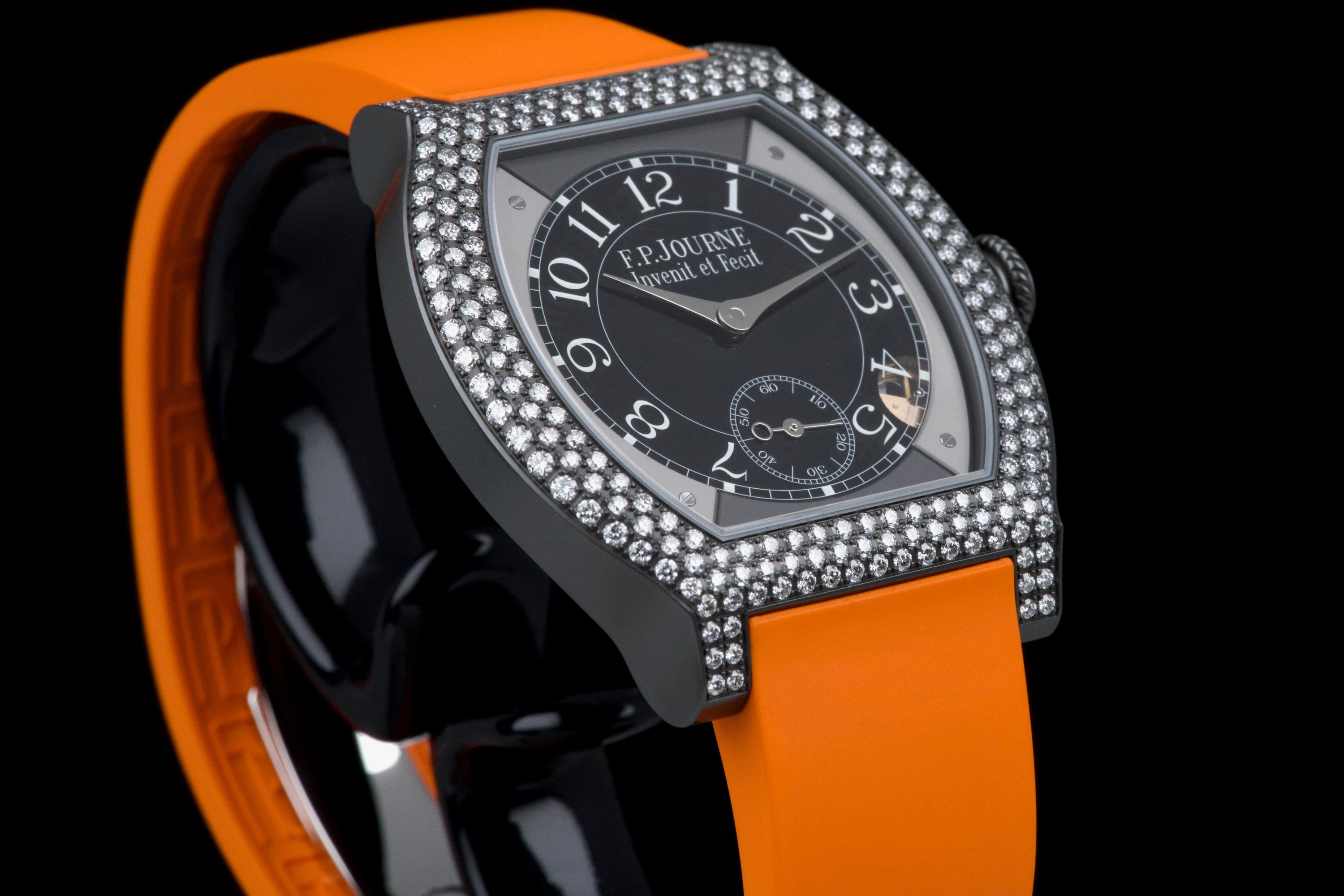 The present F.P. Journe Élégante 40 mm Titalyt®, dating to 2022, is a striking and technically innovative example of François-Paul Journe’s contemporary horological vision, offered here as a complete full set. The distinctive Flat Tortue® case, measuring 40 x 35 mm with an overall height of 7.35 mm, is crafted in titanium and treated with Journe’s proprietary Titalyt® surface process, providing exceptional durability and a refined matte finish. The case is further enhanced by a setting of 222 brilliant-cut diamonds of VS1 clarity and F/G colour, totaling approximately 1.56 carats, giving the watch a luxurious yet modern character. The dial features a sophisticated construction with a black sapphire crystal centre, surrounded by screwed steel outer elements, creating depth and contemporary contrast. The rhodium-plated steel hands, accented in Journe’s signature orange, provide clear legibility and a dynamic aesthetic. True to the Élégante collection, the watch is powered by Journe’s innovative electro-mechanical movement designed for exceptional efficiency and autonomy, capable of entering a standby mode to preserve energy when not worn. This example is fitted with an orange rubber strap and its original folding clasp, perfectly complementing the sporty yet elegant design. The watch is preserved in excellent overall condition, having been very lightly used. Delivered as a full set from 2024, this Élégante Titalyt® diamond model represents a compelling opportunity to acquire a contemporary F.P. Journe creation that blends technical ingenuity, modern materials, and refined luxury in a uniquely distinctive form.