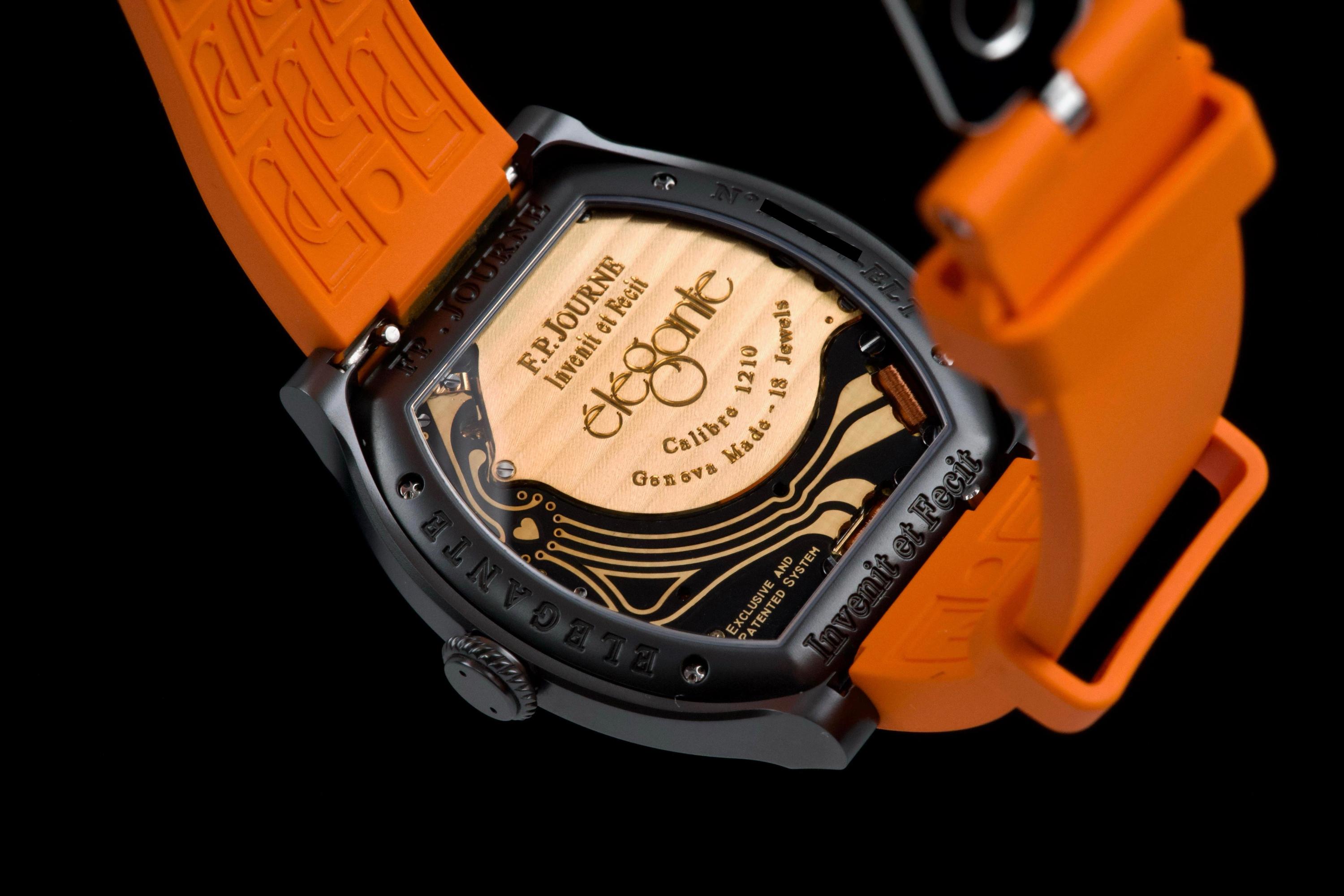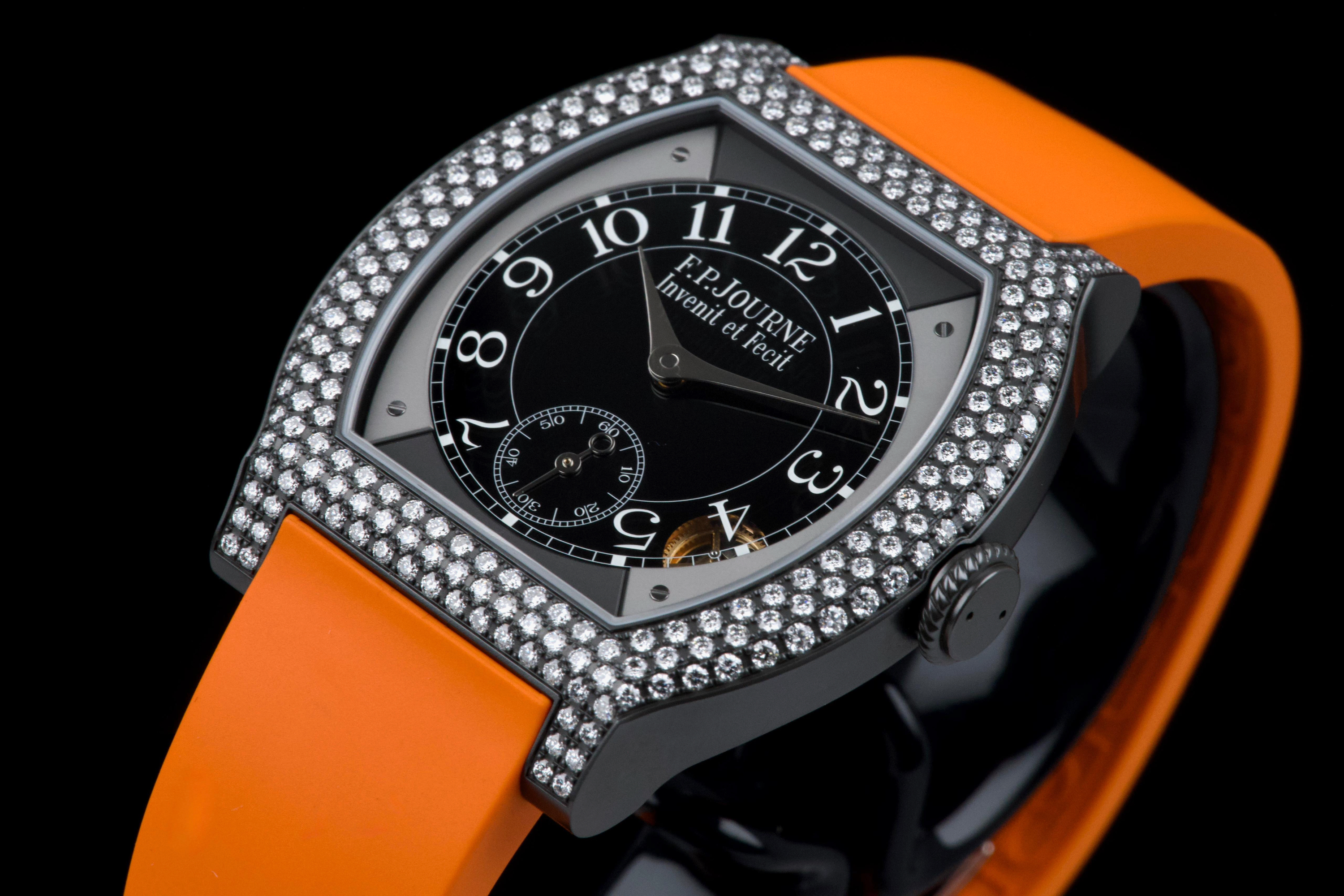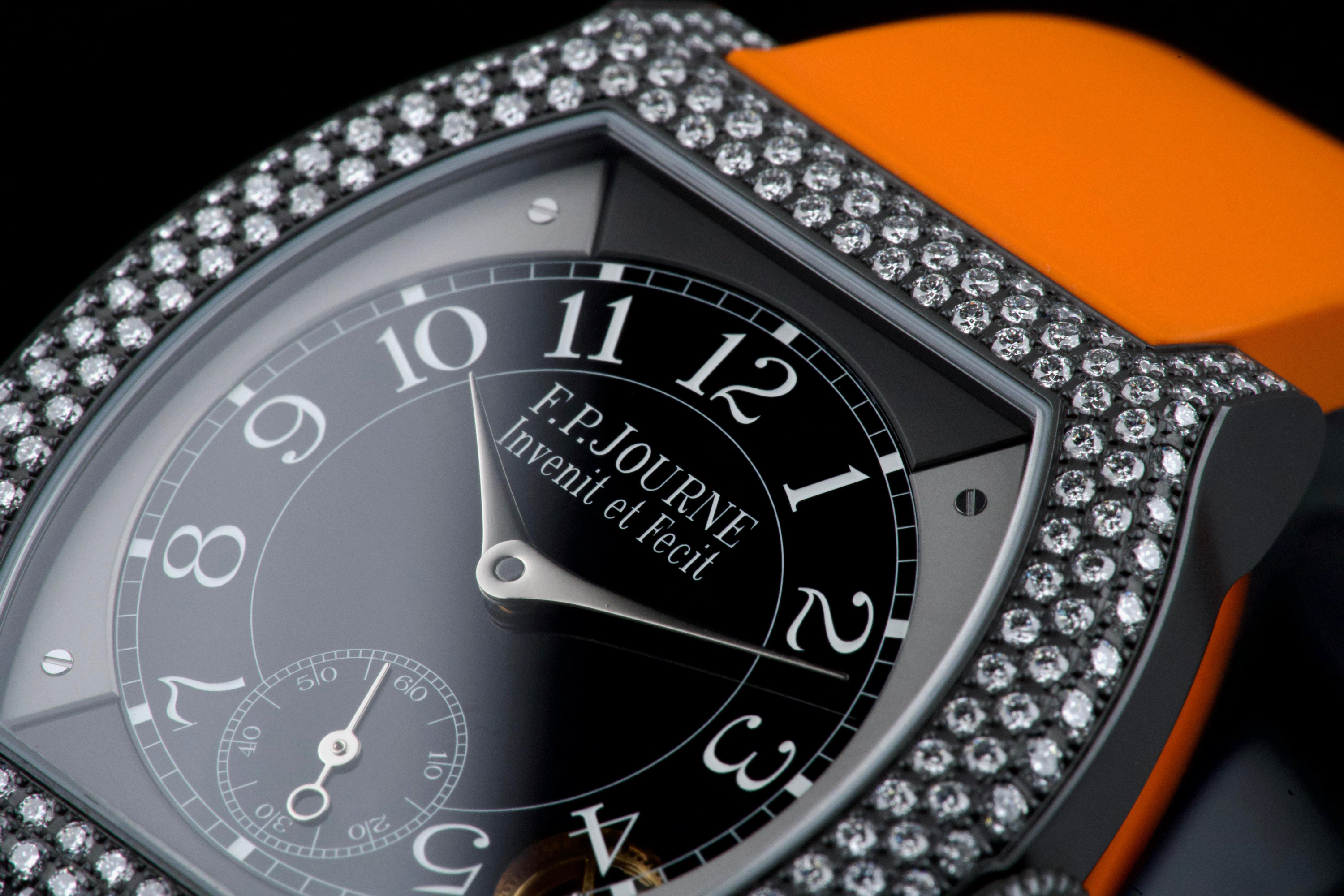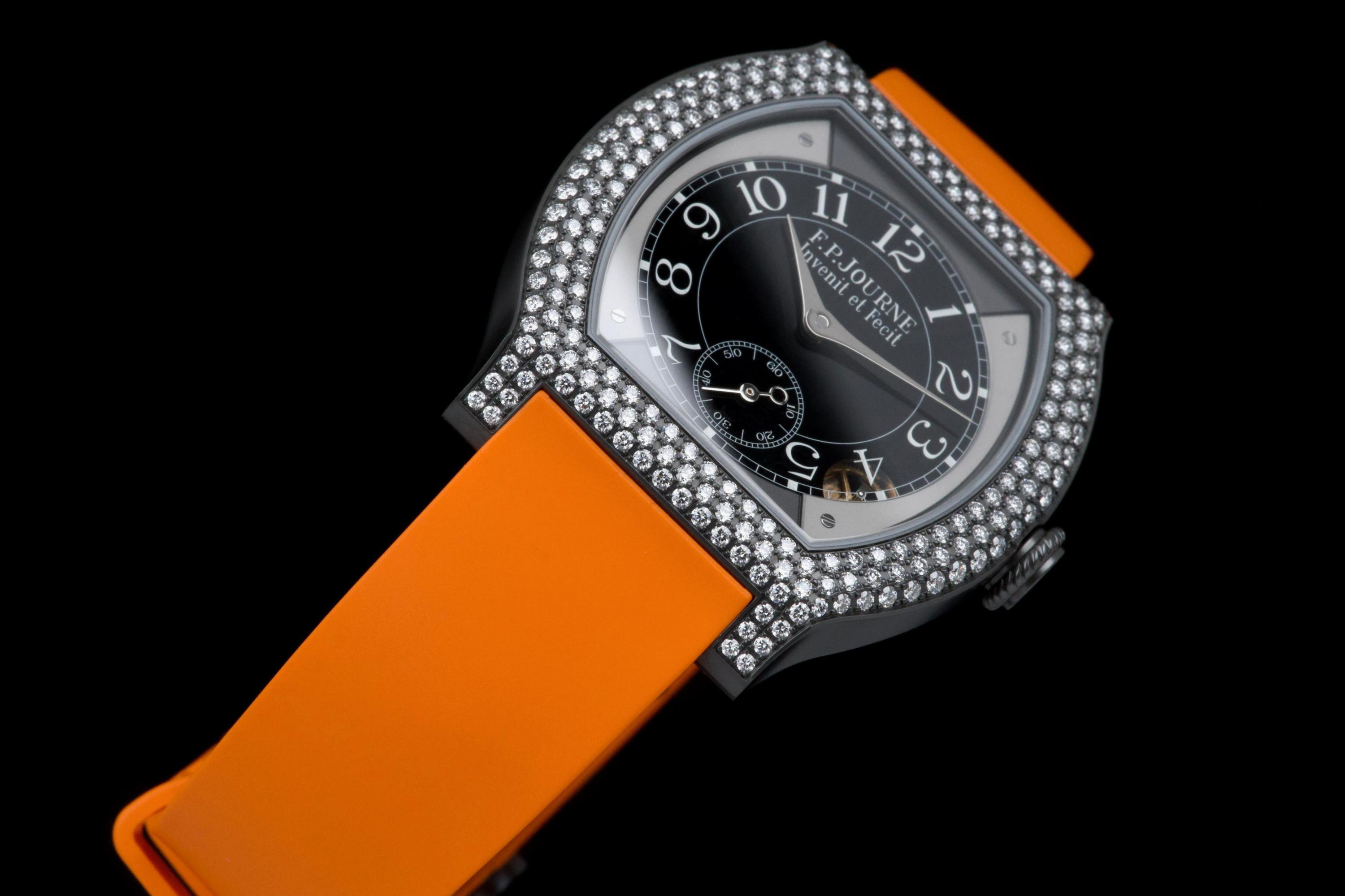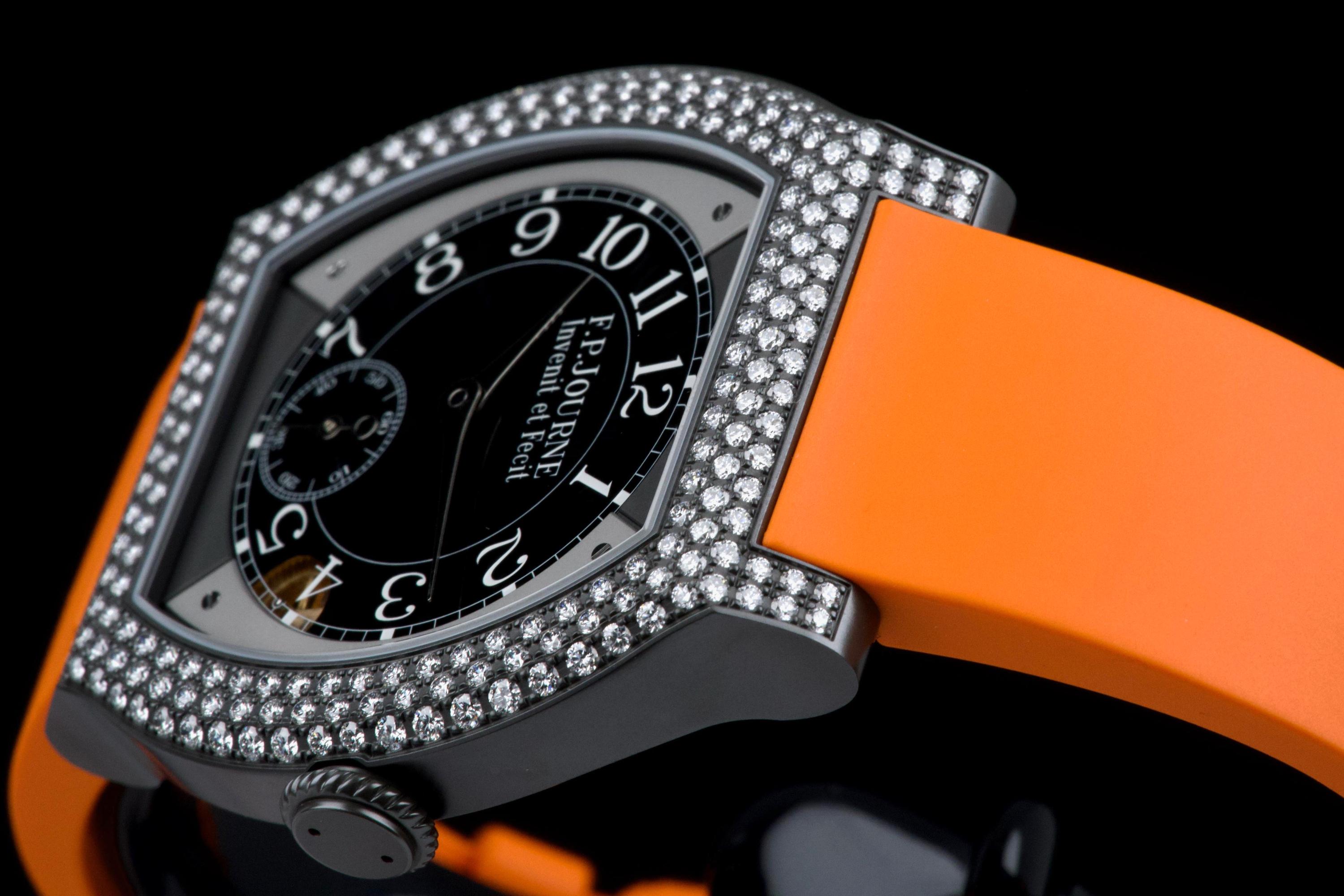 The present F.P. Journe Élégante 40 mm Titalyt®, dating to 2022, is a striking and technically innovative example of François-Paul Journe’s contemporary horological vision, offered here as a complete full set. The distinctive Flat Tortue® case, measuring 40 x 35 mm with an overall height of 7.35 mm, is crafted in titanium and treated with Journe’s proprietary Titalyt® surface process, providing exceptional durability and a refined matte finish. The case is further enhanced by a setting of 222 brilliant-cut diamonds of VS1 clarity and F/G colour, totaling approximately 1.56 carats, giving the watch a luxurious yet modern character. The dial features a sophisticated construction with a black sapphire crystal centre, surrounded by screwed steel outer elements, creating depth and contemporary contrast. The rhodium-plated steel hands, accented in Journe’s signature orange, provide clear legibility and a dynamic aesthetic. True to the Élégante collection, the watch is powered by Journe’s innovative electro-mechanical movement designed for exceptional efficiency and autonomy, capable of entering a standby mode to preserve energy when not worn. This example is fitted with an orange rubber strap and its original folding clasp, perfectly complementing the sporty yet elegant design. The watch is preserved in excellent overall condition, having been very lightly used. Delivered as a full set from 2024, this Élégante Titalyt® diamond model represents a compelling opportunity to acquire a contemporary F.P. Journe creation that blends technical ingenuity, modern materials, and refined luxury in a uniquely distinctive form.