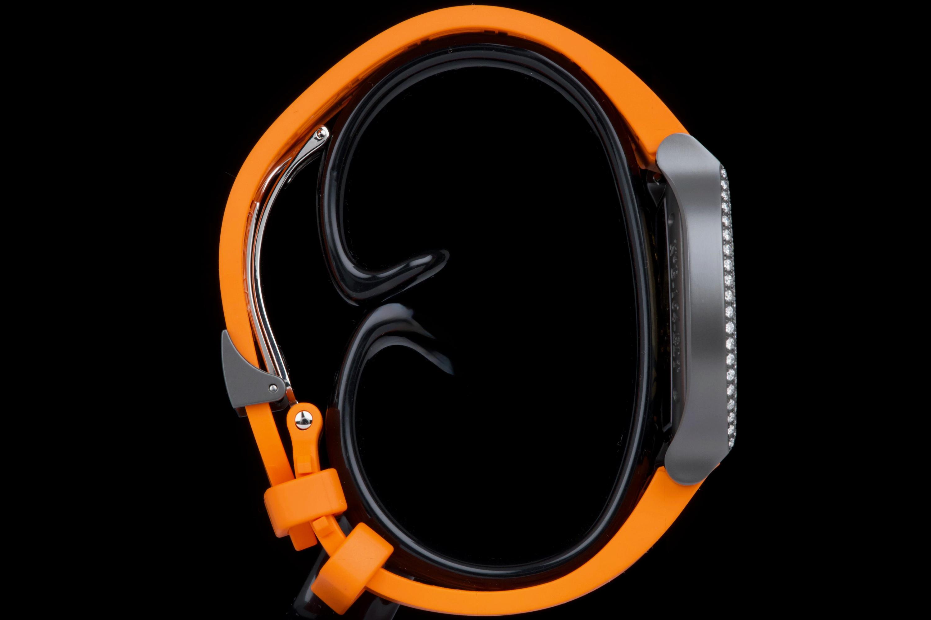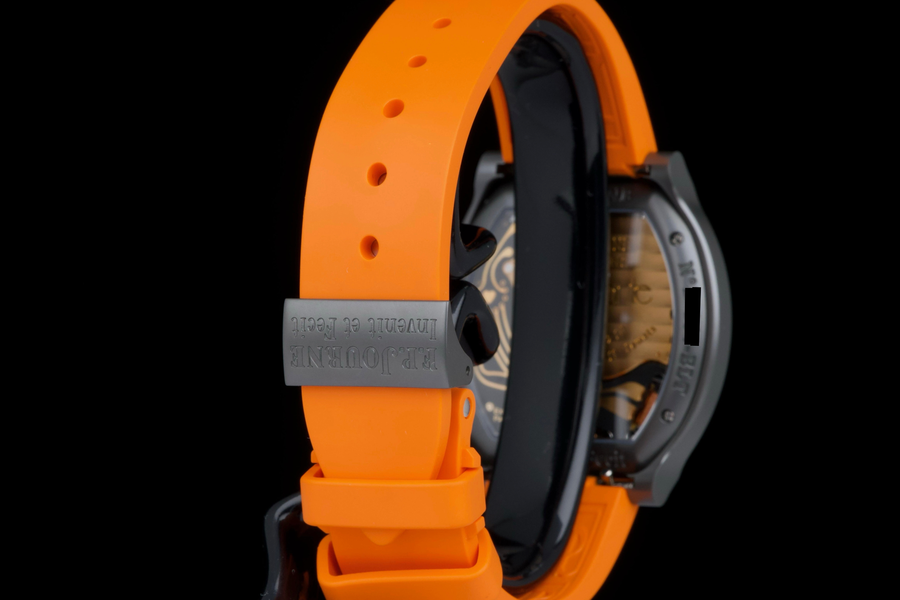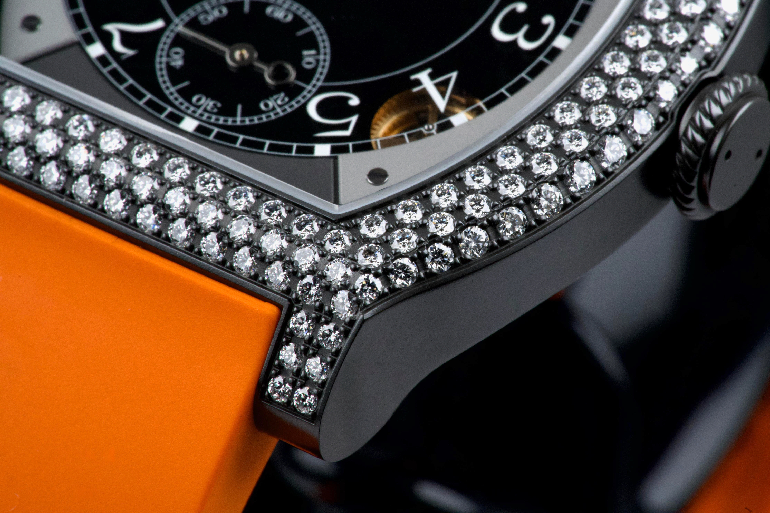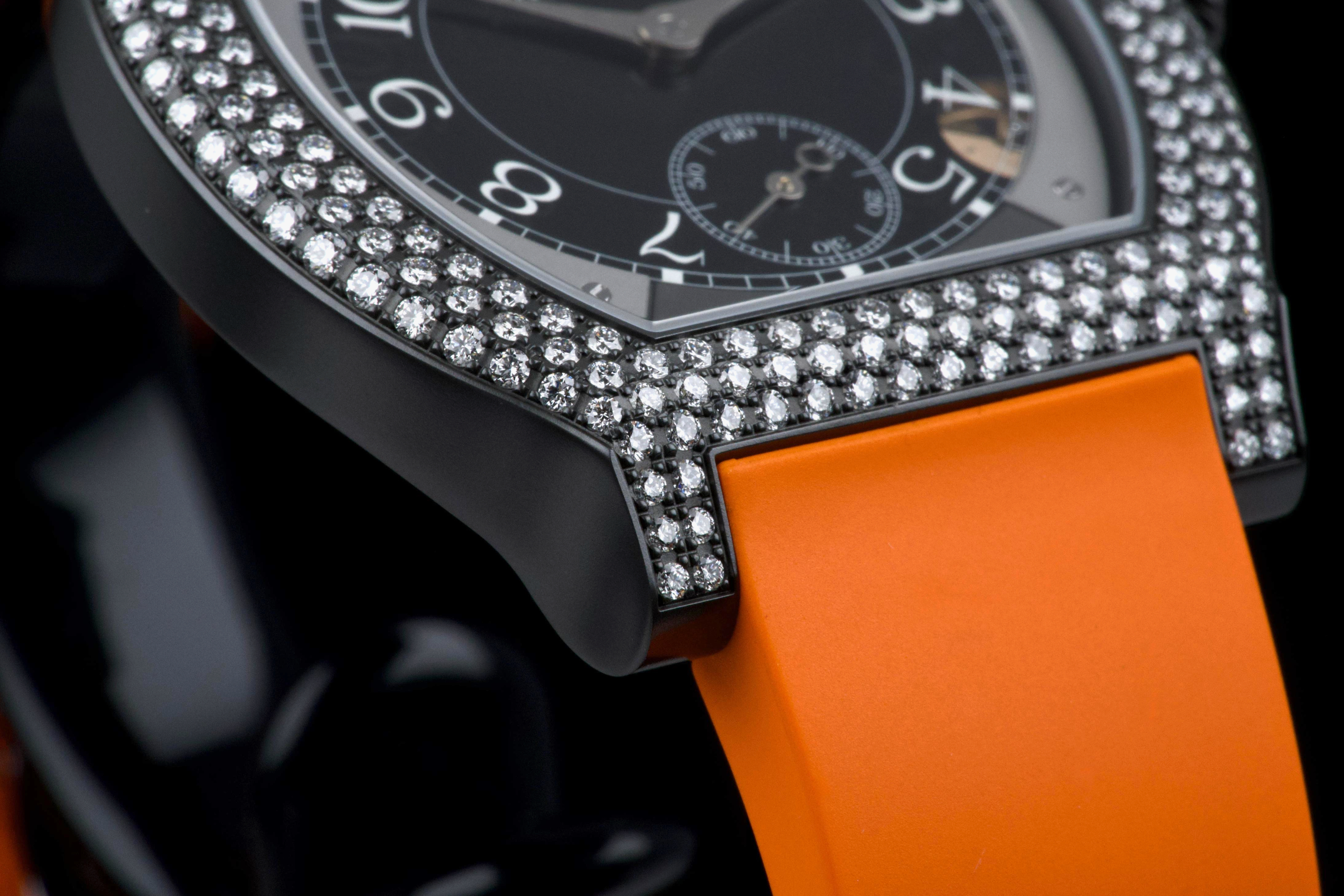 The present F.P. Journe Élégante 40 mm Titalyt®, dating to 2022, is a striking and technically innovative example of François-Paul Journe’s contemporary horological vision, offered here as a complete full set. The distinctive Flat Tortue® case, measuring 40 x 35 mm with an overall height of 7.35 mm, is crafted in titanium and treated with Journe’s proprietary Titalyt® surface process, providing exceptional durability and a refined matte finish. The case is further enhanced by a setting of 222 brilliant-cut diamonds of VS1 clarity and F/G colour, totaling approximately 1.56 carats, giving the watch a luxurious yet modern character. The dial features a sophisticated construction with a black sapphire crystal centre, surrounded by screwed steel outer elements, creating depth and contemporary contrast. The rhodium-plated steel hands, accented in Journe’s signature orange, provide clear legibility and a dynamic aesthetic. True to the Élégante collection, the watch is powered by Journe’s innovative electro-mechanical movement designed for exceptional efficiency and autonomy, capable of entering a standby mode to preserve energy when not worn. This example is fitted with an orange rubber strap and its original folding clasp, perfectly complementing the sporty yet elegant design. The watch is preserved in excellent overall condition, having been very lightly used. Delivered as a full set from 2024, this Élégante Titalyt® diamond model represents a compelling opportunity to acquire a contemporary F.P. Journe creation that blends technical ingenuity, modern materials, and refined luxury in a uniquely distinctive form.