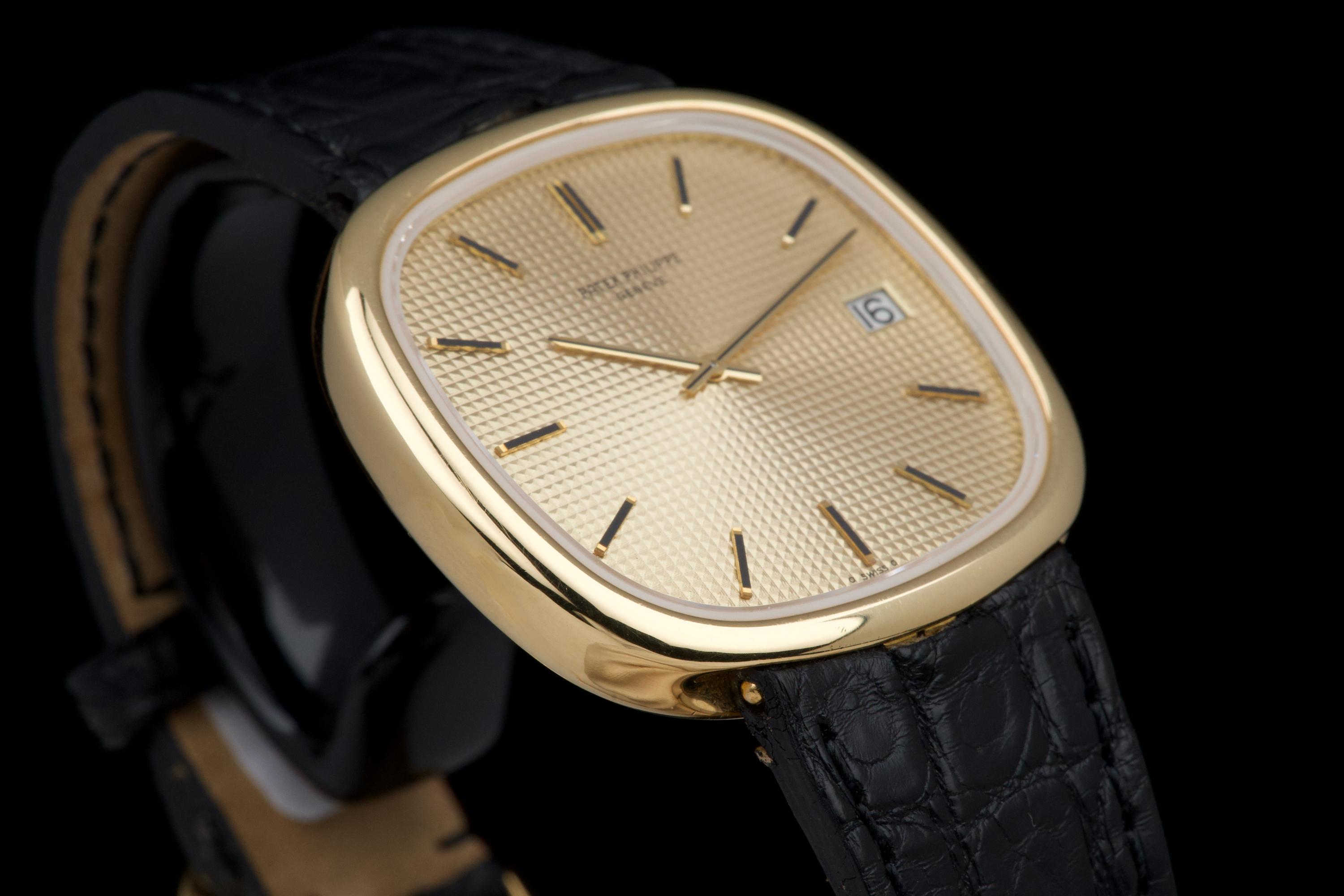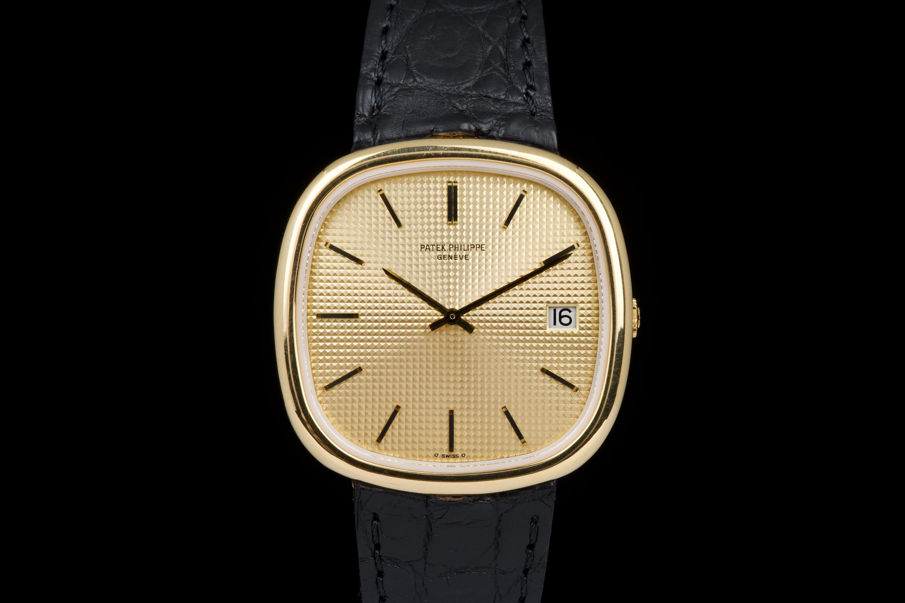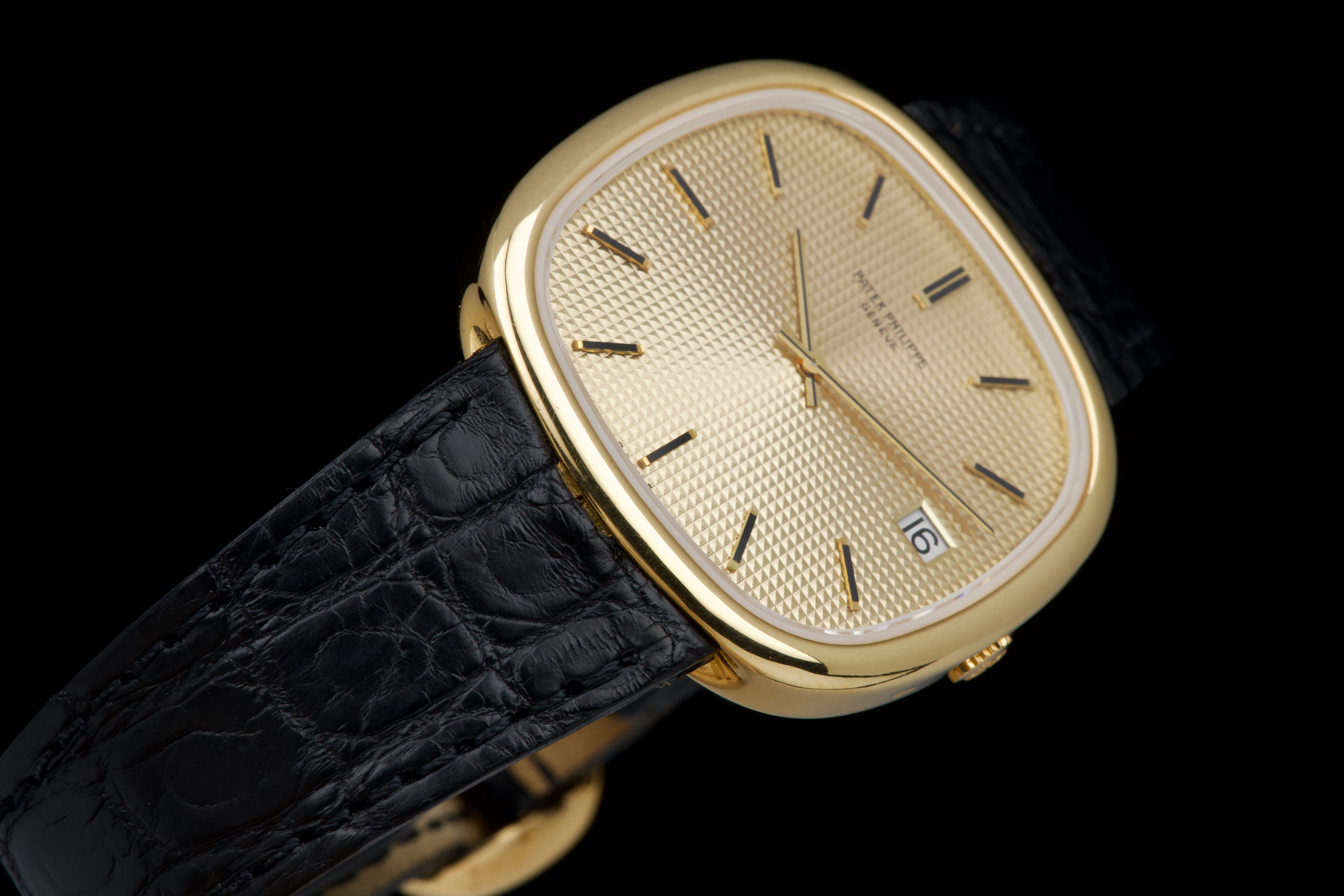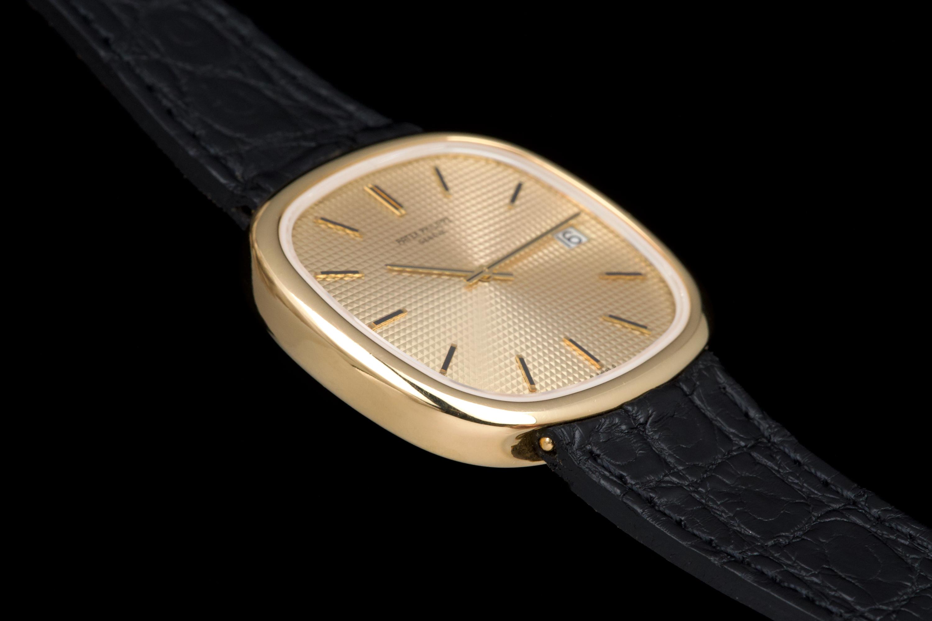 A beautiful example of the Patek Philippe Ellipse "TV Screen" reference 3604 in yellow gold, produced in 1975 and offered here as a full set. The 36 mm yellow-gold case has been polished in the past but still retains deep, well-defined hallmarks, showing only light surface wear with no major marks. The watch features a stunning champagne sigma dial with a tapestry-style texture, perfectly preserved and complemented by matching hands. Please note that the original papers mention a blue dial, from which we can reasonably infer that the dial was changed at some point—most likely by Patek Philippe in the late 1970s or 1980s, as sigma dials have not been available for decades and such changes were commonly executed during factory services of the era. The watch comes on a well-preserved black crocodile strap (non-Patek) with the original Ellipse style yellow-gold buckle. It is offered as a complete full set, including its exceptionally rare period-correct Patek Philippe presentation box that opens in two, undated papers confirming the reference, and a full Patek Germany service document from 2014. A superb and elegant vintage Patek Philippe, rarely seen in such complete form and preserved in excellent overall condition.