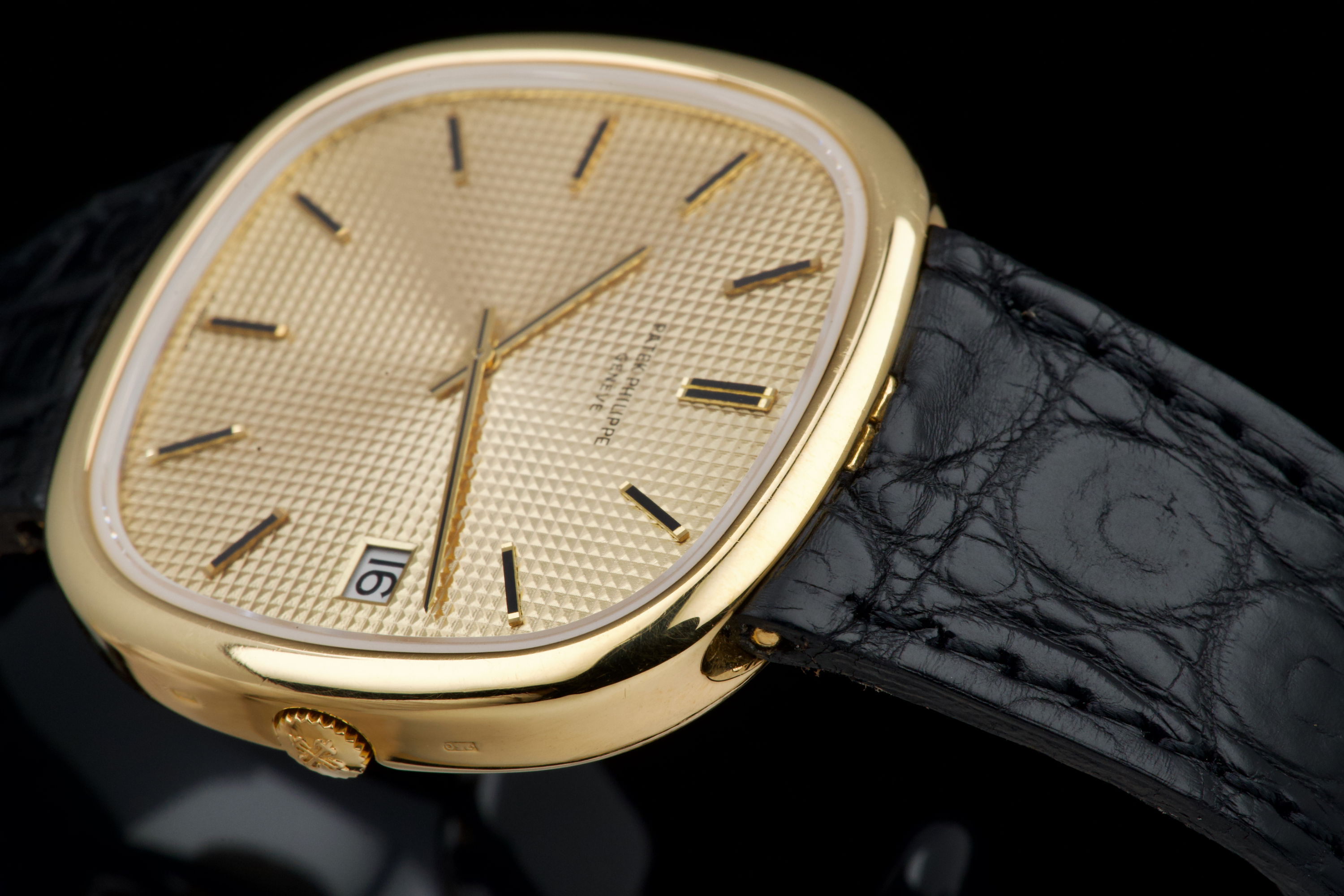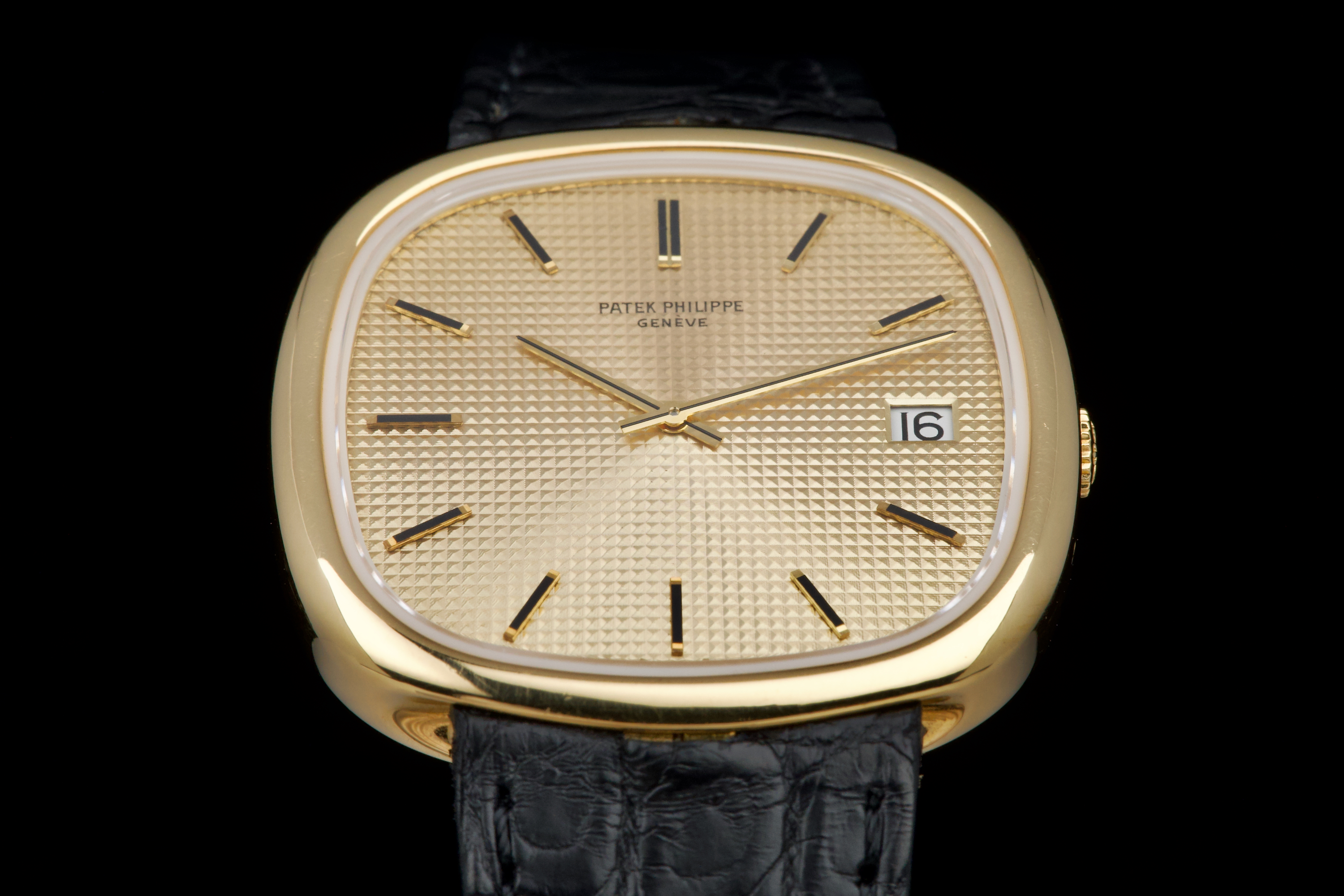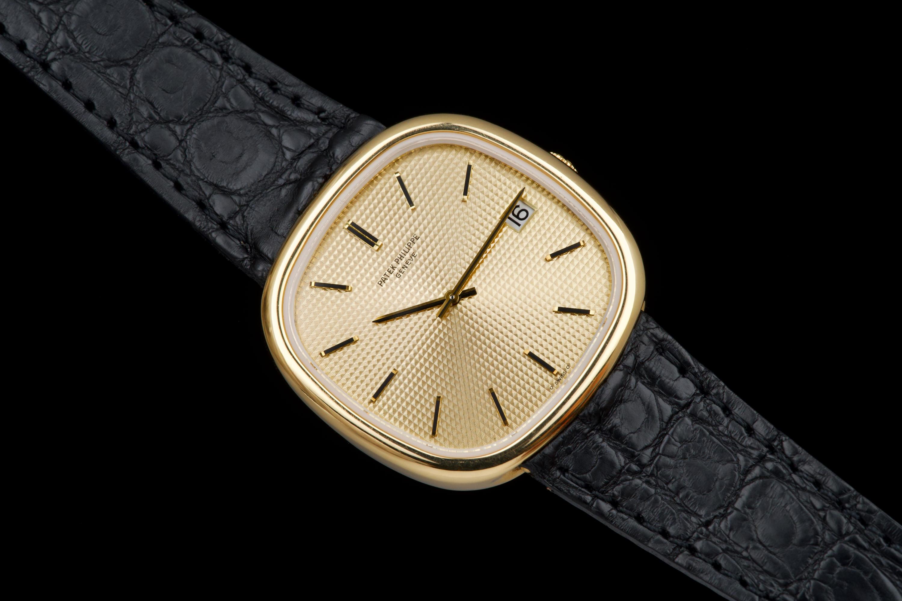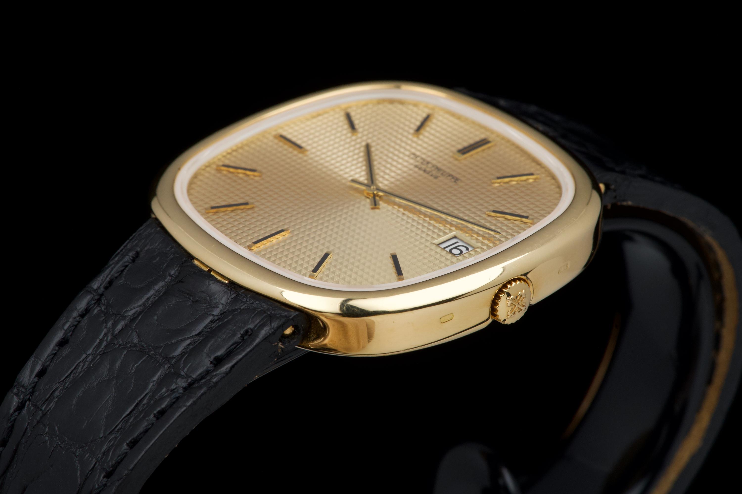 A beautiful example of the Patek Philippe Ellipse "TV Screen" reference 3604 in yellow gold, produced in 1975 and offered here as a full set. The 36 mm yellow-gold case has been polished in the past but still retains deep, well-defined hallmarks, showing only light surface wear with no major marks. The watch features a stunning champagne sigma dial with a tapestry-style texture, perfectly preserved and complemented by matching hands. Please note that the original papers mention a blue dial, from which we can reasonably infer that the dial was changed at some point—most likely by Patek Philippe in the late 1970s or 1980s, as sigma dials have not been available for decades and such changes were commonly executed during factory services of the era. The watch comes on a well-preserved black crocodile strap (non-Patek) with the original Ellipse style yellow-gold buckle. It is offered as a complete full set, including its exceptionally rare period-correct Patek Philippe presentation box that opens in two, undated papers confirming the reference, and a full Patek Germany service document from 2014. A superb and elegant vintage Patek Philippe, rarely seen in such complete form and preserved in excellent overall condition.