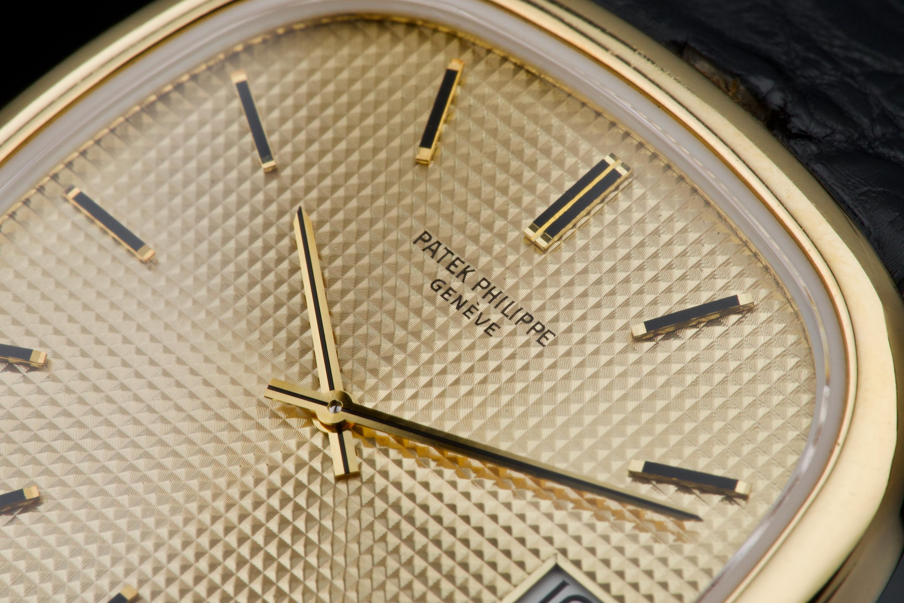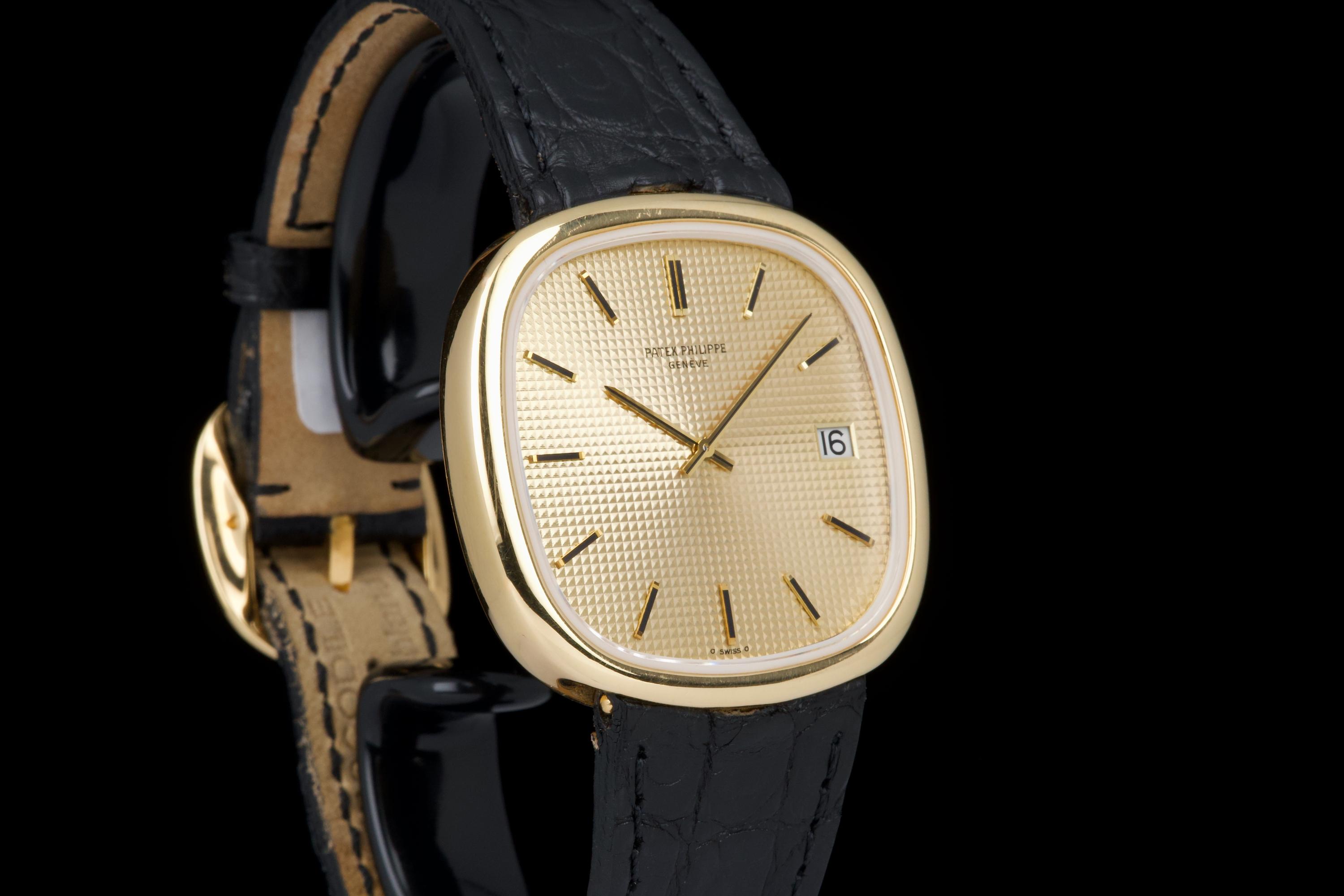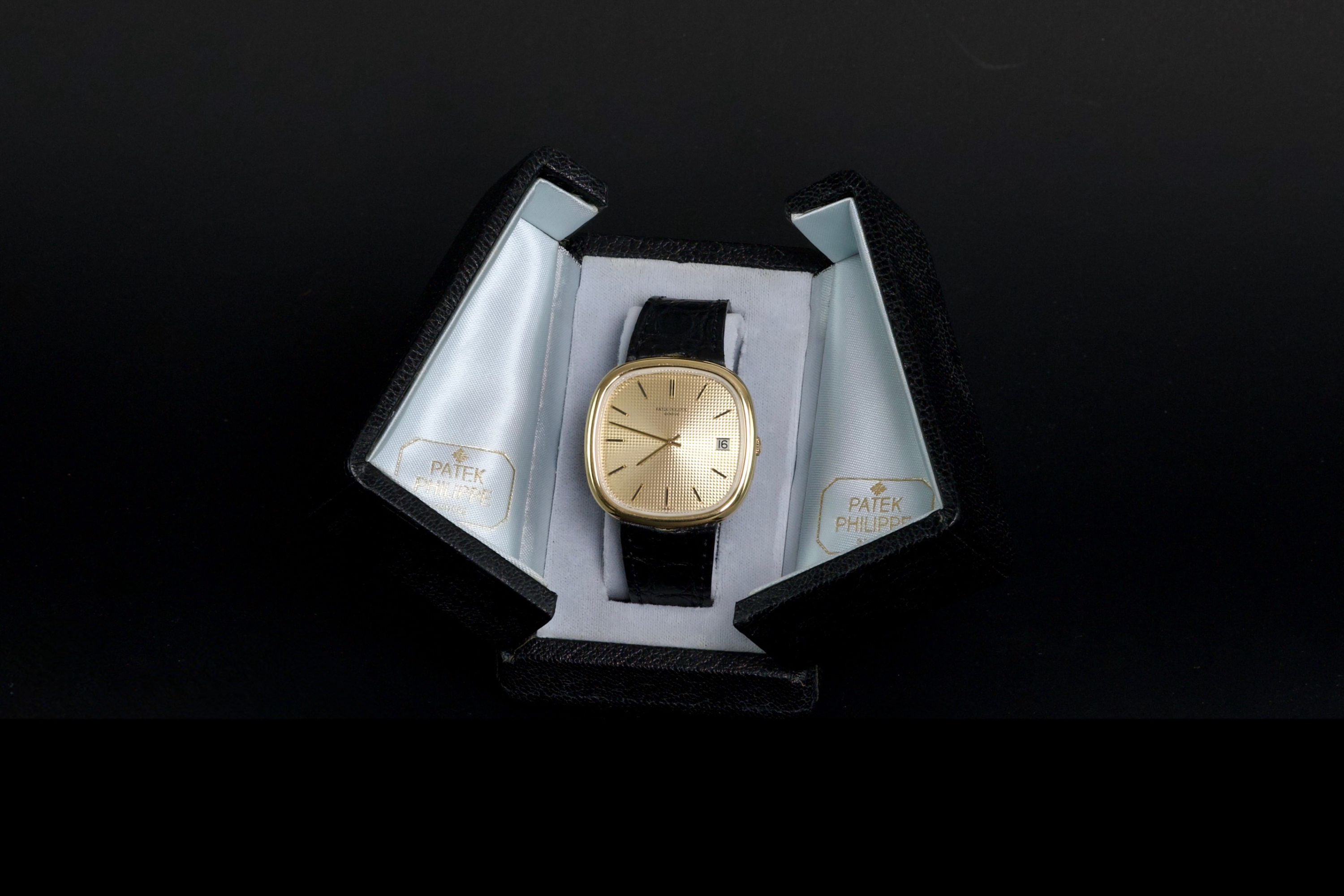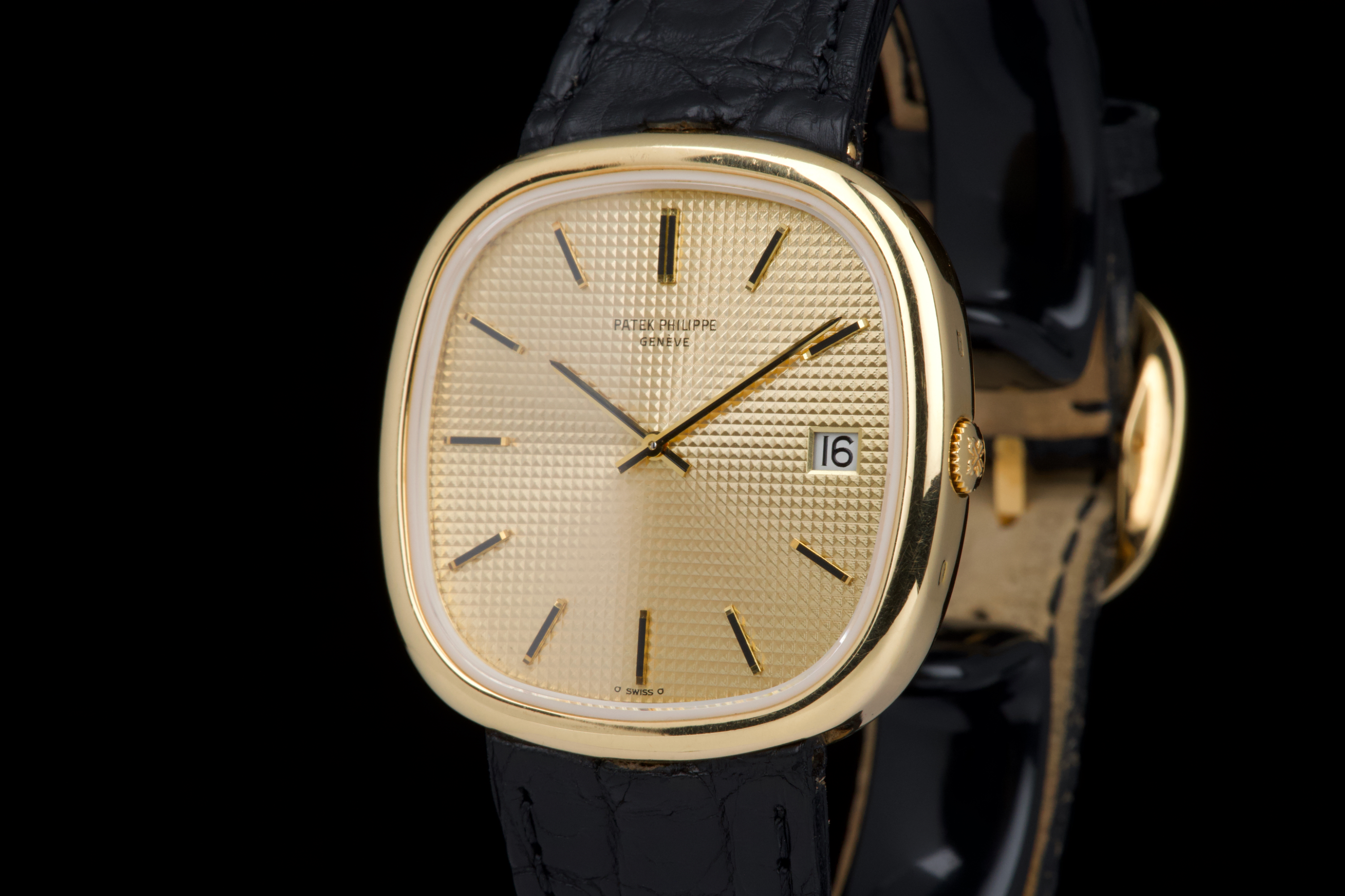 A beautiful example of the Patek Philippe Ellipse "TV Screen" reference 3604 in yellow gold, produced in 1975 and offered here as a full set. The 36 mm yellow-gold case has been polished in the past but still retains deep, well-defined hallmarks, showing only light surface wear with no major marks. The watch features a stunning champagne sigma dial with a tapestry-style texture, perfectly preserved and complemented by matching hands. Please note that the original papers mention a blue dial, from which we can reasonably infer that the dial was changed at some point—most likely by Patek Philippe in the late 1970s or 1980s, as sigma dials have not been available for decades and such changes were commonly executed during factory services of the era. The watch comes on a well-preserved black crocodile strap (non-Patek) with the original Ellipse style yellow-gold buckle. It is offered as a complete full set, including its exceptionally rare period-correct Patek Philippe presentation box that opens in two, undated papers confirming the reference, and a full Patek Germany service document from 2014. A superb and elegant vintage Patek Philippe, rarely seen in such complete form and preserved in excellent overall condition.
