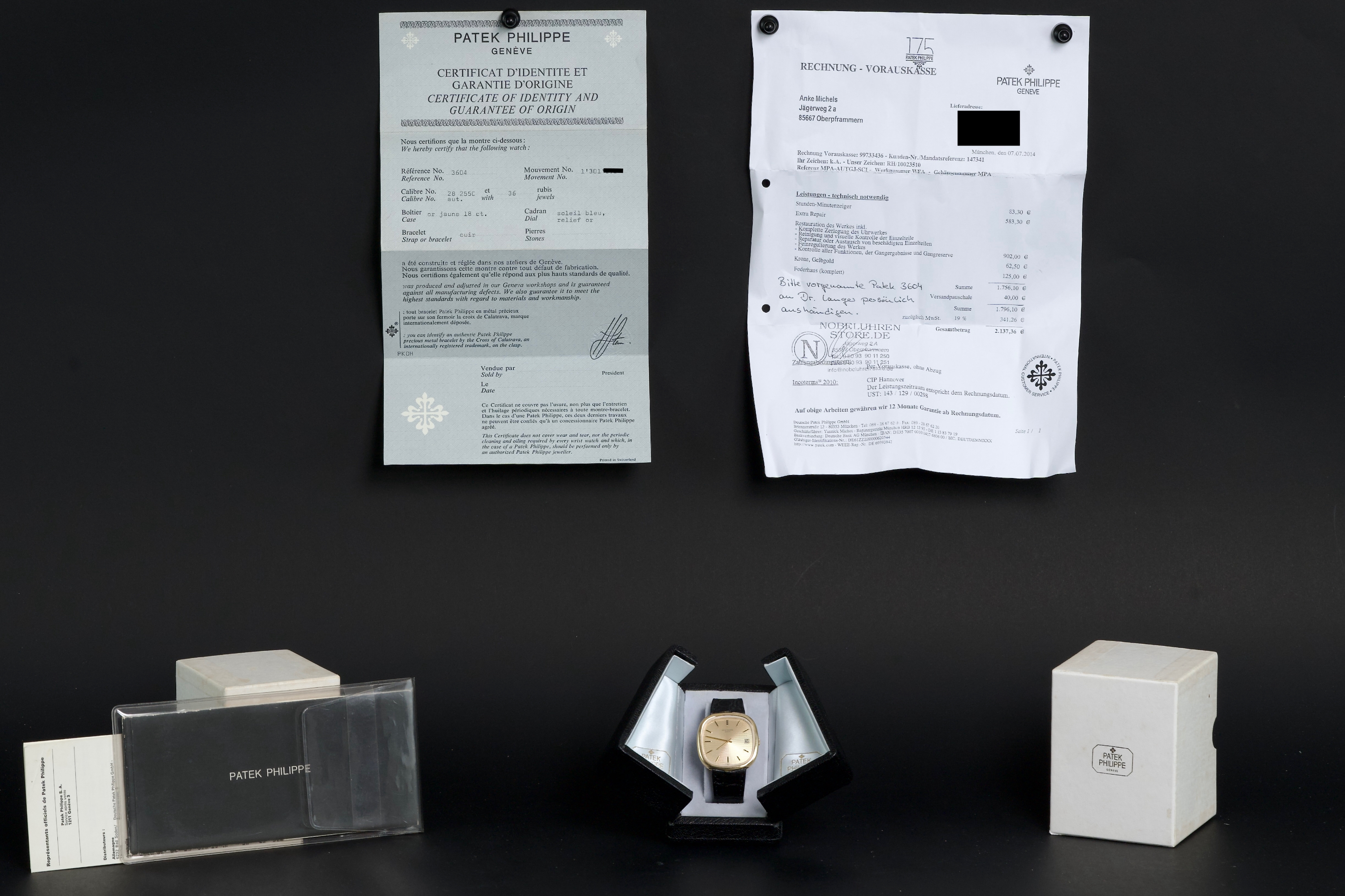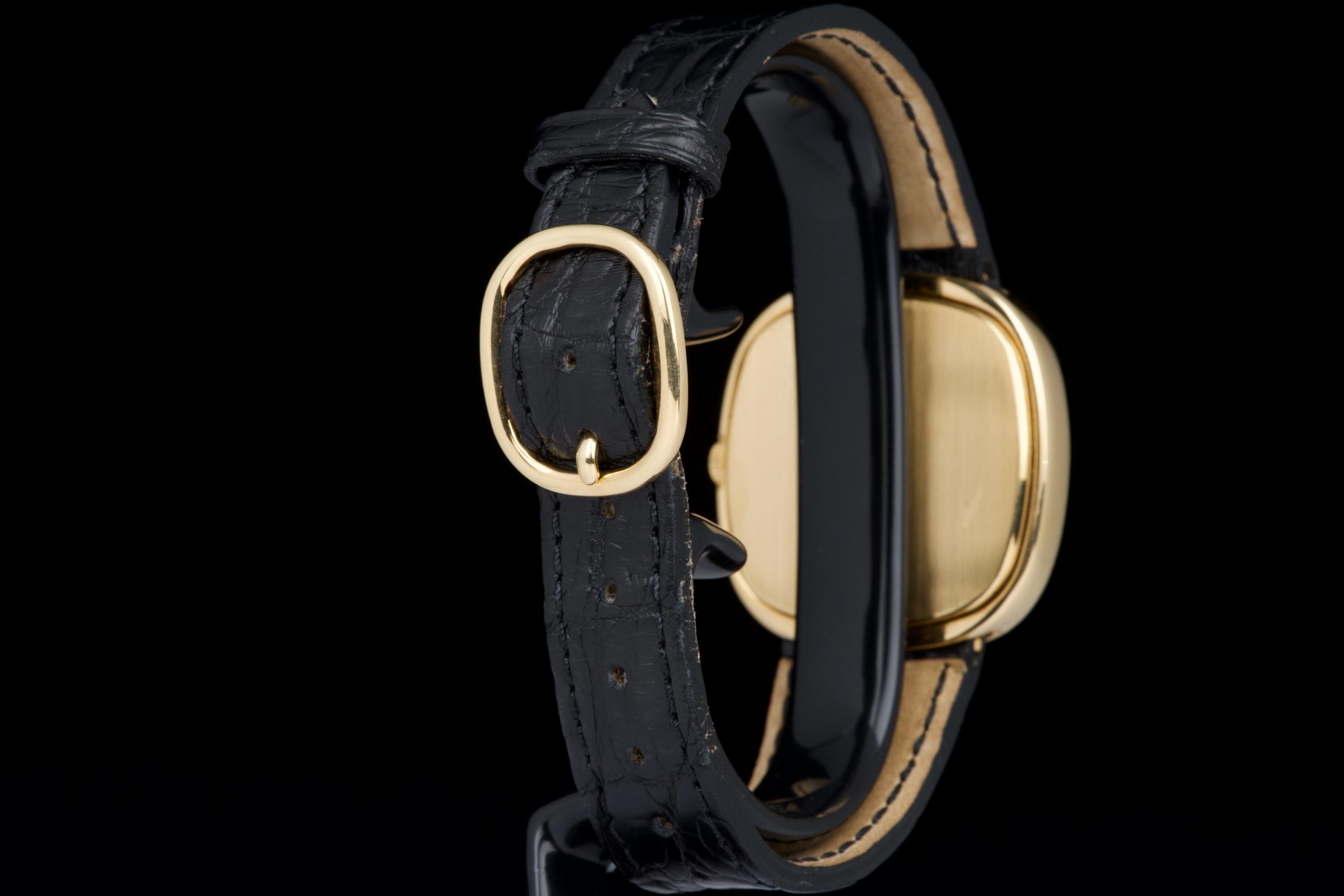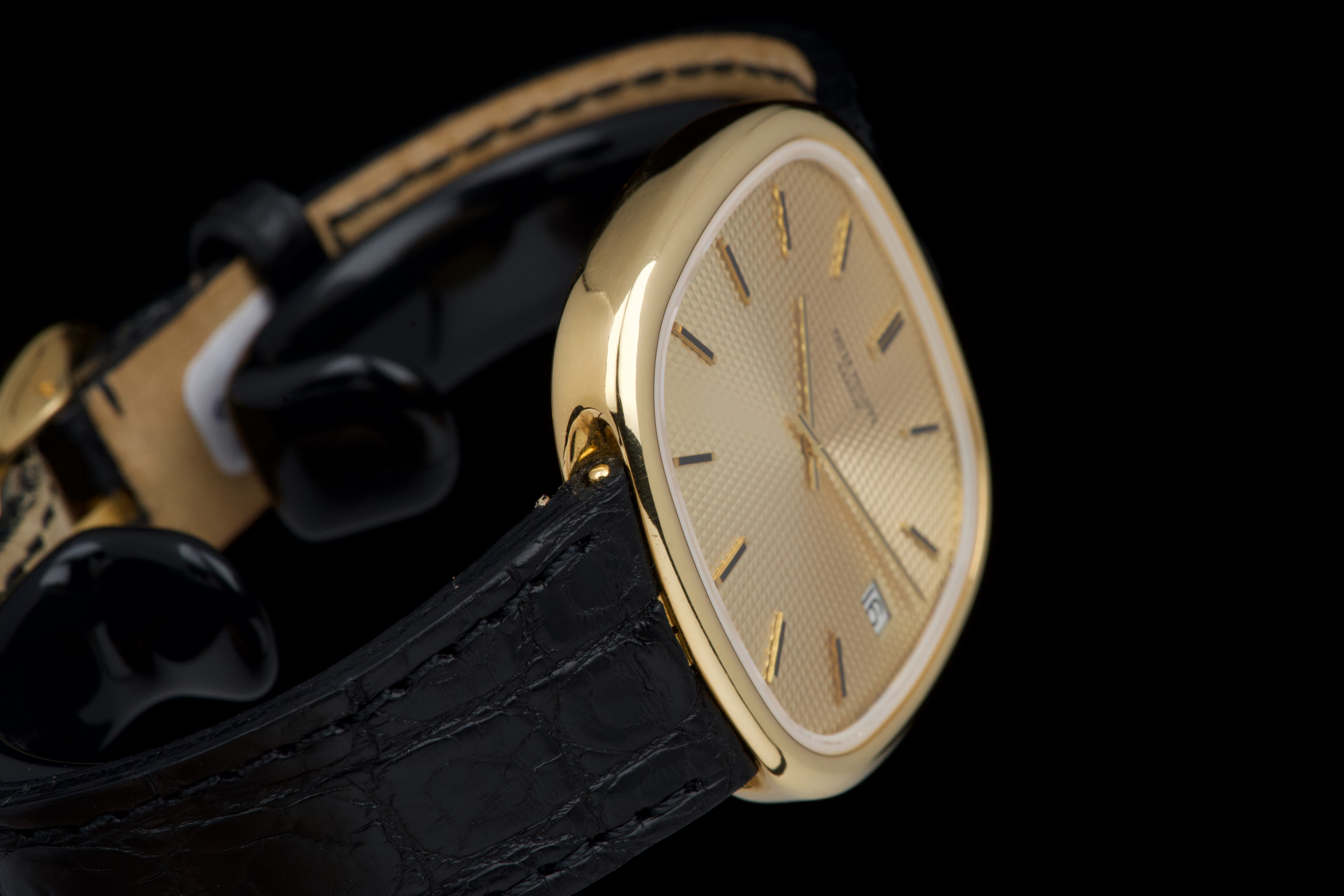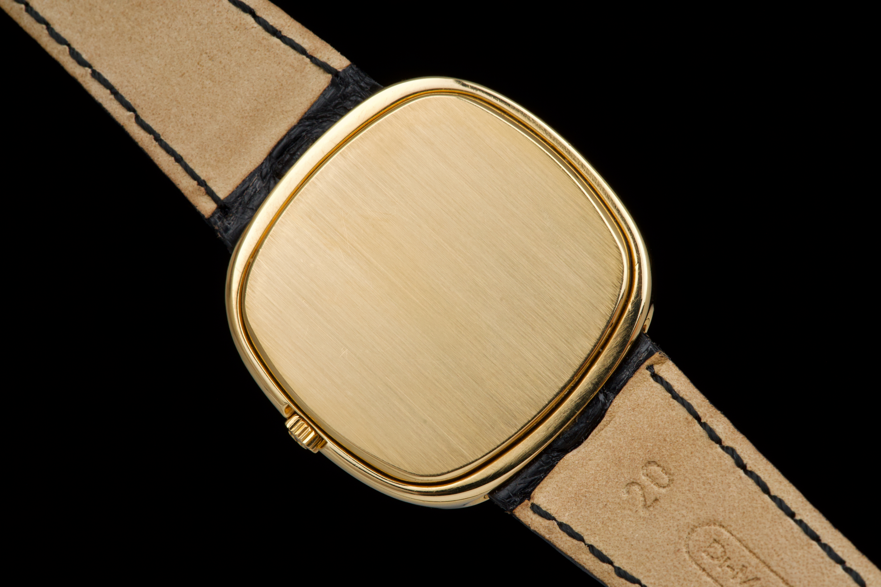 A beautiful example of the Patek Philippe Ellipse "TV Screen" reference 3604 in yellow gold, produced in 1975 and offered here as a full set. The 36 mm yellow-gold case has been polished in the past but still retains deep, well-defined hallmarks, showing only light surface wear with no major marks. The watch features a stunning champagne sigma dial with a tapestry-style texture, perfectly preserved and complemented by matching hands. Please note that the original papers mention a blue dial, from which we can reasonably infer that the dial was changed at some point—most likely by Patek Philippe in the late 1970s or 1980s, as sigma dials have not been available for decades and such changes were commonly executed during factory services of the era. The watch comes on a well-preserved black crocodile strap (non-Patek) with the original Ellipse style yellow-gold buckle. It is offered as a complete full set, including its exceptionally rare period-correct Patek Philippe presentation box that opens in two, undated papers confirming the reference, and a full Patek Germany service document from 2014. A superb and elegant vintage Patek Philippe, rarely seen in such complete form and preserved in excellent overall condition.