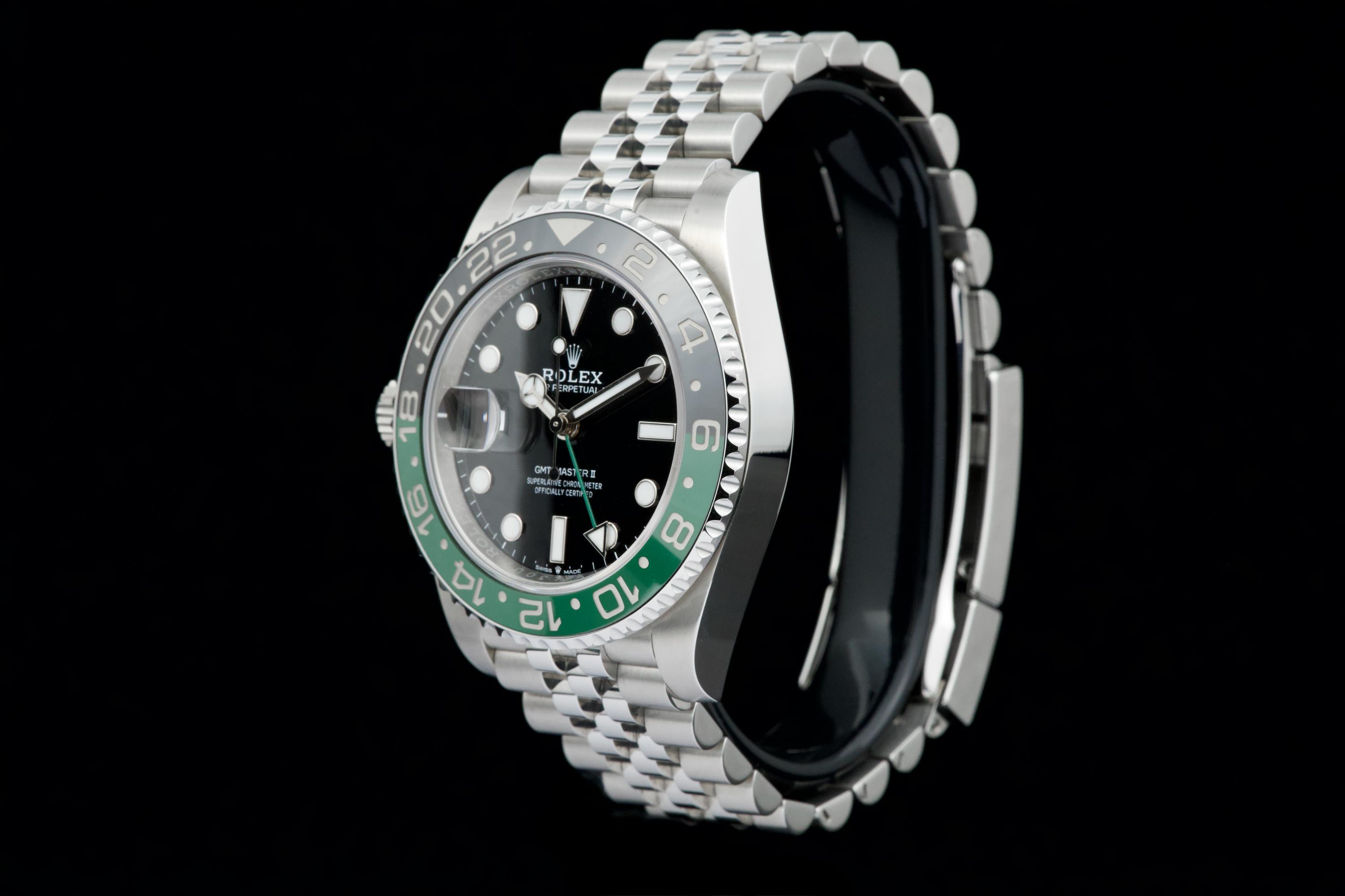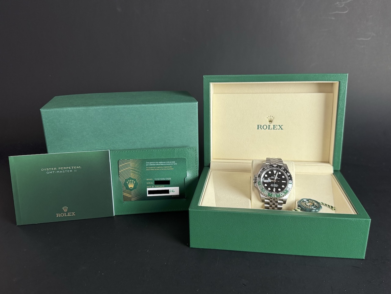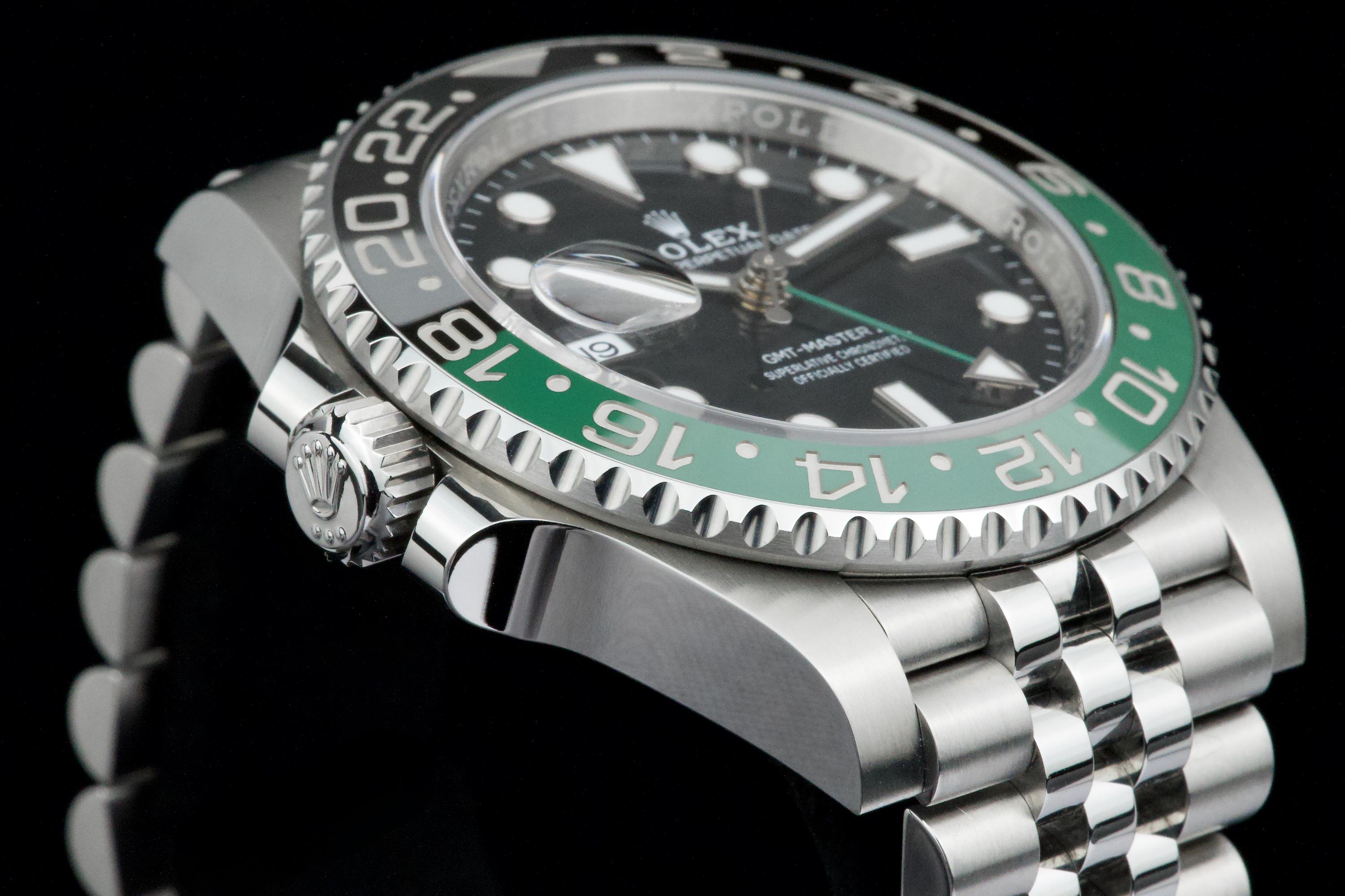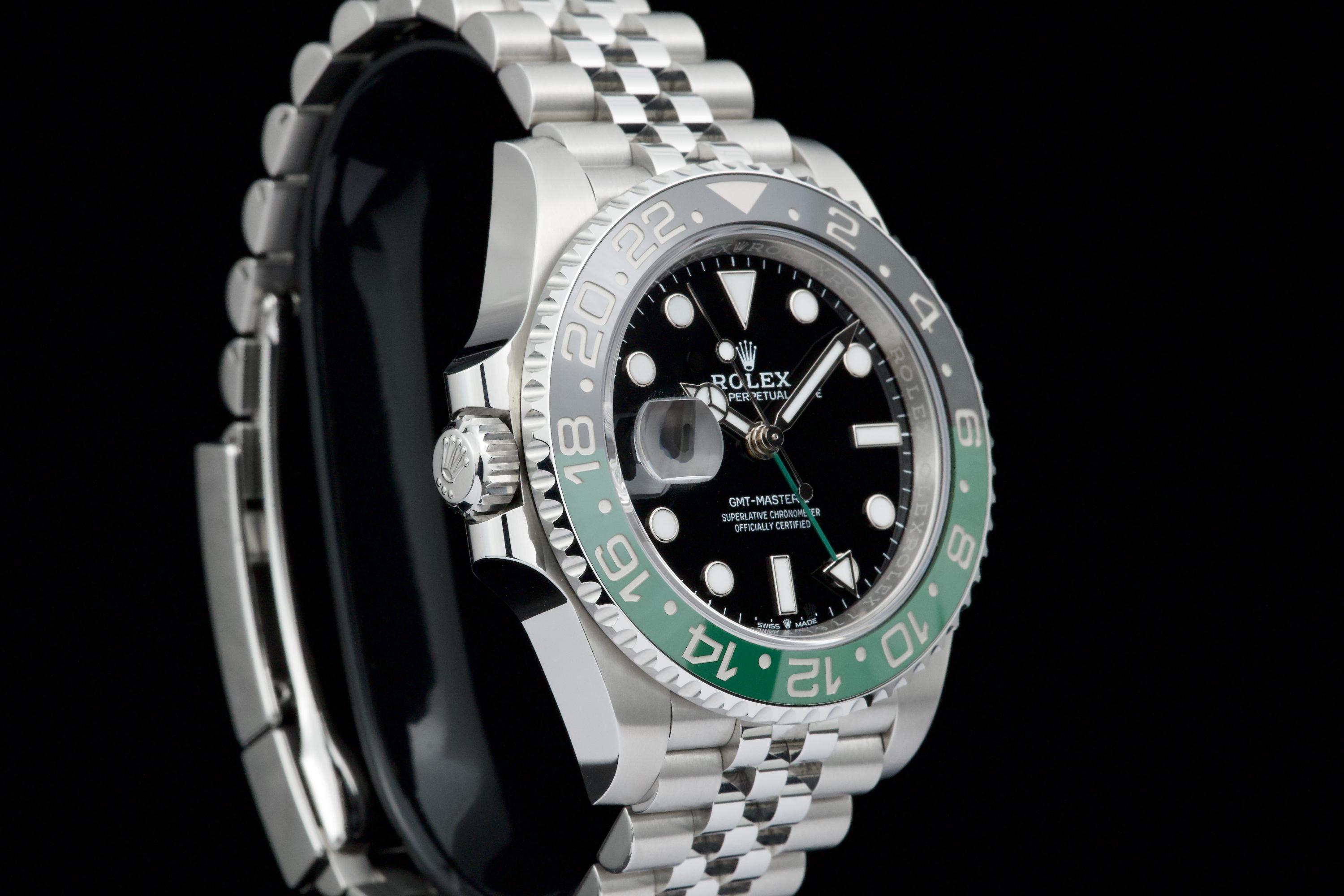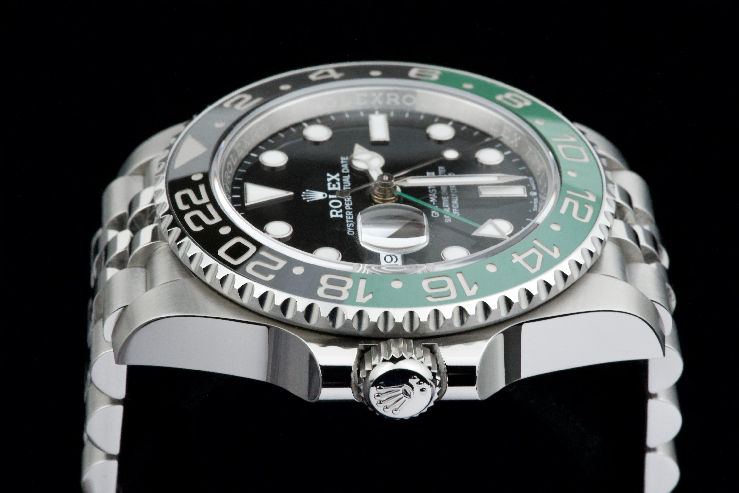 Presented here is a contemporary and highly desirable example of the Rolex GMT-Master II reference 126720VTNR. Instantly recognizable for its distinctive green and black Cerachrom bezel and left-handed crown configuration, this modern GMT-Master II stands among the most distinctive recent additions to the Rolex professional range. This example dates to 2026 and is offered in mint condition, appearing to have been worn only once, with the case and bracelet retaining their crisp, factory-defined lines. The watch is accompanied by its full set, including original box, papers, and accessories. A superb opportunity to acquire an almost unworn example of a highly collectible modern GMT-Master II, combining contemporary design, technical robustness, and strong collector appeal.