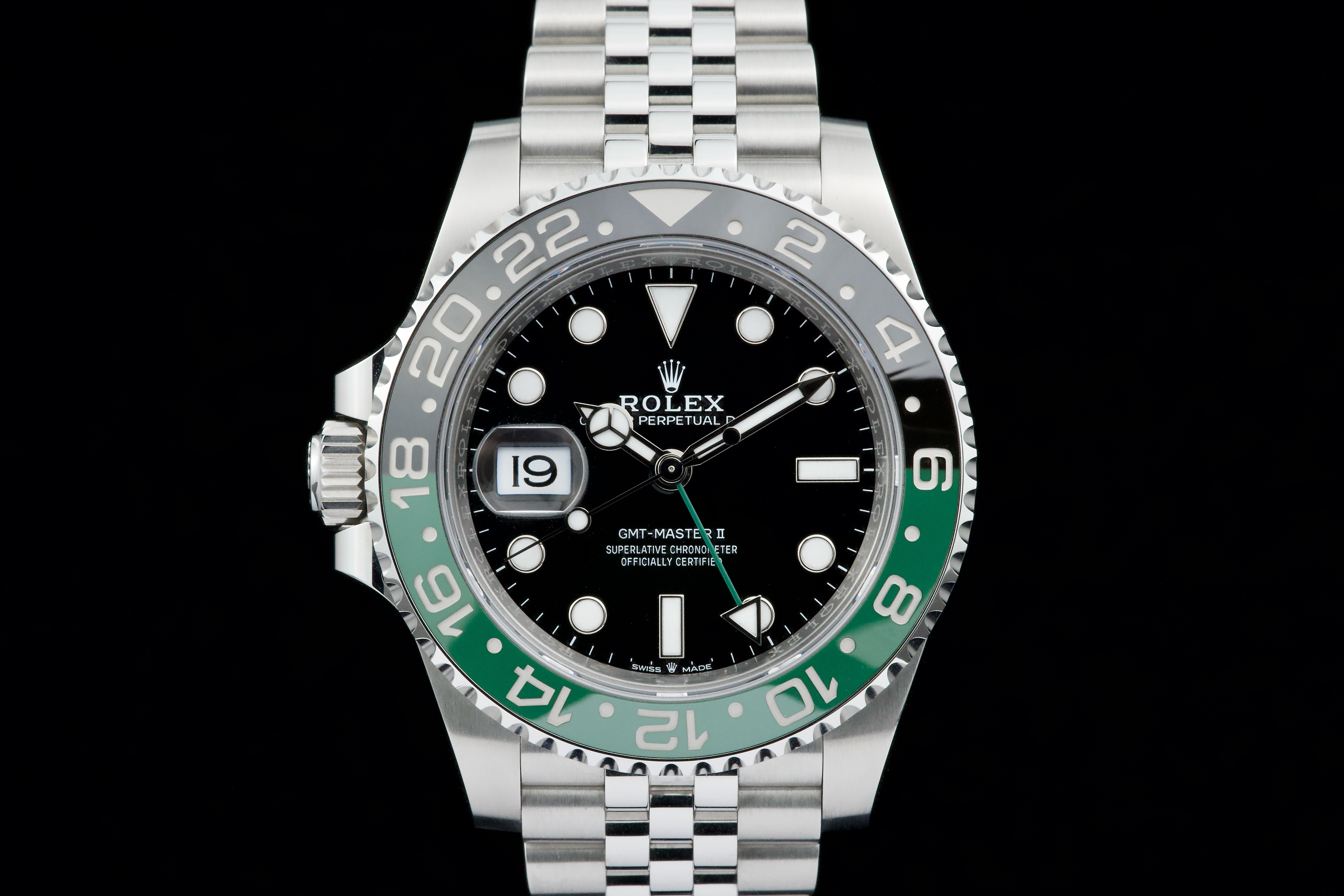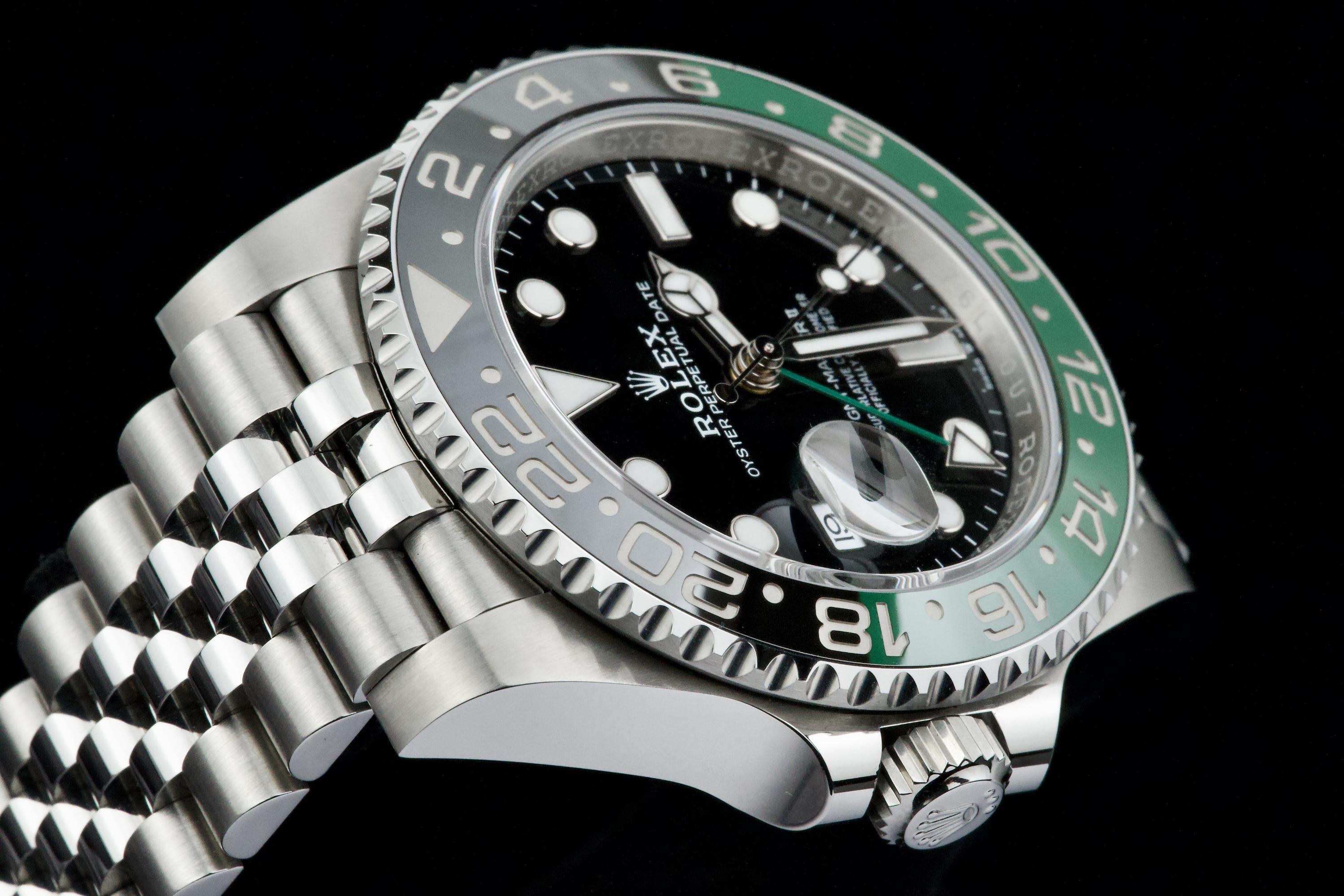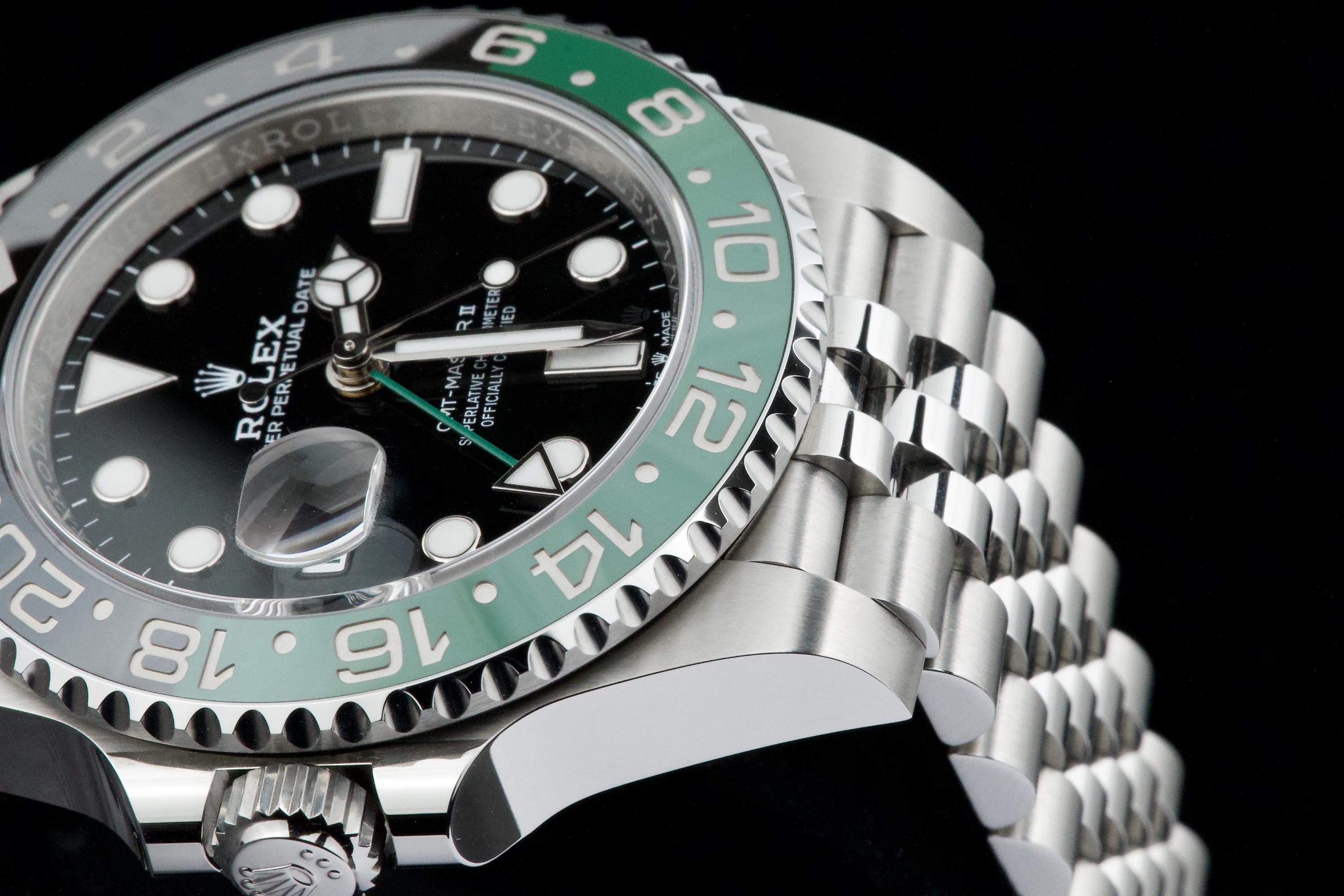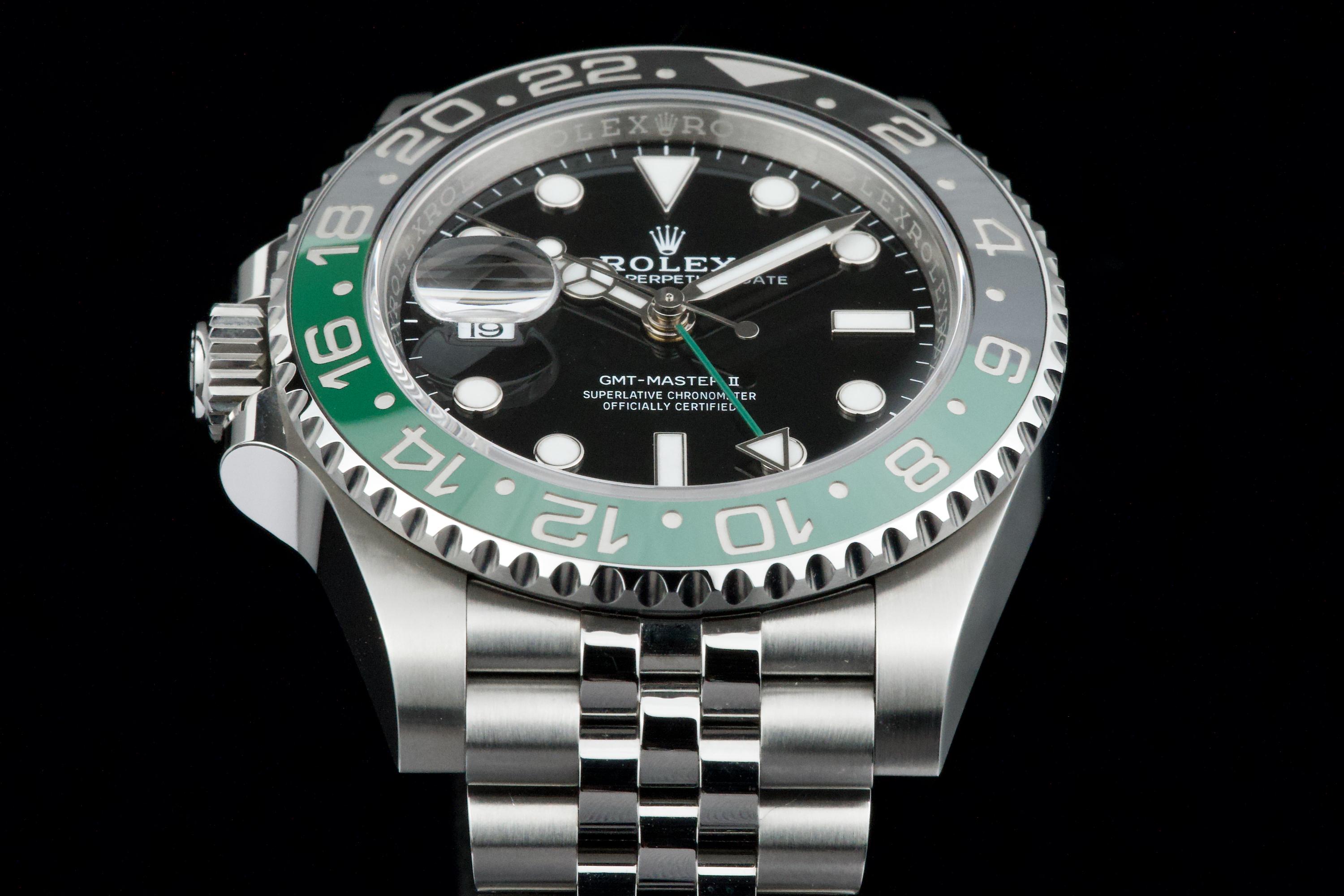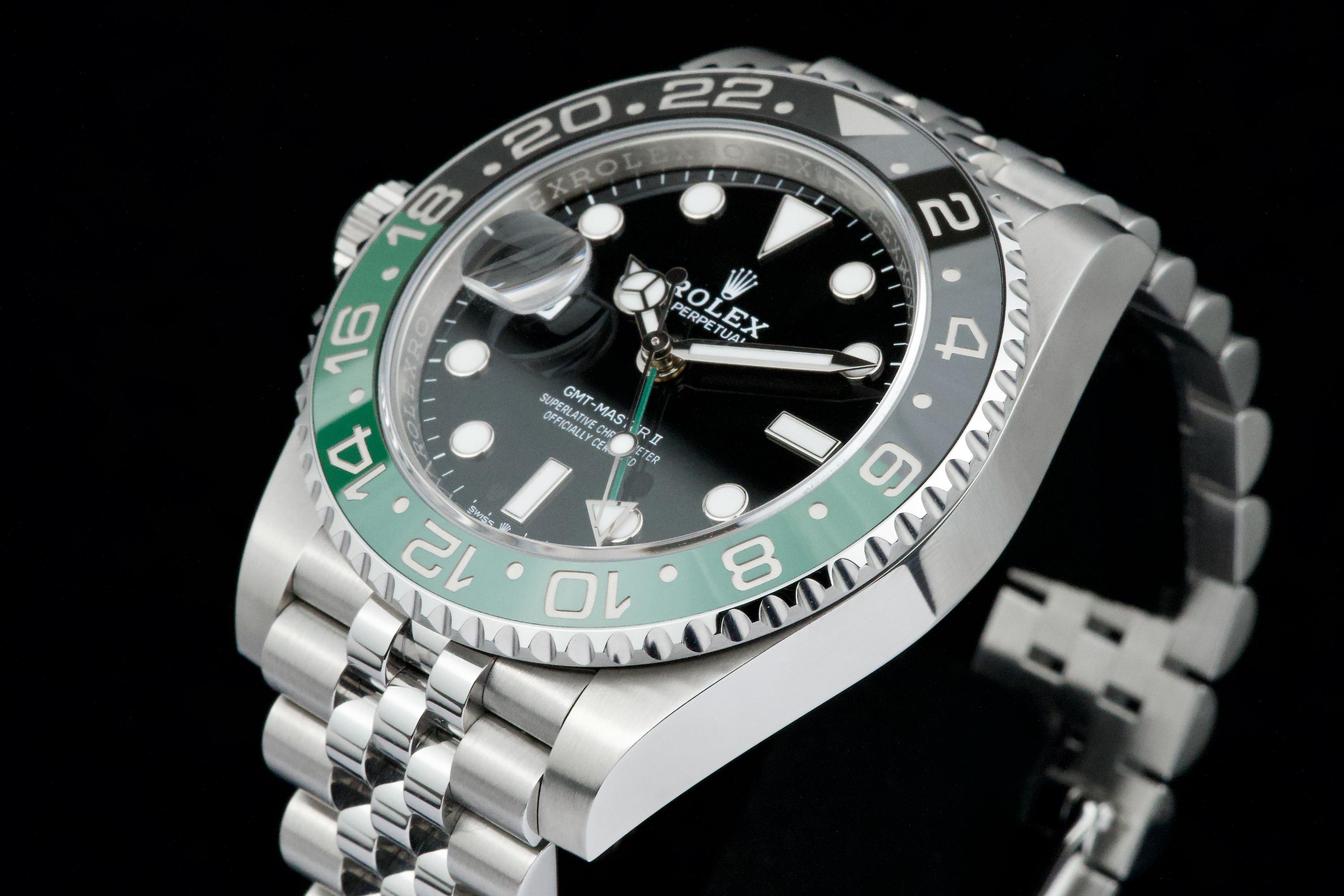 Presented here is a contemporary and highly desirable example of the Rolex GMT-Master II reference 126720VTNR. Instantly recognizable for its distinctive green and black Cerachrom bezel and left-handed crown configuration, this modern GMT-Master II stands among the most distinctive recent additions to the Rolex professional range. This example dates to 2026 and is offered in mint condition, appearing to have been worn only once, with the case and bracelet retaining their crisp, factory-defined lines. The watch is accompanied by its full set, including original box, papers, and accessories. A superb opportunity to acquire an almost unworn example of a highly collectible modern GMT-Master II, combining contemporary design, technical robustness, and strong collector appeal.