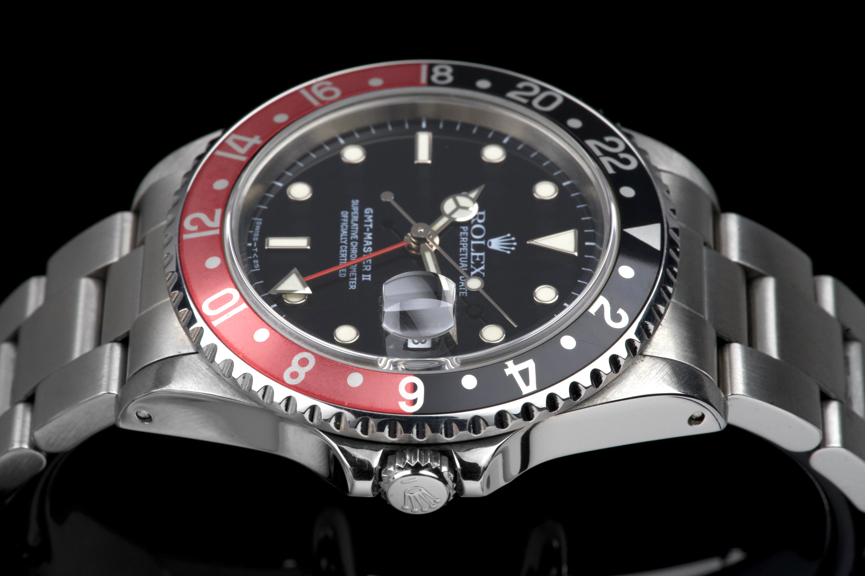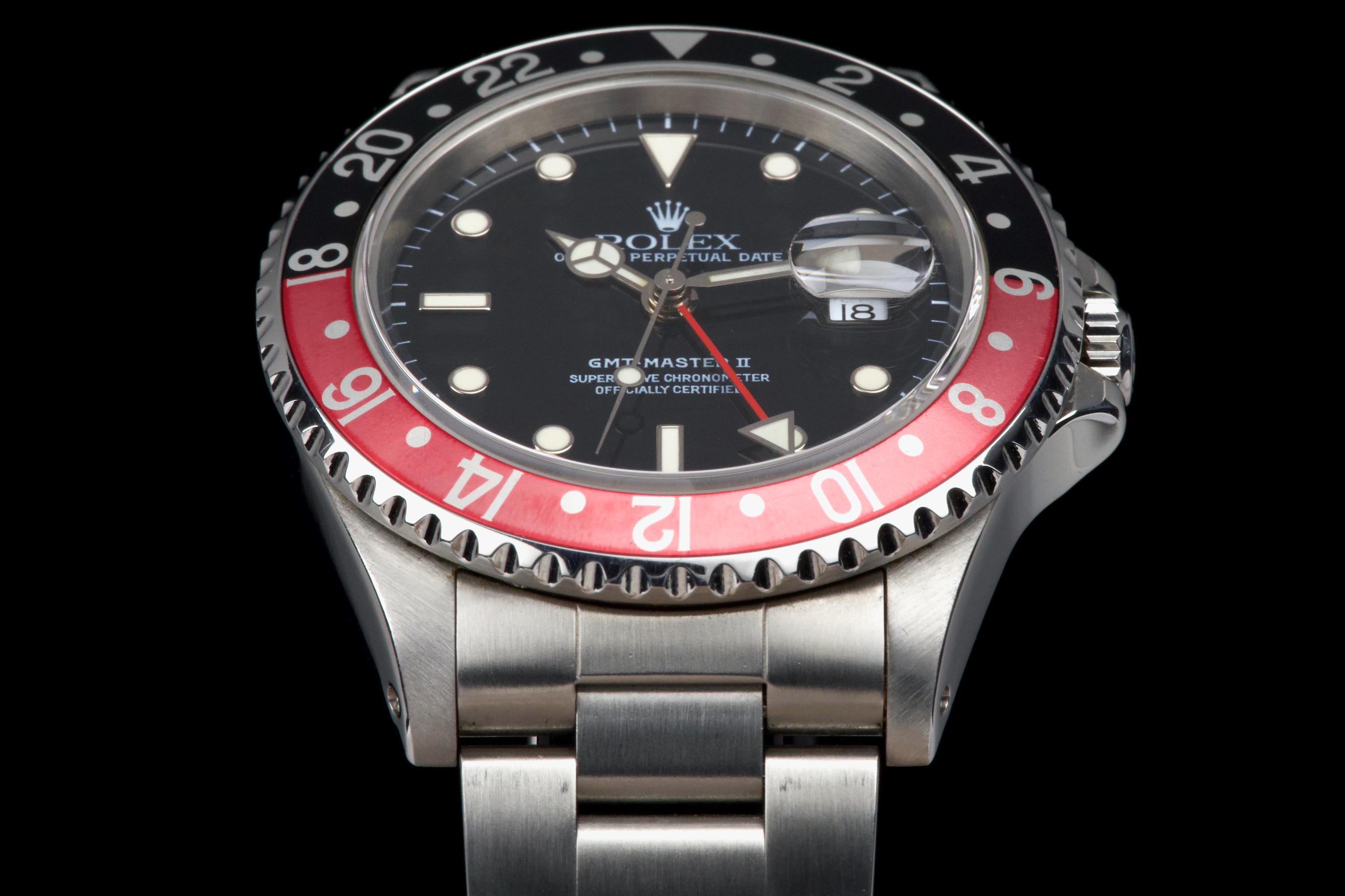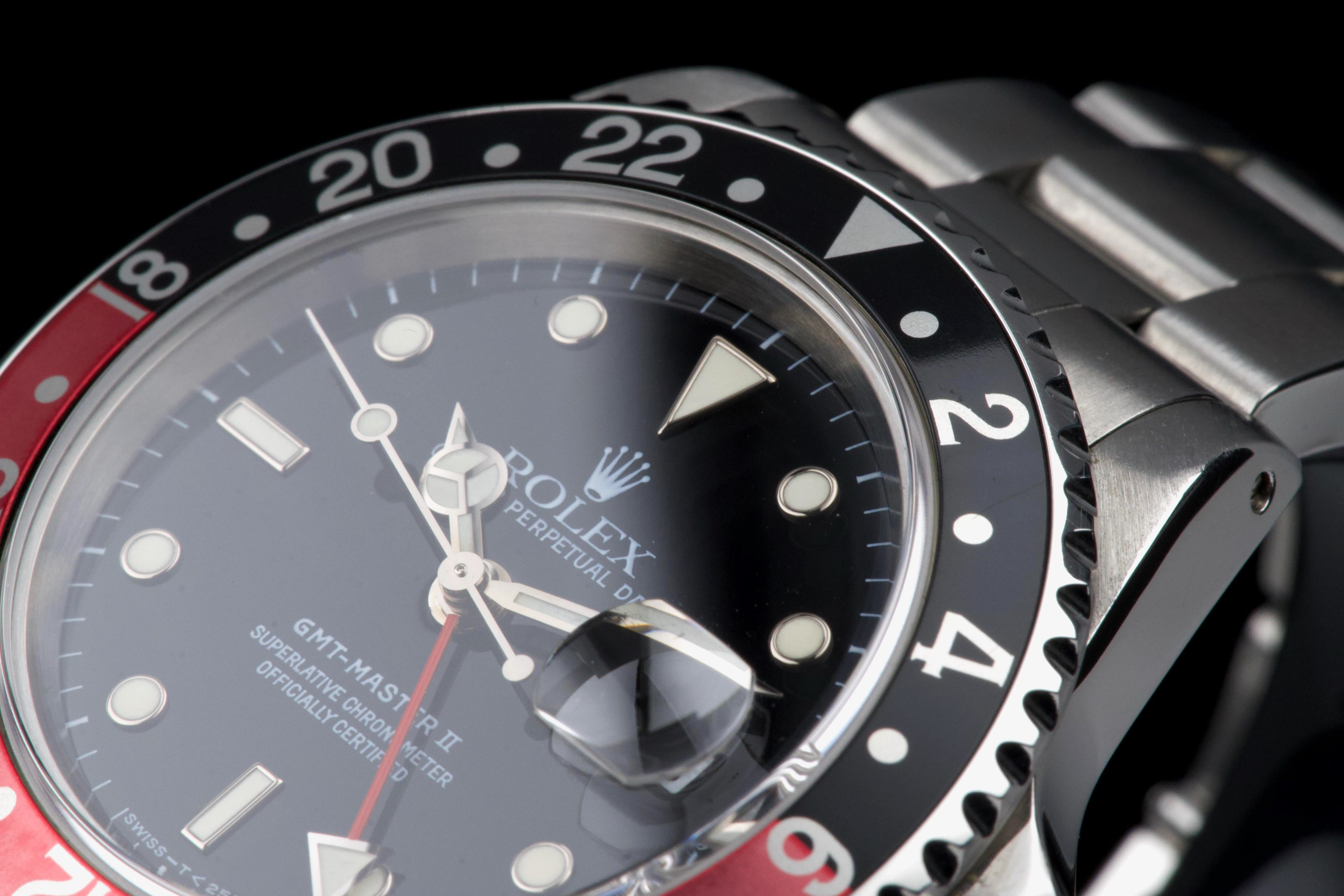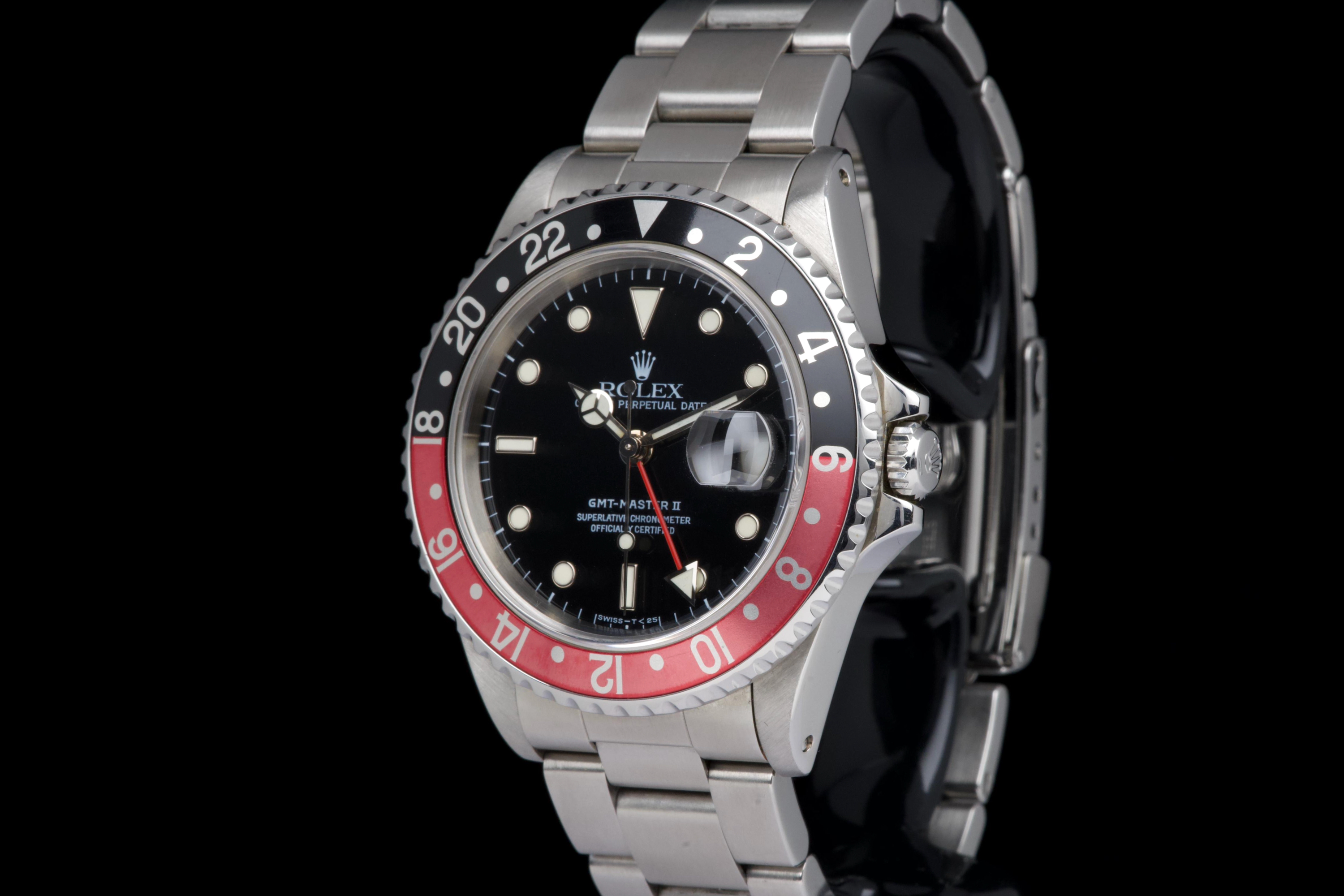 The present Rolex GMT-Master II reference 16710 “Coke,” dating to 1998, is a highly attractive and honest example of one of Rolex’s most versatile and collectible travel watches. Offered with its box and papers as shown (not a full set), this piece represents a classic late-1990s configuration that remains strongly sought after. The stainless-steel case has been polished in the past and shows light wear consistent with careful use, while retaining pleasing proportions and a well-balanced profile. The glossy black tritium dial is preserved in excellent condition, displaying warm, creamy ageing to the luminous hour markers, perfectly matched by the hands, resulting in a harmonious and period-correct appearance. The iconic red-and-black “Coke” bezel insert shows attractive fading to the red portion, which has taken on a darker pink hue—an appealing characteristic appreciated by collectors of vintage and neo-vintage Rolex sports watches. The watch is fitted with the Oyster bracelet reference 78790 with 501B endlinks, showing only very light stretch from use. The clasp bears the code “U8.” Mechanically, the watch is running perfectly at the time of cataloguing. While no service history accompanies the watch, it is sold with a one-year Ponti warranty for peace of mind. Delivered with the set shown in the photographs, this GMT-Master II 16710 Coke offers an excellent opportunity to acquire a well-preserved, attractively aged example of a modern Rolex classic, combining strong aesthetics, proven reliability, and everyday wearability.