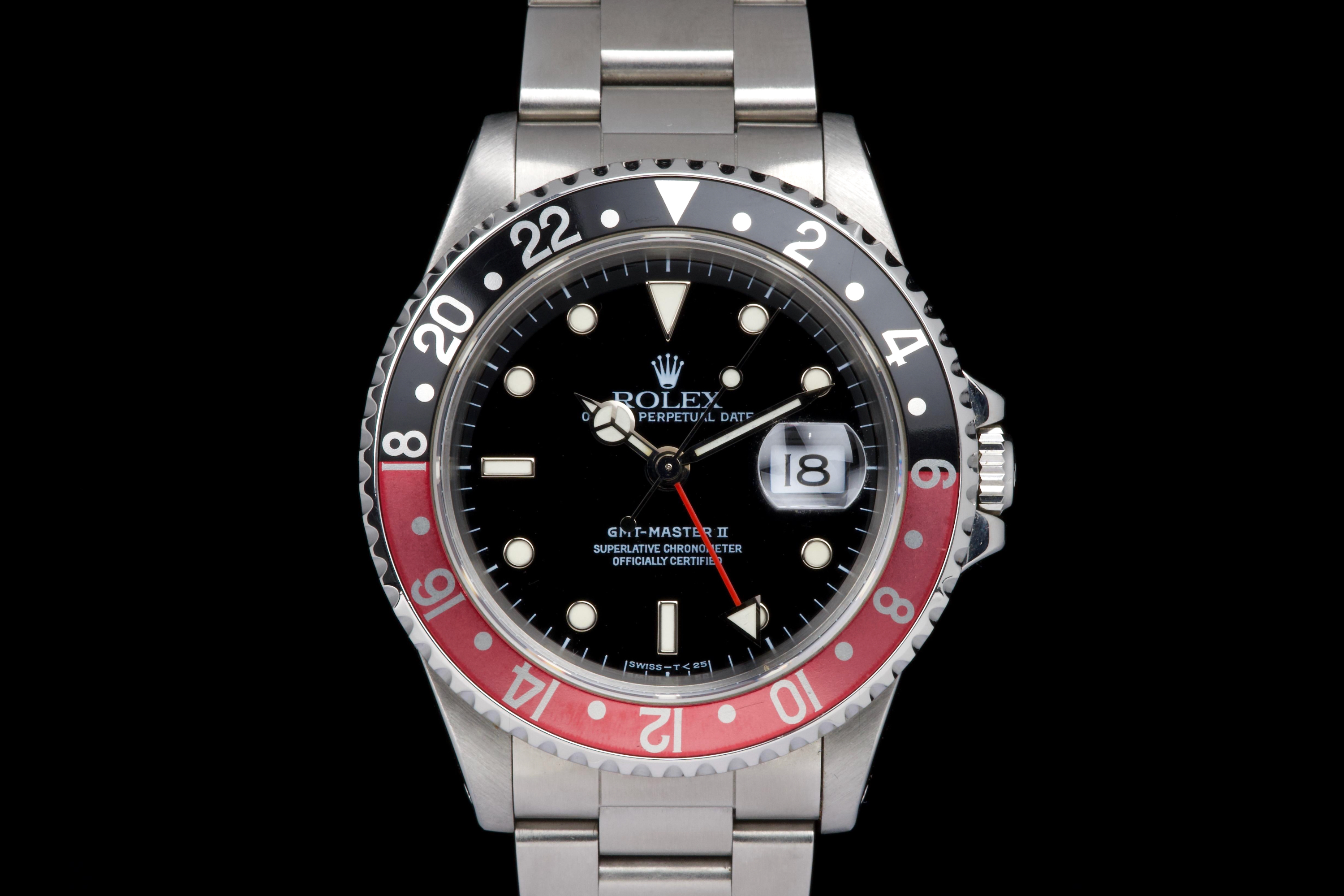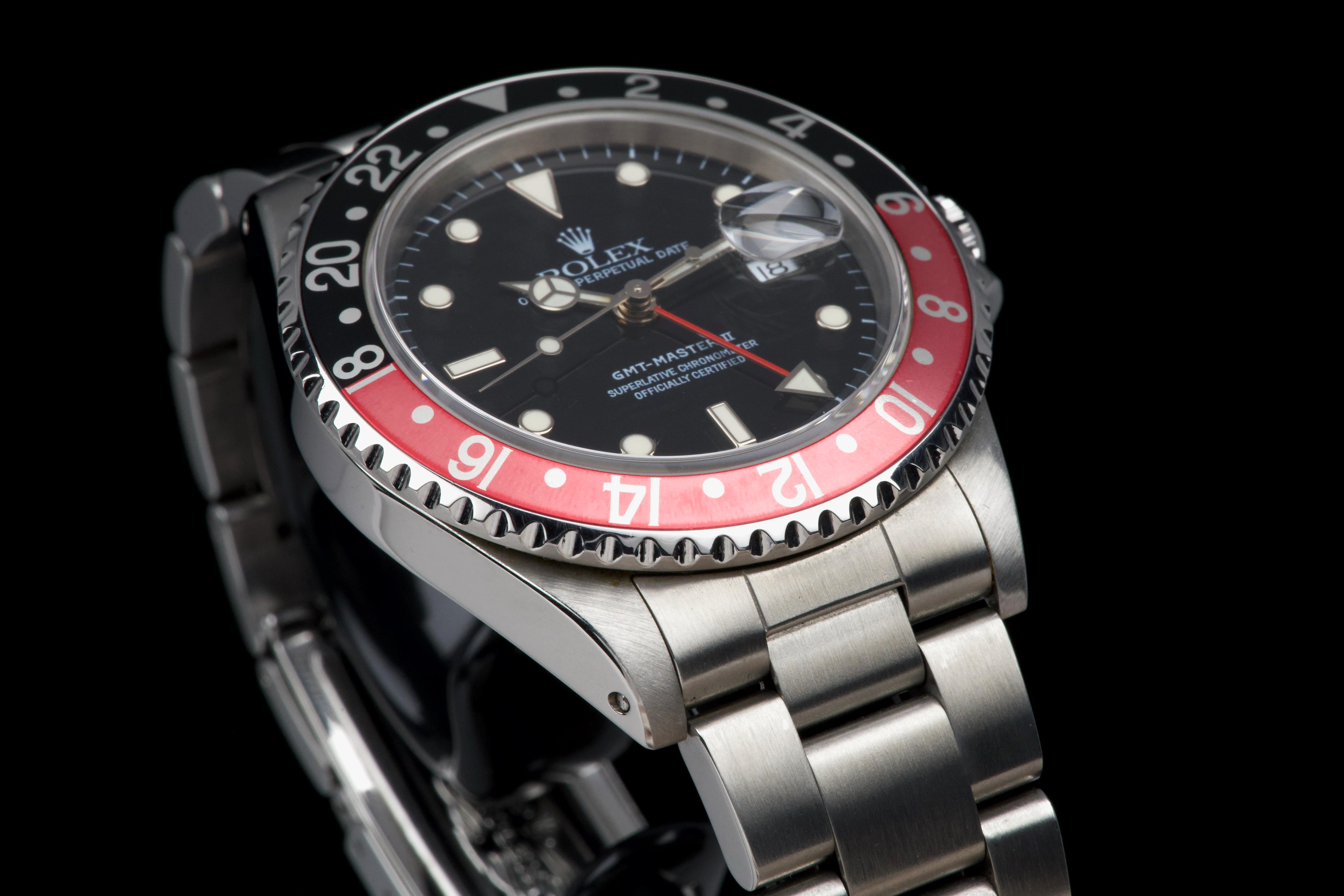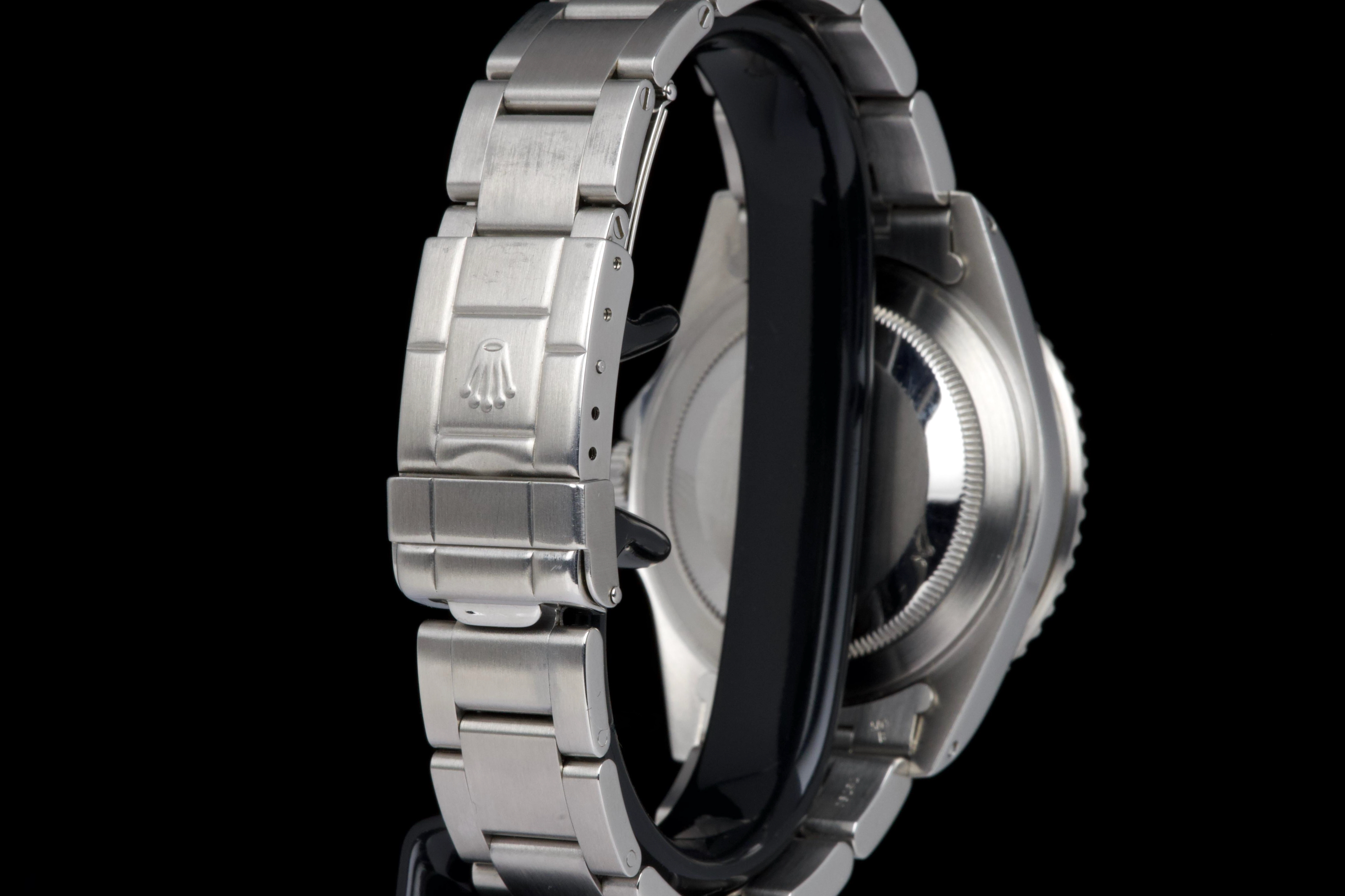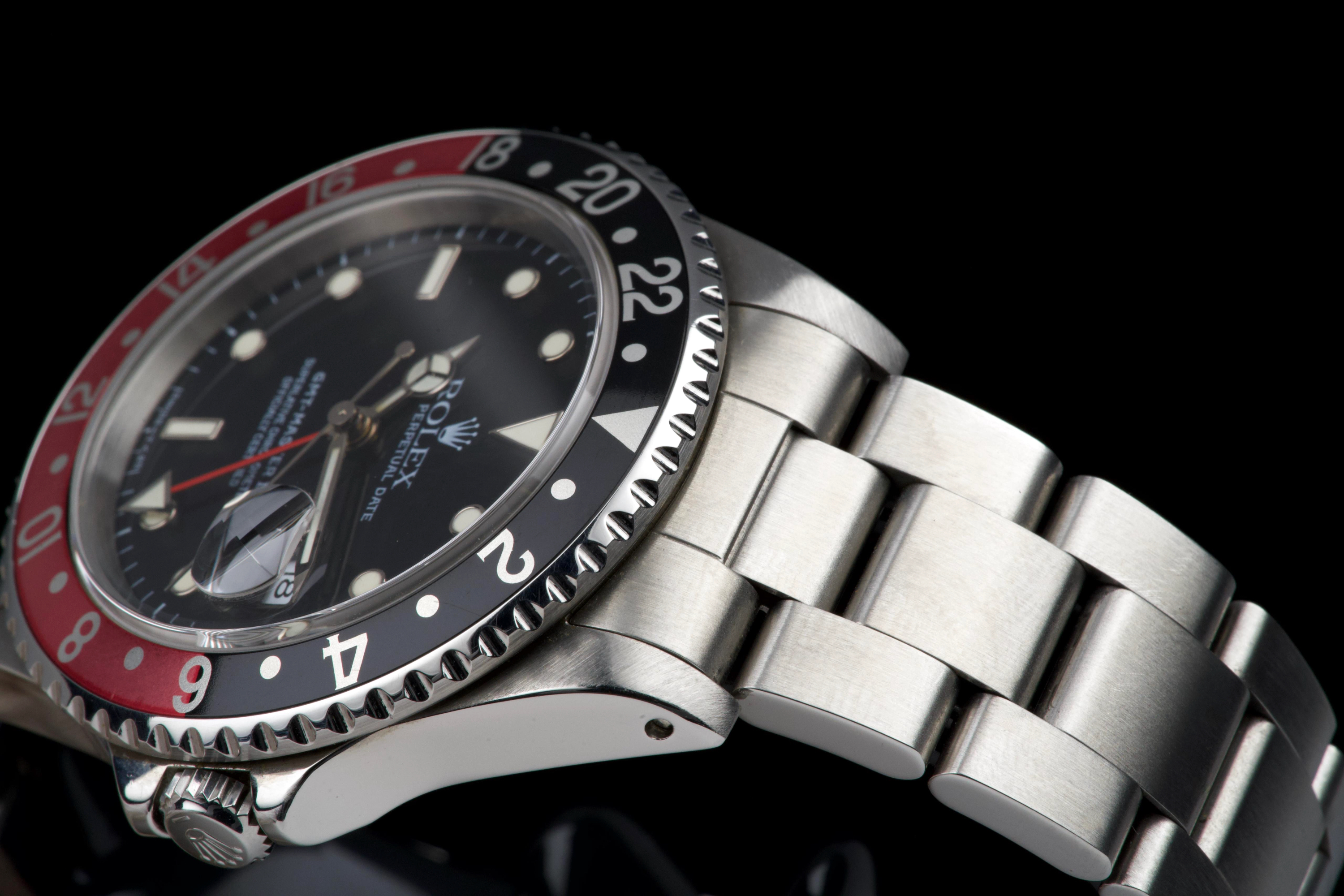 The present Rolex GMT-Master II reference 16710 “Coke,” dating to 1998, is a highly attractive and honest example of one of Rolex’s most versatile and collectible travel watches. Offered with its box and papers as shown (not a full set), this piece represents a classic late-1990s configuration that remains strongly sought after. The stainless-steel case has been polished in the past and shows light wear consistent with careful use, while retaining pleasing proportions and a well-balanced profile. The glossy black tritium dial is preserved in excellent condition, displaying warm, creamy ageing to the luminous hour markers, perfectly matched by the hands, resulting in a harmonious and period-correct appearance. The iconic red-and-black “Coke” bezel insert shows attractive fading to the red portion, which has taken on a darker pink hue—an appealing characteristic appreciated by collectors of vintage and neo-vintage Rolex sports watches. The watch is fitted with the Oyster bracelet reference 78790 with 501B endlinks, showing only very light stretch from use. The clasp bears the code “U8.” Mechanically, the watch is running perfectly at the time of cataloguing. While no service history accompanies the watch, it is sold with a one-year Ponti warranty for peace of mind. Delivered with the set shown in the photographs, this GMT-Master II 16710 Coke offers an excellent opportunity to acquire a well-preserved, attractively aged example of a modern Rolex classic, combining strong aesthetics, proven reliability, and everyday wearability.