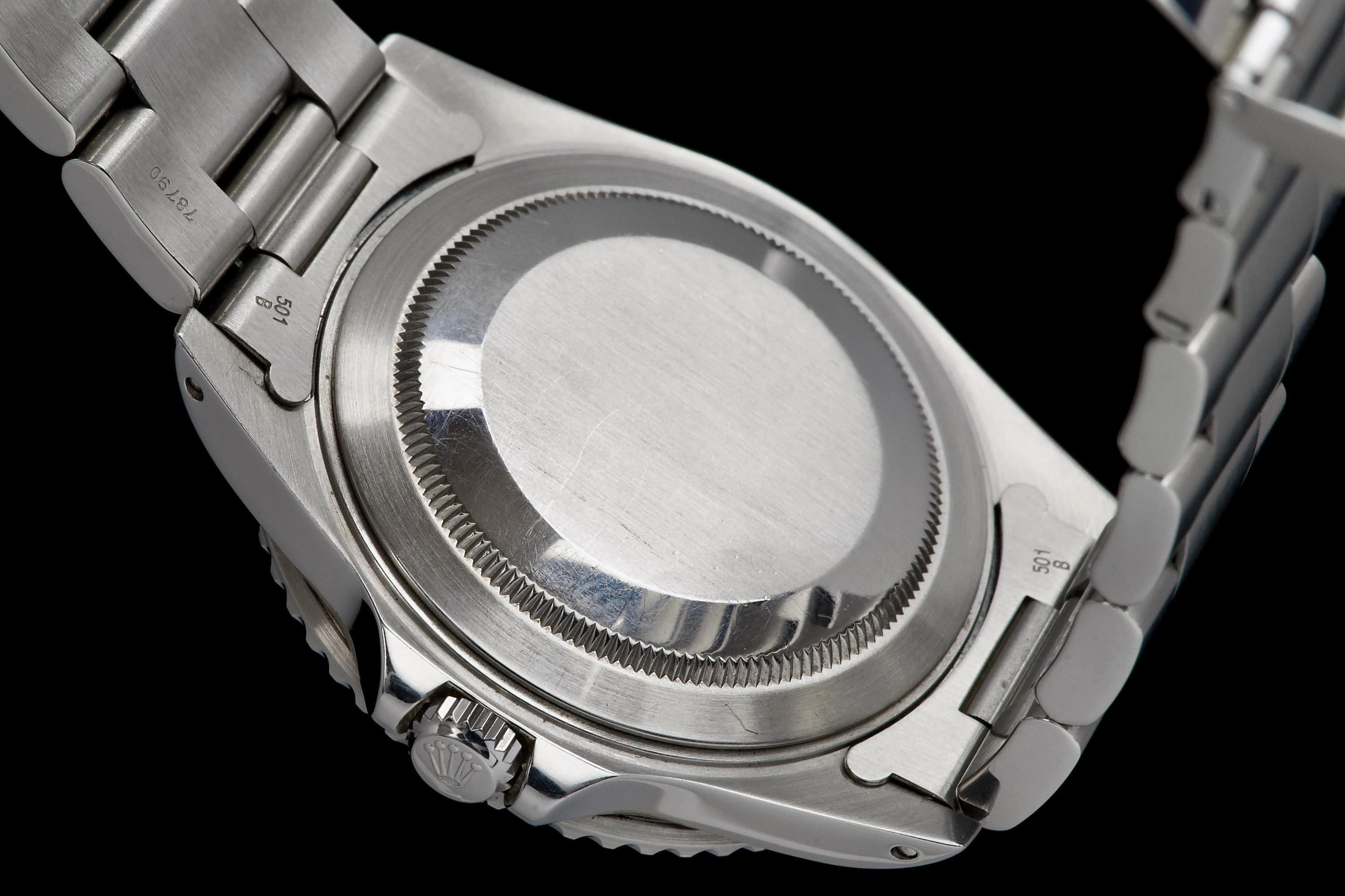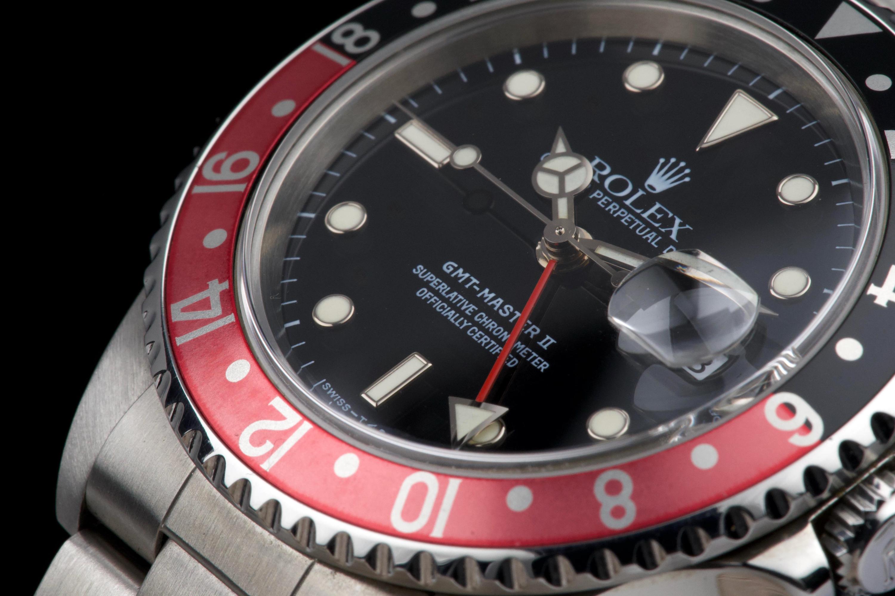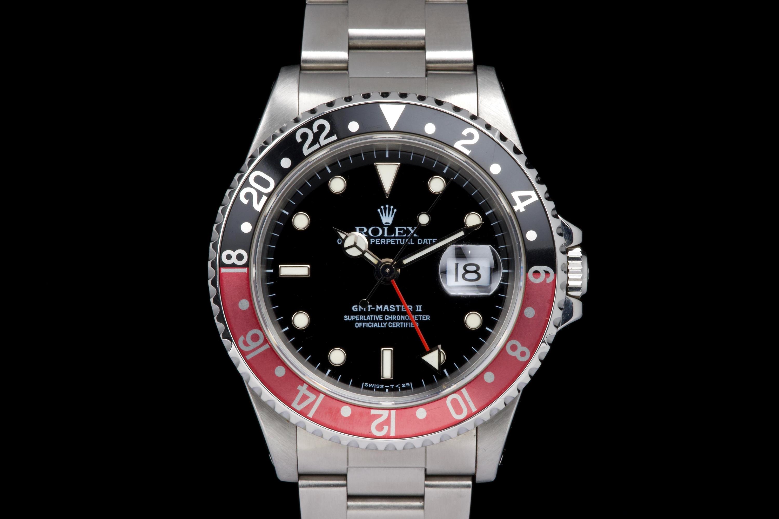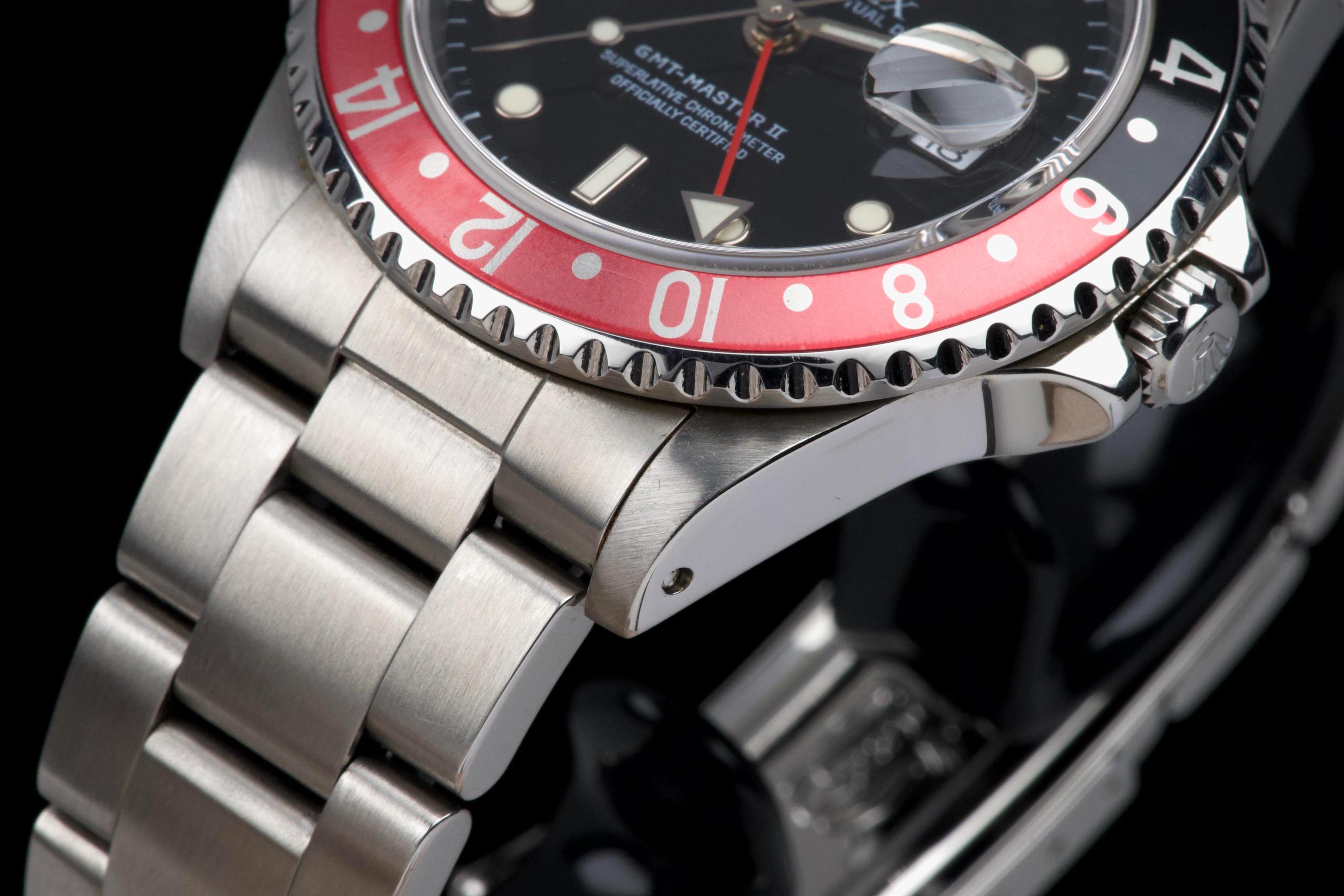 The present Rolex GMT-Master II reference 16710 “Coke,” dating to 1998, is a highly attractive and honest example of one of Rolex’s most versatile and collectible travel watches. Offered with its box and papers as shown (not a full set), this piece represents a classic late-1990s configuration that remains strongly sought after. The stainless-steel case has been polished in the past and shows light wear consistent with careful use, while retaining pleasing proportions and a well-balanced profile. The glossy black tritium dial is preserved in excellent condition, displaying warm, creamy ageing to the luminous hour markers, perfectly matched by the hands, resulting in a harmonious and period-correct appearance. The iconic red-and-black “Coke” bezel insert shows attractive fading to the red portion, which has taken on a darker pink hue—an appealing characteristic appreciated by collectors of vintage and neo-vintage Rolex sports watches. The watch is fitted with the Oyster bracelet reference 78790 with 501B endlinks, showing only very light stretch from use. The clasp bears the code “U8.” Mechanically, the watch is running perfectly at the time of cataloguing. While no service history accompanies the watch, it is sold with a one-year Ponti warranty for peace of mind. Delivered with the set shown in the photographs, this GMT-Master II 16710 Coke offers an excellent opportunity to acquire a well-preserved, attractively aged example of a modern Rolex classic, combining strong aesthetics, proven reliability, and everyday wearability.