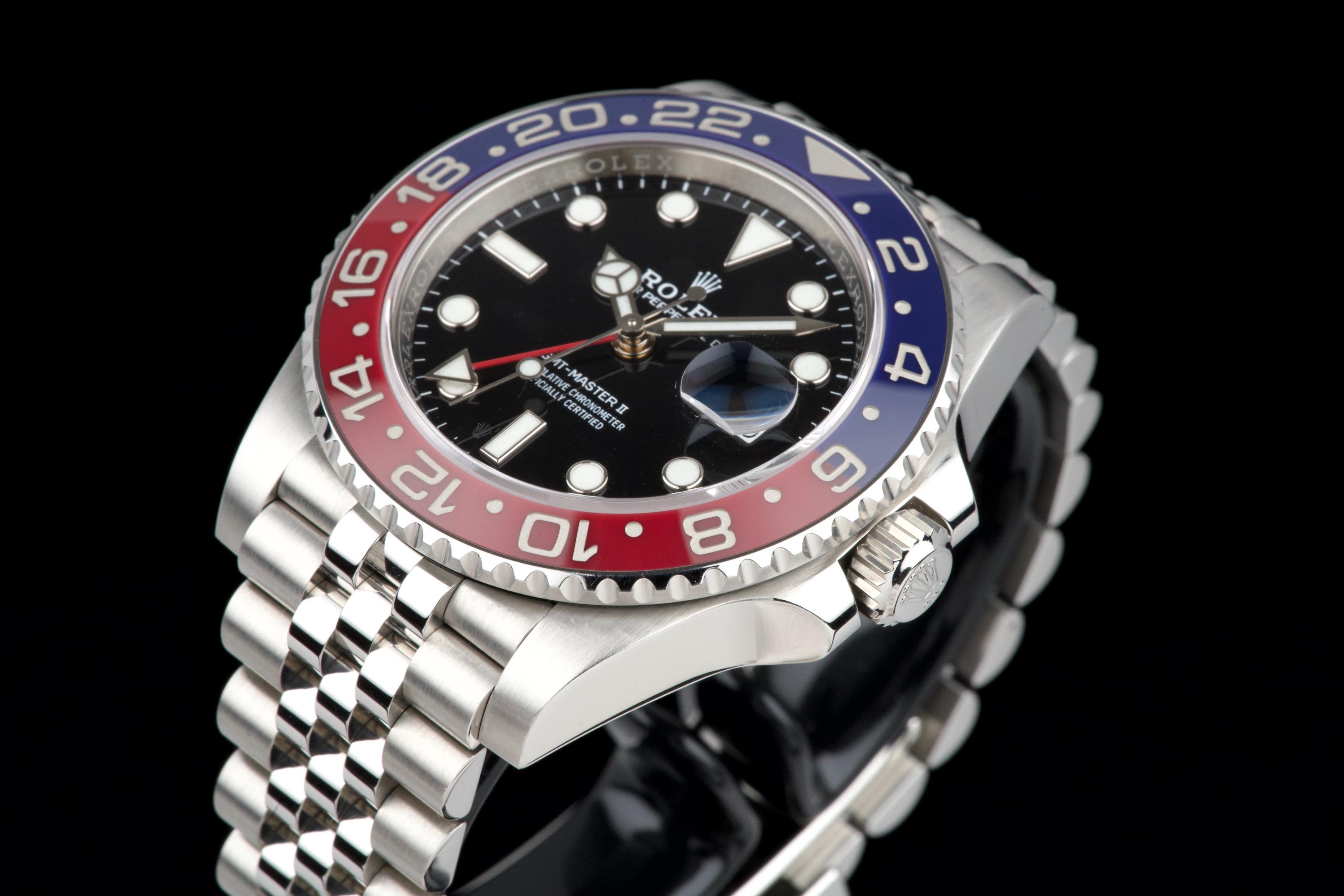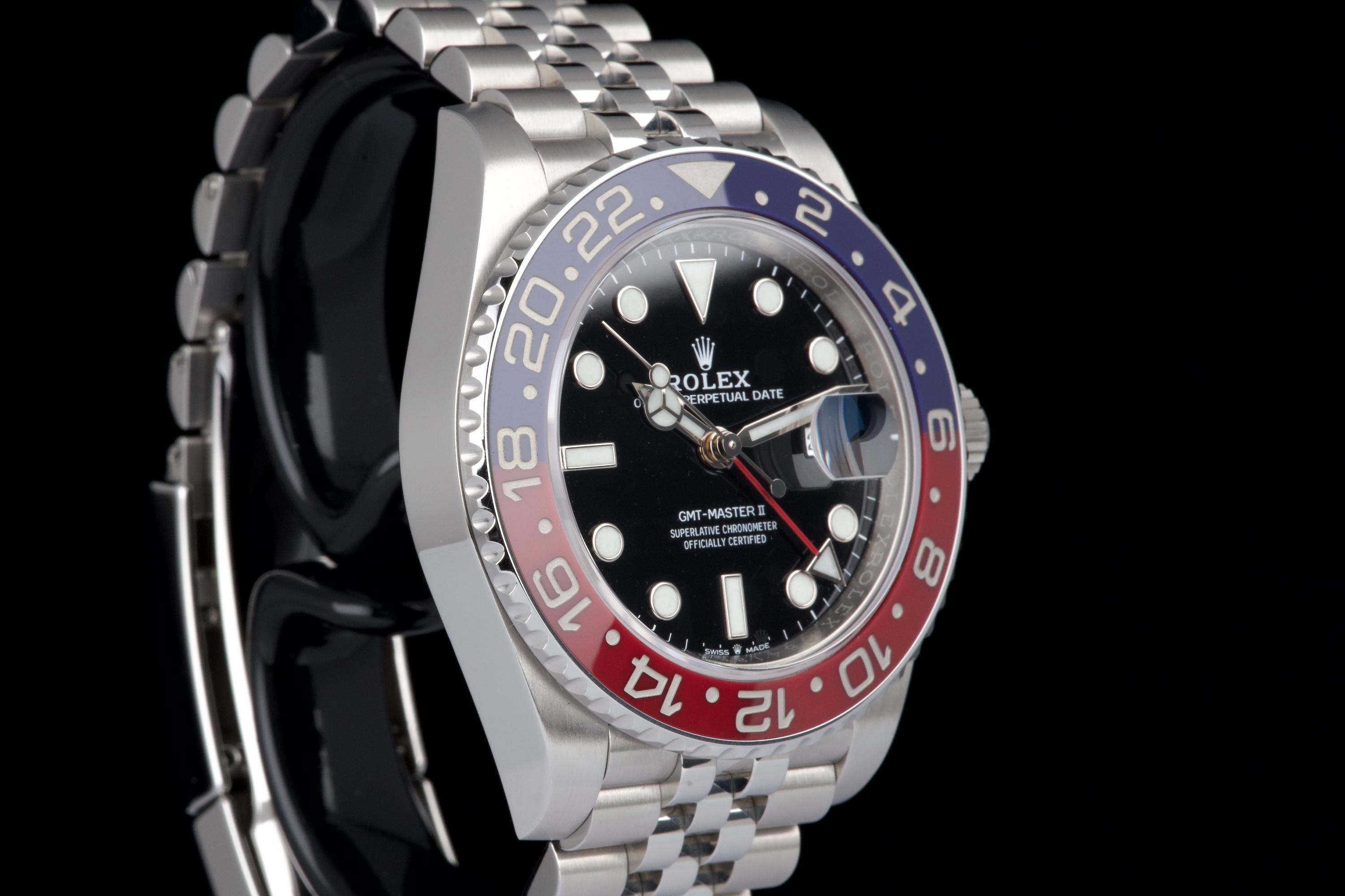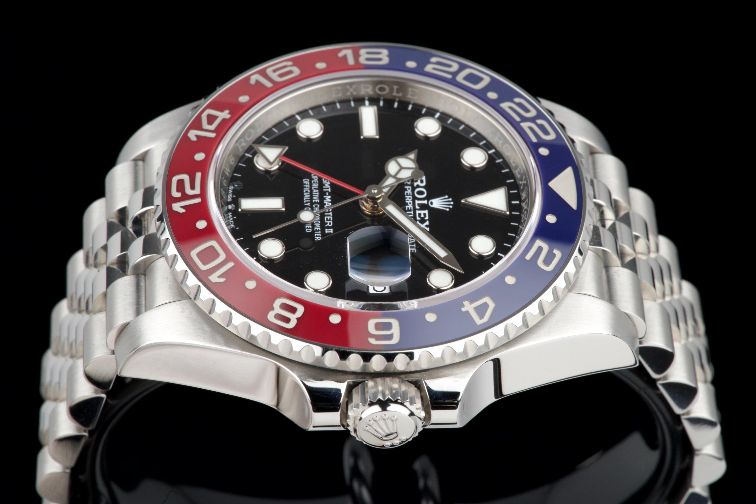 The present Rolex GMT-Master II “Pepsi” reference 126710BLRO, dating to 2018, is offered here as a complete full set from its original owner, with Swiss papers, and belongs to the desirable Mk1 configuration of the reference. The watch has just been fully serviced and professionally polished by Rolex, and is presented in perfect overall condition, with a crisp case, clean bracelet, and flawless appearance throughout. As an early Mk1 example, it features the first execution of the modern blue and red Cerachrom “Pepsi” bezel, a detail particularly appreciated by collectors. The watch is fitted with the elegant and comfortable Jubilee bracelet, enhancing both wearability and its classic aesthetic. Powered by Rolex’s in-house calibre 3285, the watch offers dual time-zone functionality, excellent precision, and a 70-hour power reserve. Delivered as a full set from 2018 and freshly serviced by the manufacture, this GMT-Master II “Pepsi” Mk1 represents an outstanding opportunity to acquire an early and highly collectible example of one of Rolex’s most iconic contemporary models.
