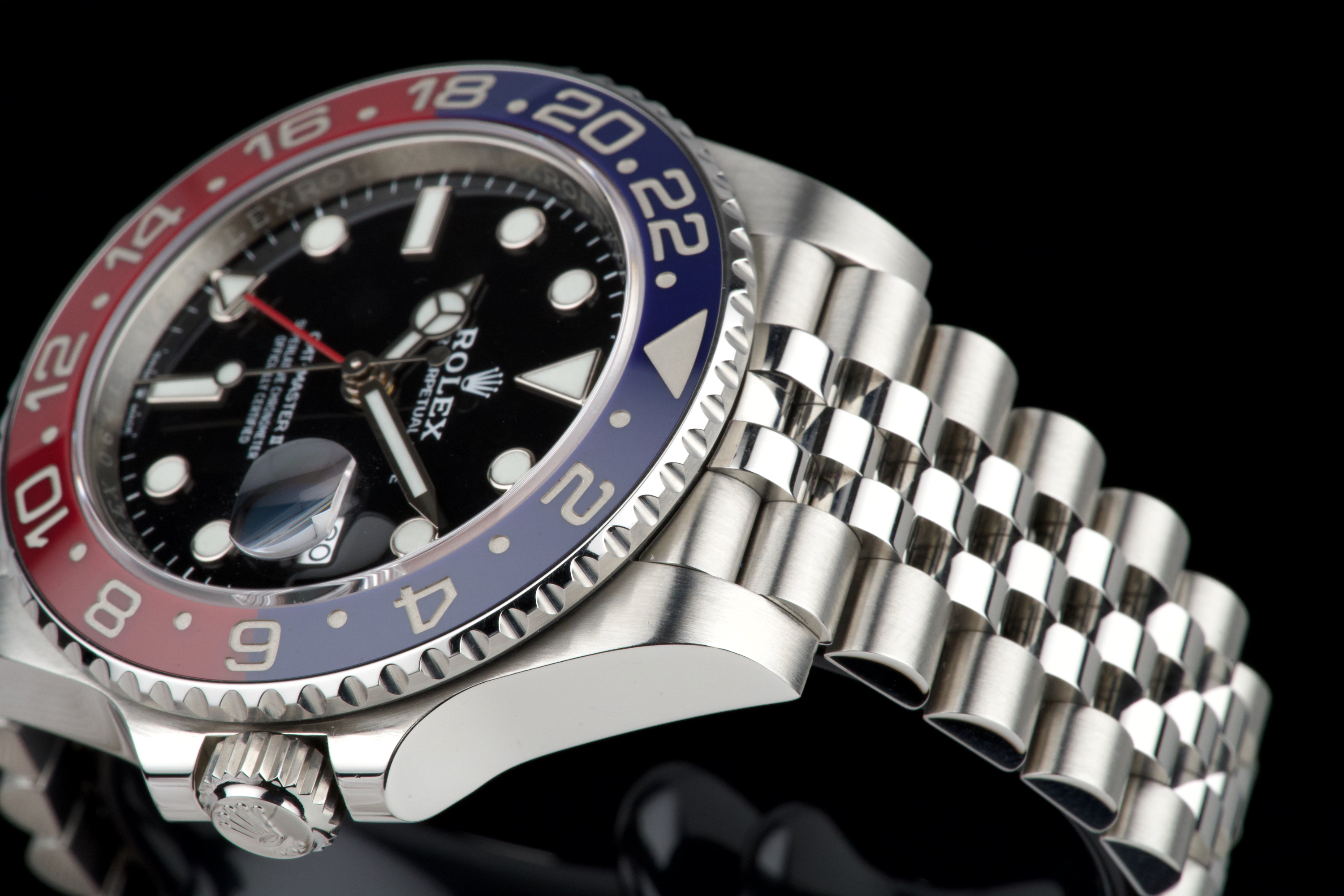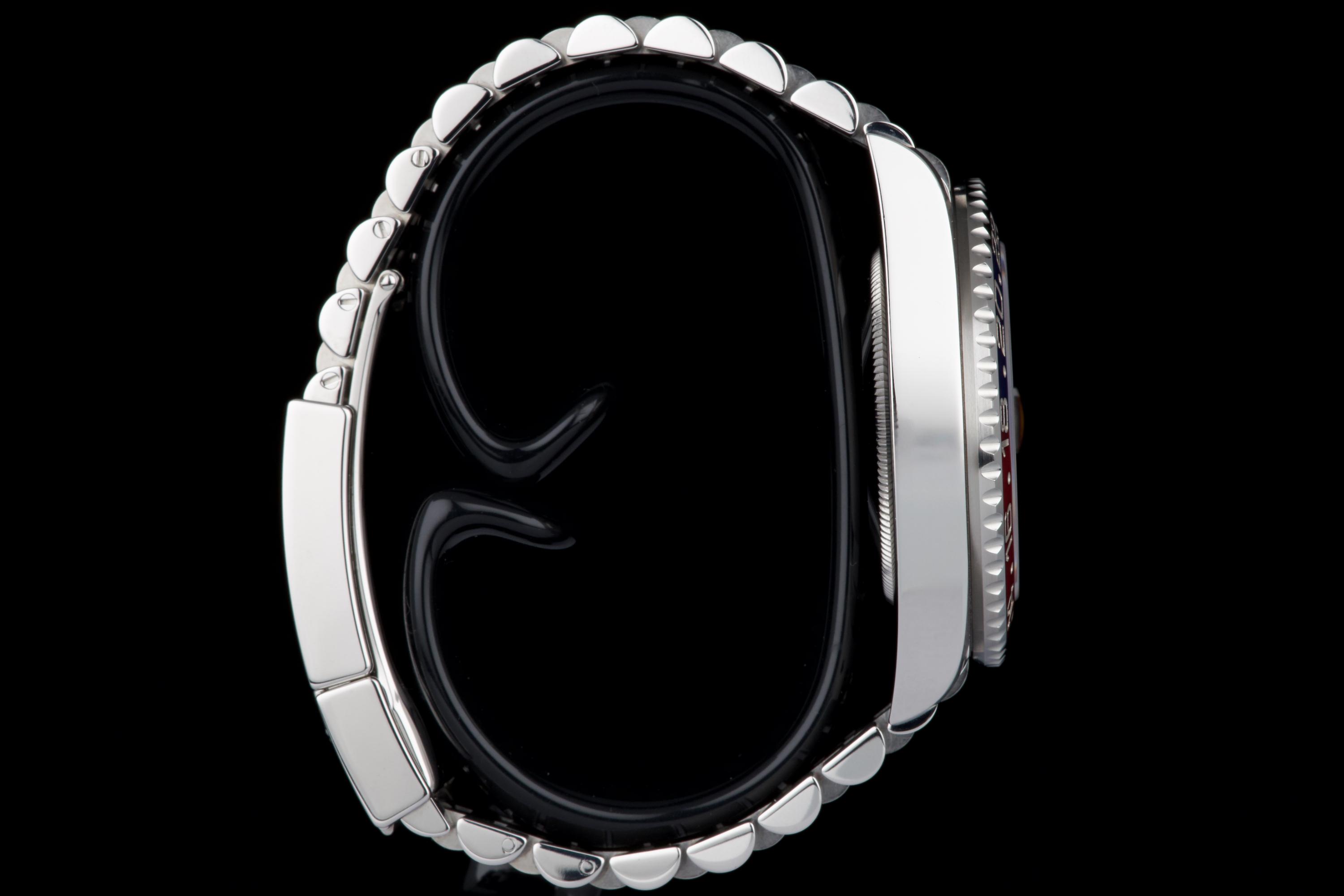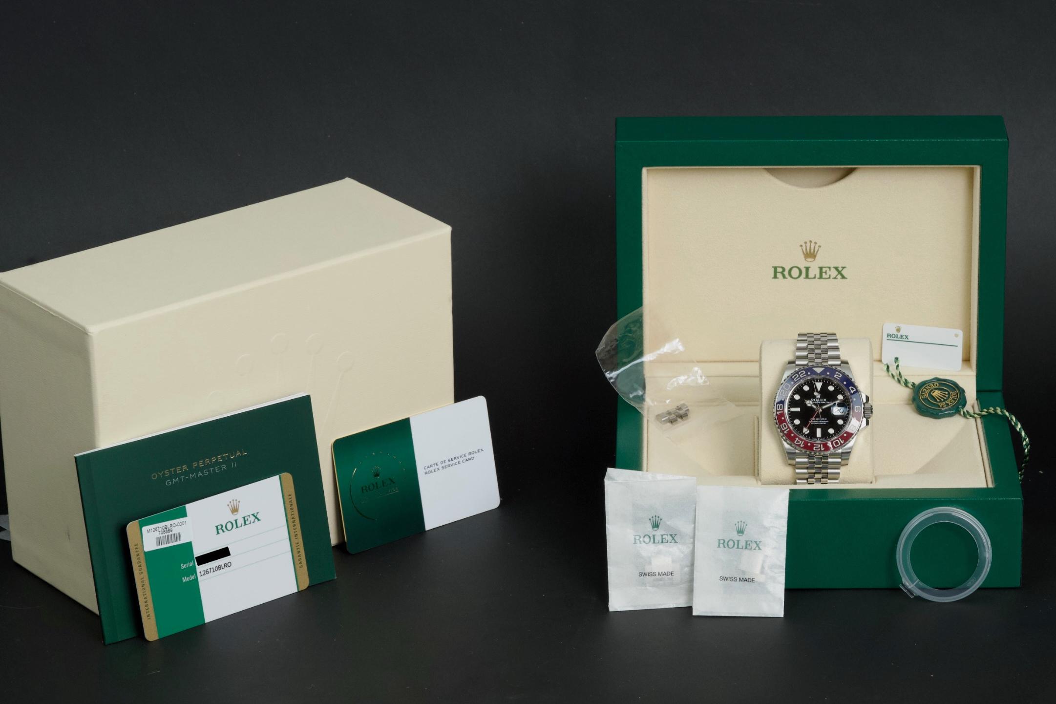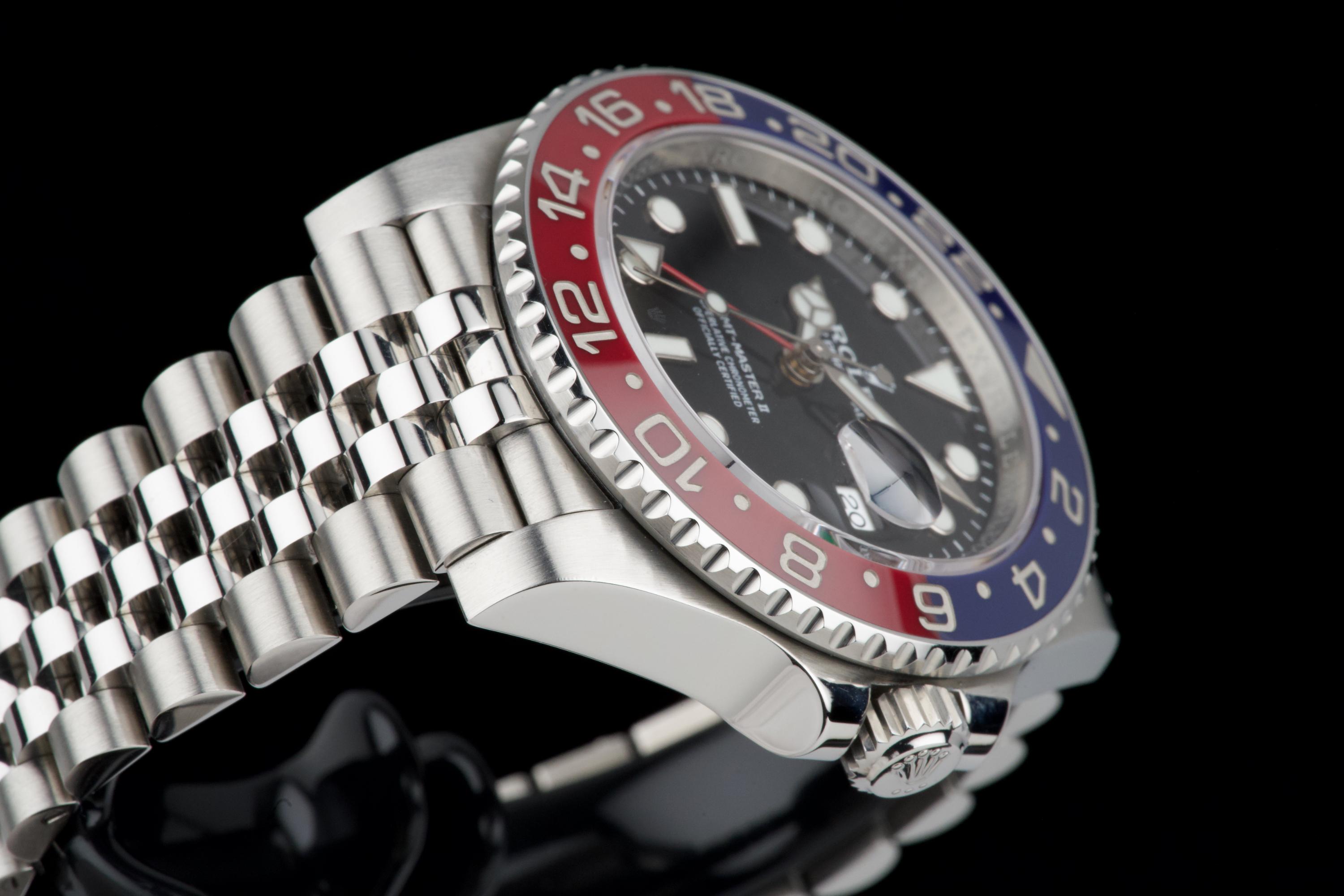 The present Rolex GMT-Master II “Pepsi” reference 126710BLRO, dating to 2018, is offered here as a complete full set from its original owner, with Swiss papers, and belongs to the desirable Mk1 configuration of the reference. The watch has just been fully serviced and professionally polished by Rolex, and is presented in perfect overall condition, with a crisp case, clean bracelet, and flawless appearance throughout. As an early Mk1 example, it features the first execution of the modern blue and red Cerachrom “Pepsi” bezel, a detail particularly appreciated by collectors. The watch is fitted with the elegant and comfortable Jubilee bracelet, enhancing both wearability and its classic aesthetic. Powered by Rolex’s in-house calibre 3285, the watch offers dual time-zone functionality, excellent precision, and a 70-hour power reserve. Delivered as a full set from 2018 and freshly serviced by the manufacture, this GMT-Master II “Pepsi” Mk1 represents an outstanding opportunity to acquire an early and highly collectible example of one of Rolex’s most iconic contemporary models.