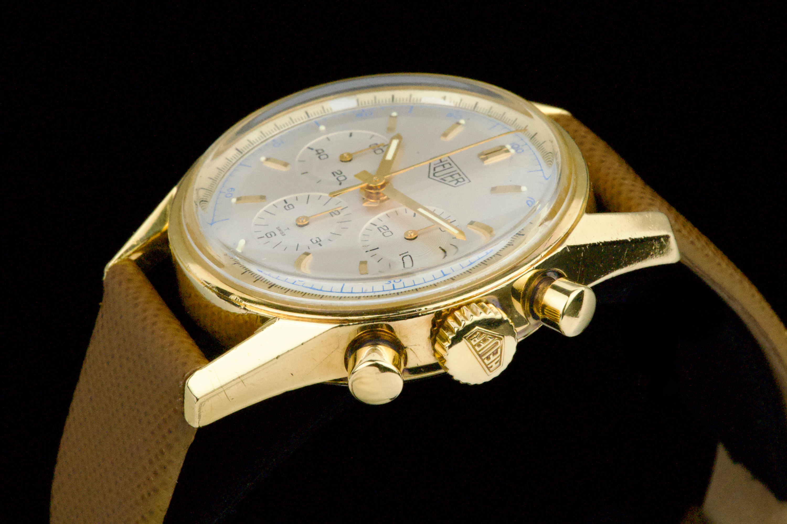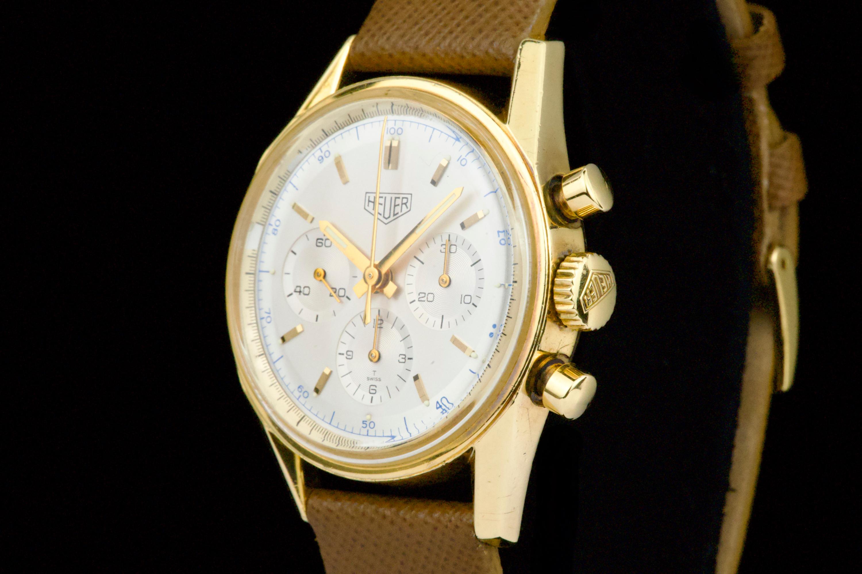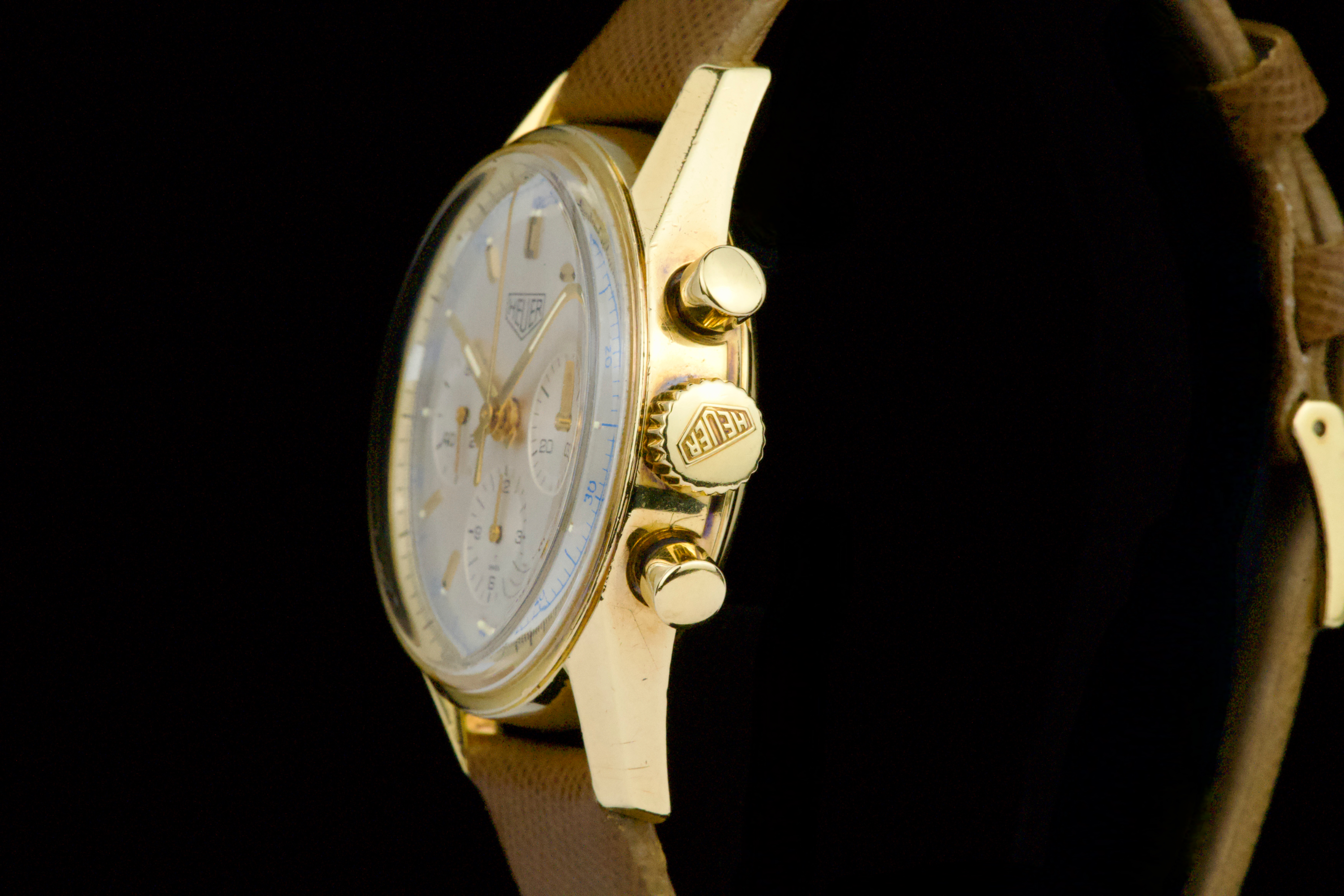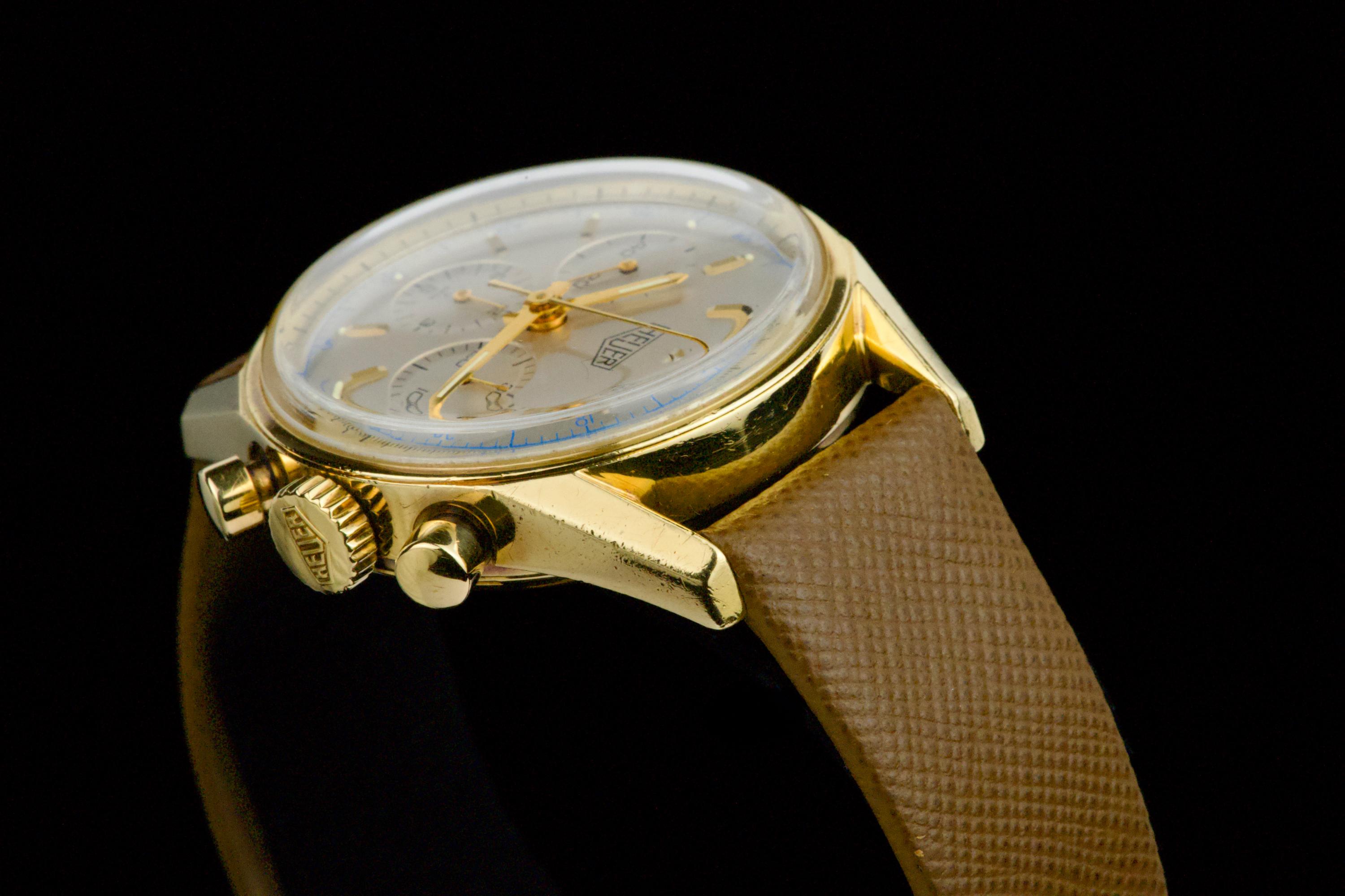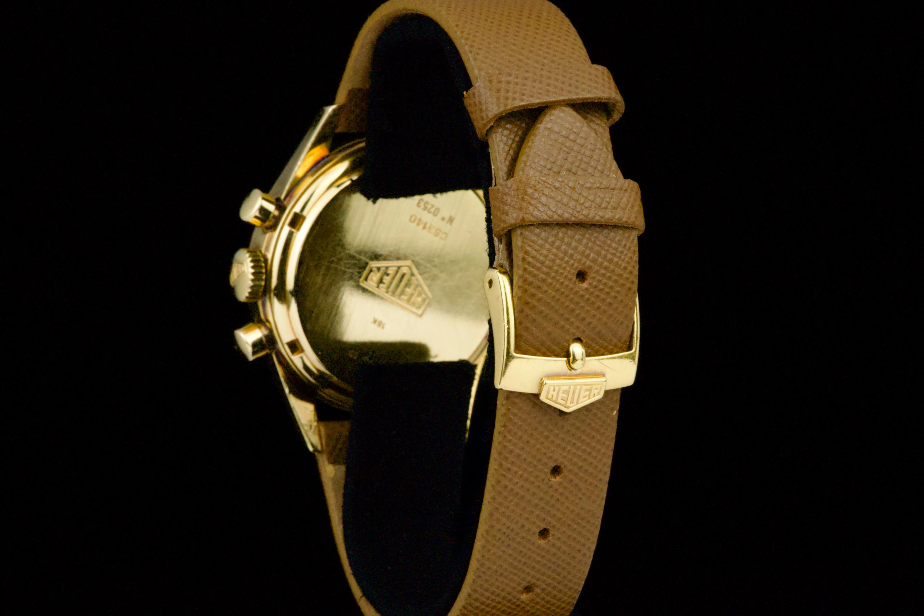 A rare TAG Heuer Carrera 1964 Re-Edition Ref. CS3140, crafted in solid 18k yellow gold and dating to circa 2000. The yellow gold case appears to be unpolished, retaining strong definition, and shows some wear consistent with age and use. The original tritium dial is in excellent condition, with perfectly matching hands. Please note: the rehaut shows some minor damage between 9 and 11 o’clock, visible under close inspection. The watch is fitted with a leather strap and the original 18k yellow gold TAG Heuer buckle. There is no known service history, but the watch is in perfect working condition. A beautifully preserved example of a limited-production neo-vintage chronograph — combining classic Carrera proportions with the warmth of yellow gold.