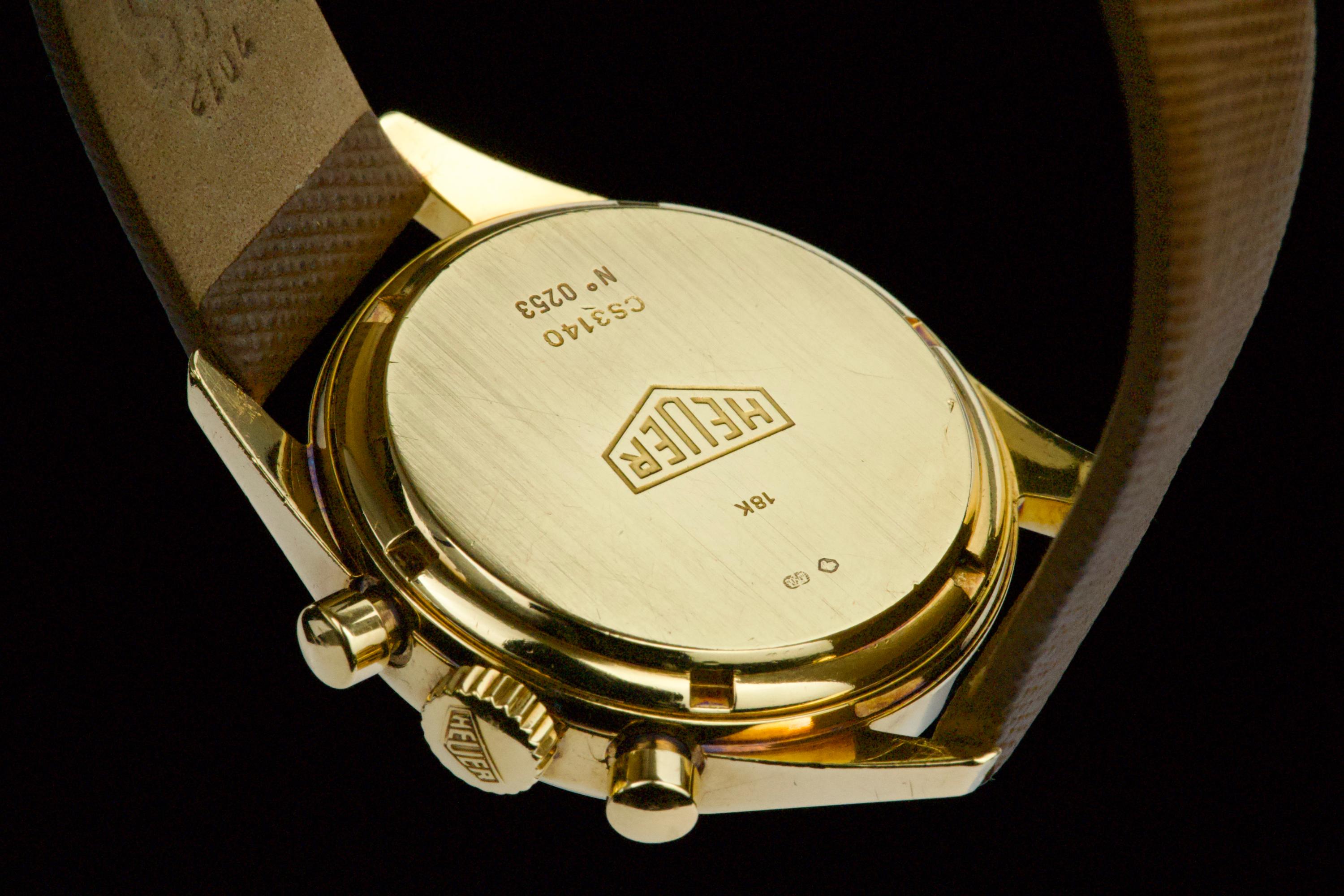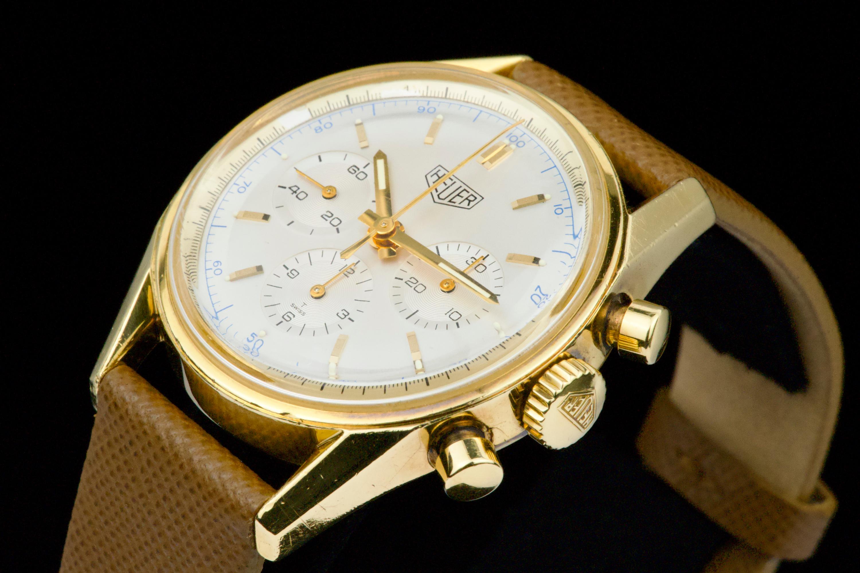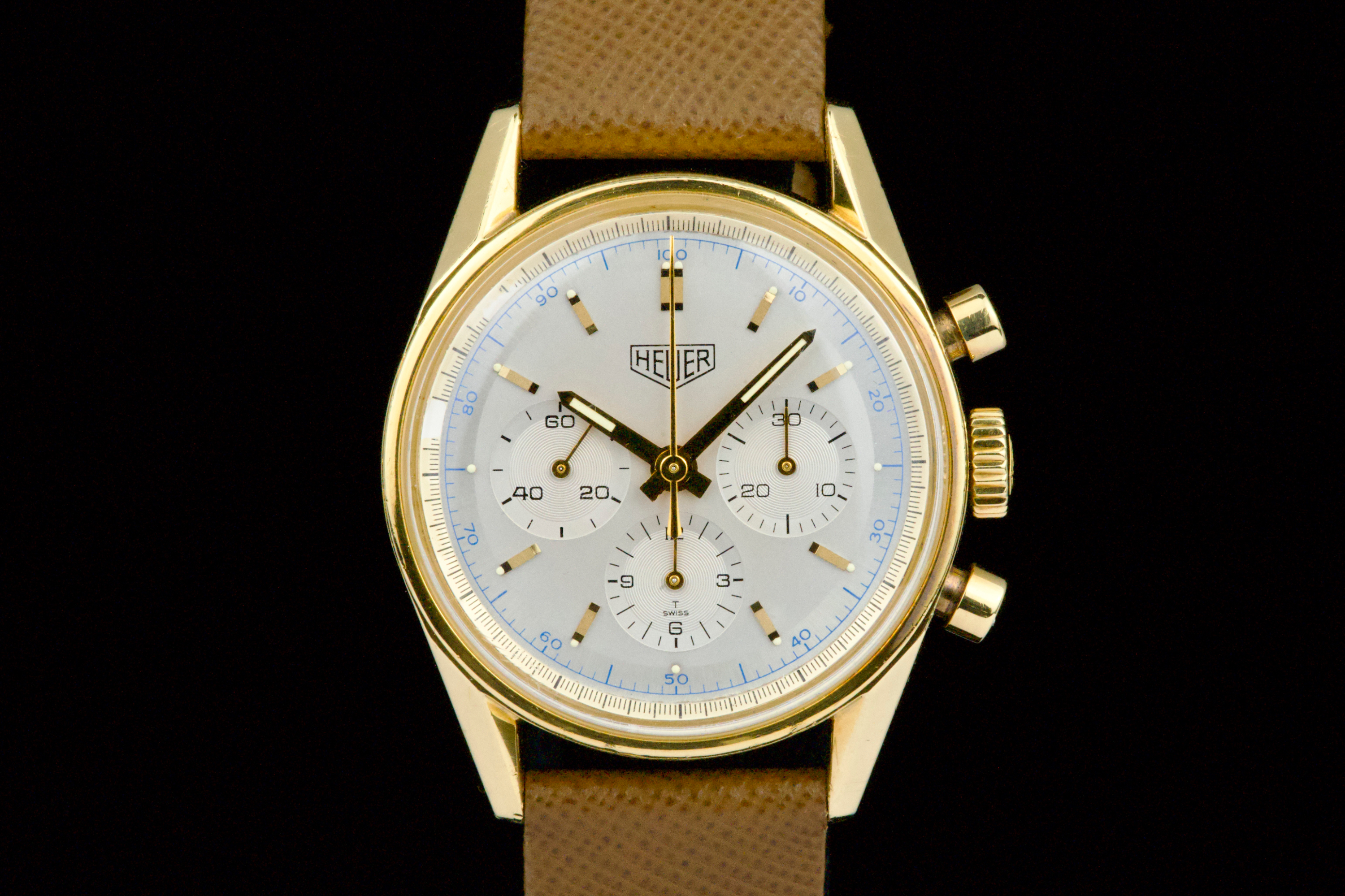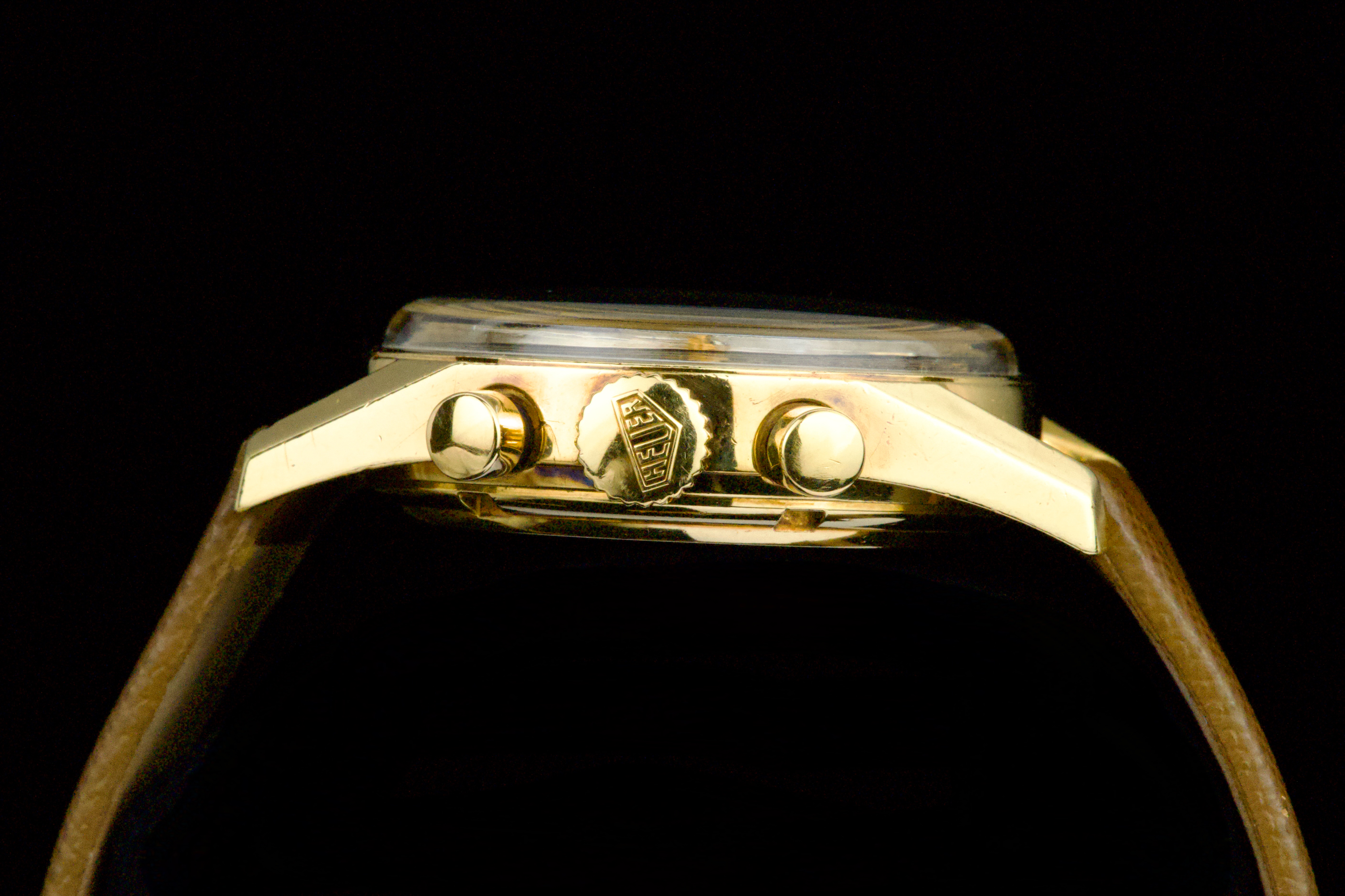 A rare TAG Heuer Carrera 1964 Re-Edition Ref. CS3140, crafted in solid 18k yellow gold and dating to circa 2000. The yellow gold case appears to be unpolished, retaining strong definition, and shows some wear consistent with age and use. The original tritium dial is in excellent condition, with perfectly matching hands. Please note: the rehaut shows some minor damage between 9 and 11 o’clock, visible under close inspection. The watch is fitted with a leather strap and the original 18k yellow gold TAG Heuer buckle. There is no known service history, but the watch is in perfect working condition. A beautifully preserved example of a limited-production neo-vintage chronograph — combining classic Carrera proportions with the warmth of yellow gold.