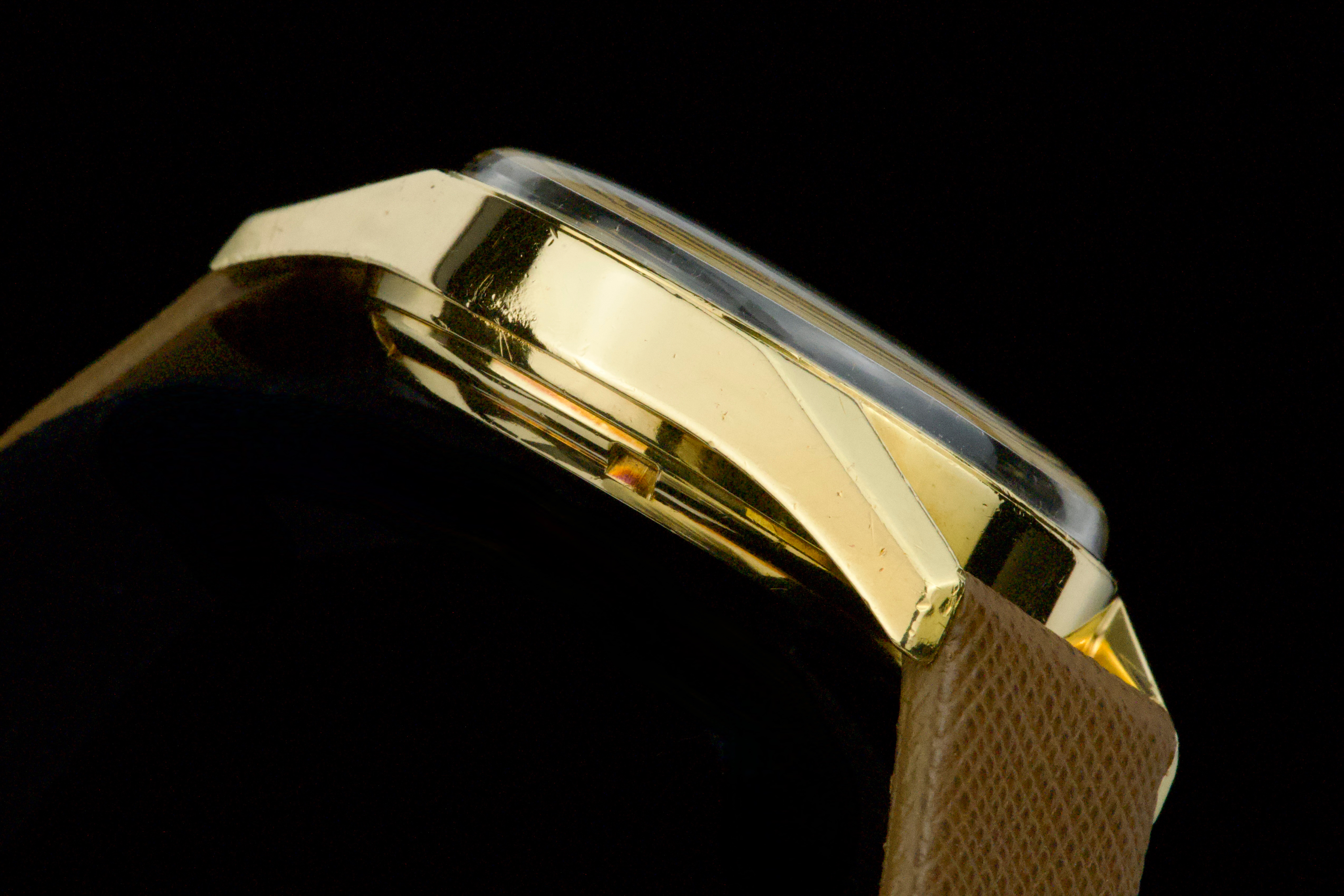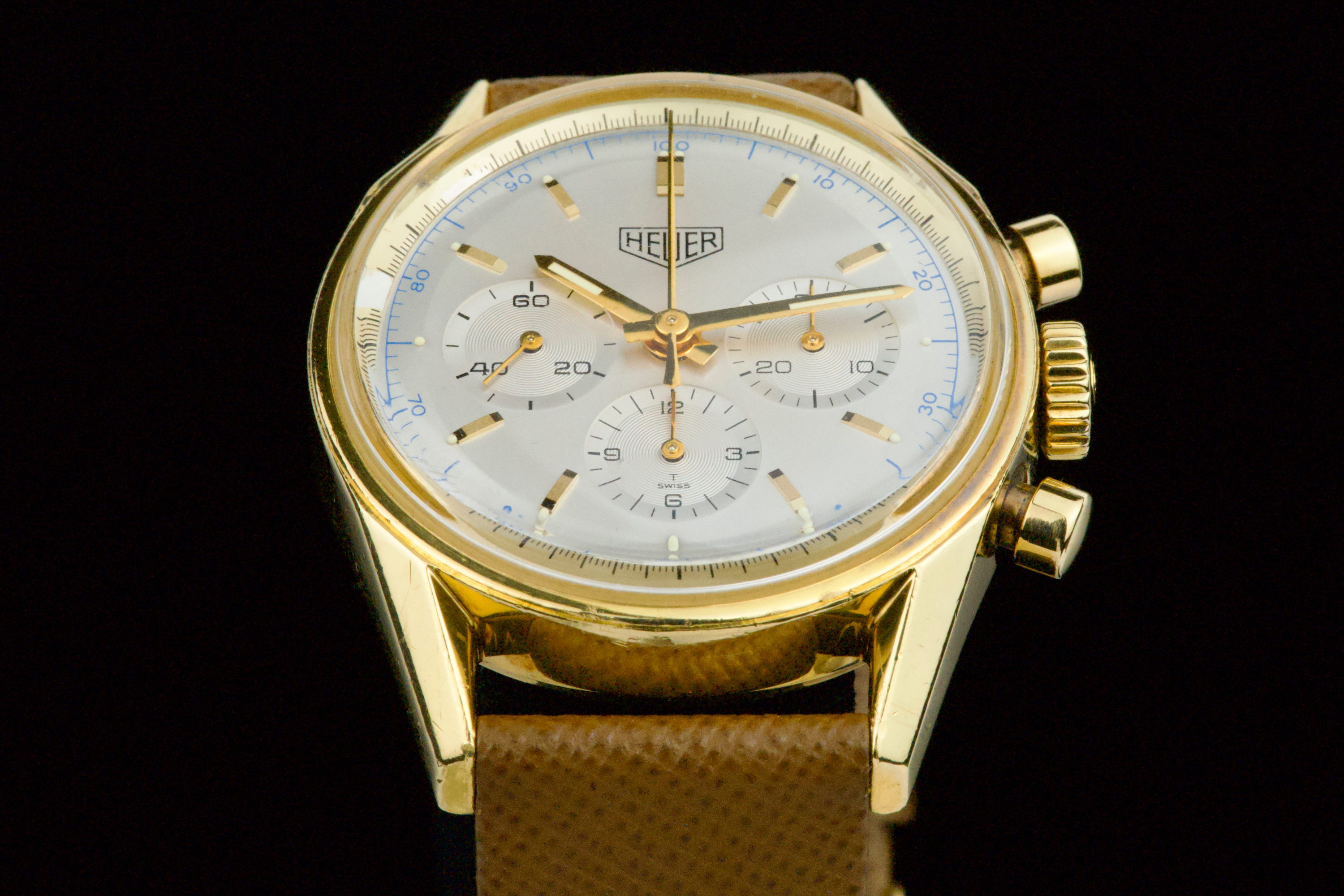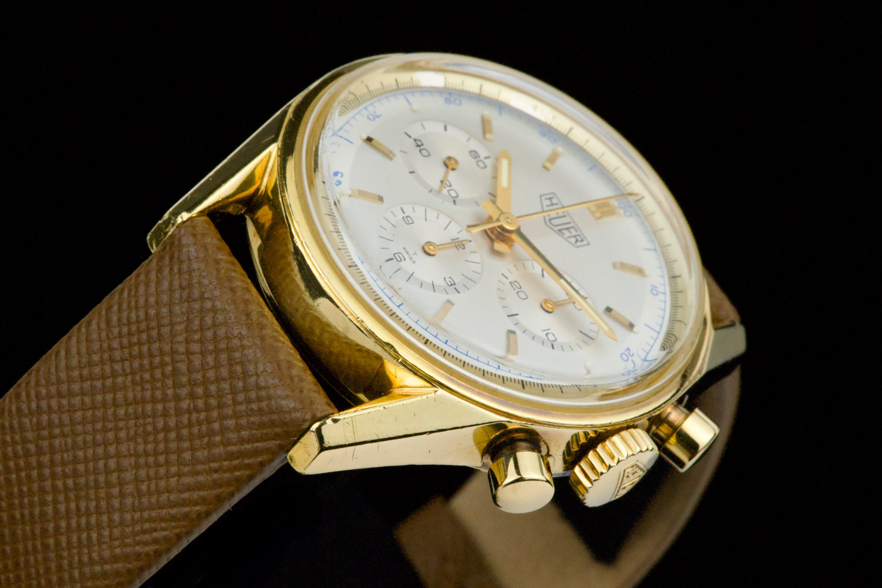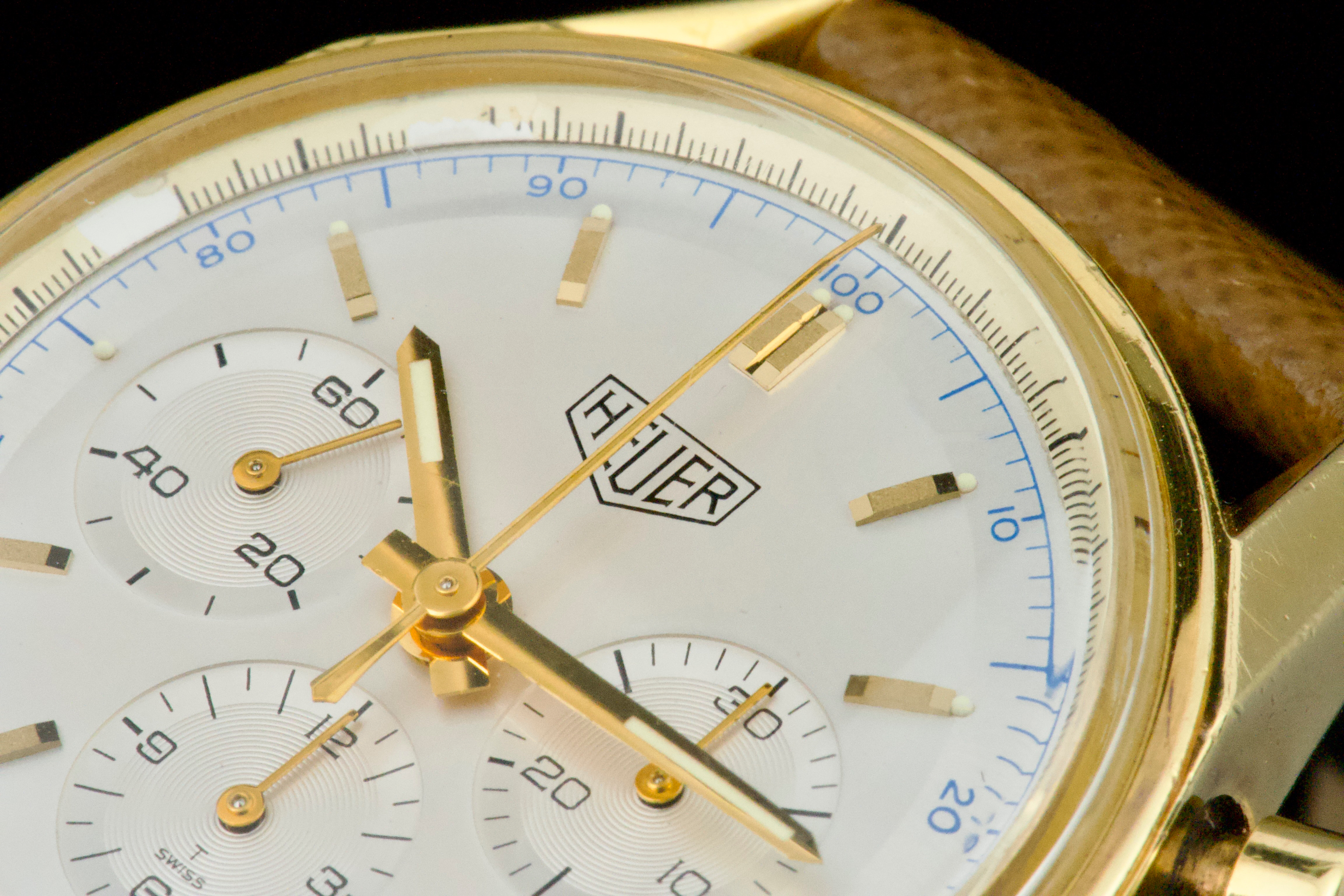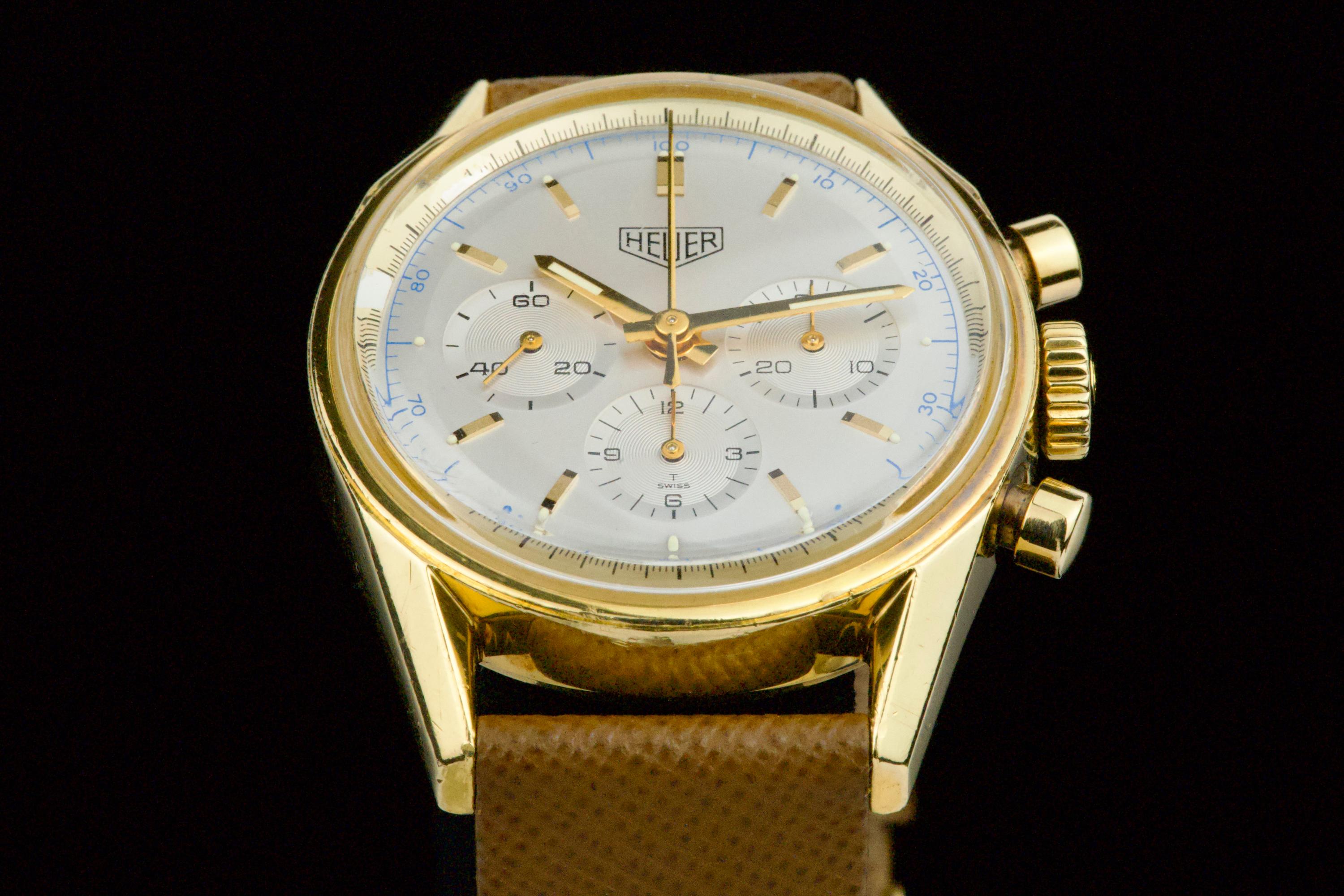 A rare TAG Heuer Carrera 1964 Re-Edition Ref. CS3140, crafted in solid 18k yellow gold and dating to circa 2000. The yellow gold case appears to be unpolished, retaining strong definition, and shows some wear consistent with age and use. The original tritium dial is in excellent condition, with perfectly matching hands. Please note: the rehaut shows some minor damage between 9 and 11 o’clock, visible under close inspection. The watch is fitted with a leather strap and the original 18k yellow gold TAG Heuer buckle. There is no known service history, but the watch is in perfect working condition. A beautifully preserved example of a limited-production neo-vintage chronograph — combining classic Carrera proportions with the warmth of yellow gold.