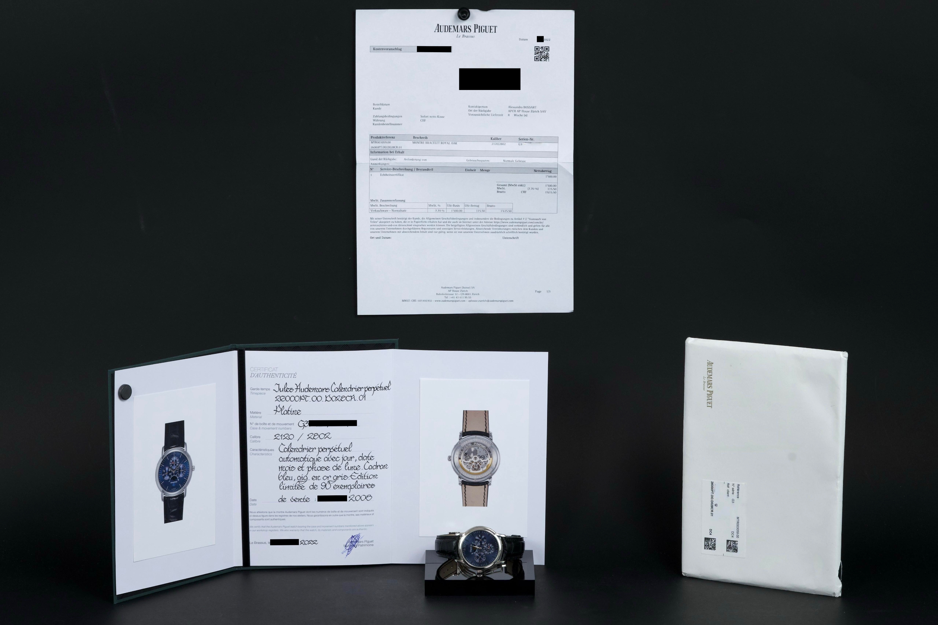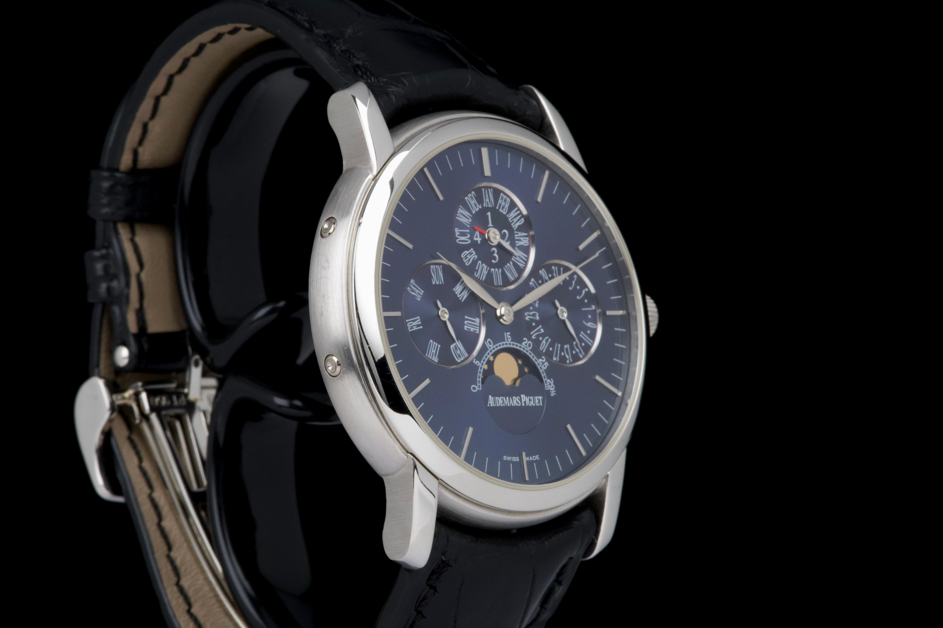 The present Audemars Piguet Jules Audemars Quantième Perpétuel reference 26000PT, dating to 2008, is an exceptionally rare and refined example of the manufacture’s classical high complications, produced in a limited edition of only 90 pieces. Executed in platinum and measuring 40.5 mm in diameter, this discreet yet highly sophisticated perpetual calendar embodies Audemars Piguet’s mastery of traditional watchmaking at the highest level. The watch is preserved in excellent overall condition and has been lightly polished in the past, while retaining strong proportions and an elegant presence on the wrist. It is fitted with a black Audemars Piguet alligator leather strap, paired with a platinum deployant clasp, completing the ensemble with period-correct coherence and refinement. Although no service history accompanies the watch, it is in perfect working condition at the time of cataloguing. Importantly, the watch is accompanied by a Certificate of Authenticity issued by Audemars Piguet in 2022, providing valuable confirmation of its originality and configuration. Produced in extremely limited numbers and offered with official manufacturer documentation, this Jules Audemars Perpetual Calendar represents a rare opportunity to acquire a discreet, highly collectible platinum complicated watch from Audemars Piguet’s modern era.