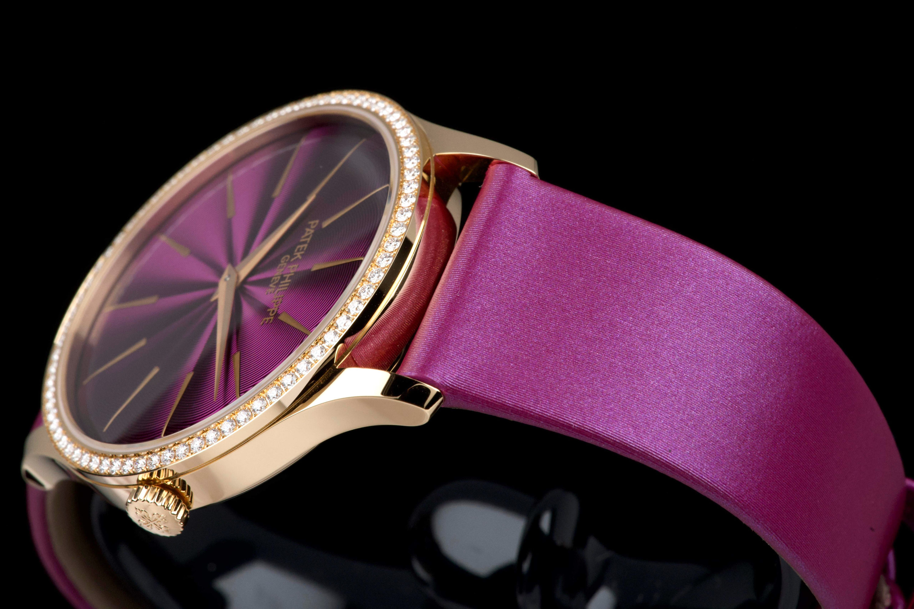 Presented here is an elegant and contemporary example of the Patek Philippe Lady Calatrava reference 4997/200R-001. Crafted in rose gold, this refined timepiece perfectly reflects Patek Philippe’s mastery of classic feminine watchmaking, combining timeless proportions with discreet luxury. This example dates to 2025 and is offered as a full set with its original box, papers, and accessories. Presented in close-to-new condition, the watch shows only the slightest signs of handling, preserving its crisp and refined overall appearance. The beautifully finished dial, enhanced by diamond hour markers and the signature hobnail-patterned bezel, offers a sophisticated and luminous presence on the wrist. A superb opportunity to acquire a nearly unworn example of a modern Lady Calatrava, combining elegance, craftsmanship, and enduring Patek Philippe refinement.