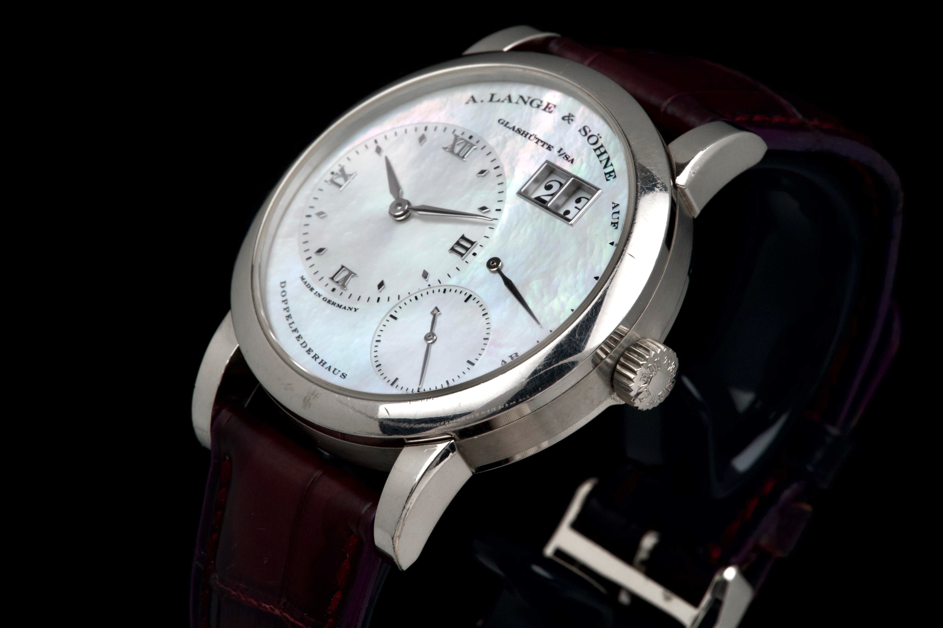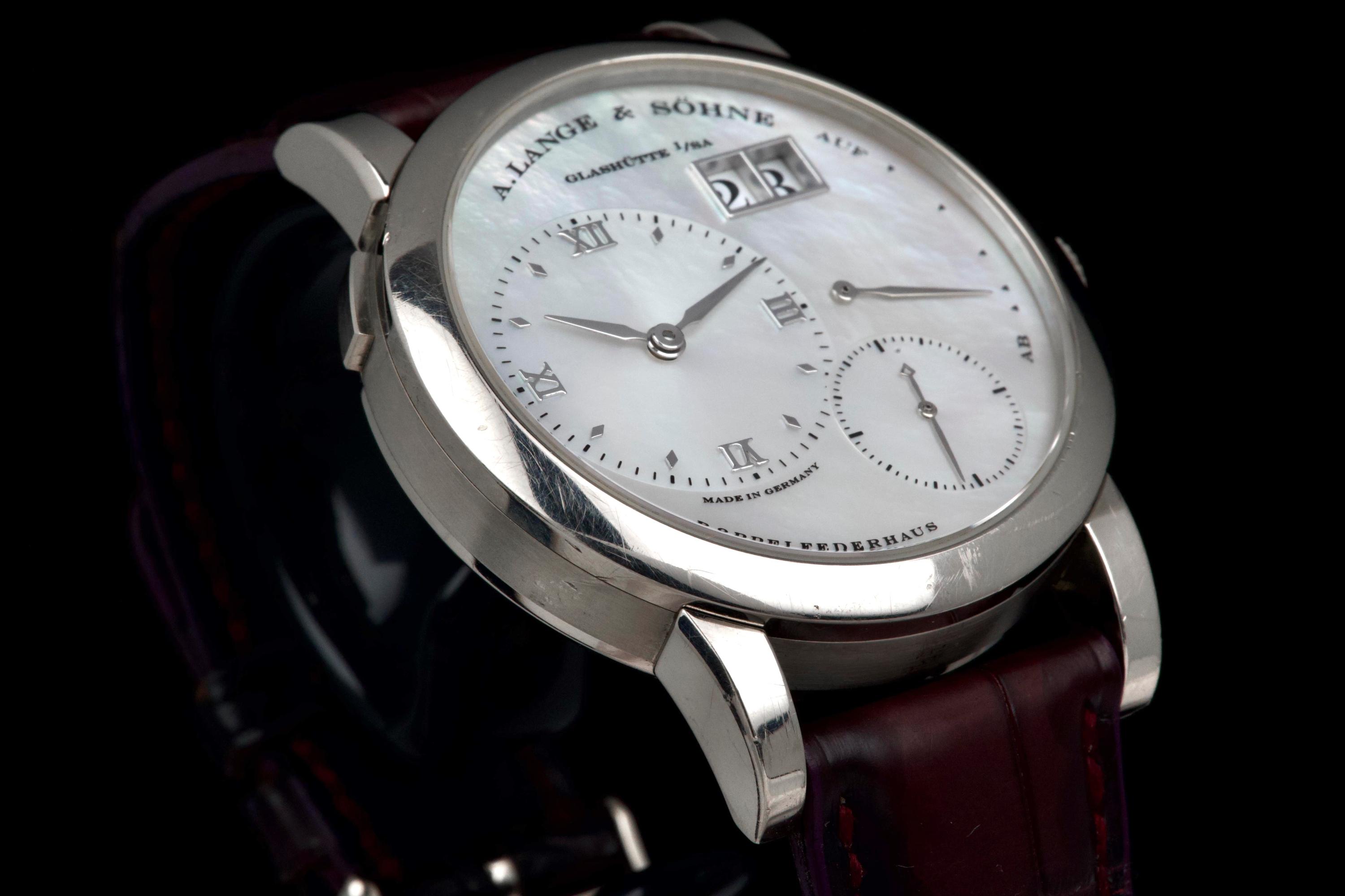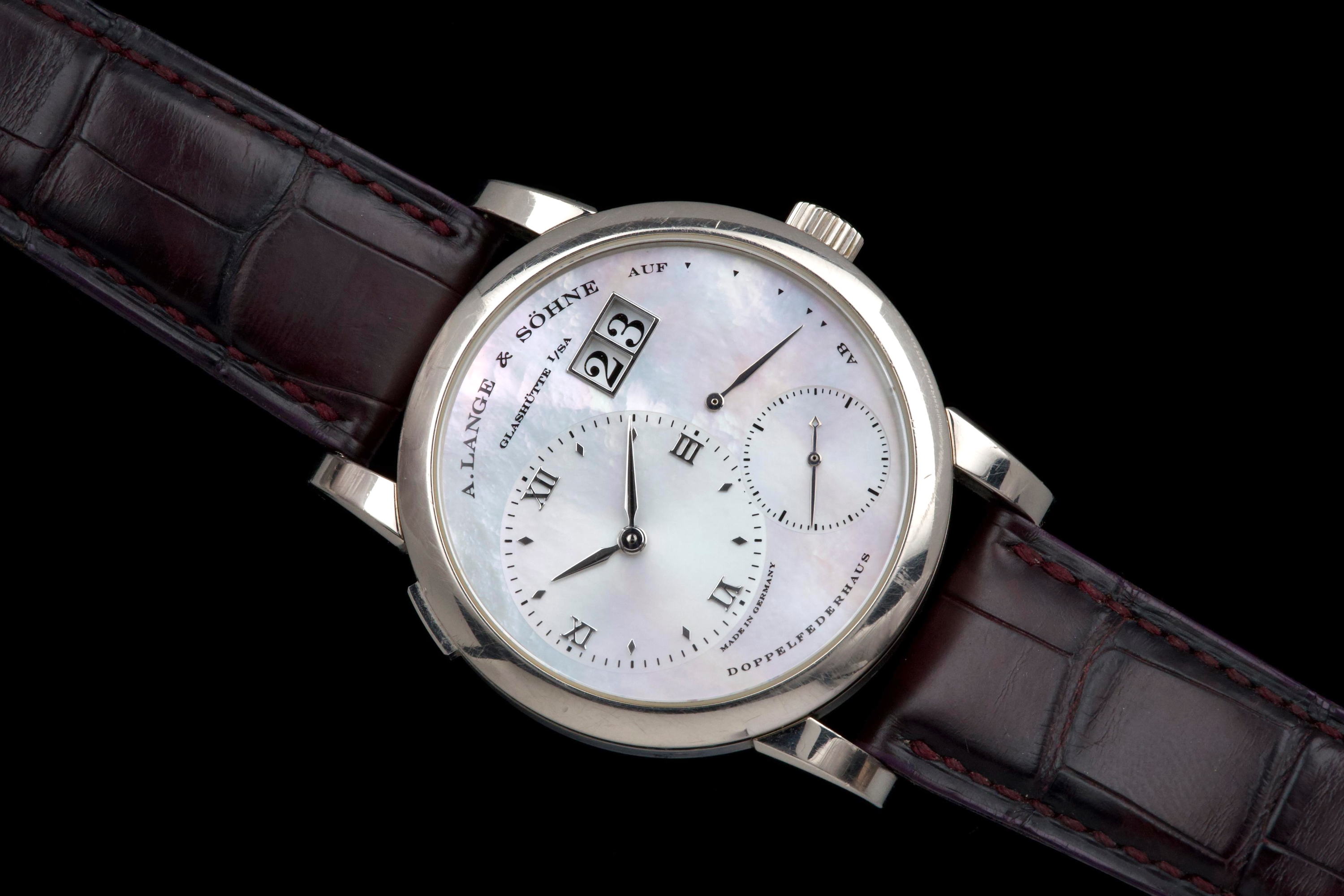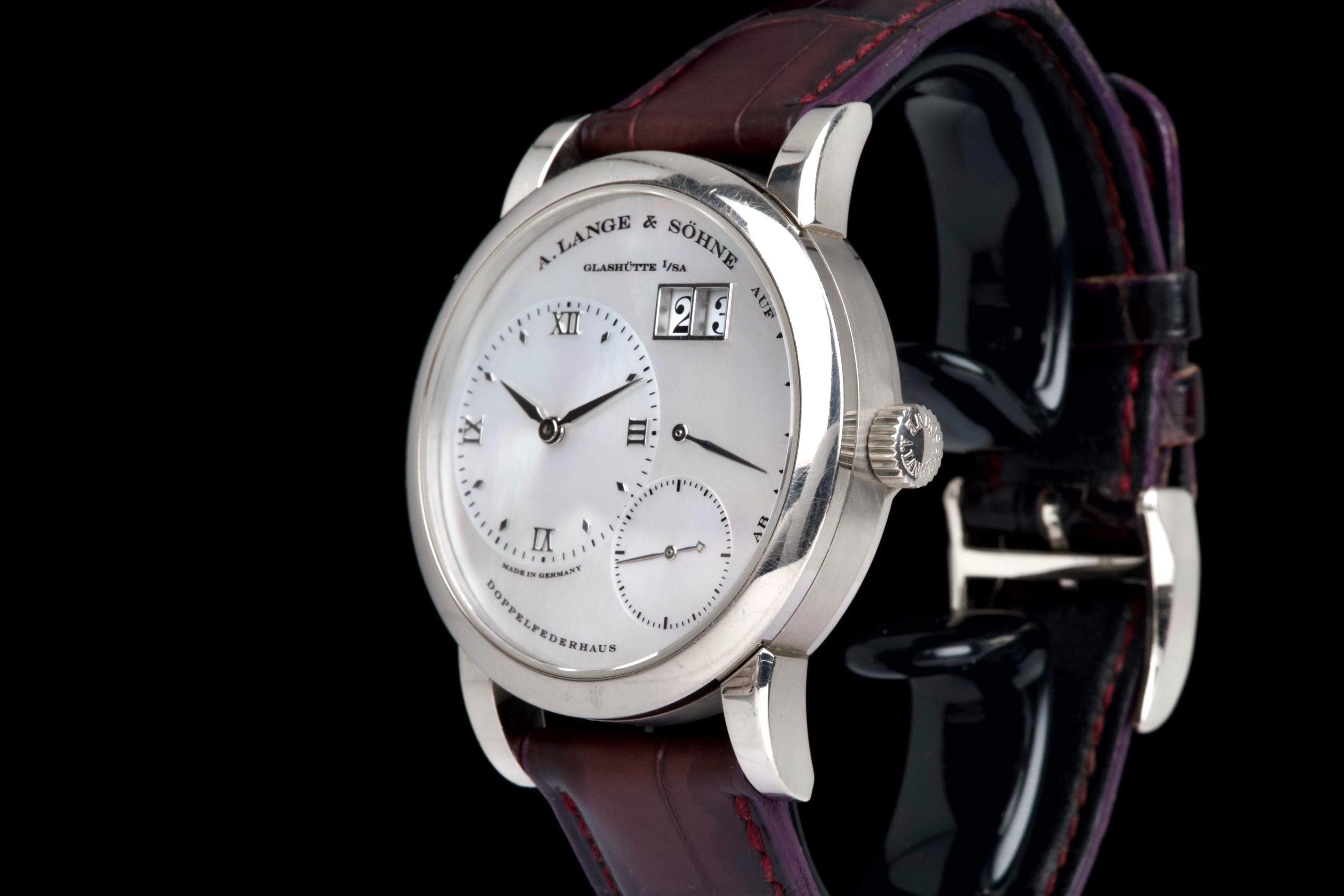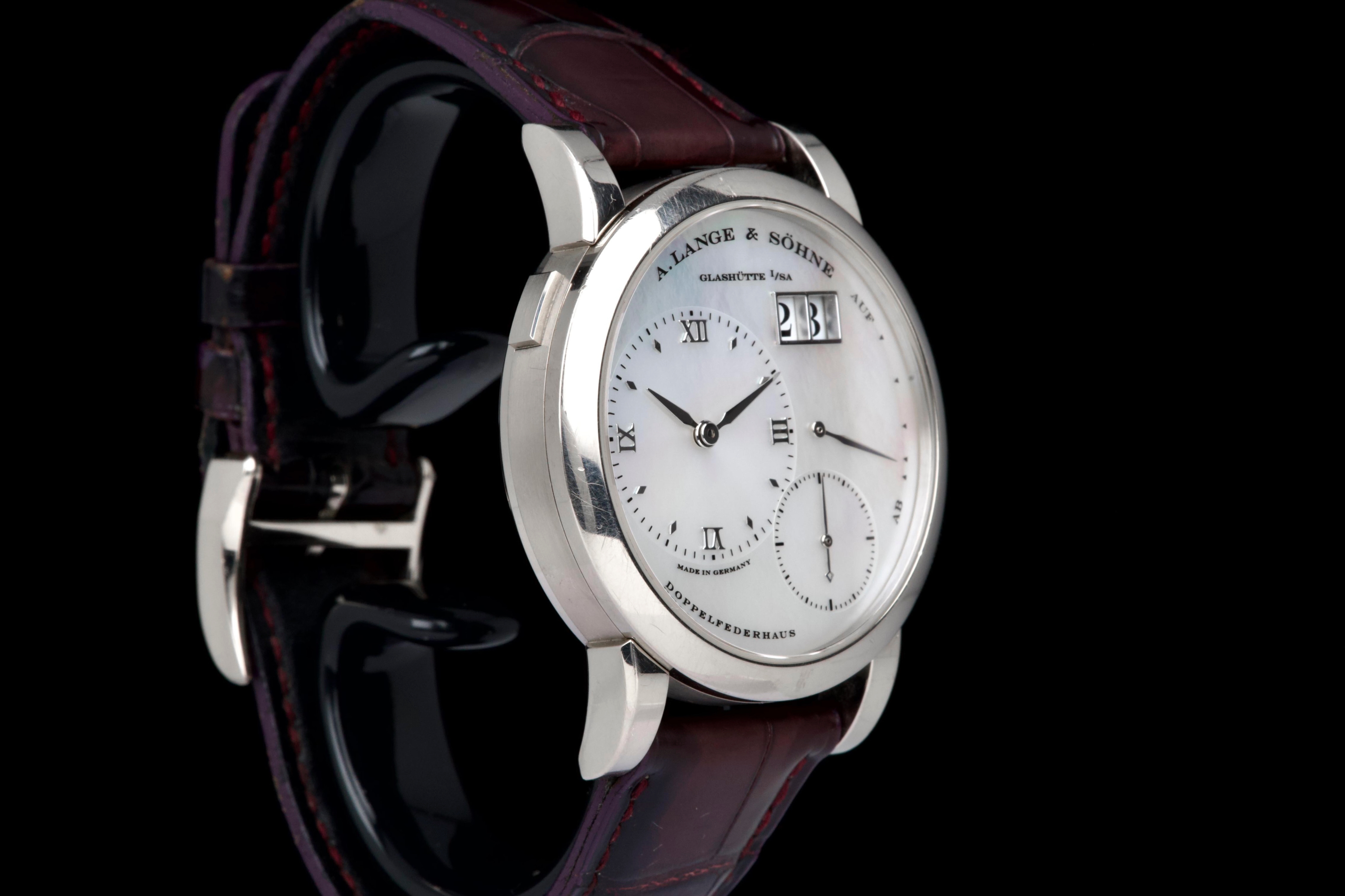 Presented here is an elegant and uncommon example of the A. Lange & Söhne Lange 1 reference 110.029, featuring a beautiful mother-of-pearl dial and dating to 2001. This reference perfectly illustrates the brand’s distinctive design language, combining asymmetrical dial architecture with exceptional German watchmaking craftsmanship. The white gold case measures 38.5mm in diameter with a thickness of approximately 10.4mm, offering strong wrist presence while maintaining refined proportions. The watch appears to remain unpolished and shows visible wear consistent with age and regular use, entirely normal for a piece from 2001; polishing can be arranged upon request. The mother-of-pearl dial remains highly attractive and preserves the unique elegance associated with this rare configuration. The watch is powered by a manual-winding movement offering approximately 72 hours of power reserve, reflecting A. Lange & Söhne’s focus on technical excellence and everyday usability. The watch is fitted with a burgundy crocodile strap showing approximately 70% remaining condition and is secured by a white gold pin buckle. Offered as a full set with its original box, papers, and accessories, and with no recorded service history, this Lange 1 is presented in full working order. A refined and characterful example of an early Lange 1 in precious metal, combining rarity, strong design identity, and honest, well-preserved originality.