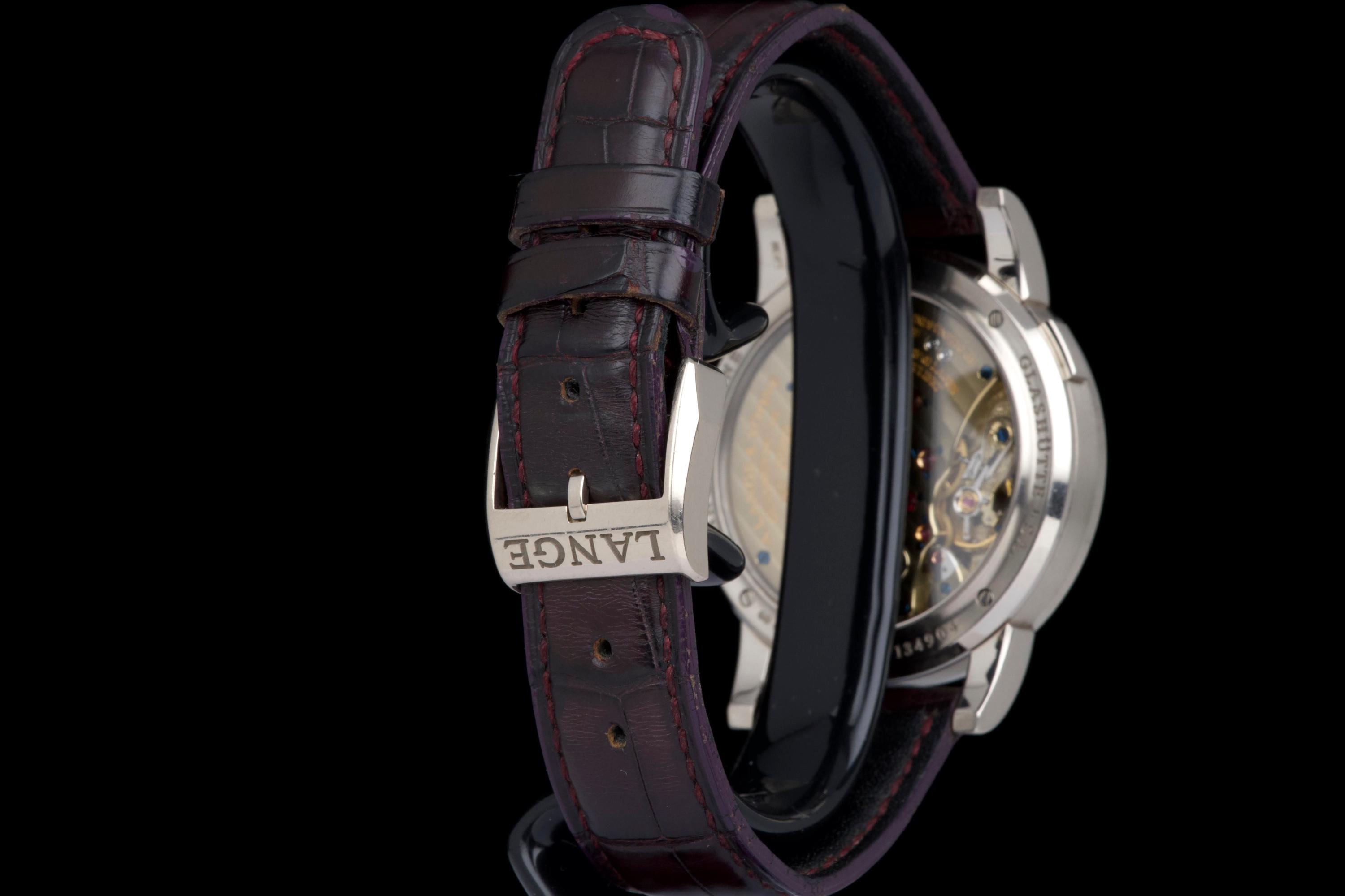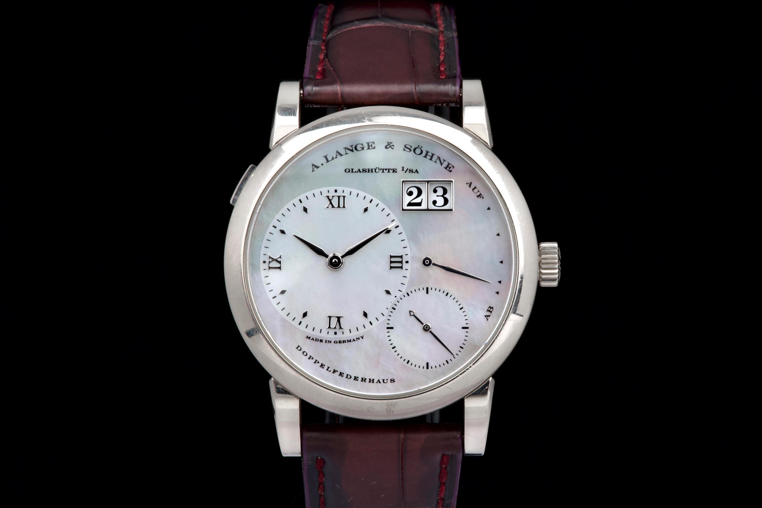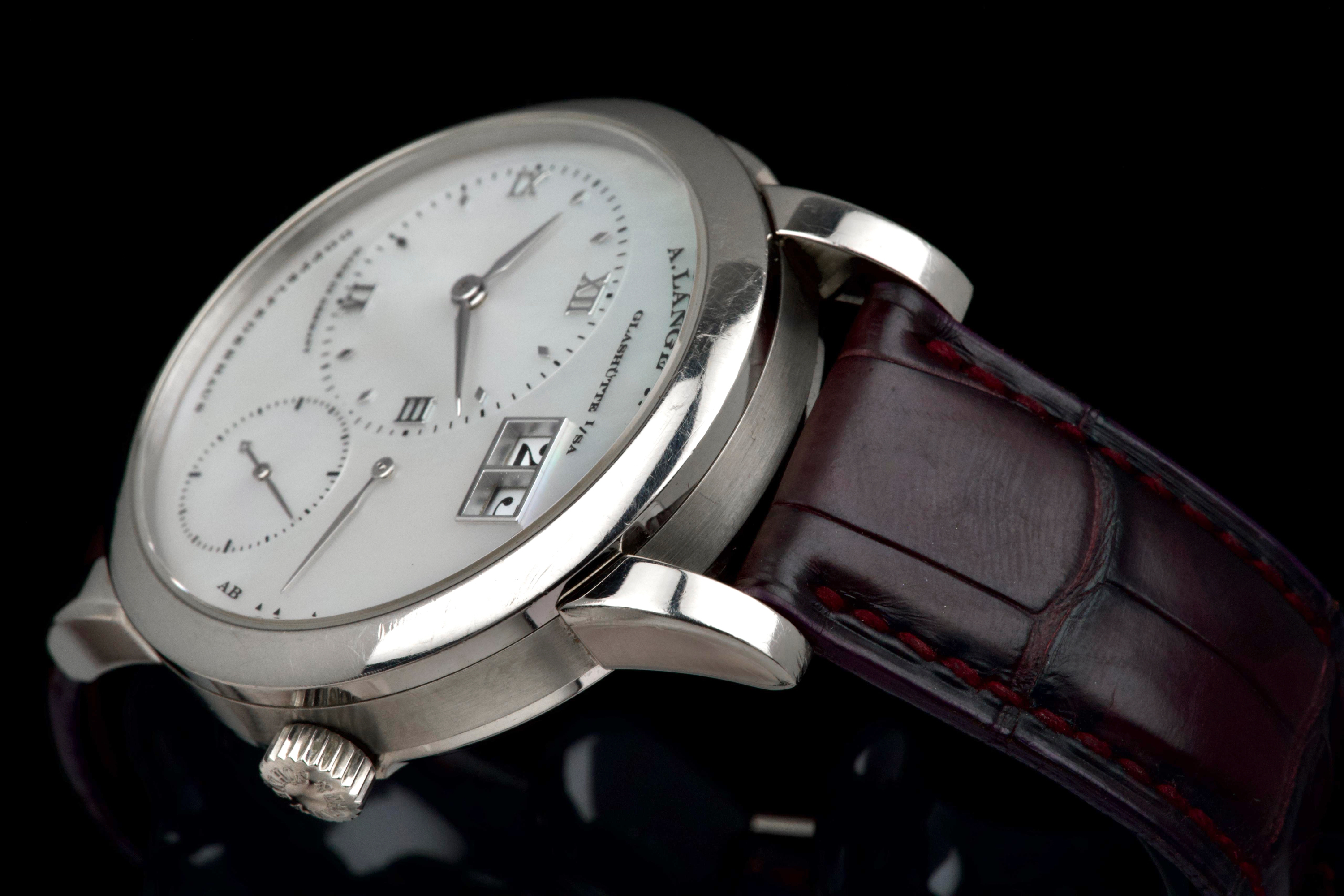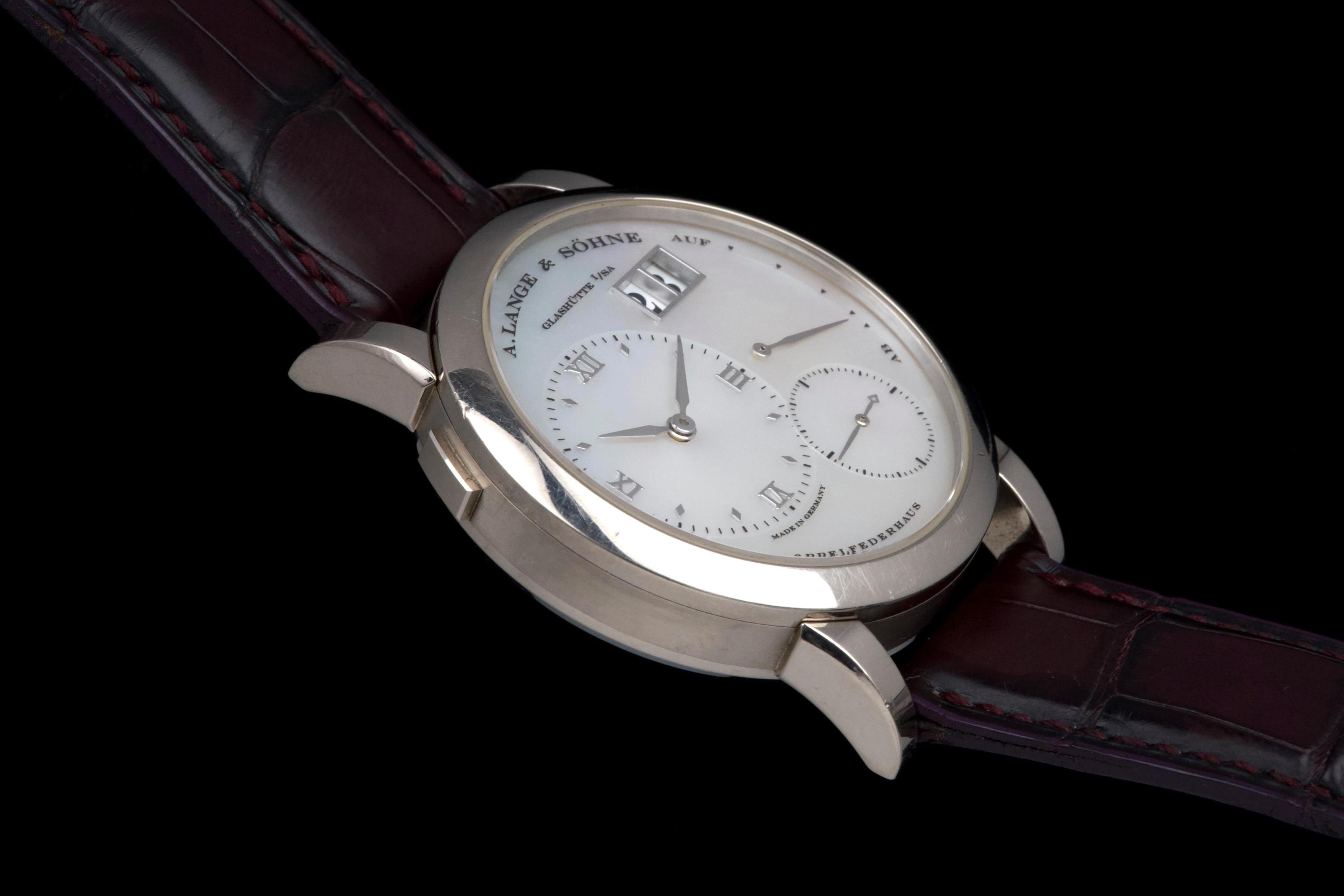 Presented here is an elegant and uncommon example of the A. Lange & Söhne Lange 1 reference 110.029, featuring a beautiful mother-of-pearl dial and dating to 2001. This reference perfectly illustrates the brand’s distinctive design language, combining asymmetrical dial architecture with exceptional German watchmaking craftsmanship. The white gold case measures 38.5mm in diameter with a thickness of approximately 10.4mm, offering strong wrist presence while maintaining refined proportions. The watch appears to remain unpolished and shows visible wear consistent with age and regular use, entirely normal for a piece from 2001; polishing can be arranged upon request. The mother-of-pearl dial remains highly attractive and preserves the unique elegance associated with this rare configuration. The watch is powered by a manual-winding movement offering approximately 72 hours of power reserve, reflecting A. Lange & Söhne’s focus on technical excellence and everyday usability. The watch is fitted with a burgundy crocodile strap showing approximately 70% remaining condition and is secured by a white gold pin buckle. Offered as a full set with its original box, papers, and accessories, and with no recorded service history, this Lange 1 is presented in full working order. A refined and characterful example of an early Lange 1 in precious metal, combining rarity, strong design identity, and honest, well-preserved originality.