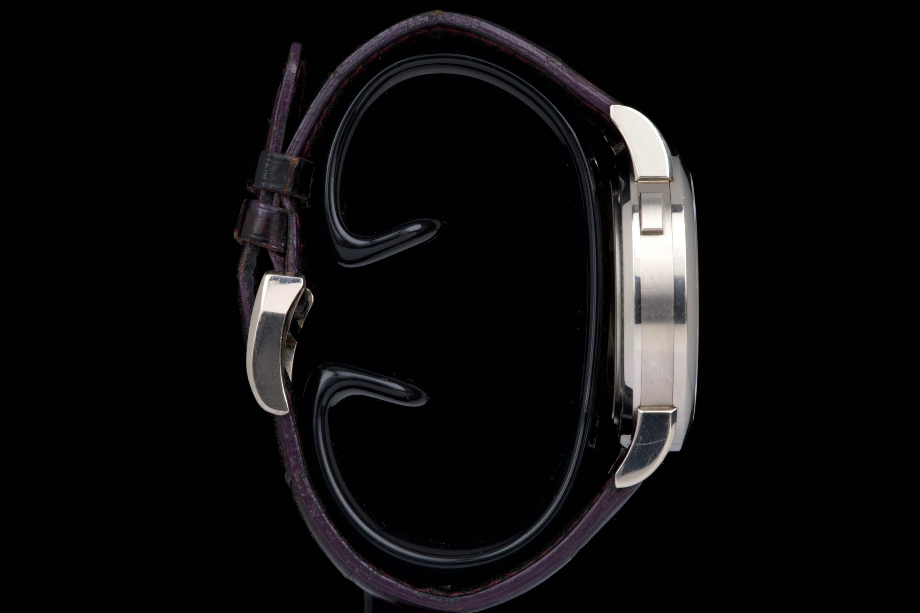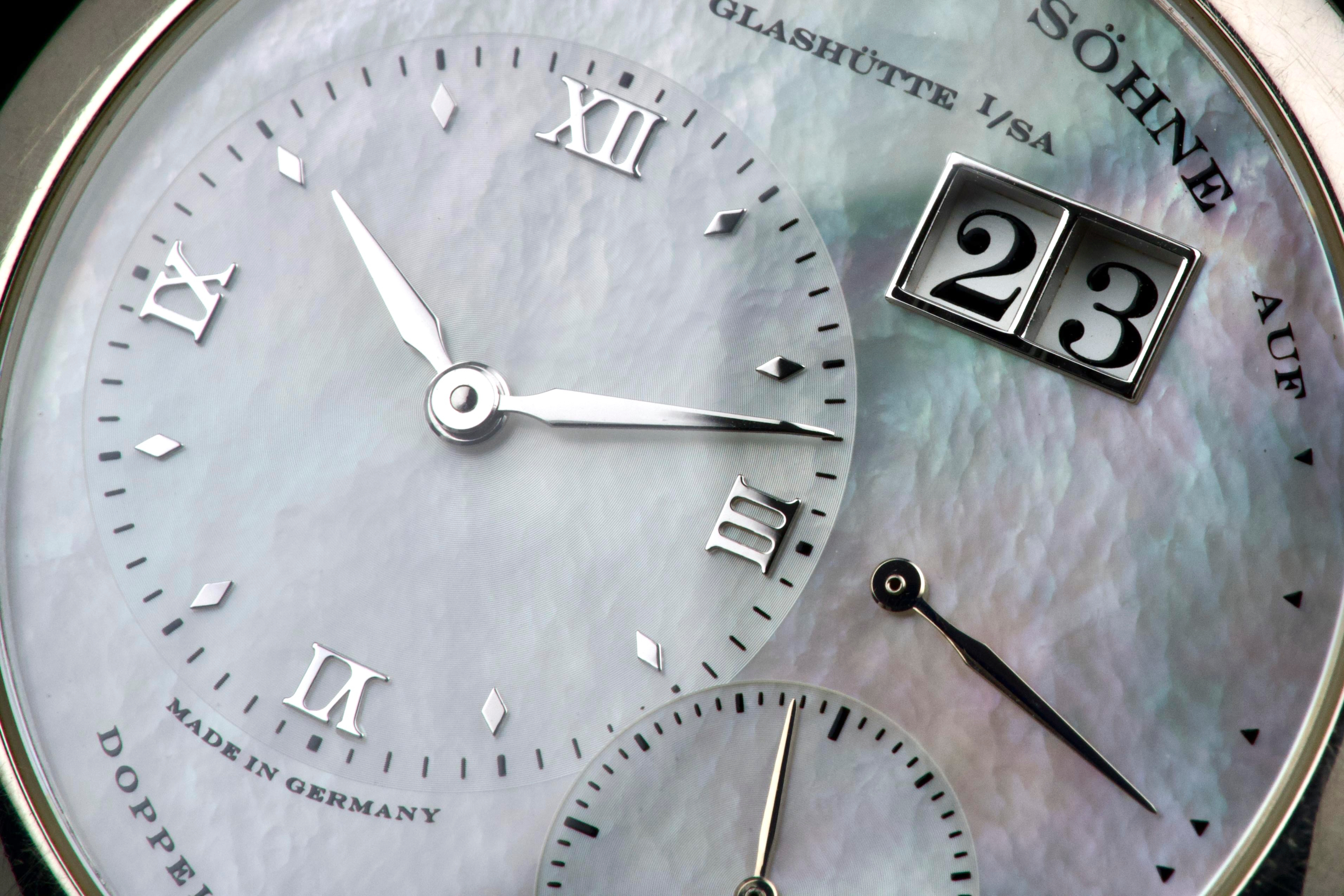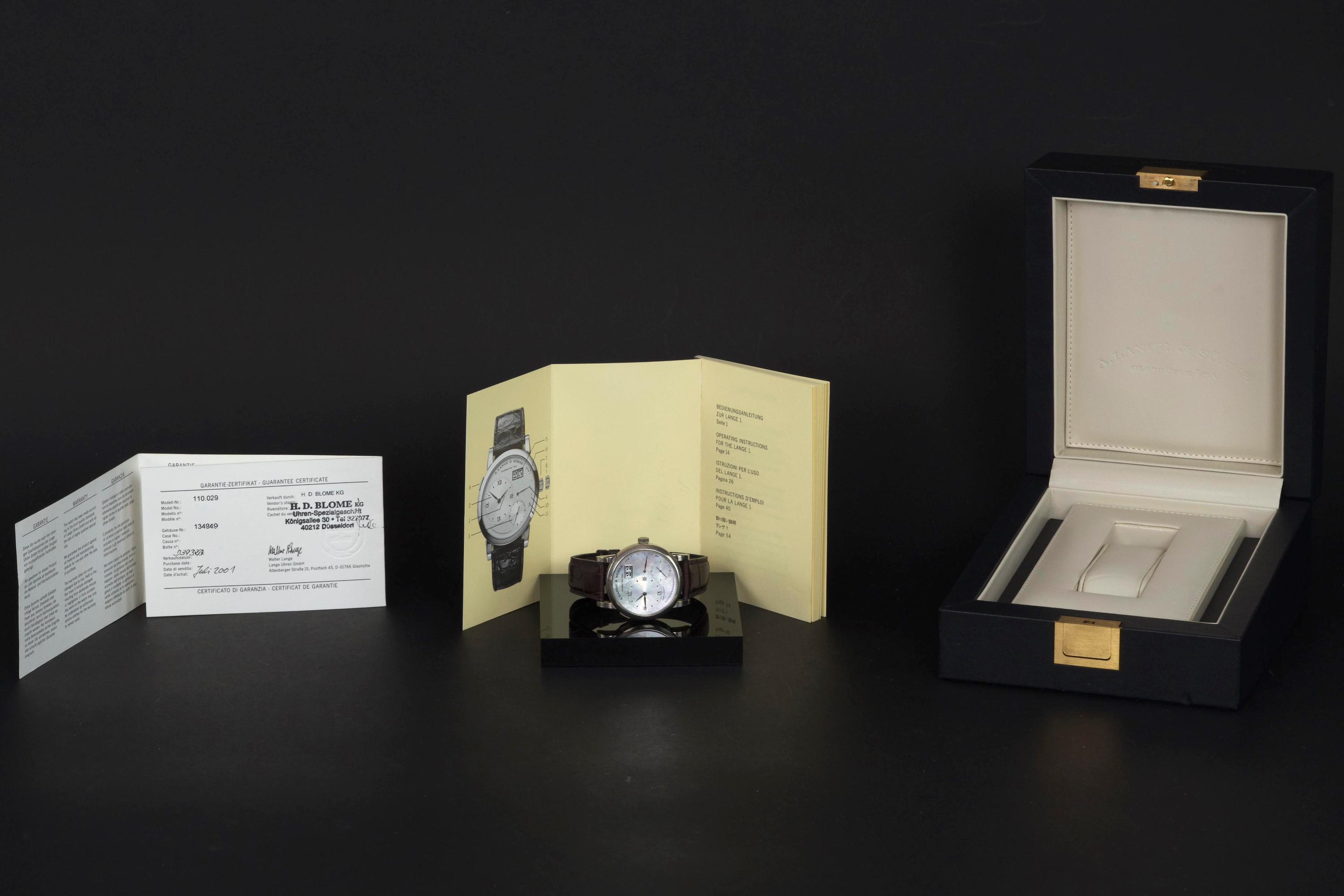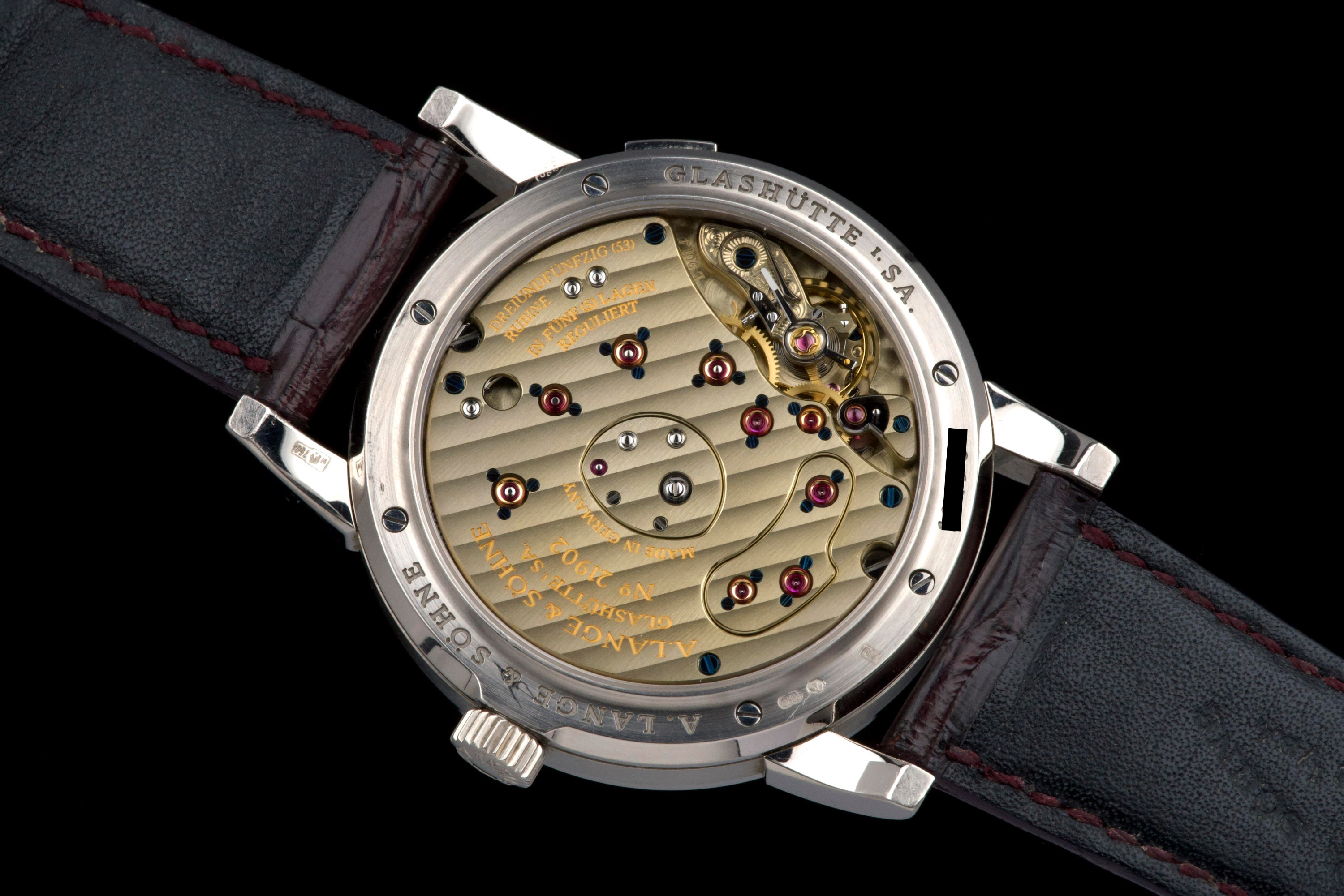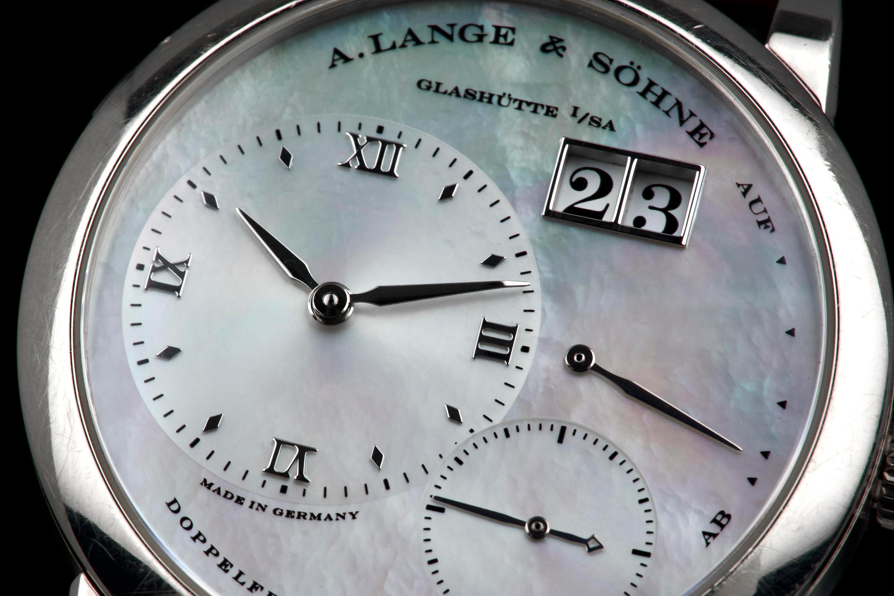 Presented here is an elegant and uncommon example of the A. Lange & Söhne Lange 1 reference 110.029, featuring a beautiful mother-of-pearl dial and dating to 2001. This reference perfectly illustrates the brand’s distinctive design language, combining asymmetrical dial architecture with exceptional German watchmaking craftsmanship. The white gold case measures 38.5mm in diameter with a thickness of approximately 10.4mm, offering strong wrist presence while maintaining refined proportions. The watch appears to remain unpolished and shows visible wear consistent with age and regular use, entirely normal for a piece from 2001; polishing can be arranged upon request. The mother-of-pearl dial remains highly attractive and preserves the unique elegance associated with this rare configuration. The watch is powered by a manual-winding movement offering approximately 72 hours of power reserve, reflecting A. Lange & Söhne’s focus on technical excellence and everyday usability. The watch is fitted with a burgundy crocodile strap showing approximately 70% remaining condition and is secured by a white gold pin buckle. Offered as a full set with its original box, papers, and accessories, and with no recorded service history, this Lange 1 is presented in full working order. A refined and characterful example of an early Lange 1 in precious metal, combining rarity, strong design identity, and honest, well-preserved originality.