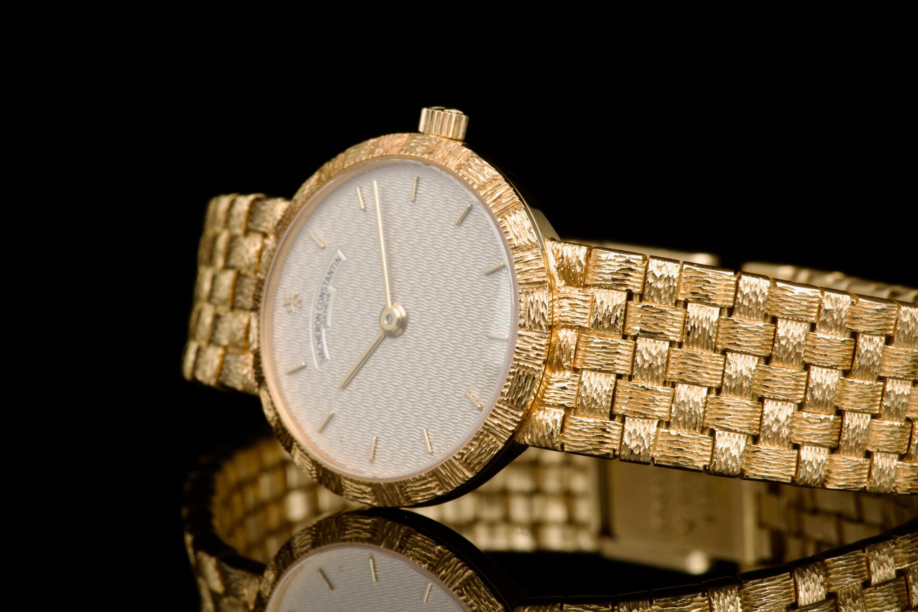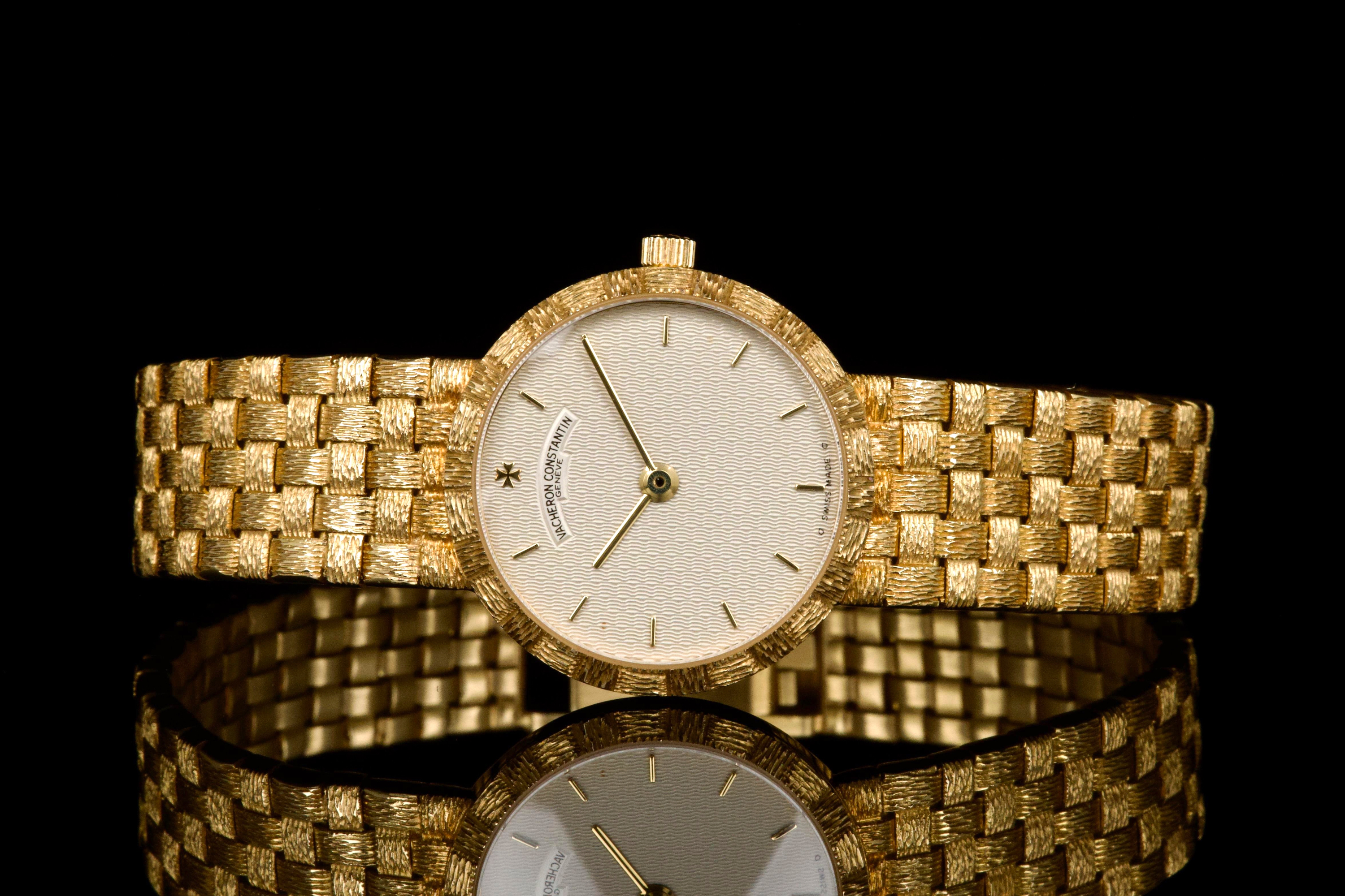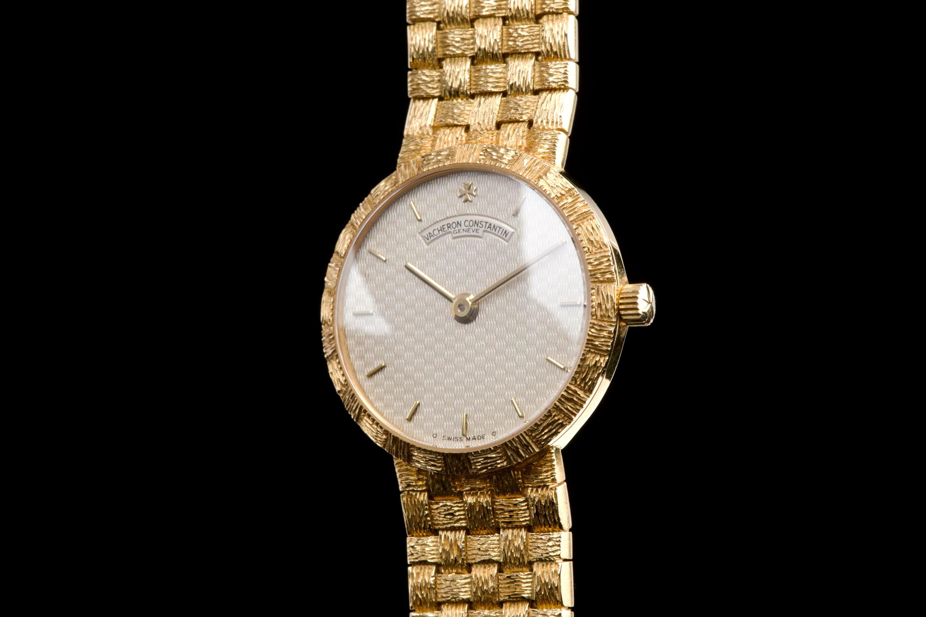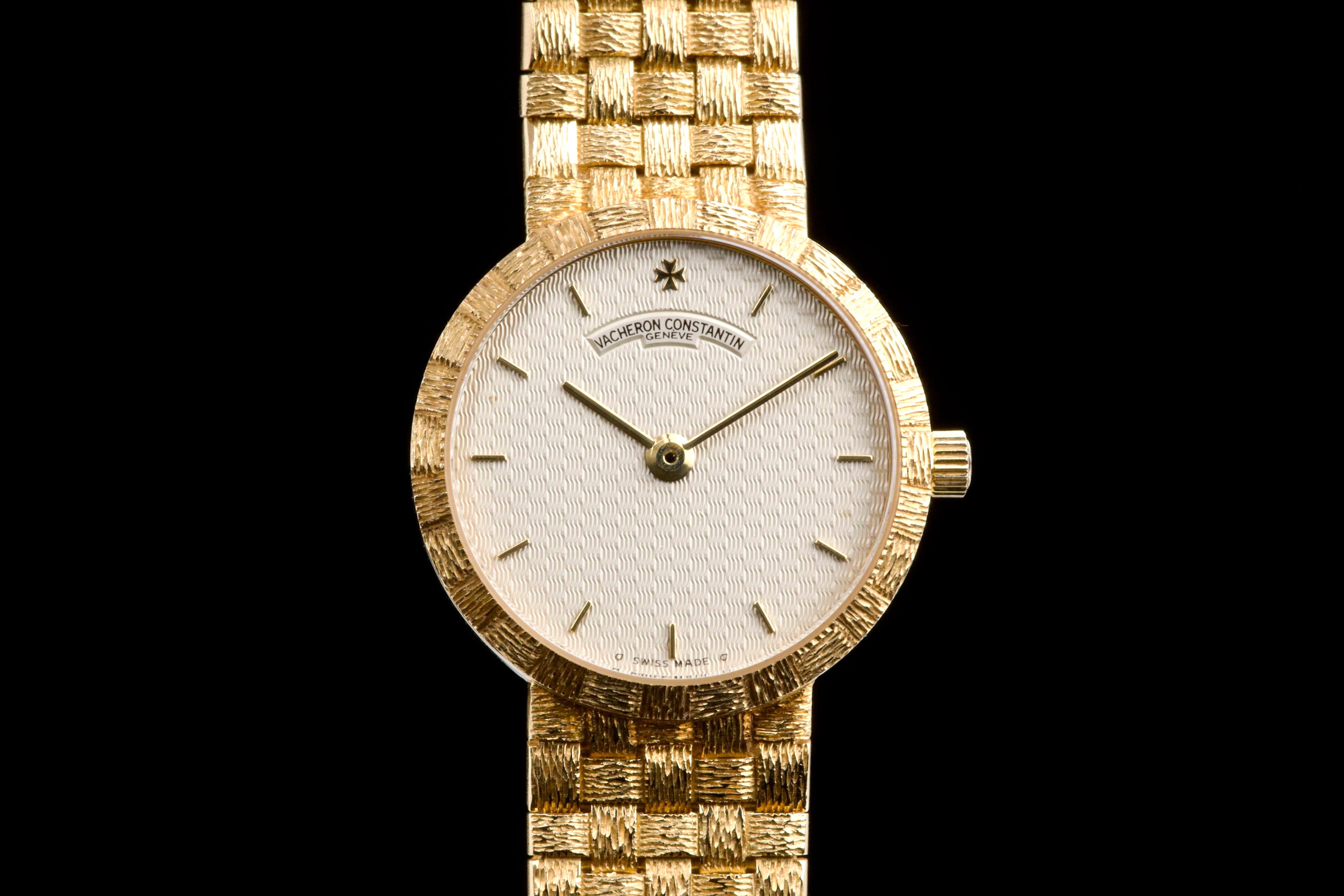 A refined and elegant Vacheron Constantin “Mesh Doll” reference 31046, crafted in 18k yellow gold and dating to the 1980s. This feminine timepiece features a delicate 24 mm round case paired with a beautifully integrated yellow gold mesh bracelet, offering both comfort and timeless sophistication. The cream guilloché dial adds depth and elegance, perfectly complementing the warm tone of the case. Powered by a quartz movement, the watch has recently had its battery replaced by our watchmaker and is in excellent working order. The watch is presented in excellent overall condition, with very well-preserved case, bracelet, and dial. A charming and understated vintage Vacheron Constantin, combining classic design with everyday wearability.