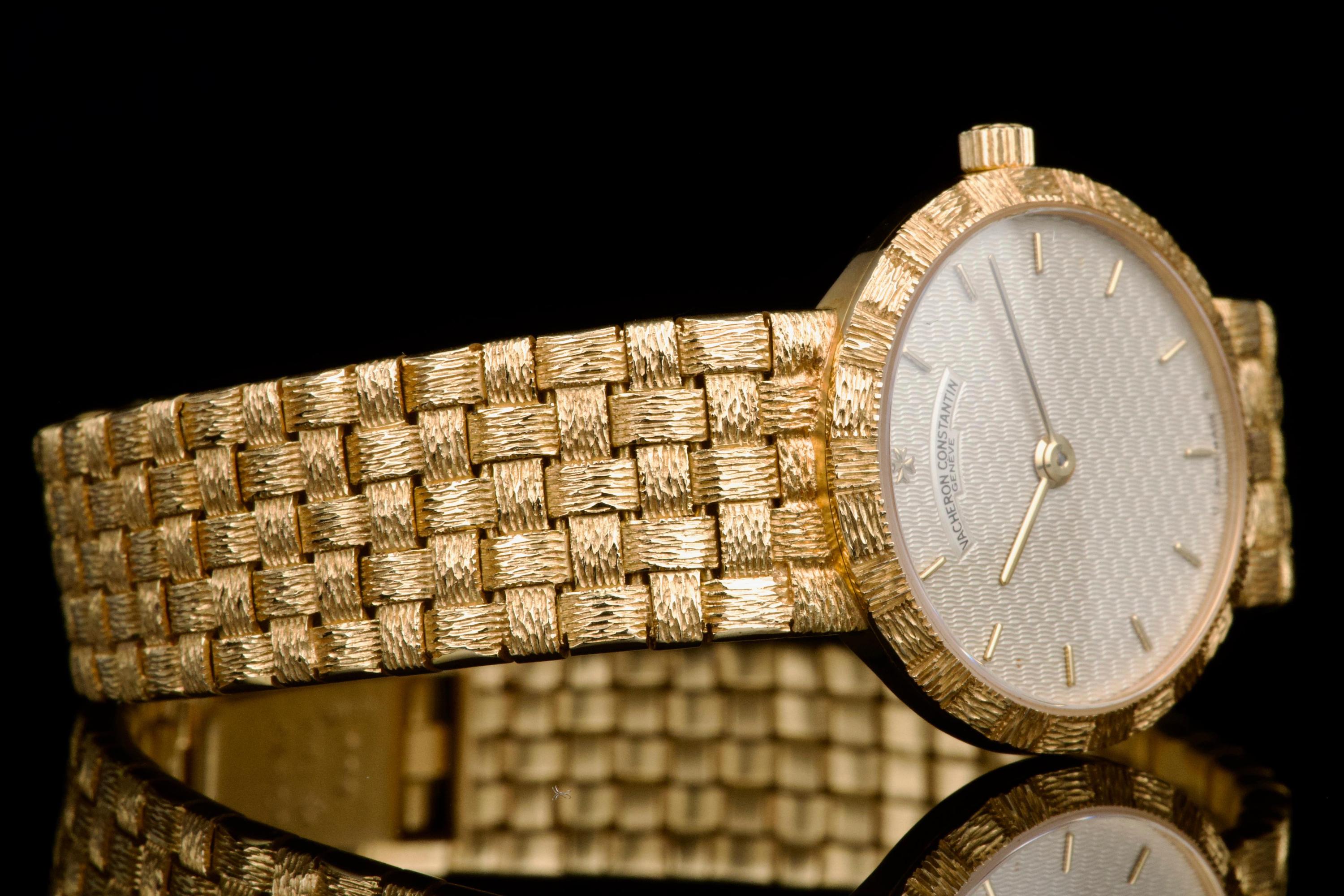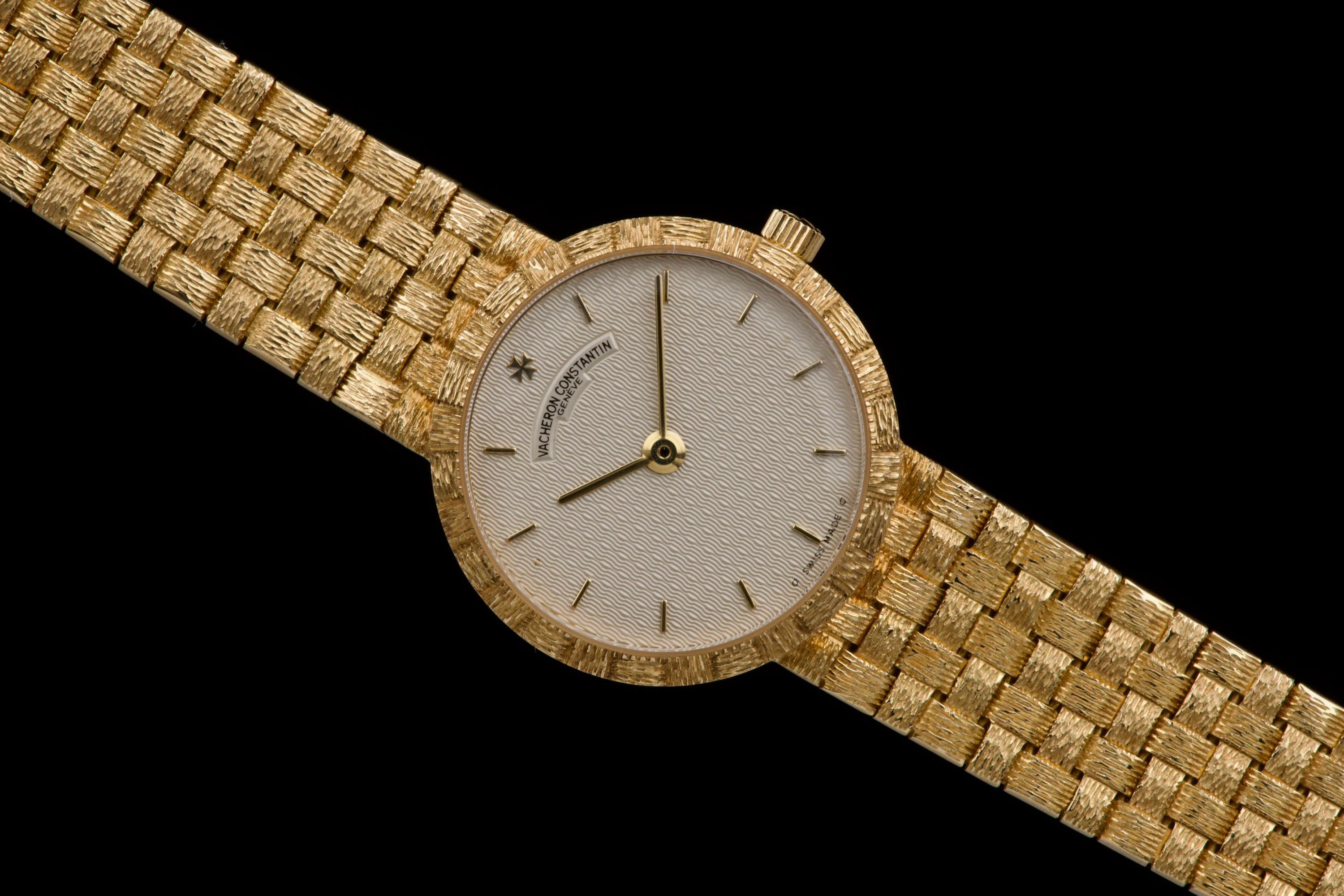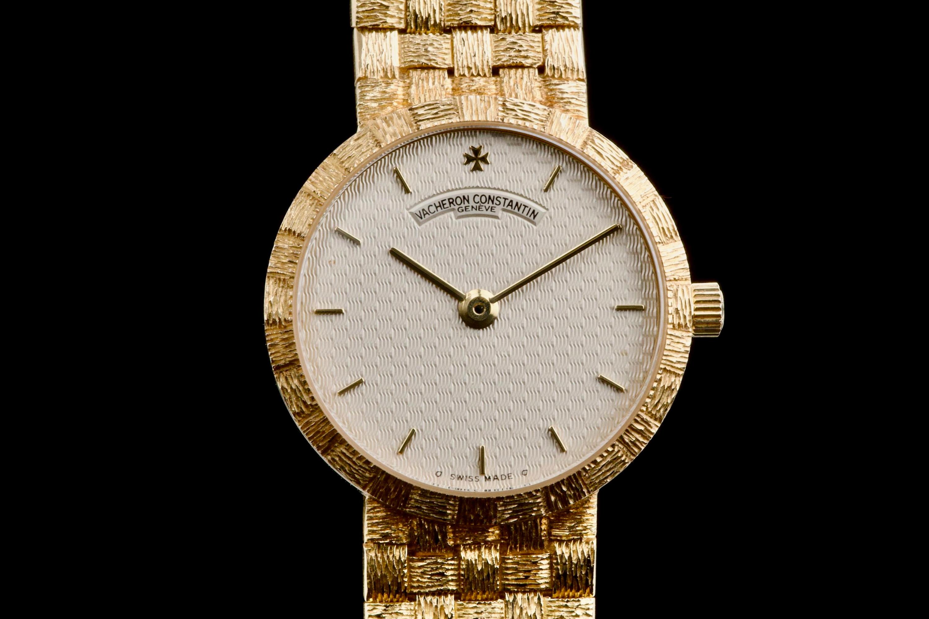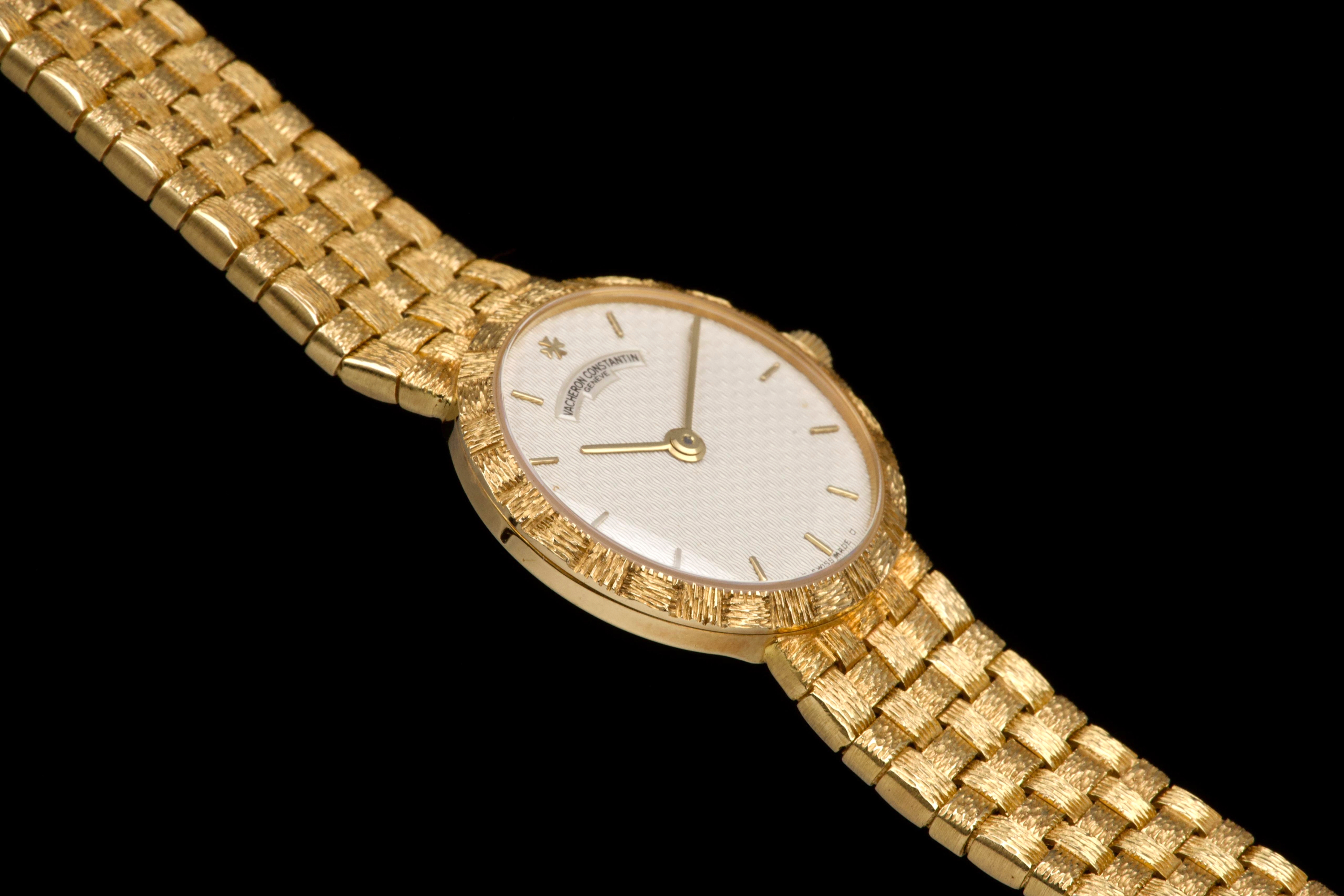 A refined and elegant Vacheron Constantin “Mesh Doll” reference 31046, crafted in 18k yellow gold and dating to the 1980s. This feminine timepiece features a delicate 24 mm round case paired with a beautifully integrated yellow gold mesh bracelet, offering both comfort and timeless sophistication. The cream guilloché dial adds depth and elegance, perfectly complementing the warm tone of the case. Powered by a quartz movement, the watch has recently had its battery replaced by our watchmaker and is in excellent working order. The watch is presented in excellent overall condition, with very well-preserved case, bracelet, and dial. A charming and understated vintage Vacheron Constantin, combining classic design with everyday wearability.