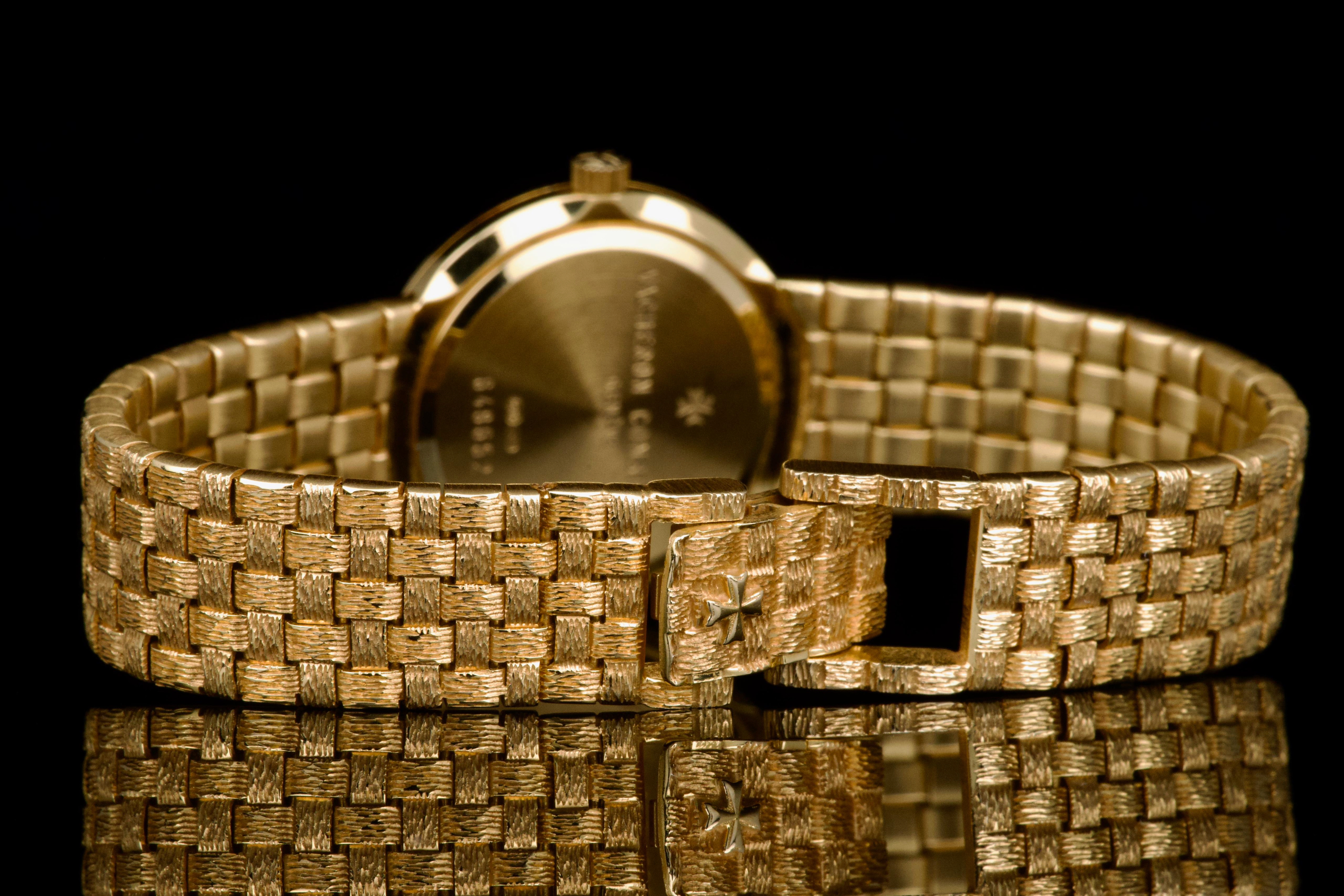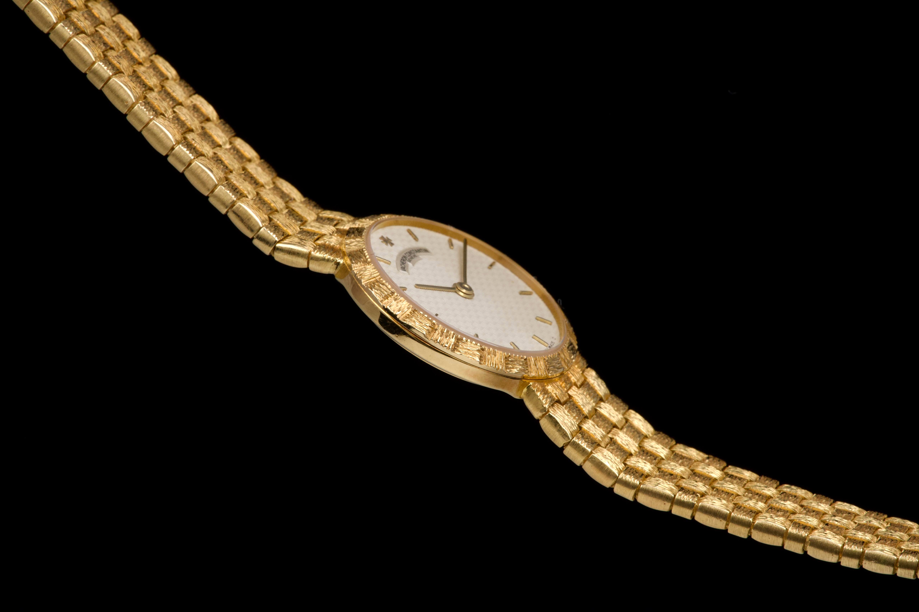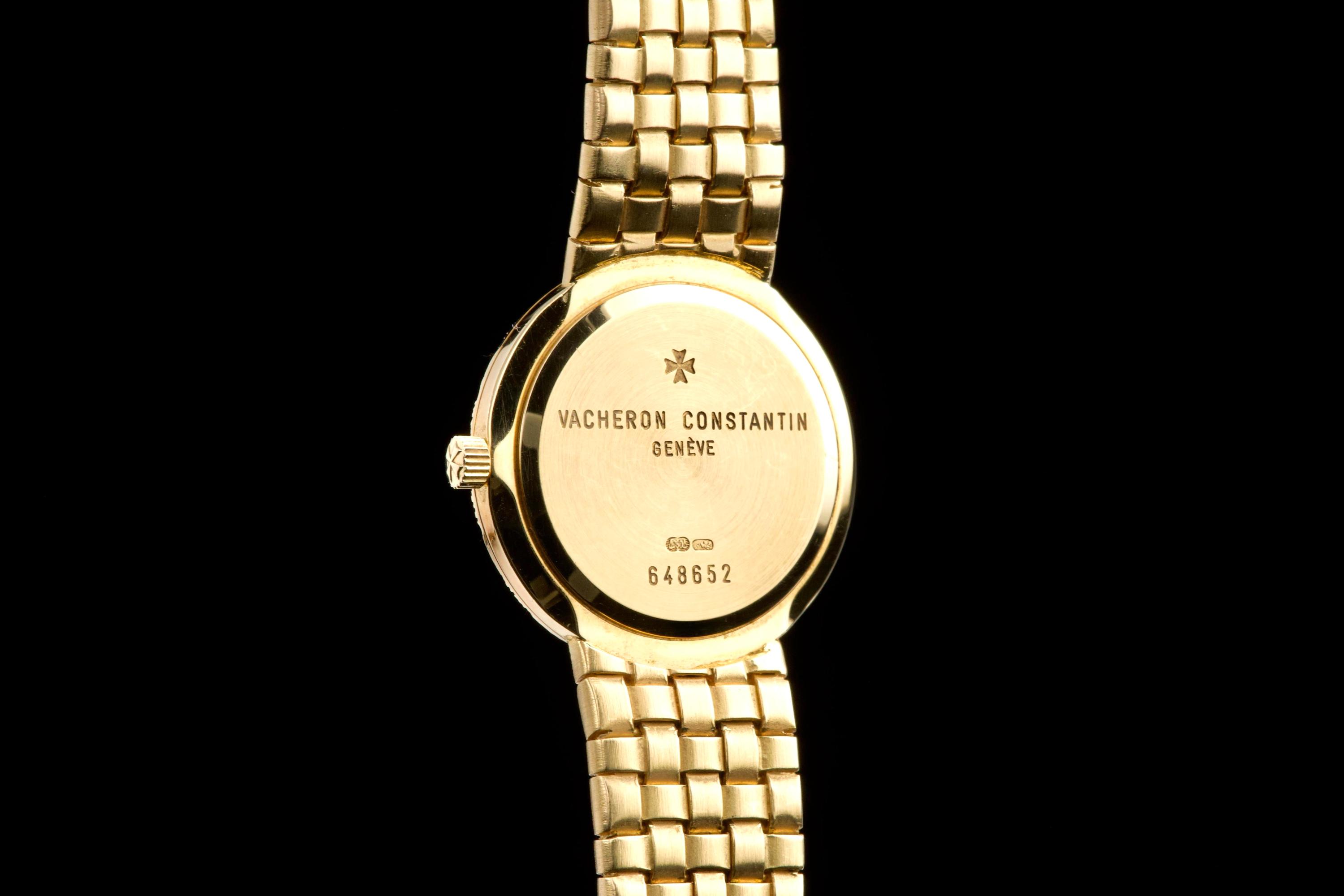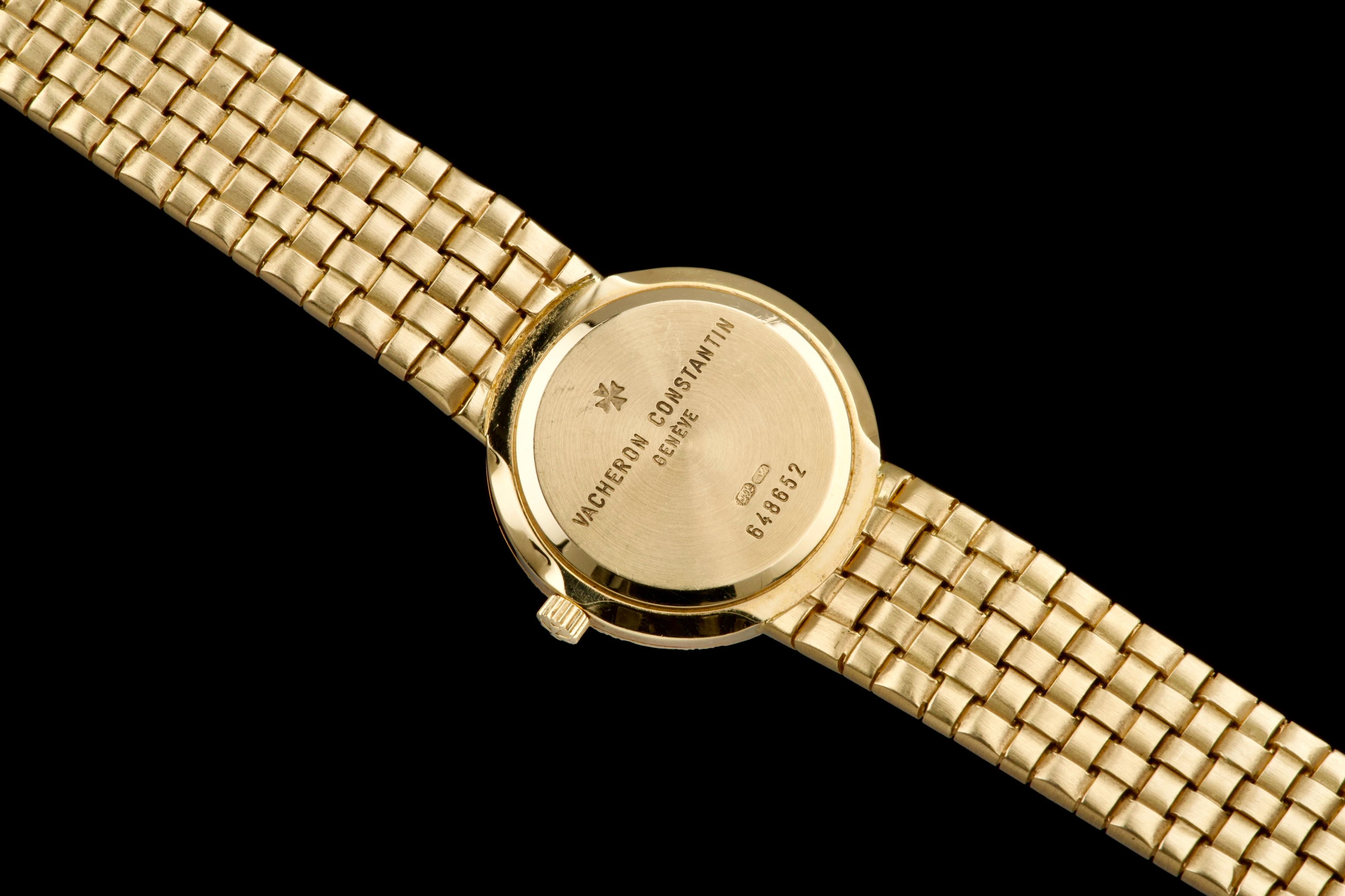 A refined and elegant Vacheron Constantin “Mesh Doll” reference 31046, crafted in 18k yellow gold and dating to the 1980s. This feminine timepiece features a delicate 24 mm round case paired with a beautifully integrated yellow gold mesh bracelet, offering both comfort and timeless sophistication. The cream guilloché dial adds depth and elegance, perfectly complementing the warm tone of the case. Powered by a quartz movement, the watch has recently had its battery replaced by our watchmaker and is in excellent working order. The watch is presented in excellent overall condition, with very well-preserved case, bracelet, and dial. A charming and understated vintage Vacheron Constantin, combining classic design with everyday wearability.