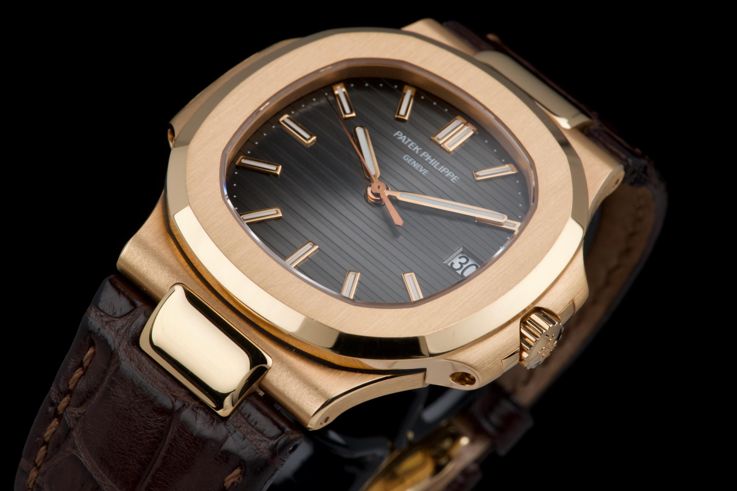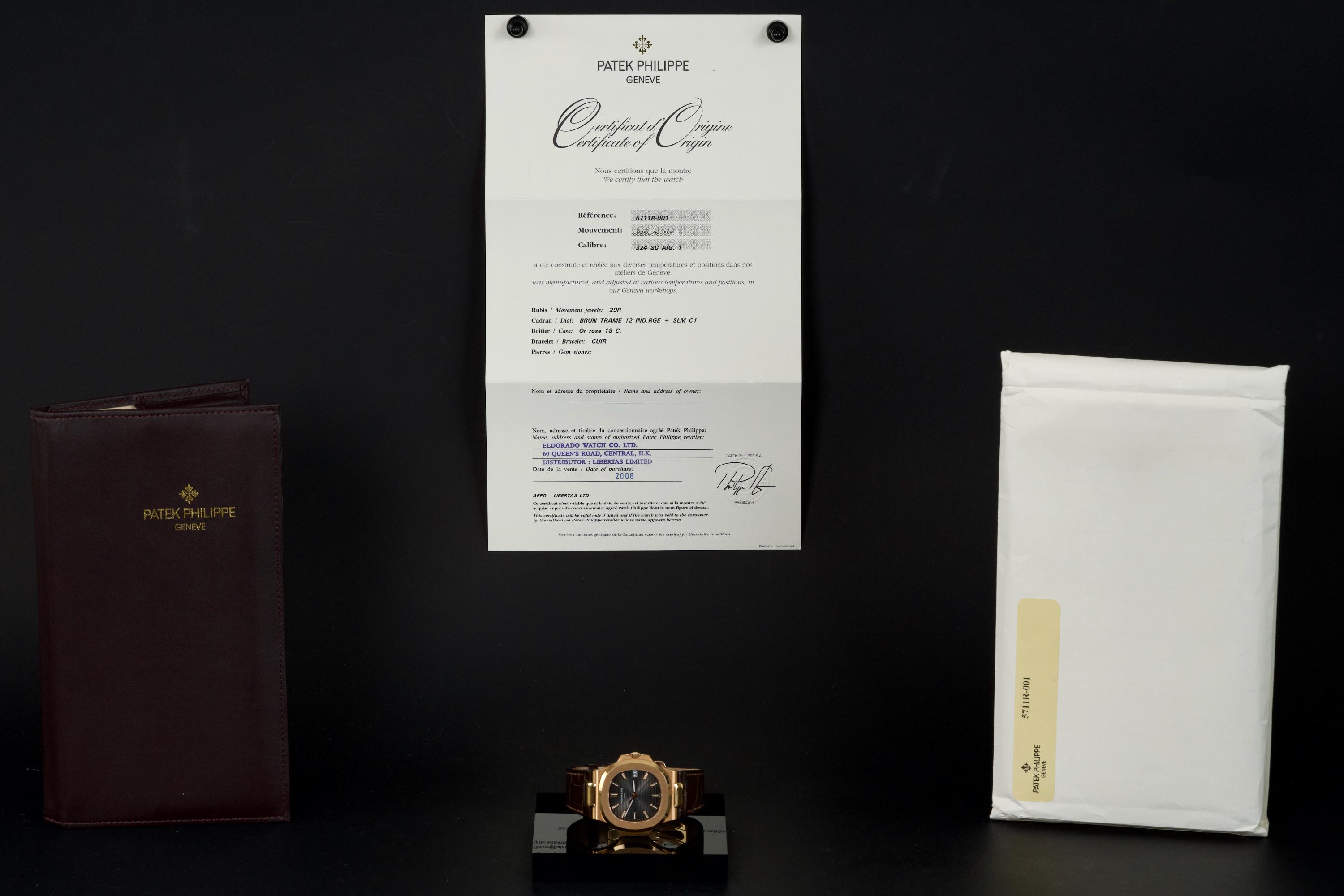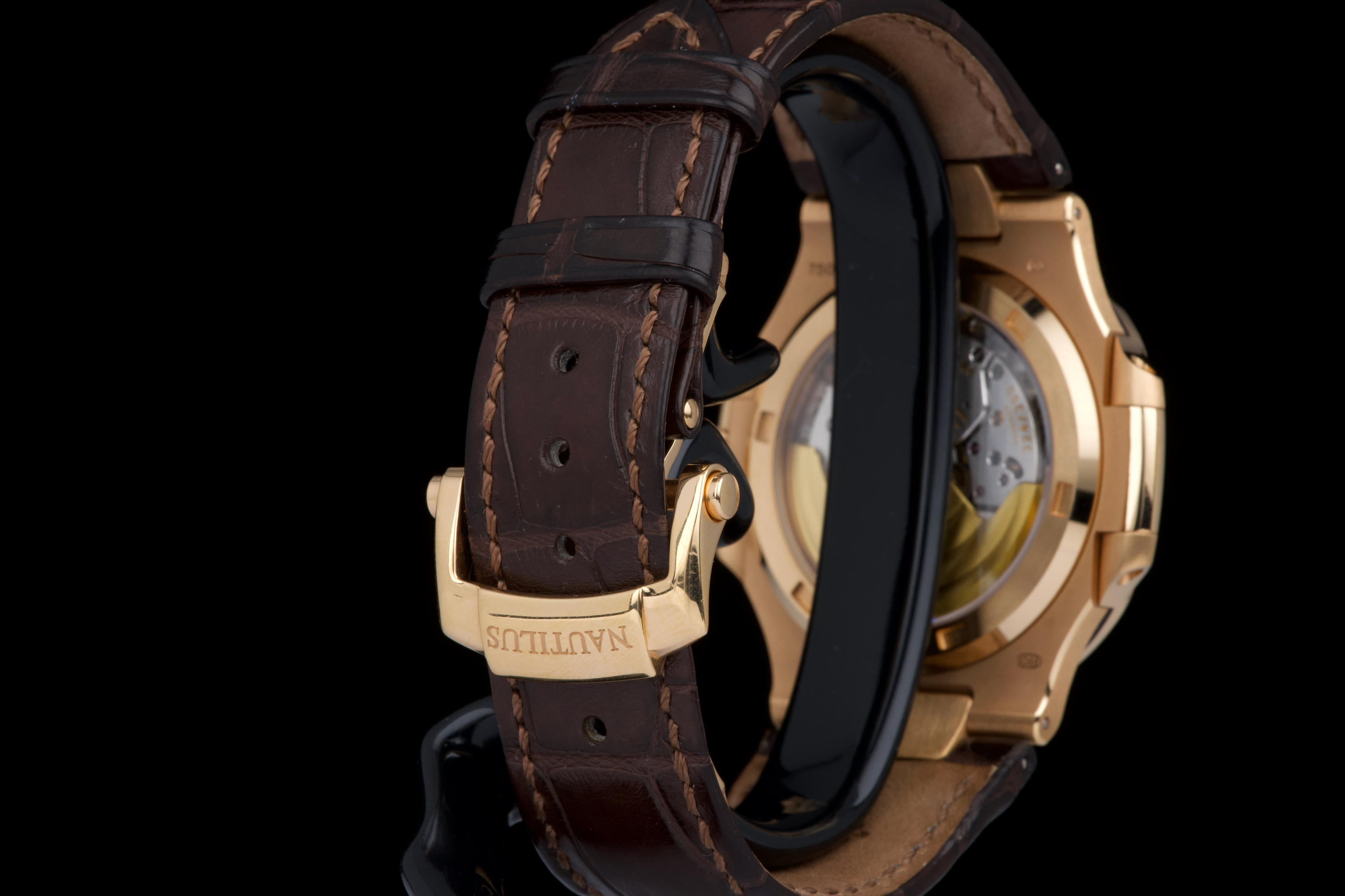 The present Patek Philippe Nautilus reference 5711R, dating to 2008, is an elegant and highly desirable example of the iconic model executed in 18K rose gold, offered with its original papers. Renowned for its timeless Gérald Genta design and refined proportions, the 5711R remains one of the most coveted modern Nautilus configurations. The rose-gold case appears to be unpolished and is preserved in excellent overall condition for its age, retaining crisp lines and strong definition throughout. The original brown luminova dial is likewise in outstanding condition, displaying rich depth and perfect clarity, with matching hands that create a harmonious and coherent aesthetic. The watch is fitted with its original brown Patek Philippe crocodile leather strap, which remains in excellent condition, and is paired with the correct original rose-gold deployant clasp, completing the ensemble with full period coherence. While no service history accompanies the watch, it is functioning correctly at the time of cataloguing. Combining an unpolished case, superb dial, and desirable rose-gold execution, this Nautilus 5711R from 2008 represents a compelling opportunity to acquire one of Patek Philippe’s most iconic modern sports watches in highly attractive and original condition