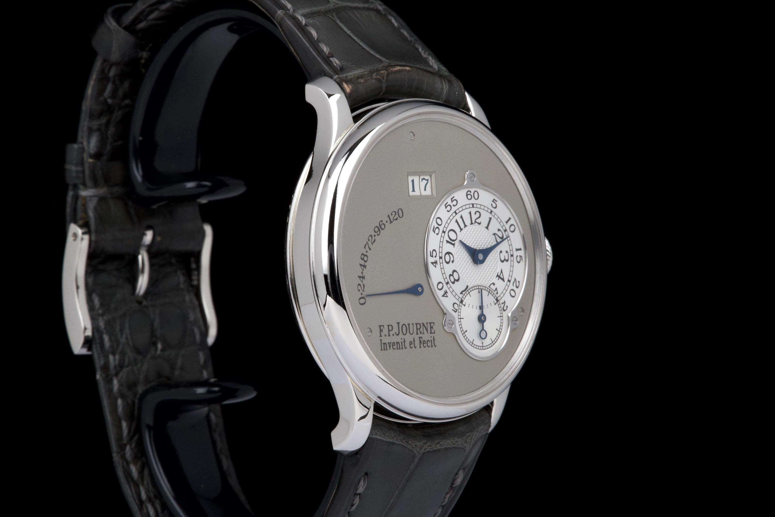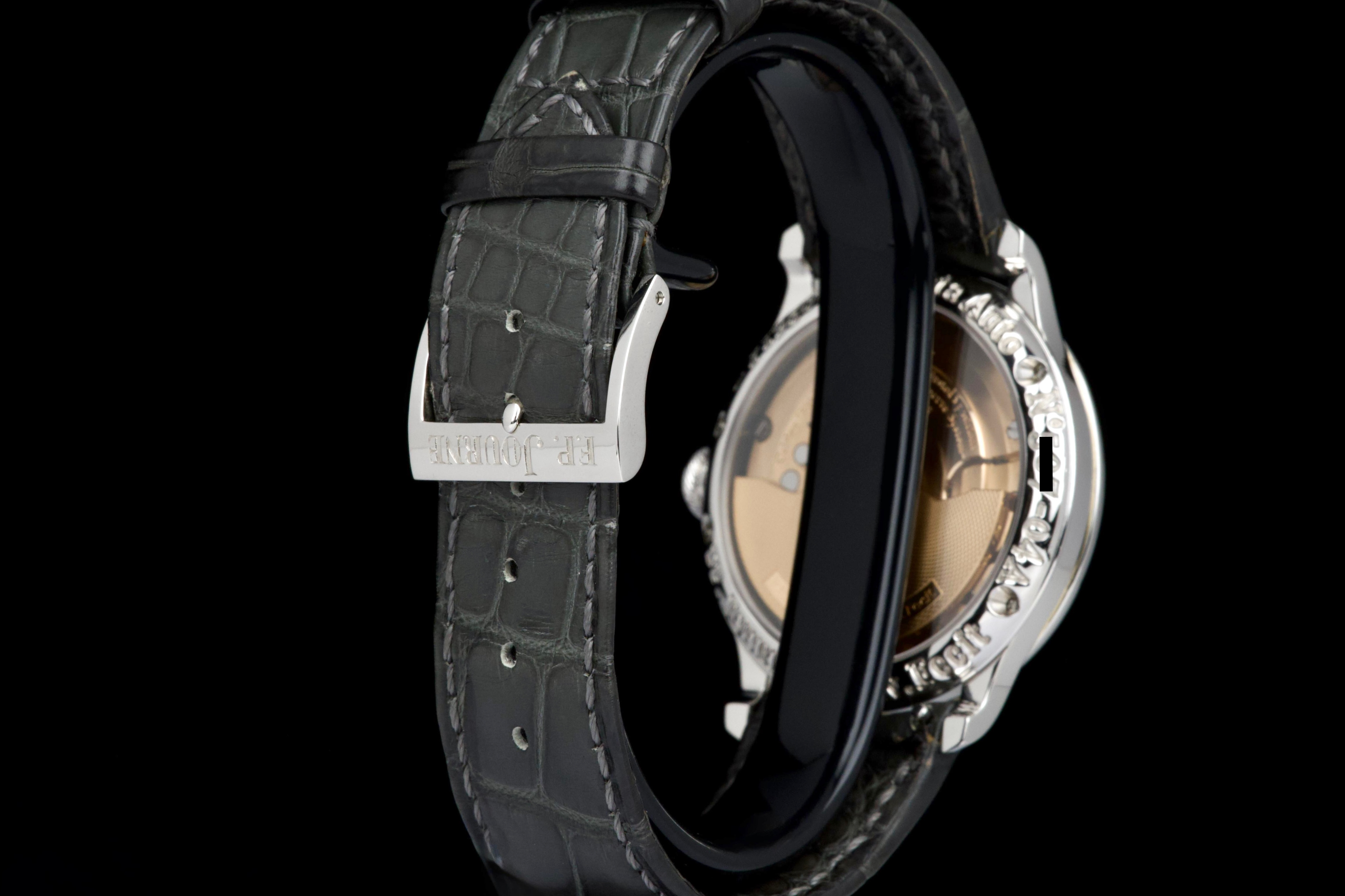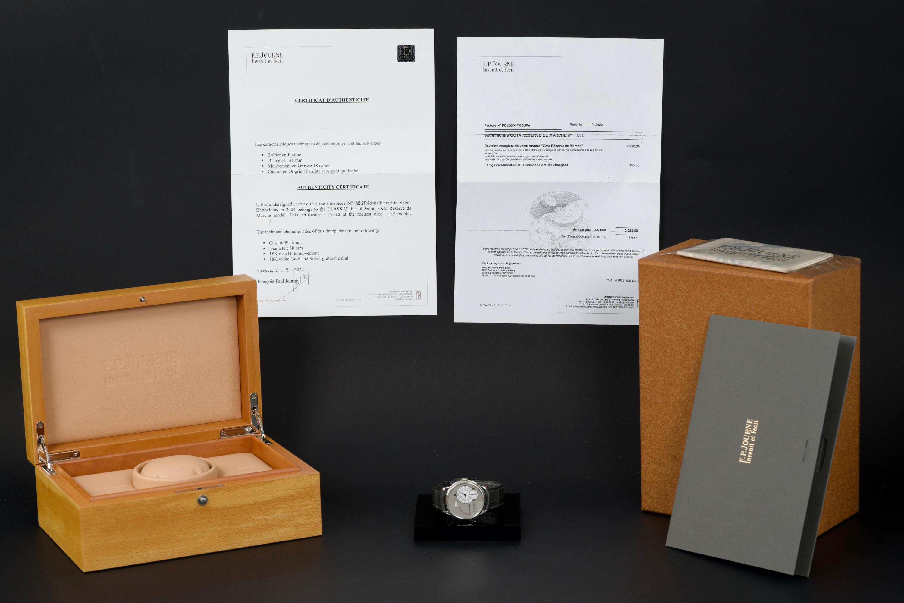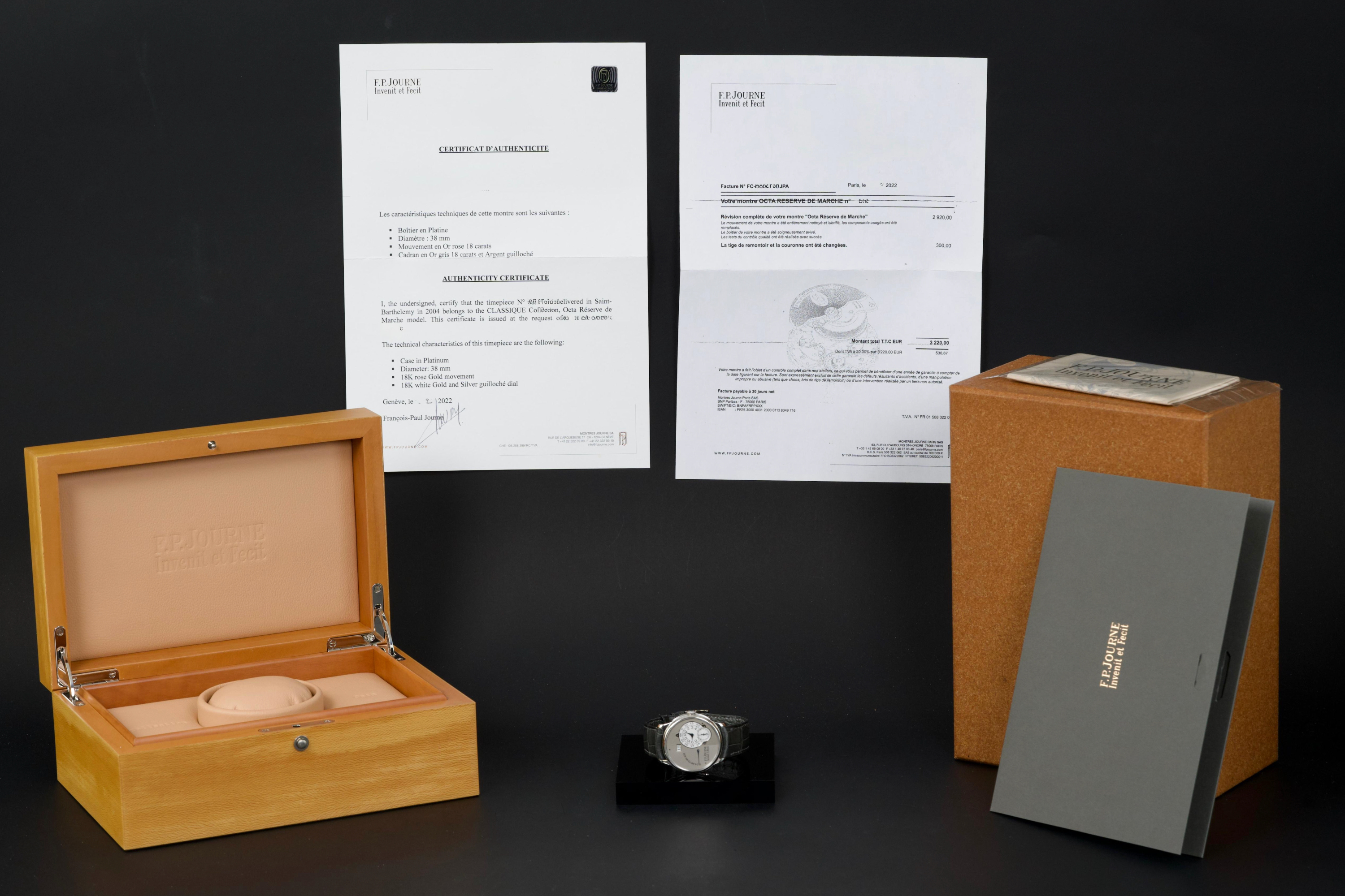 The present F.P. Journe Octa Réserve de Marche, executed in platinum and measuring 38 mm, dates to 2004 and is a superb example of one of François-Paul Journe’s most important early automatic wristwatches. Combining technical innovation with classical aesthetics, the Octa line established Journe as a leading figure of modern independent watchmaking. This example is preserved in excellent overall condition and benefits from a full service performed by F.P. Journe Paris in 2022, including movement servicing and polishing, with accompanying service documentation. The platinum case presents beautifully with crisp lines and refined surfaces consistent with careful ownership since servicing. The dial is particularly attractive, featuring a white-gold base with silver guilloché decoration, displaying the refined textures and depth characteristic of early Journe production. The movement, visible through the caseback, is crafted in 18K rose gold, a signature hallmark of early F.P. Journe calibres and a detail highly prized by collectors for both its aesthetic and historical significance. The watch is fitted with a grey alligator leather strap in approximately 70% condition, paired with its original platinum ardillon buckle, maintaining full material coherence. It is accompanied by its original box, as well as an Authenticity Certificate confirming production in 2004 and original delivery in St. Barthélemy, adding notable provenance. Elegant, historically important, and freshly serviced by the manufacture, this Octa Réserve de Marche represents a compelling opportunity to acquire an early platinum F.P. Journe in outstanding condition, combining mechanical innovation, precious materials, and strong documentation.