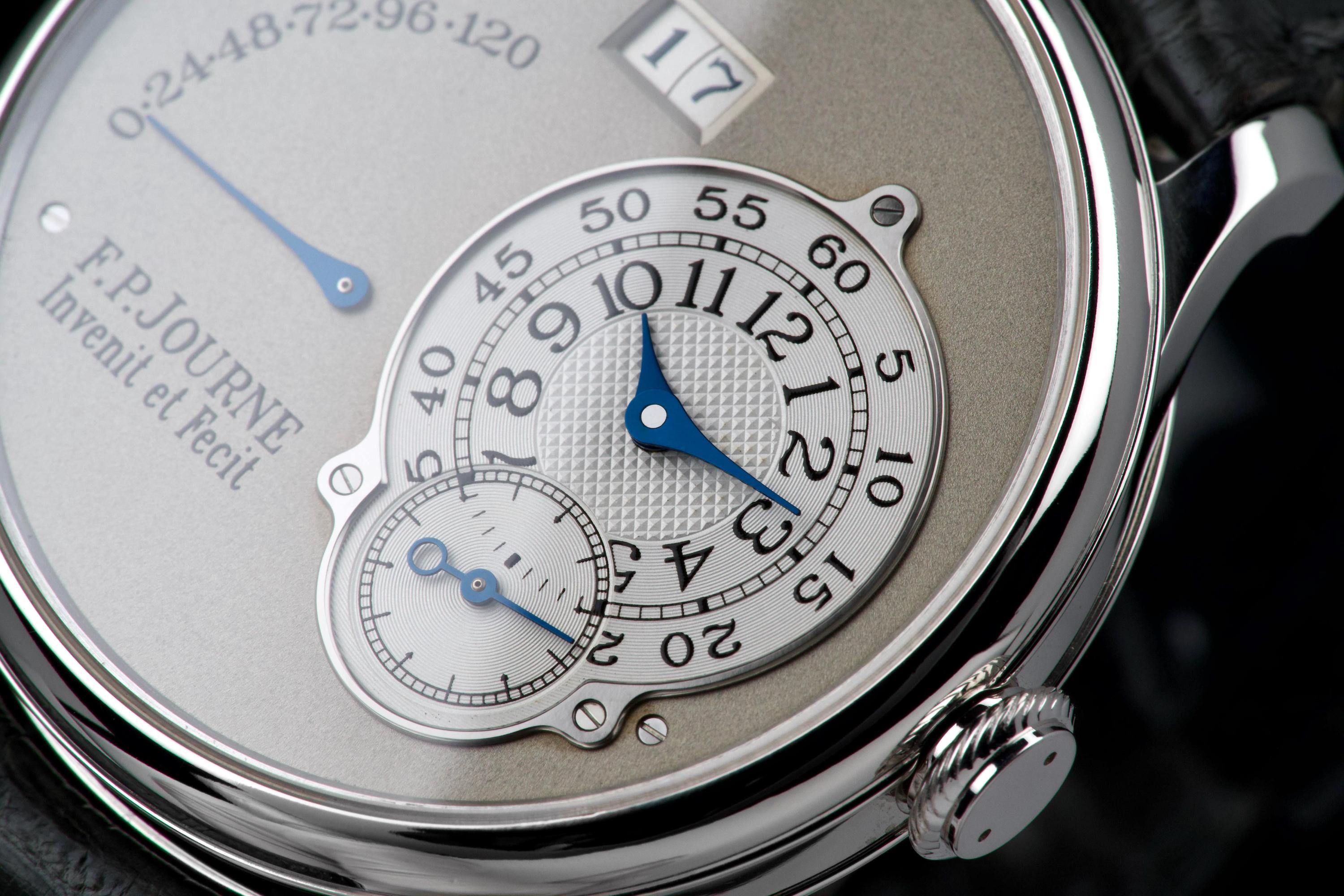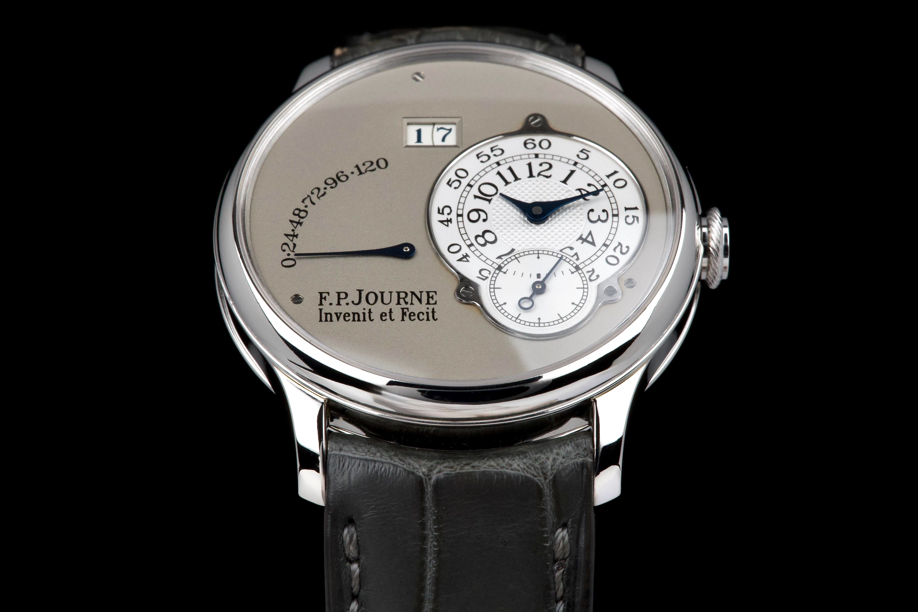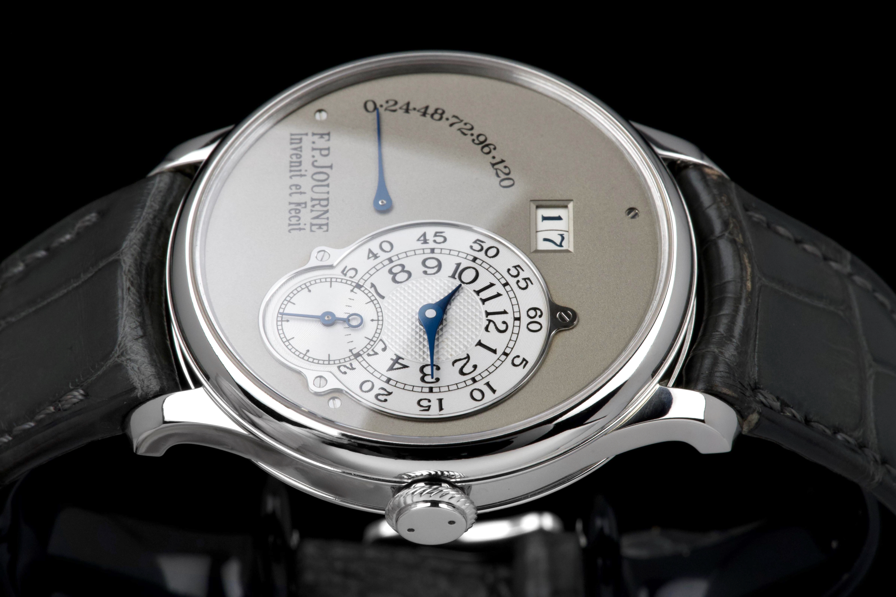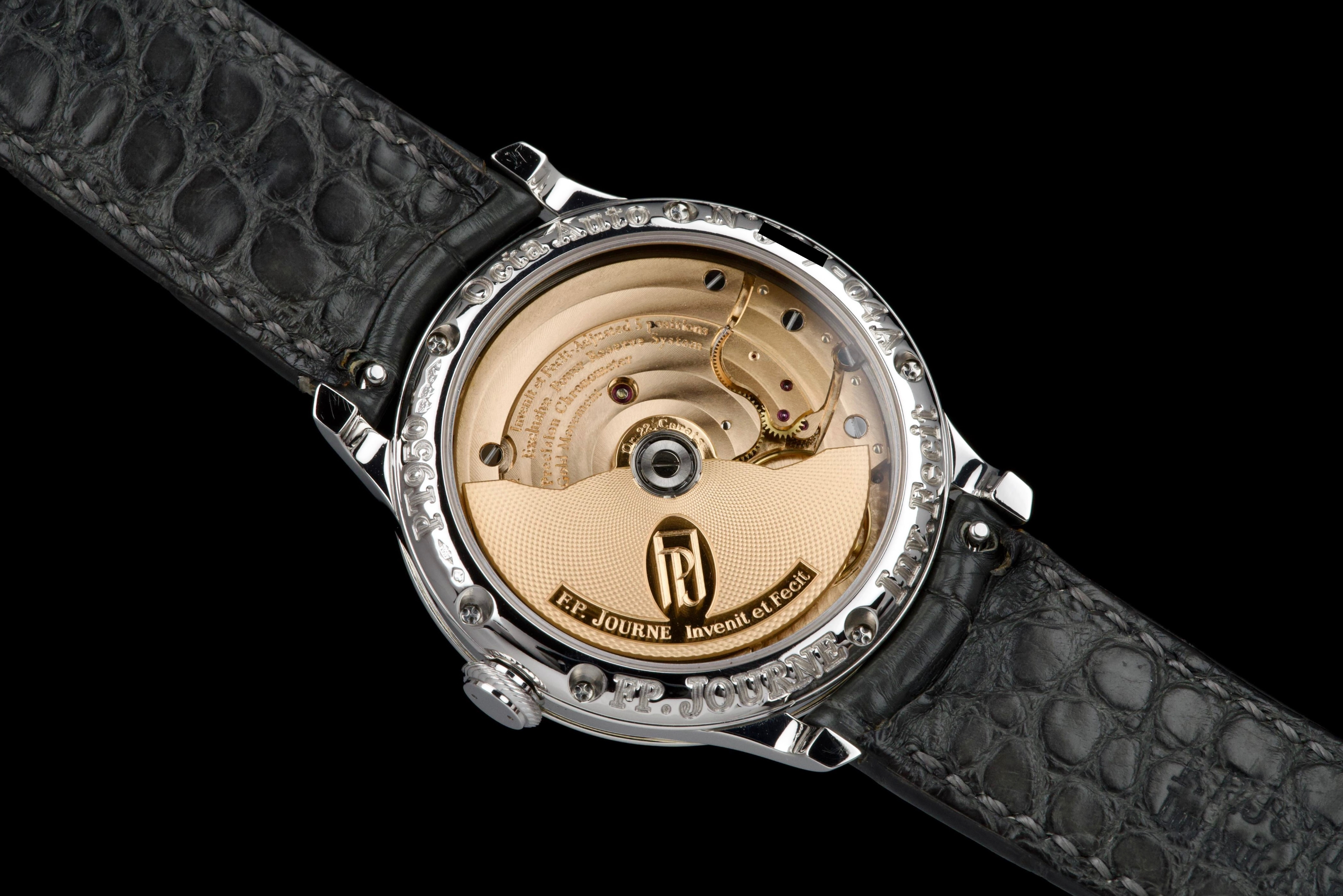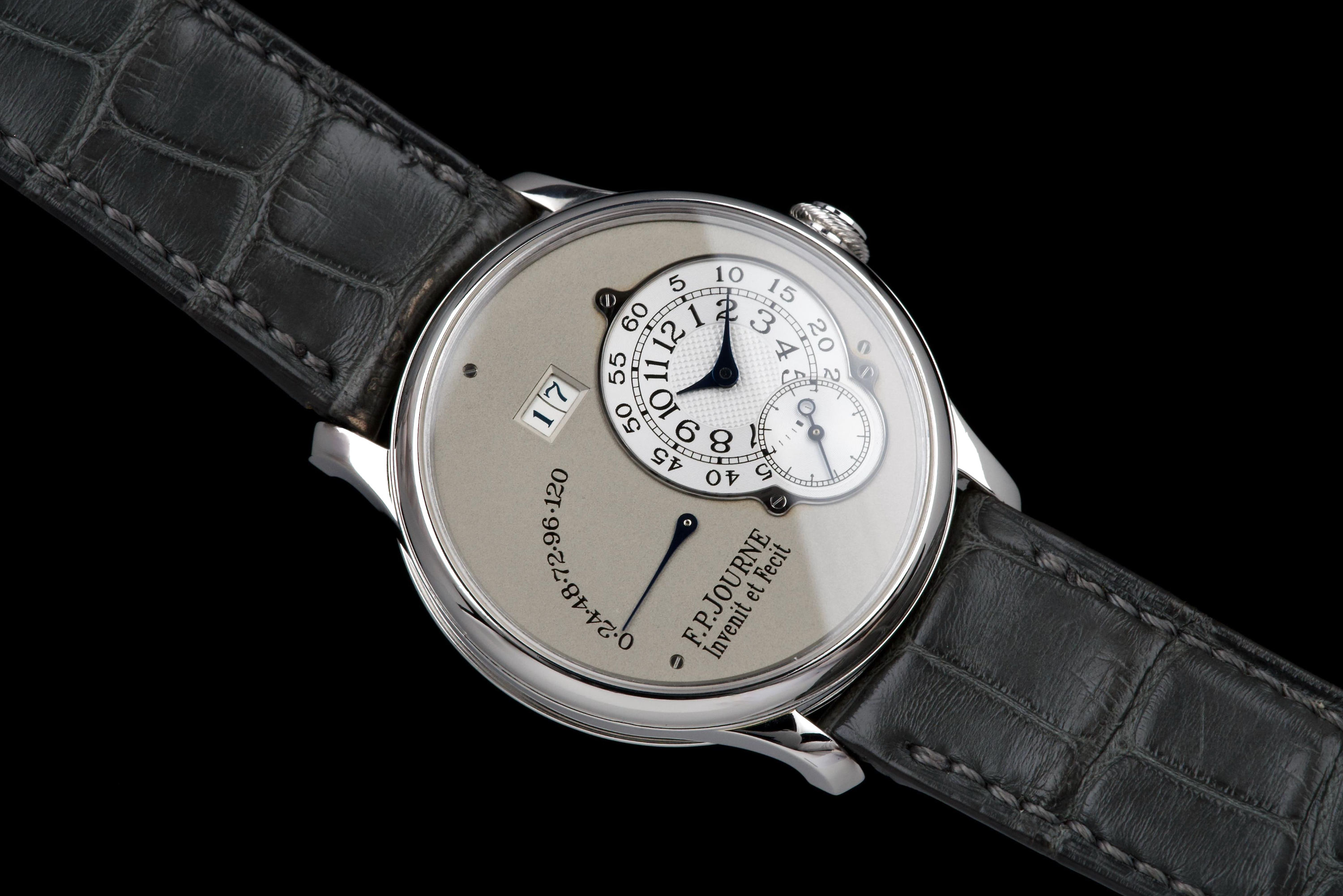 The present F.P. Journe Octa Réserve de Marche, executed in platinum and measuring 38 mm, dates to 2004 and is a superb example of one of François-Paul Journe’s most important early automatic wristwatches. Combining technical innovation with classical aesthetics, the Octa line established Journe as a leading figure of modern independent watchmaking. This example is preserved in excellent overall condition and benefits from a full service performed by F.P. Journe Paris in 2022, including movement servicing and polishing, with accompanying service documentation. The platinum case presents beautifully with crisp lines and refined surfaces consistent with careful ownership since servicing. The dial is particularly attractive, featuring a white-gold base with silver guilloché decoration, displaying the refined textures and depth characteristic of early Journe production. The movement, visible through the caseback, is crafted in 18K rose gold, a signature hallmark of early F.P. Journe calibres and a detail highly prized by collectors for both its aesthetic and historical significance. The watch is fitted with a grey alligator leather strap in approximately 70% condition, paired with its original platinum ardillon buckle, maintaining full material coherence. It is accompanied by its original box, as well as an Authenticity Certificate confirming production in 2004 and original delivery in St. Barthélemy, adding notable provenance. Elegant, historically important, and freshly serviced by the manufacture, this Octa Réserve de Marche represents a compelling opportunity to acquire an early platinum F.P. Journe in outstanding condition, combining mechanical innovation, precious materials, and strong documentation.