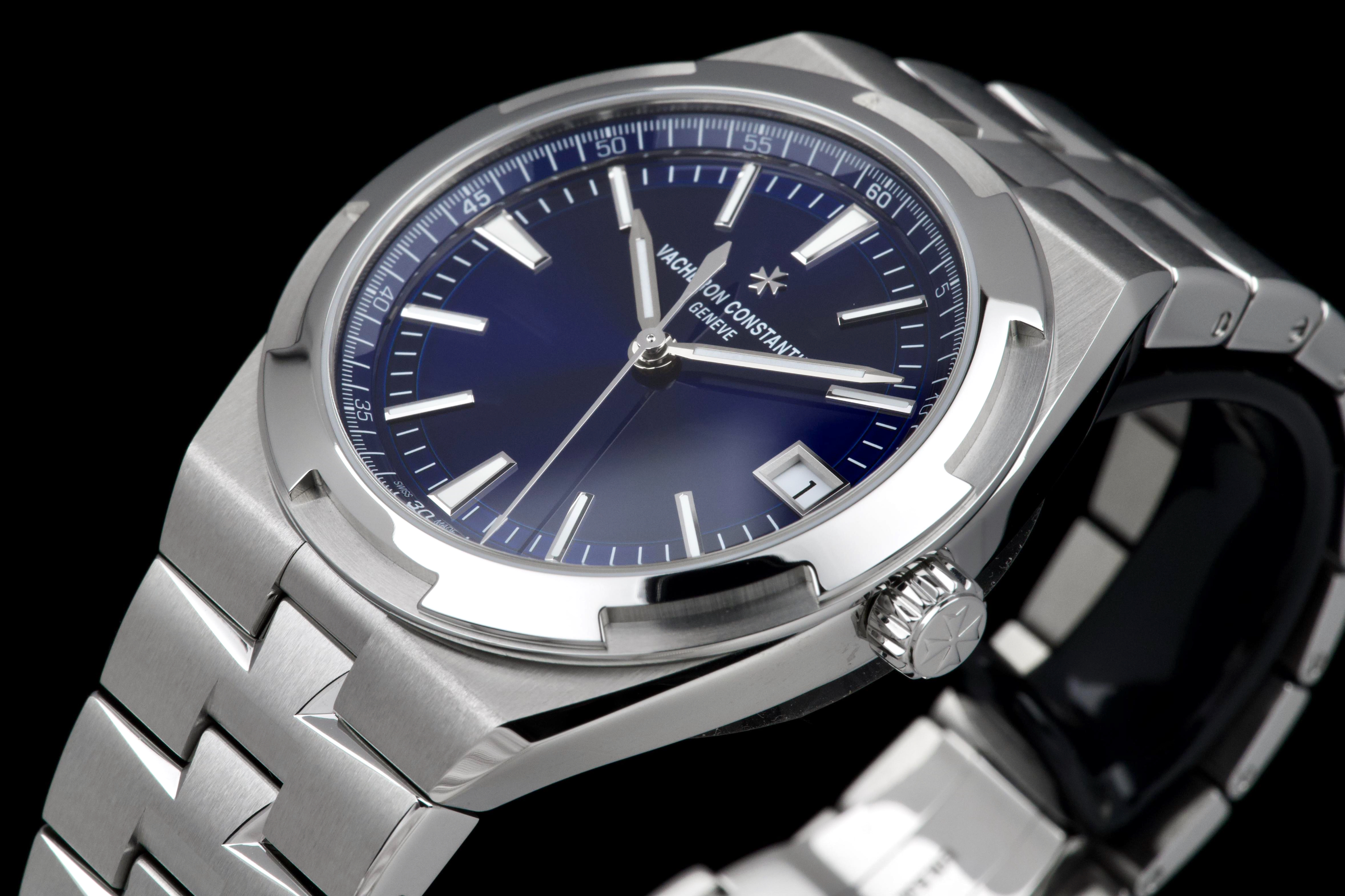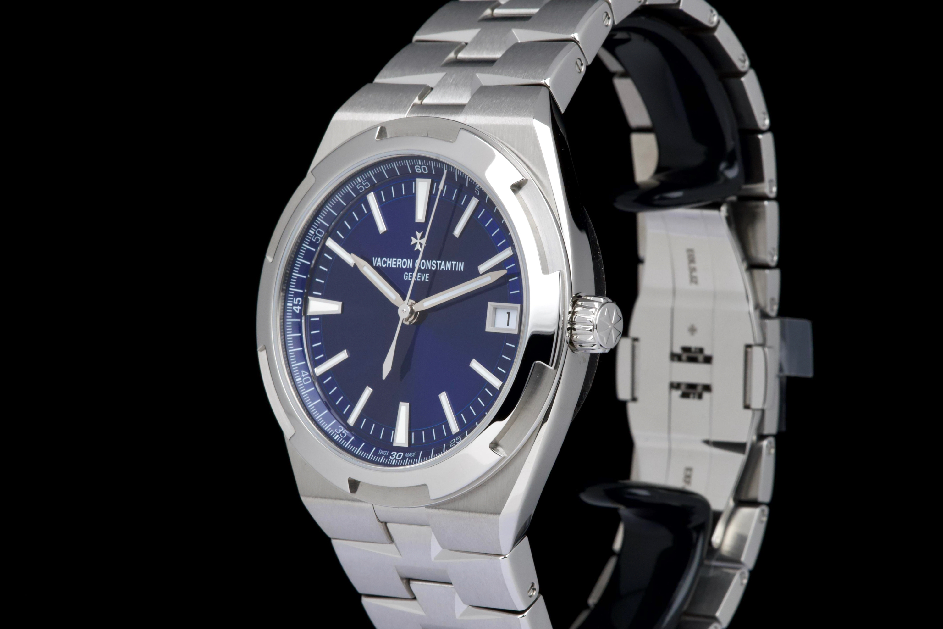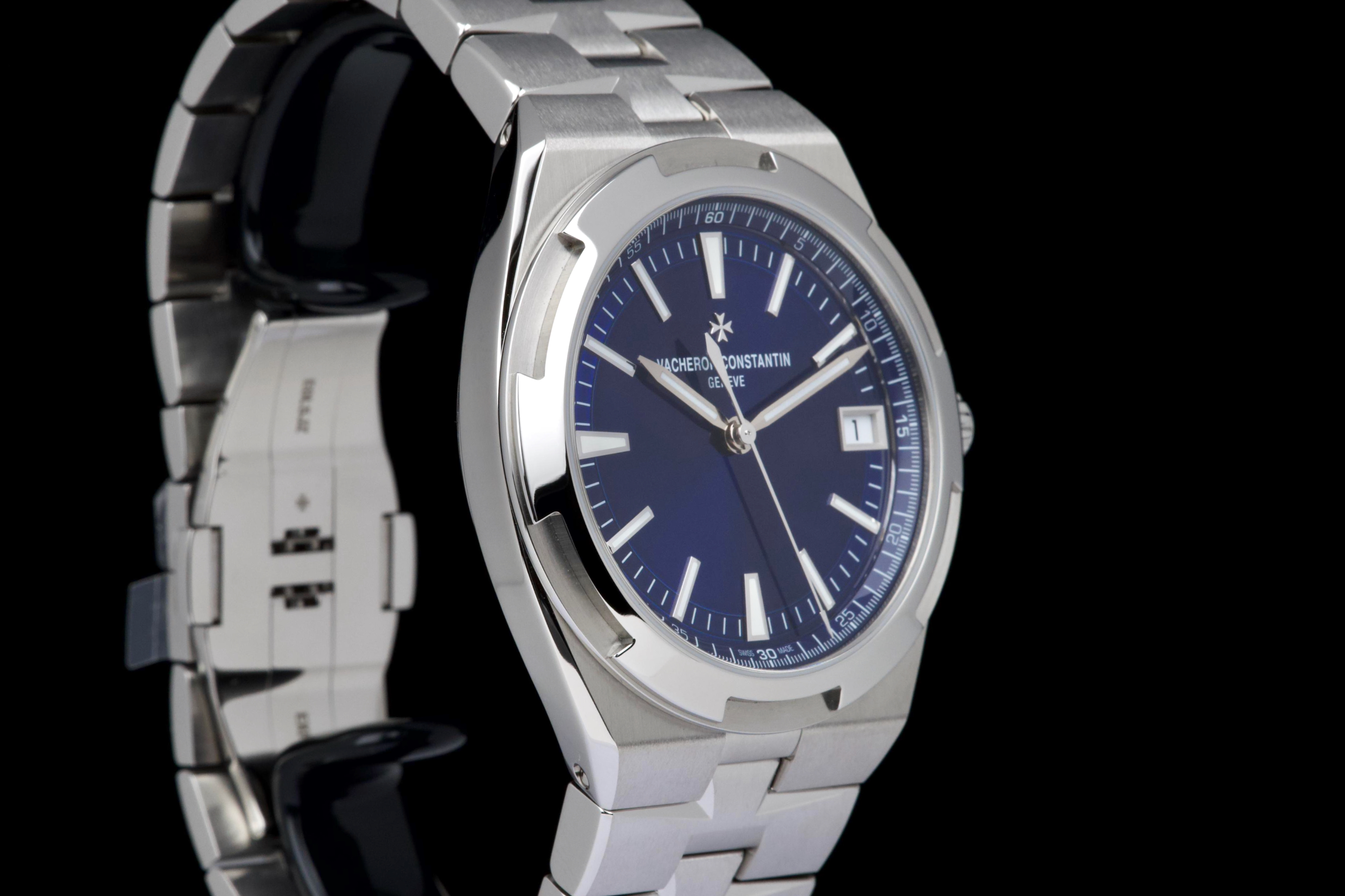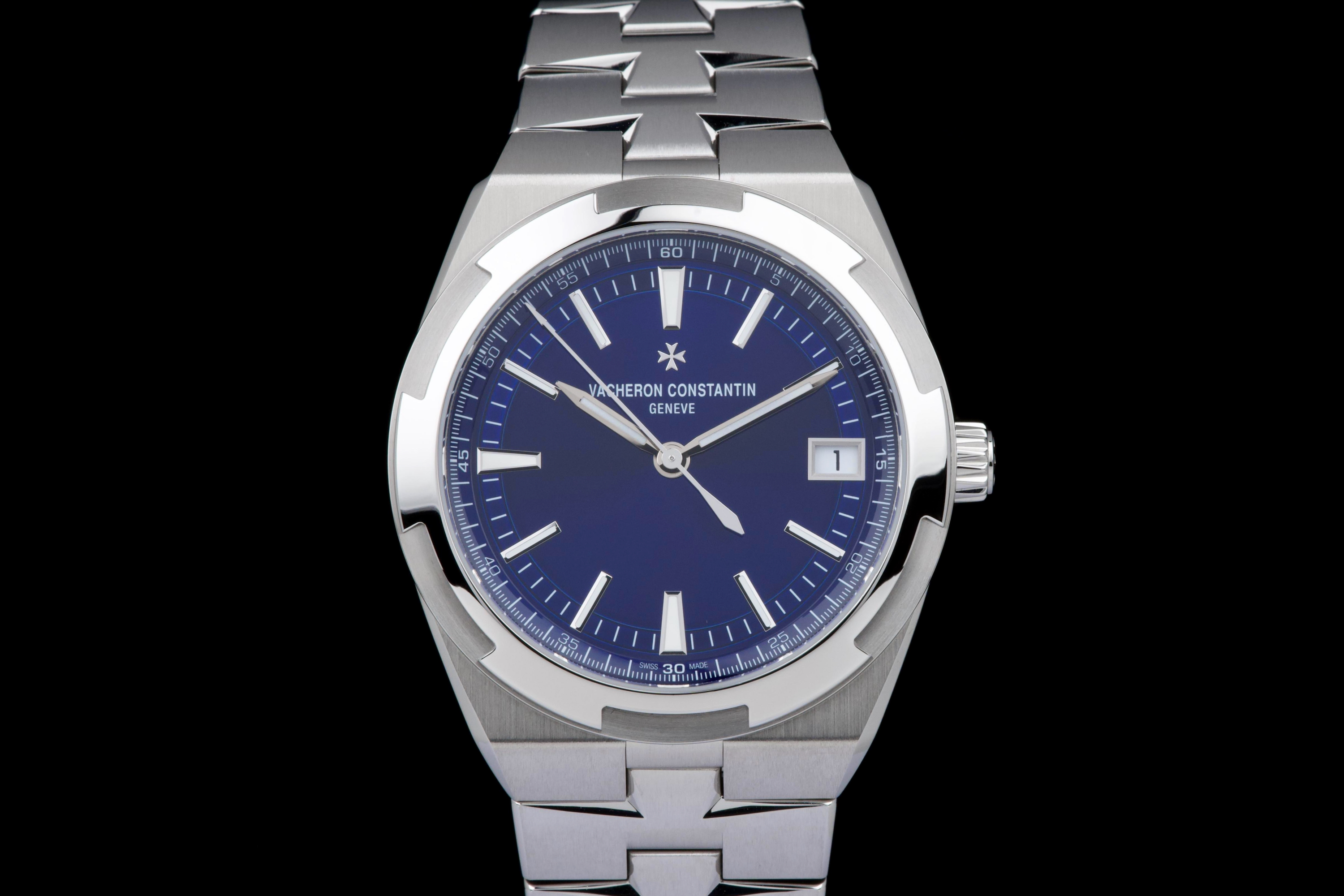 The present Vacheron Constantin Overseas reference 4520V/210A-B128, fitted with the highly desirable blue dial, dates to 2026 and is offered here as a complete full set in unworn condition. Representing the latest evolution of the Overseas collection, this reference features a 41 mm stainless-steel case with the signature Maltese cross–inspired bezel and beautifully executed alternating brushed and polished finishes. The case and integrated bracelet remain pristine, reflecting its untouched state. The vibrant sunburst blue dial, one of the most sought-after configurations within the Overseas range, offers remarkable depth and clarity, with applied hour markers and luminous hands ensuring excellent legibility. The watch is powered by Vacheron Constantin’s in-house automatic calibre 5100, delivering robust performance, refined finishing, and a comfortable power reserve. Delivered as a full set from 2026 and preserved in unworn condition, this Overseas 4520V represents an outstanding opportunity to acquire a current-production Vacheron Constantin sports model in immaculate state, combining modern engineering, timeless design, and strong collector appeal.